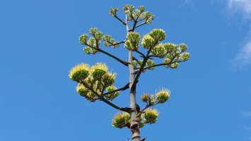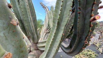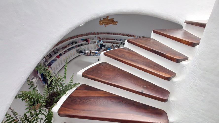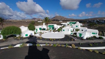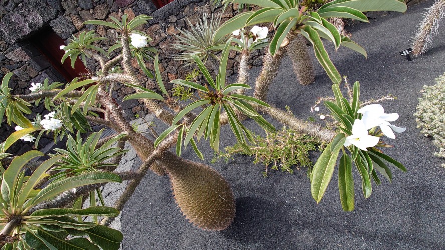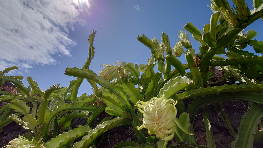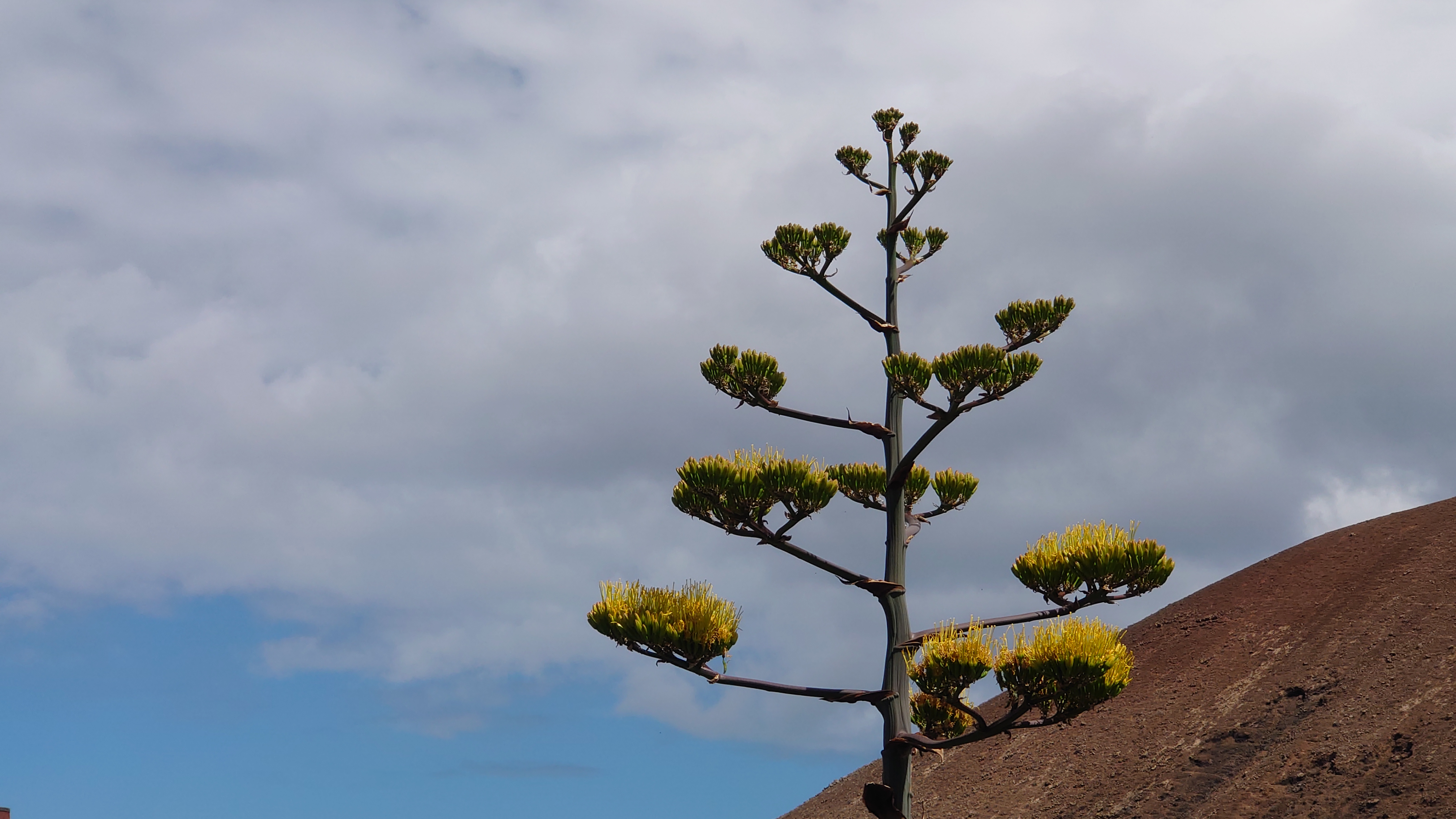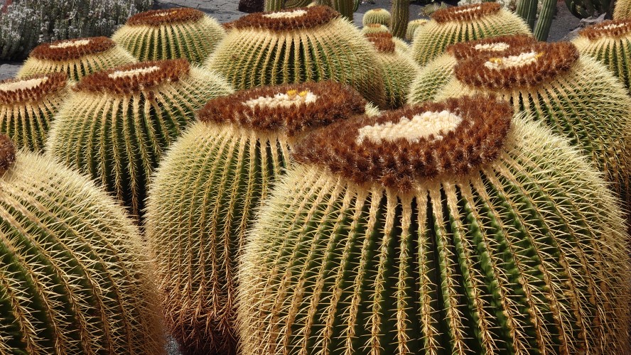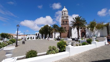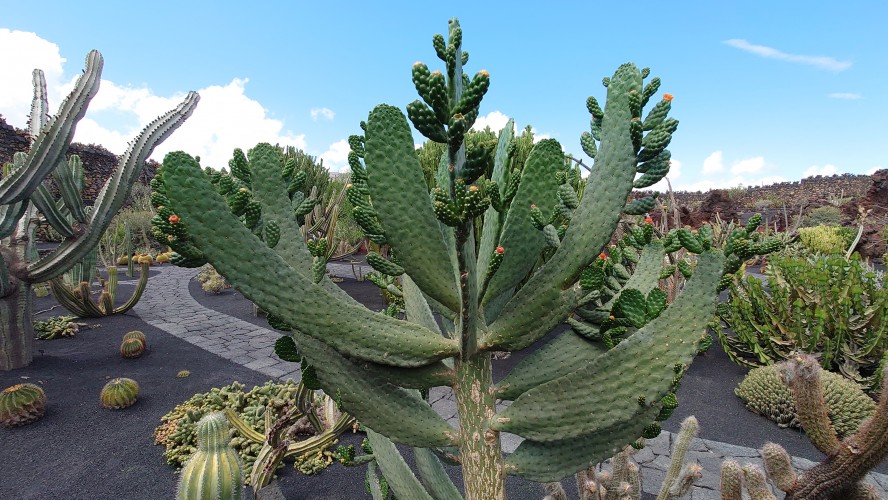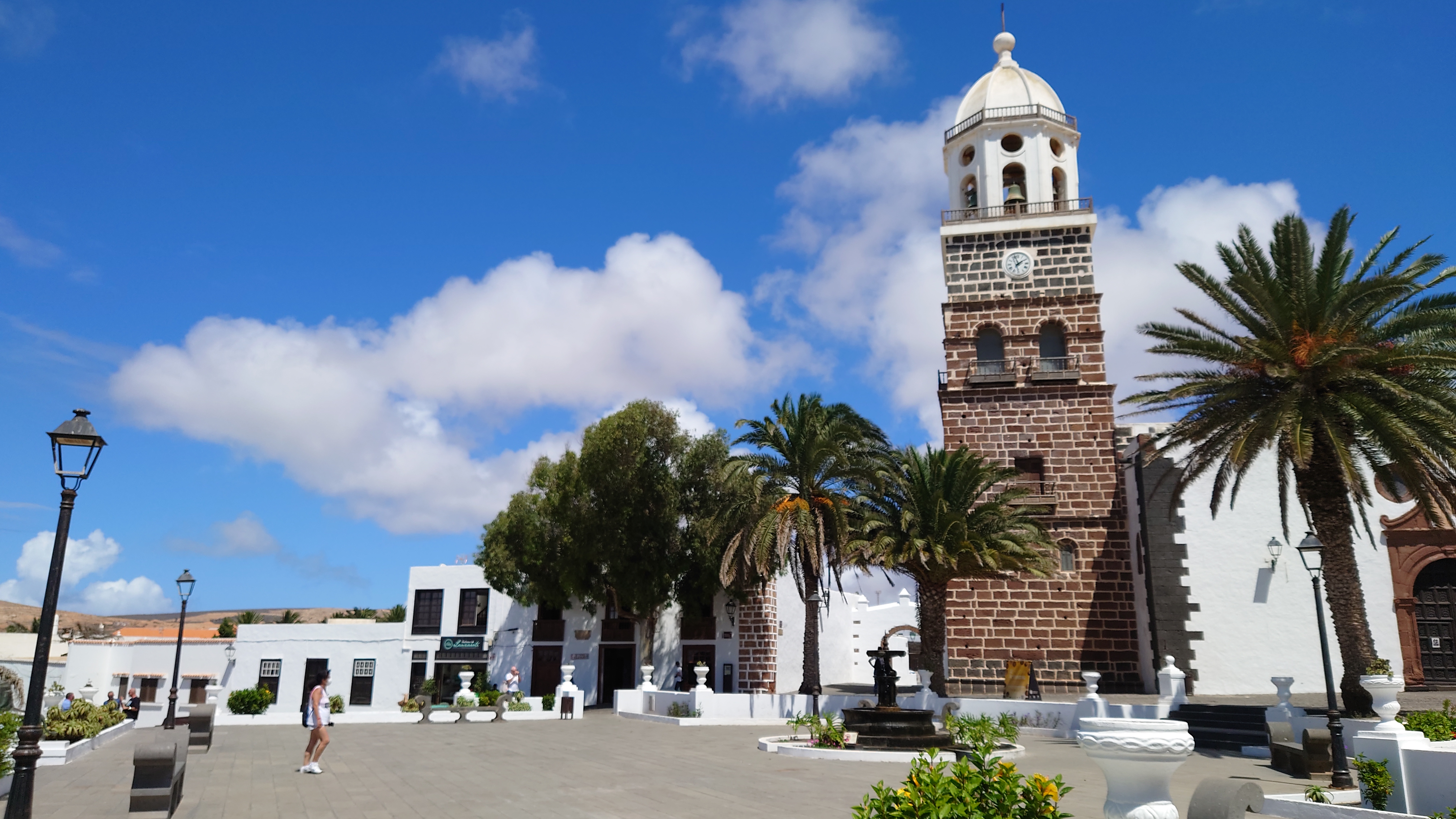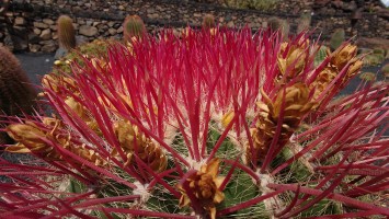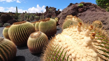 Und nu? Hm... da ist ein Ort namens Nazaret. Ich fahre nur hin, weil der Orr so heißt. Statt Jesus entdecke ich das Lagomar, das Ferienhaus von Omar Sharif. Leider geschlossen. Schade, da wäre doch wieder so ein heftig türkiser Pool drin gewesen. Also geht's weiter zur ehemaligen Inselhauptstadt Teguise. Sehr pittoresque mit dem Zwiebelturmkirchlein und dem Marktplatz, das von patschuli riechenden Art- und Nature Shops umgeben ist. Ich gehe mal in einen rein. Dachte ichs mir doch. Fernost-Ethno-Kram, den es auf jedem Weihnachtsmarkt genauso gibt. Kunst ist das nicht. Der Rest des Orts ist halt Ort... mit weißem Beton und grünen Fenstern as usual, also weiter. Einmal quer über den Kamm auf die Ostseite und schon bin ich beim Jardin de Cactus. Hier war ich vor 25 Jahren auch. Es ist mit die letzte Atteaktion, die Manrique vor seinem Tod noch ersonnen hat. Damals war es gerade eröffnet worden. Alle Kakteen waren ganz klein. Das hat sich sehr geändert und ich muss sagen, es ist die bisher eindrucksvollste Kreation des Künstlers und durch und durch stimmig. Tolle Pflanzen kann man in diesem ovalen Hitzekessel bestaunen. Über eine Stunde lichte ich viele spannende Gewächse ab, bis ich schweißnass weiter fahre, denn zum Mirador del Rio ist es von hier jetzt auch nicht mehr weit. Zack, stehe ich wieder vor einem Manrique-Monument, das für ne schmale Mark einen wirklich wirklich beeindruckenden Blick auf ganz La Graciosa und die Famara-Steilküste samt abgerundeter Skybar liefert.