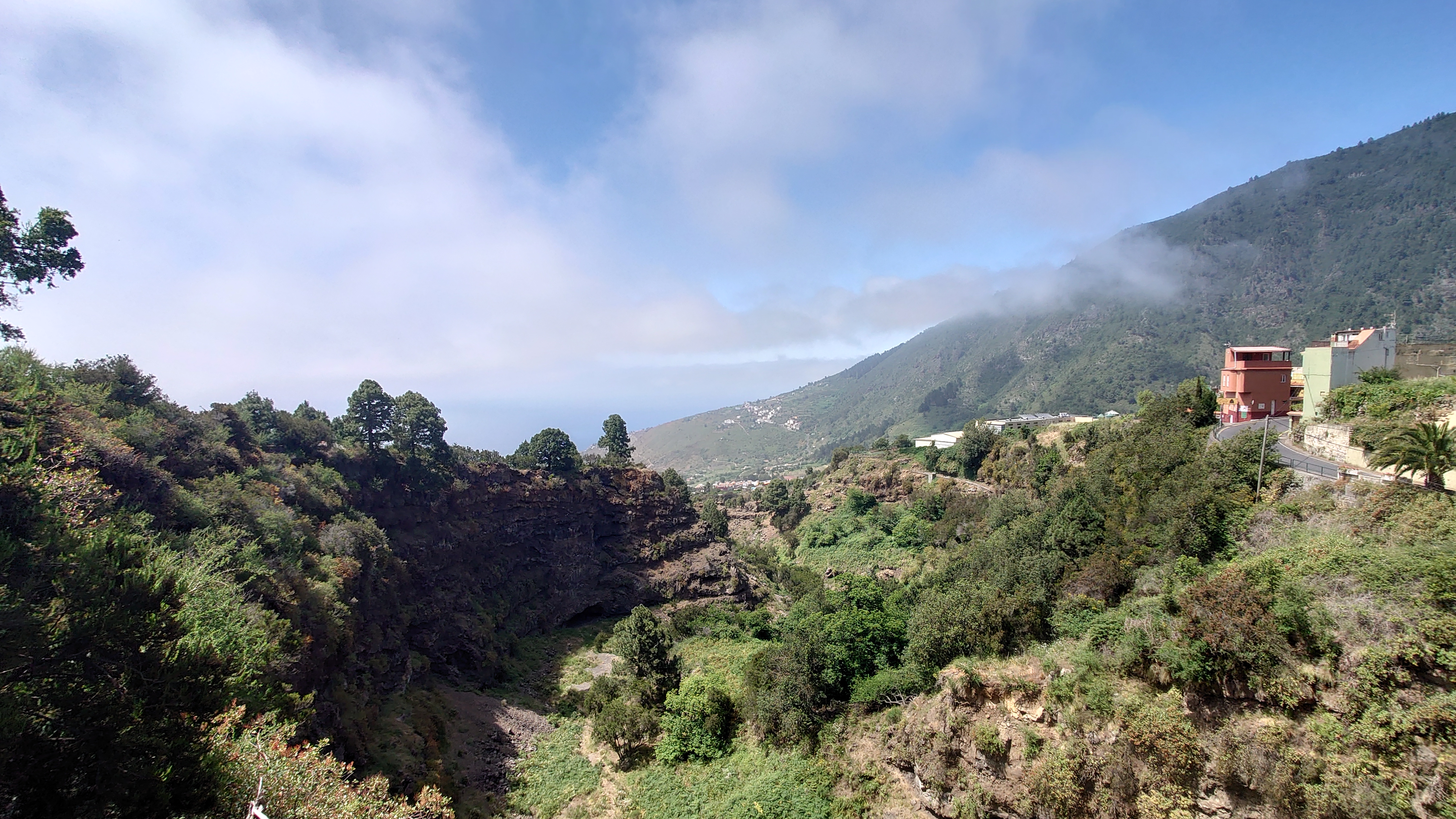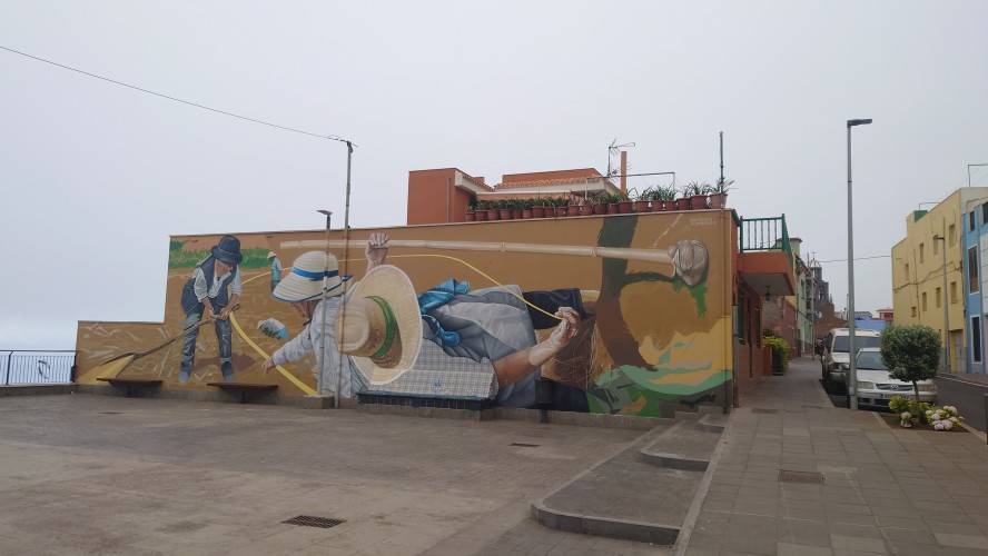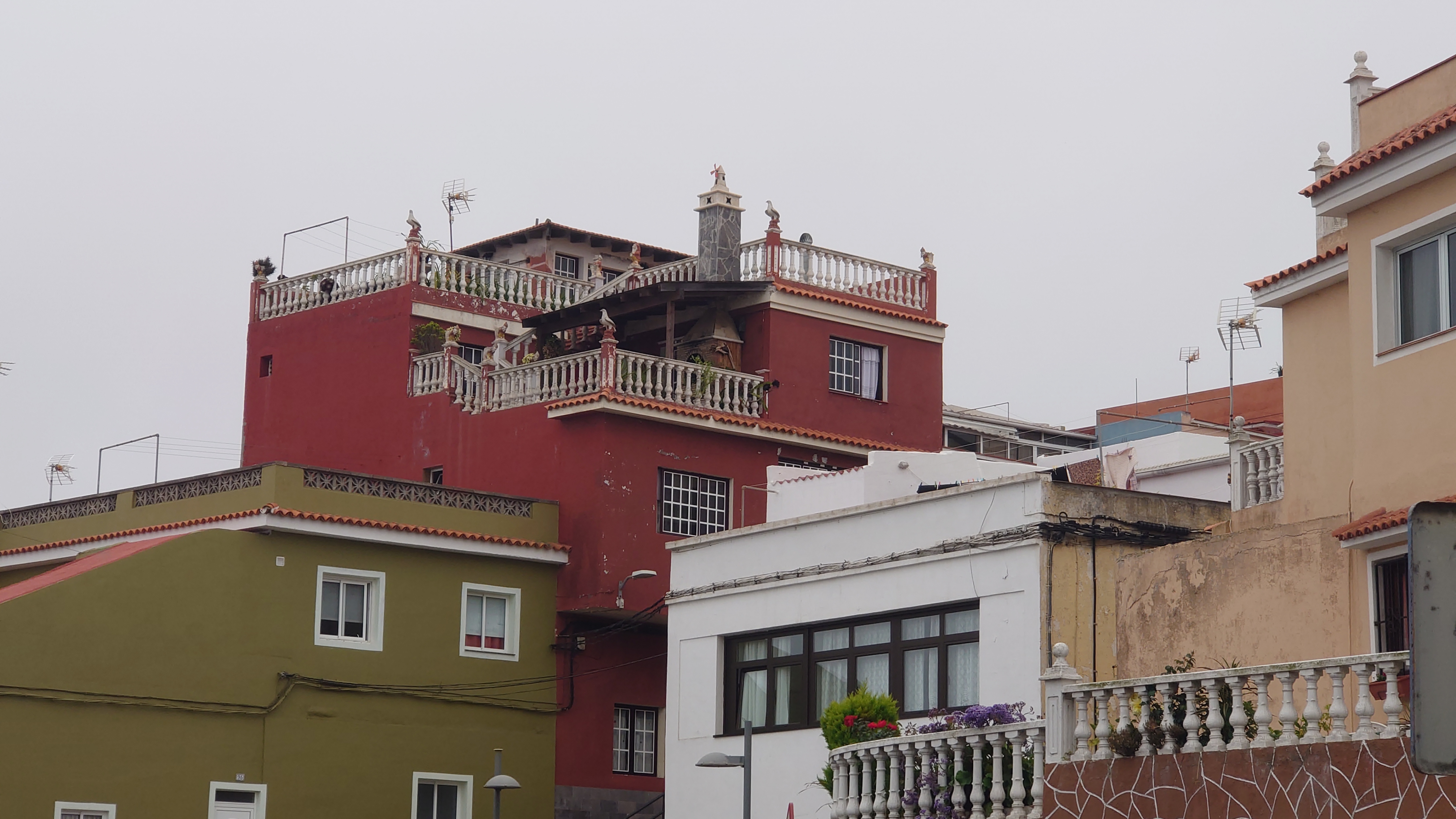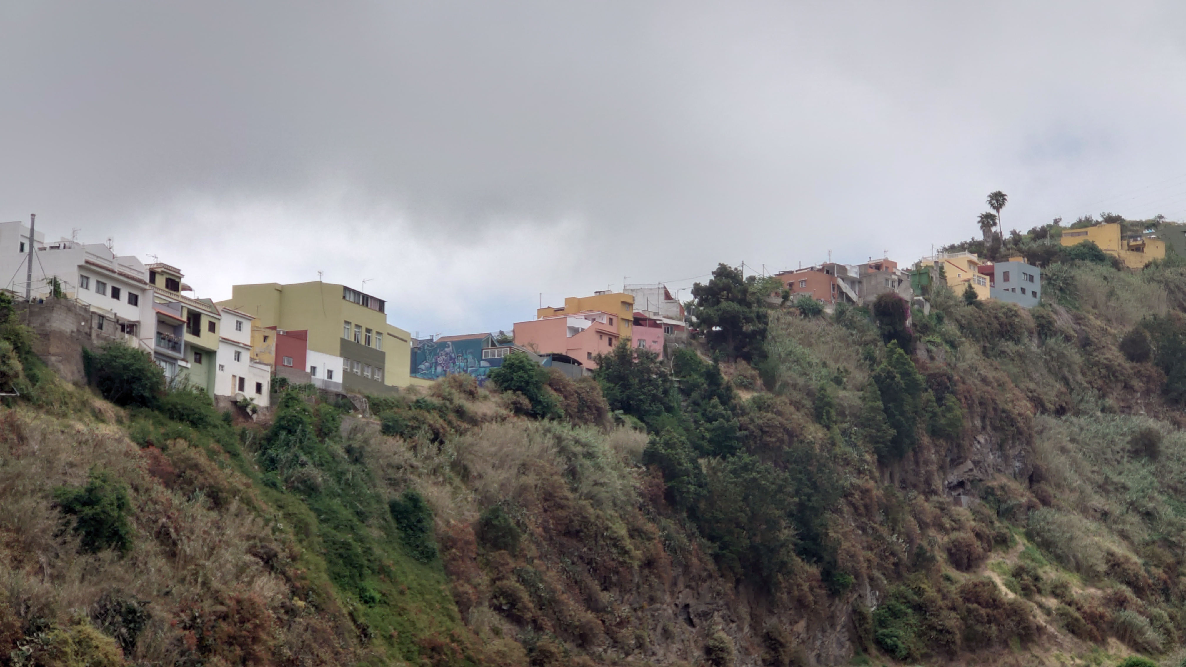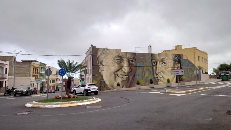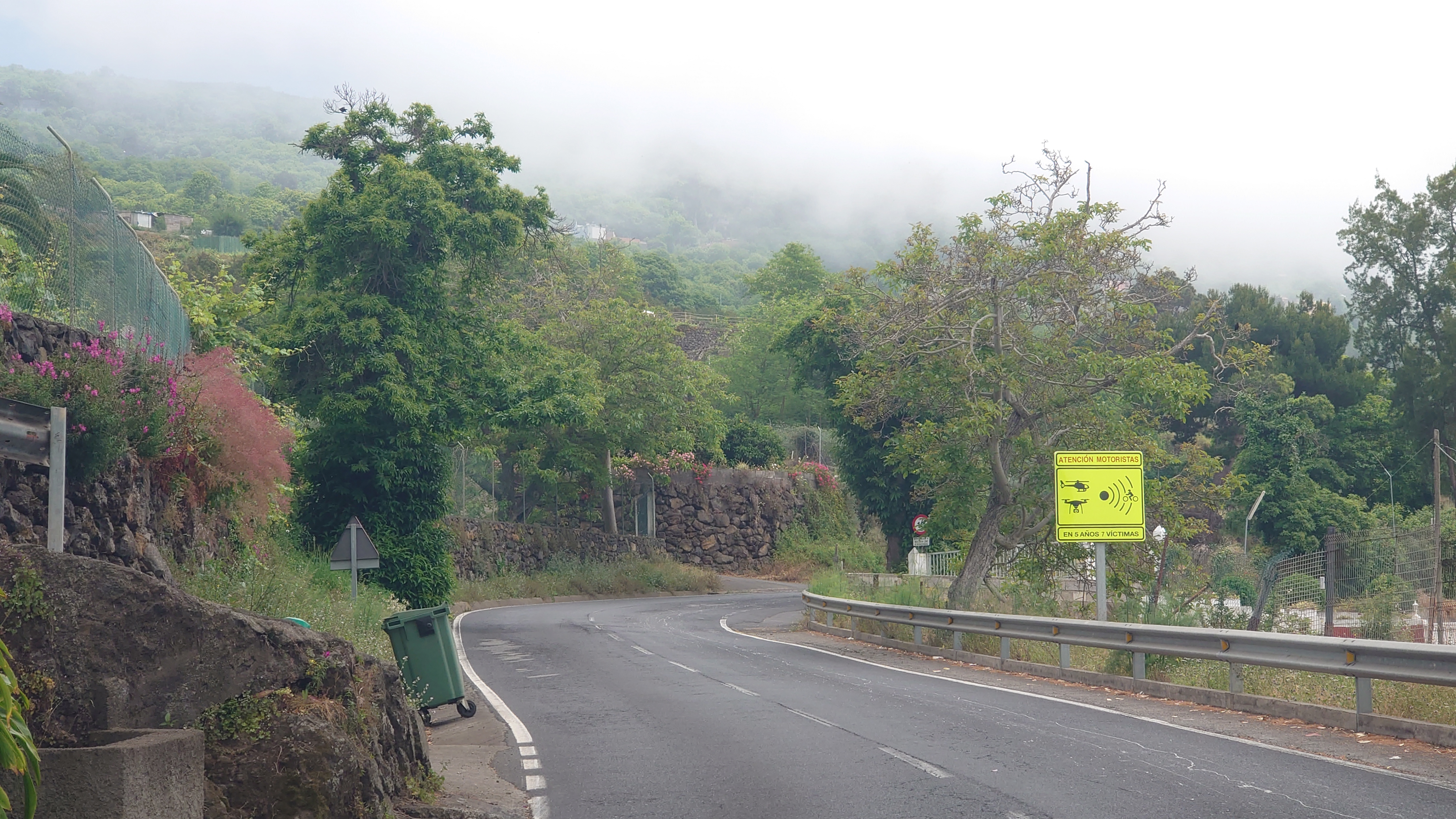 Der gestrige Tag hat mich des Nachts lange beschäftigt. Erst Schüttelfrost, dann Hitzewellen und brennende Waden, die das Laufen unmöglich machten, bis ich dann irgendwann zur Ruhe komme. Über 10 Stunden Schlaf hab ich nötig gehabt. Als ich aufwache, ist alles wieder gut. Auch der Gaumen ist spürbar besser geworden. Dennoch, ich brauche was Leichtes. Das Versteht auch das Wetter und bläst ein breites Wolkenband auf die Höhenlage. Es ist neblig und kühl. Meine heutige Etappe besteht nur aus Straße. Nachdem ich noch einmal den Riesenjacuzzi beschwommen habe, geht’s weiter entlang der Höhenstraßen TF 342 und 324 durch vergleichsweise dicht besiedeltes Gebiet. Ein Ort folgt dem nächsten. 500 Meter unter mir erstreckt sich eine breite, urbanisierte Landschaft um Puerto de la Cruz. Ich merke, dass ich da unten gar nicht sein will, auch wenn hier oben Straßen gerne mal über 20% Steigung haben. An vielen Häusern prangen große Graffiti. Schon seit Tagen fallen sie mir in Ortschaften ist Auge. Es scheint hier auch einen Inselkünstler zu geben. Dem muss ich nachgehen. Also fotografiere ich welche ab und gebe sie als Suchbegriff in Google ein. Heraus kommt ein Künstler namens „Sabotaje Al Montaje“. Er kommt von Lanzarote, hat 34.412 Follower auf Facebook und malt kanarische Hauswände an. Es gibt immer wieder was zu bestaunen auf dem Weg. Auch zu bestaunen ist überambitionierte Siedlungsplanung. Was machen Trainingsgeräte auf einem Bürgersteig vor Geschäften und Bars neben einer stark frequentierten Straße? Soll man da jetzt etwa sein Steetworkout mit Publikum gestalten? Zu gerne würde ich wissen, ob diese Dinger irgendwann mal ihren Zweck erfüllt haben. So ist es entspannend zu laufen, bis sich dann mein Gaumen langsam aber sicher wieder zurückmeldet. Ich spüre, wie die linke Seite deutlich anschwillt, sobald ich Fahrt aufnehme und anschwillt, wenn ich Pause mache. Nicht gut. So erklimmt man keine Berge. Nichts desto trotz komme ich gut durch und erreiche gegen Nachmittag mein kleines Refugium auf 750 Meter Höhe direkt an einem Barranco mit Blick bis zur Küste. Ich lege mich aufs Bett, versuche was zu essen, aber der Gaumen sagt „Schlürf mal lieber!“ Ich muss planen, was das für die nächsten beiden Tage bedeutet. Der Plan ist, den jetzt zu ¾ umrundeten Teide direkt anzugehen Navi an: 1800 Höhenmeter auf 30 Kilometer Strecke werden das morgen. Selbst wenn ich keine Beschwerden hätte, wäre das schlicht monströs… und vor allem langatmig. Es geht nur auf einer Hauptstraße aufwärts. Zwischen hier und dem Parador auf fast 2500 Metern Höhe, das ich gebucht habe, gibt’s nichts. 5 Minuten von meinem Hotel entfernt ist eine Bushaltestelle der Linie 348, die einmal am Tag fährt, am besagten Parador endet und um 9:48 Uhr abfährt. Na wenn das kein Wink mit dem Zaunpfahl ist. Bevor ich vor lauter Idealismus den Berg nicht angemessen würdigen kann, ist das doch einen Bombenplan.