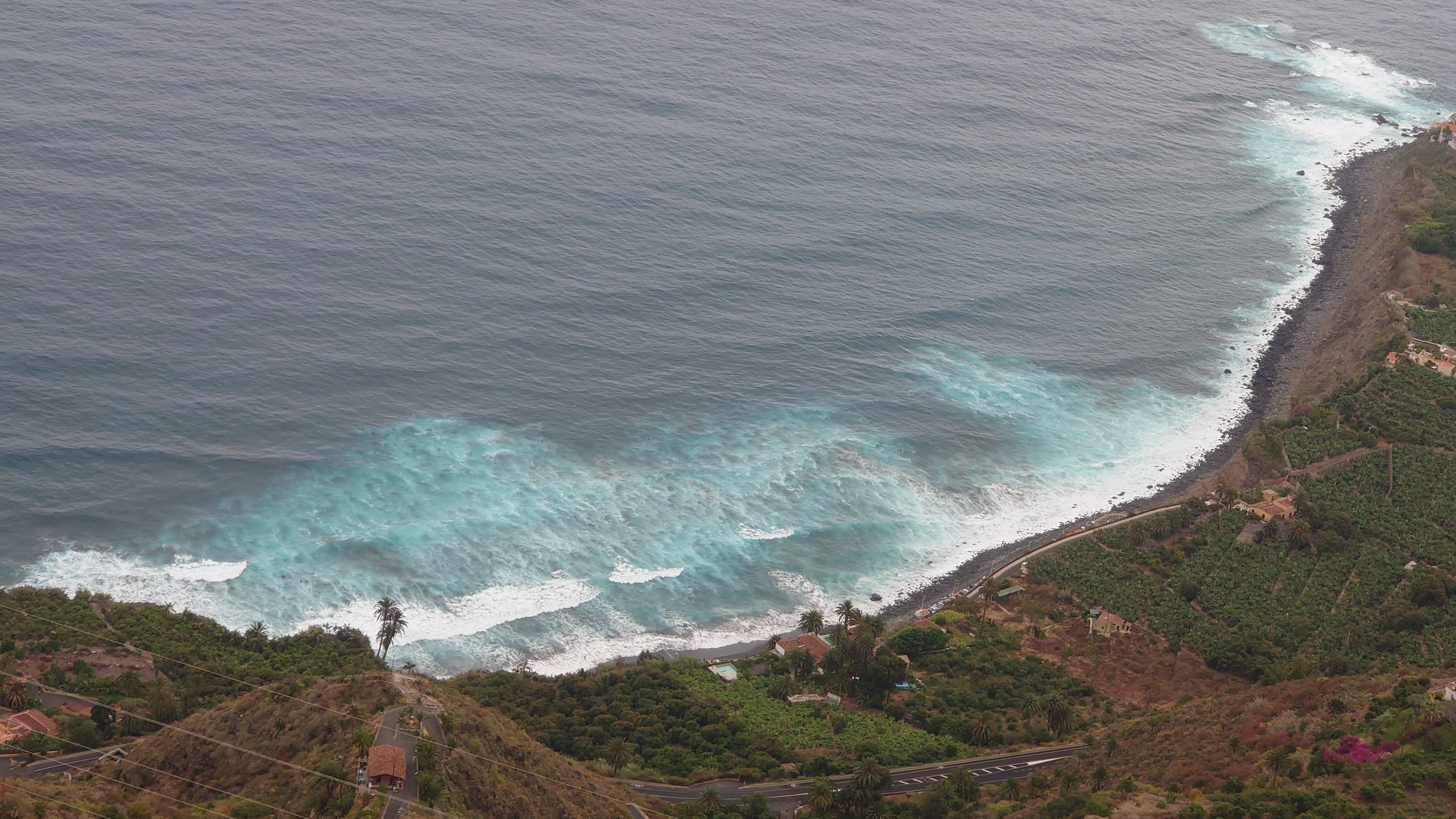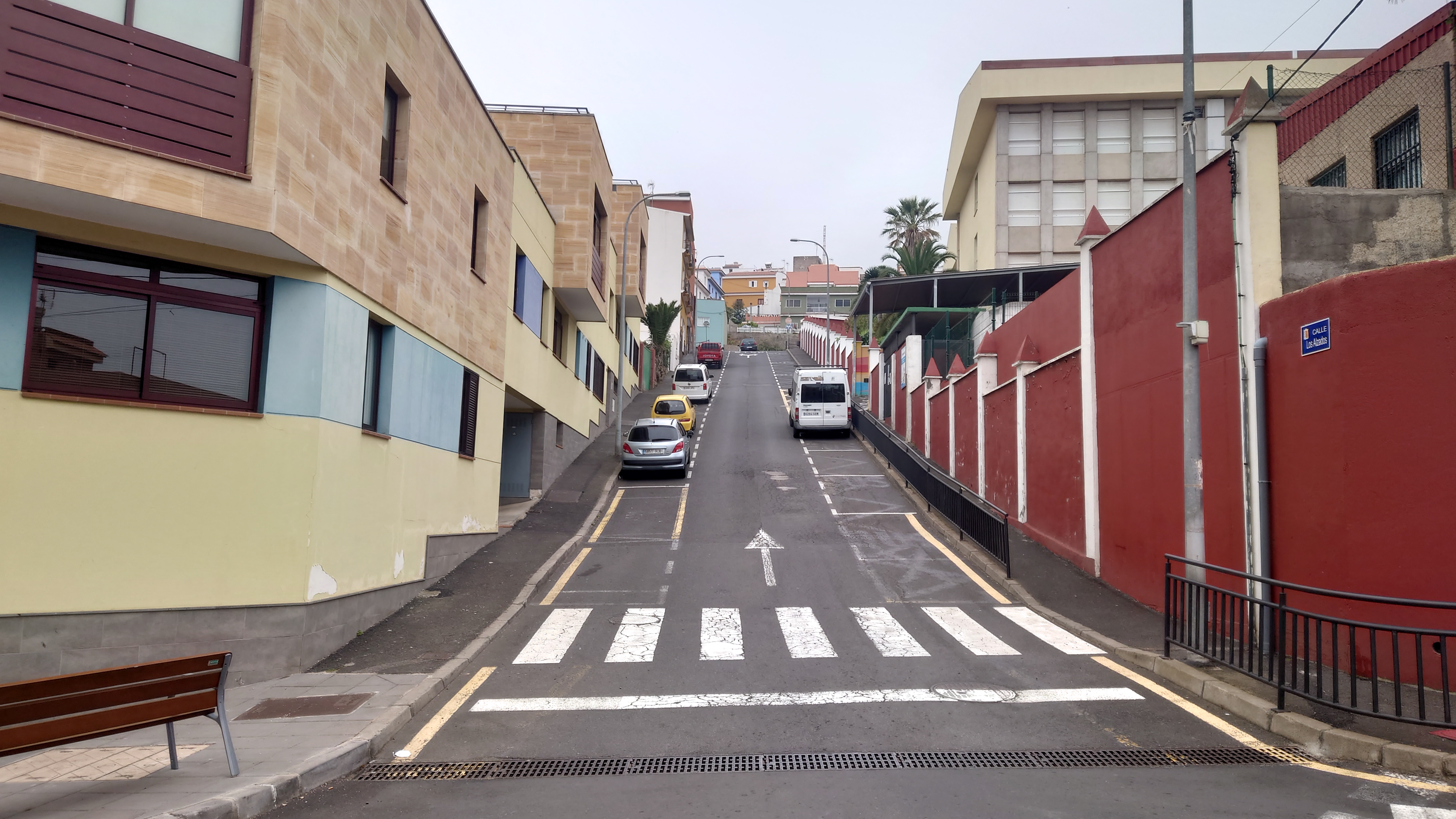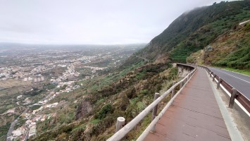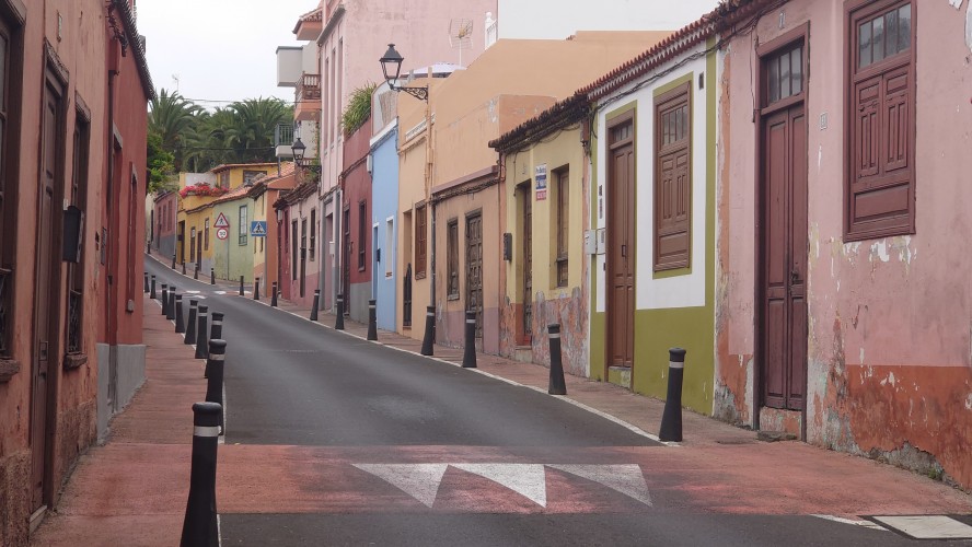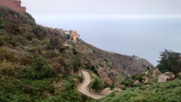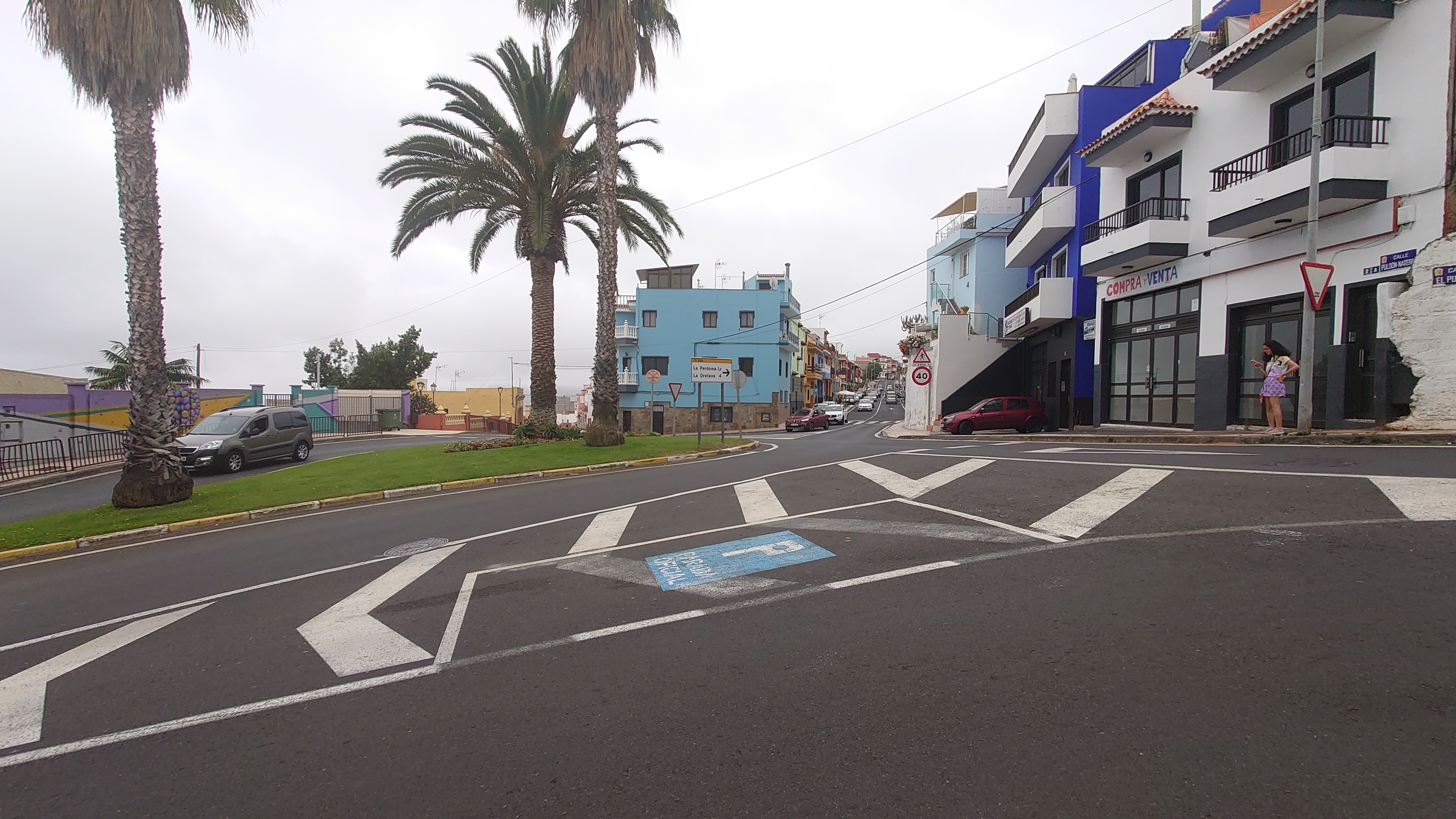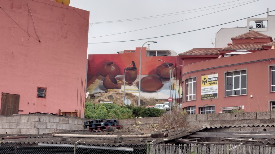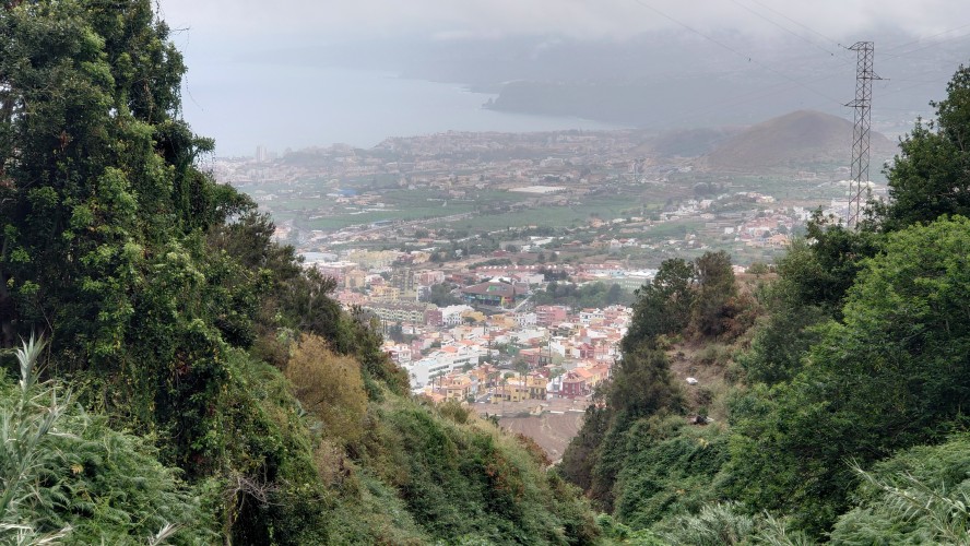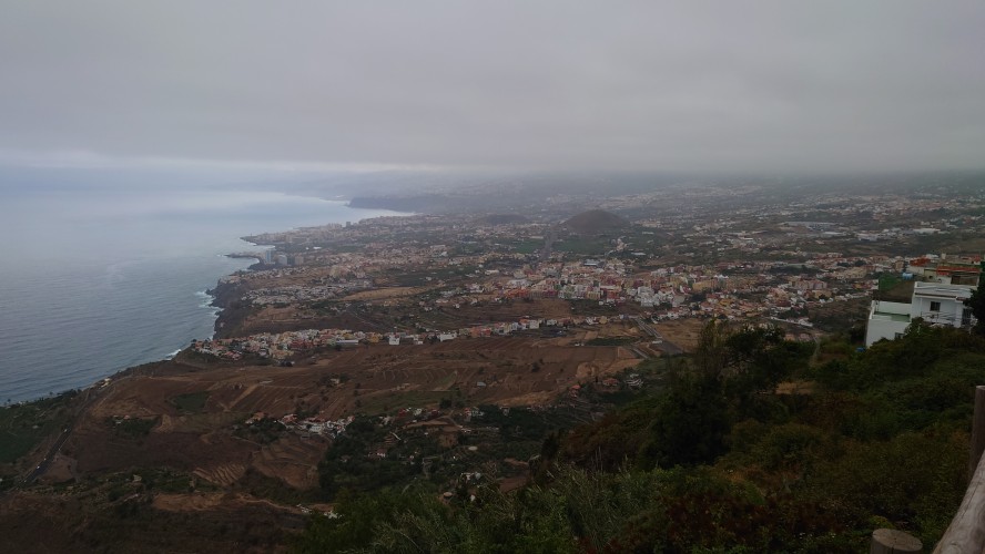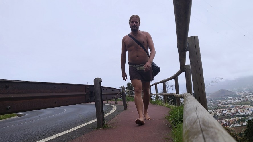 Der gestrige Tag hat mich des Nachts lange beschäftigt. Erst Schüttelfrost, dann Hitzewellen und brennende Waden, die das Laufen unmöglich machten, bis ich dann irgendwann zur Ruhe komme. Über 10 Stunden Schlaf hab ich nötig gehabt. Als ich aufwache, ist alles wieder gut. Auch der Gaumen ist spürbar besser geworden. Dennoch, ich brauche was Leichtes. Das Versteht auch das Wetter und bläst ein breites Wolkenband auf die Höhenlage. Es ist neblig und kühl. Meine heutige Etappe besteht nur aus Straße. Nachdem ich noch einmal den Riesenjacuzzi beschwommen habe, geht’s weiter entlang der Höhenstraßen TF 342 und 324 durch vergleichsweise dicht besiedeltes Gebiet. Ein Ort folgt dem nächsten. 500 Meter unter mir erstreckt sich eine breite, urbanisierte Landschaft um Puerto de la Cruz. Ich merke, dass ich da unten gar nicht sein will, auch wenn hier oben Straßen gerne mal über 20% Steigung haben. An vielen Häusern prangen große Graffiti. Schon seit Tagen fallen sie mir in Ortschaften ist Auge. Es scheint hier auch einen Inselkünstler zu geben. Dem muss ich nachgehen. Also fotografiere ich welche ab und gebe sie als Suchbegriff in Google ein. Heraus kommt ein Künstler namens „Sabotaje Al Montaje“. Er kommt von Lanzarote, hat 34.412 Follower auf Facebook und malt kanarische Hauswände an. Es gibt immer wieder was zu bestaunen auf dem Weg. Auch zu bestaunen ist überambitionierte Siedlungsplanung. Was machen Trainingsgeräte auf einem Bürgersteig vor Geschäften und Bars neben einer stark frequentierten Straße? Soll man da jetzt etwa sein Steetworkout mit Publikum gestalten? Zu gerne würde ich wissen, ob diese Dinger irgendwann mal ihren Zweck erfüllt haben. So ist es entspannend zu laufen, bis sich dann mein Gaumen langsam aber sicher wieder zurückmeldet. Ich spüre, wie die linke Seite deutlich anschwillt, sobald ich Fahrt aufnehme und anschwillt, wenn ich Pause mache. Nicht gut. So erklimmt man keine Berge. Nichts desto trotz komme ich gut durch und erreiche gegen Nachmittag mein kleines Refugium auf 750 Meter Höhe direkt an einem Barranco mit Blick bis zur Küste. Ich lege mich aufs Bett, versuche was zu essen, aber der Gaumen sagt „Schlürf mal lieber!“ Ich muss planen, was das für die nächsten beiden Tage bedeutet. Der Plan ist, den jetzt zu ¾ umrundeten Teide direkt anzugehen Navi an: 1800 Höhenmeter auf 30 Kilometer Strecke werden das morgen. Selbst wenn ich keine Beschwerden hätte, wäre das schlicht monströs… und vor allem langatmig. Es geht nur auf einer Hauptstraße aufwärts. Zwischen hier und dem Parador auf fast 2500 Metern Höhe, das ich gebucht habe, gibt’s nichts. 5 Minuten von meinem Hotel entfernt ist eine Bushaltestelle der Linie 348, die einmal am Tag fährt, am besagten Parador endet und um 9:48 Uhr abfährt. Na wenn das kein Wink mit dem Zaunpfahl ist. Bevor ich vor lauter Idealismus den Berg nicht angemessen würdigen kann, ist das doch einen Bombenplan.