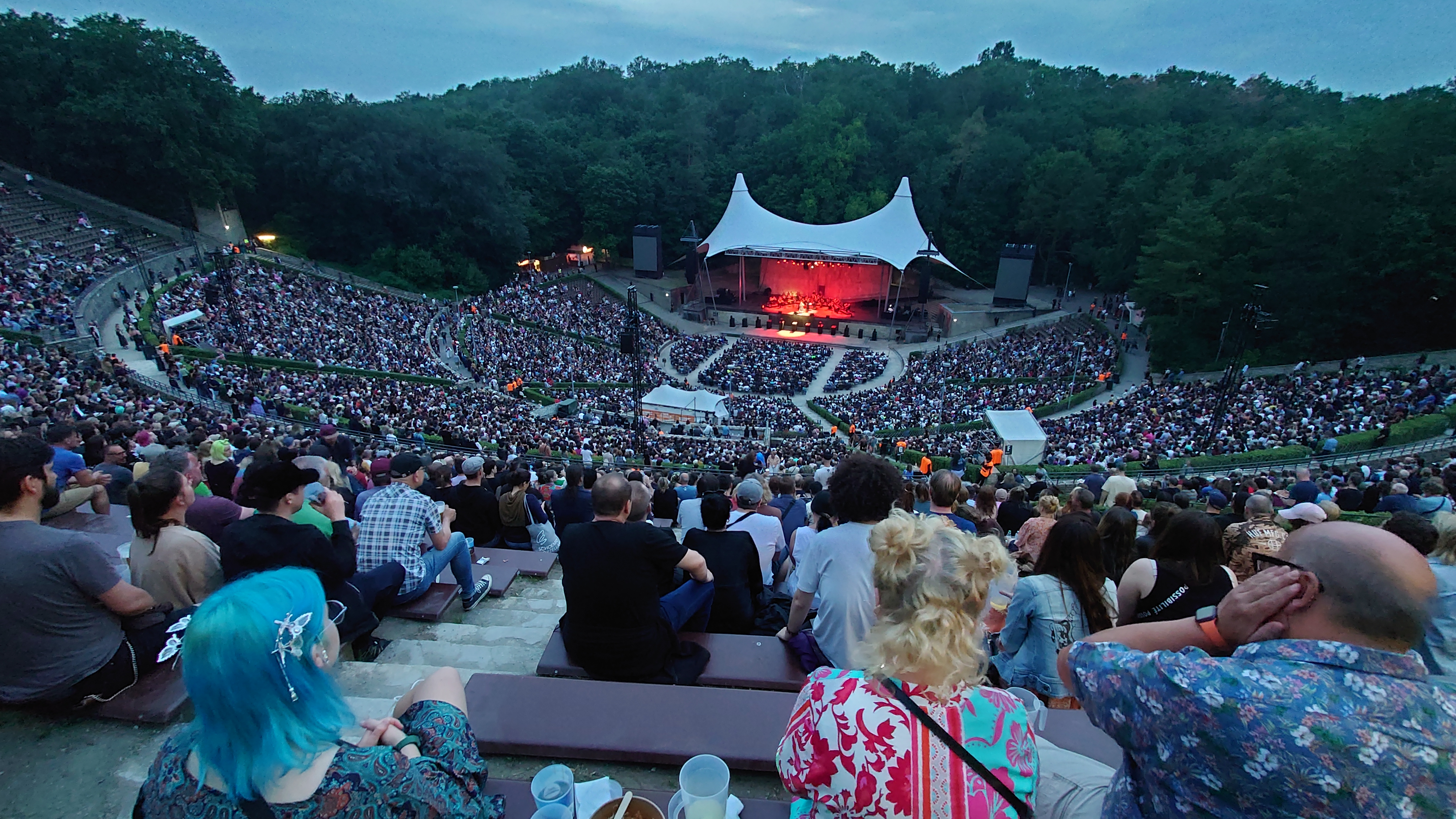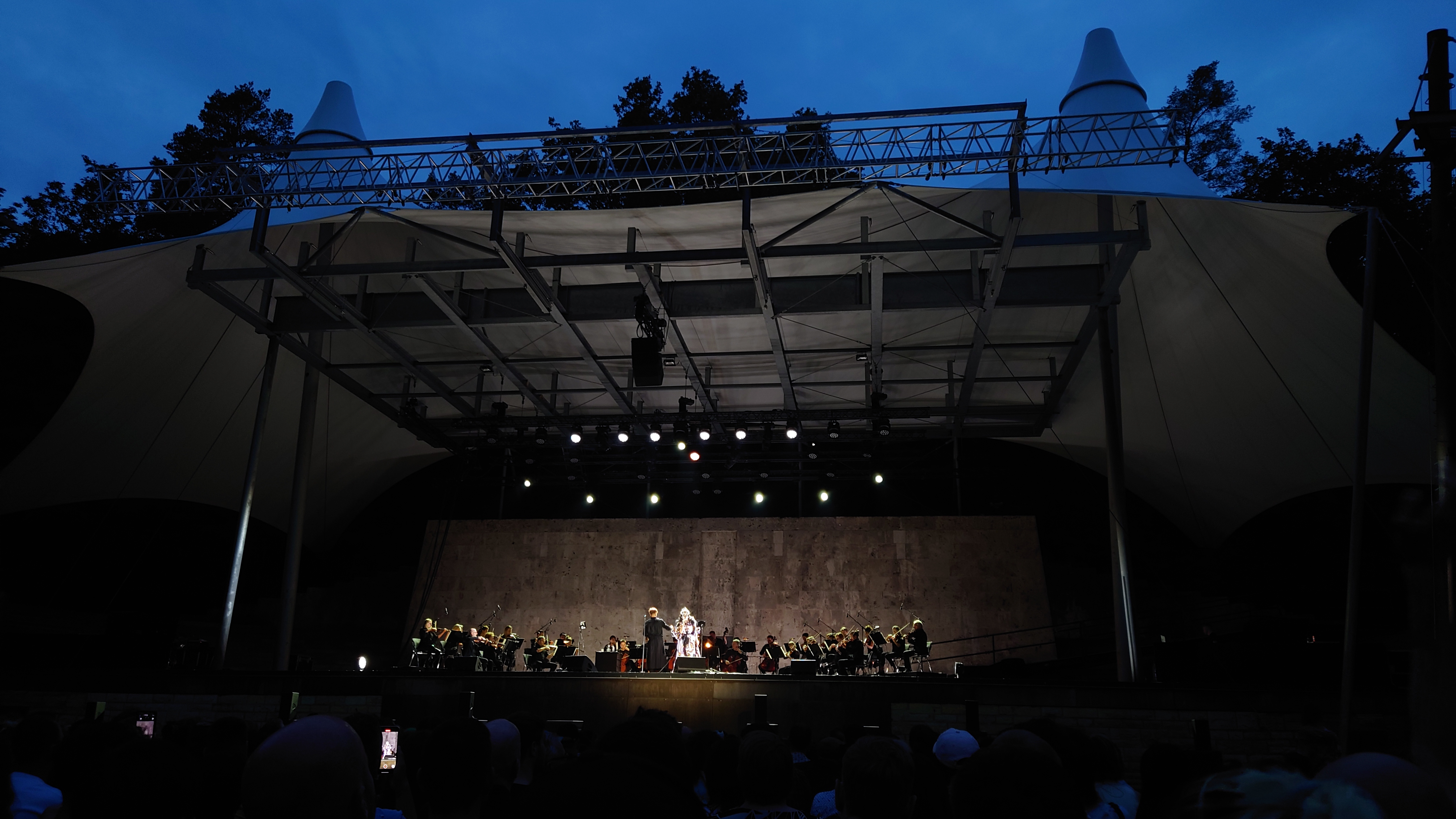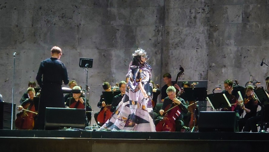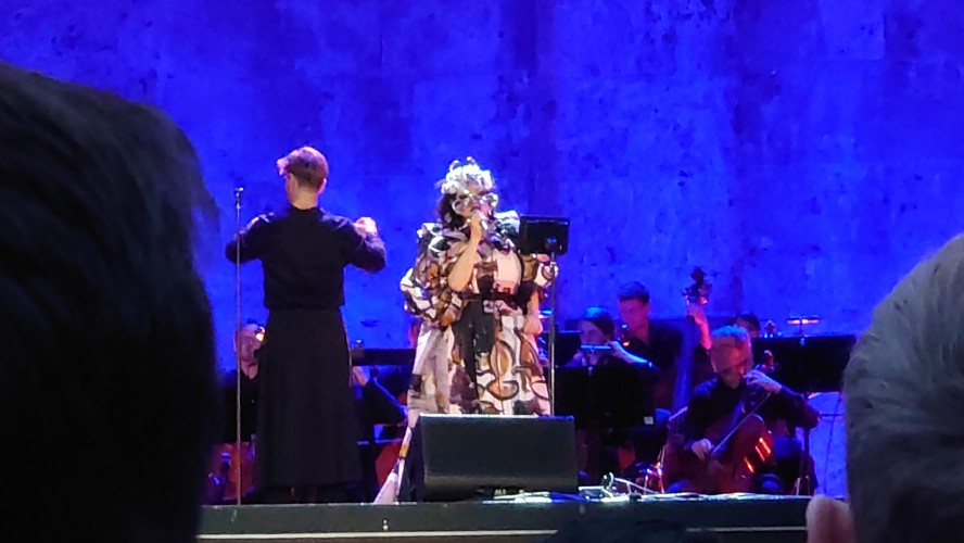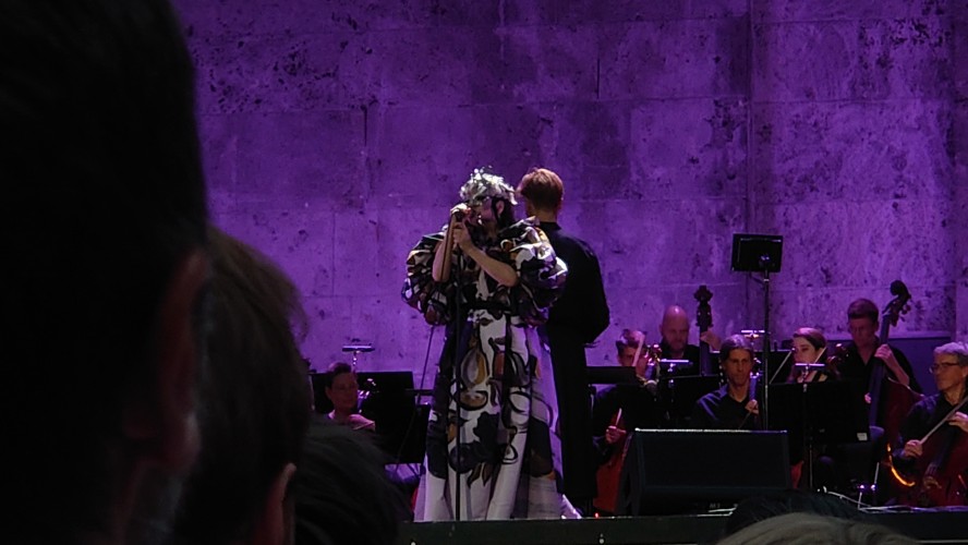 Das Orchester tritt auf, dann schwebt Björk als riesiger Wattebausch hinein. Auch sie ist exzentrisch, auch wenn sie mittlerweile 56 ist. 10 Jahre ist es her, dass ich mit ihr auf Island per Zufall mal gemeinsam In einem Hot Pot gesessen habe. Das hier ist das Produkt Björk. Das Konzert beginnt. Einst experimentelle Musik rein für Orchester. Es wirkt grandios. Das Publikum schwelgt in Nostalgie und Björk bedient sie. Es werden zum Großteil die Klassiker der 90er Jahre inszeniert, die alle freudig erwarten. Ich muss sagen, ich bin froh darum. Das war die Zeit, in der sie mich begeistert hat, eine Zeit, in der alleine der Gedanke daran, jemand könne als Isländerin kulturelle Bedeutung in der Welt erlangen, schon exzentrisch war. Das hat sich 30 Jahre später gänzlich gewandelt. Viele sind ihr gefolgt und Björk ist in meinen Augen so etwas wie eine phantastische Punk-Mama für die nachfolgenden Generationen geworden und wird als solche geliebt, auch wenn sie musikalisch eigentlich schon einen Schritt weiter sind. Sie selbst ist unter ihrem voluminösen Kleid kaum zu erkennen. Soll man sie überhaupt erkennen oder soll man nur das Kunstwerk begreifen. Schlussendlich kommentiert aber auch sie die Außergewöhnlichkeit der Umstände und nimmt damit für einen kurzen Moment Kontakt mit dem Publikum auf, der in Anbetracht der Reaktionen sehnlichst erhofft wurde. Ansonsten habe ich oft das Gefühl, dass sie ihren privaten Kern und bewusst in dick mit ihrem Kunstprodukt ummantelt, um ihn gegen Eindringlinge abzukapseln und zu schützen. Das ist irgendwo schade. Andererseits ist sie so etabliert, dass sie sich selbst so leisten kann, wie sie es will. Und man ist dankbar für jedes deutsche „Dankeschön“, das sie nach jedem Titel bekundet.