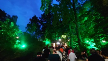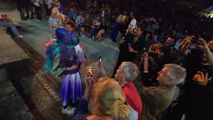 Das Konzert ist zu Ende. Eine Gestalt ohne Gesicht, gestaltet wie ein Blumenstrauß rennt nach vorn und will die Setlist. Nach einigem Betteln erhält er sie und präsentiert sie stolz seinem Publikum zur Eigenpromotion. Ein Mini-Björk, der seine Aufmerksamkeit genießt und für seine exzentrische Erscheinung ein paar Minuten lang gefeiert wird wie ein Star, bis wir dann alle die steilen Stufen hinauf in alle Richtungen in die Nacht entschwinden, den kleinen Zauber mit nach Hause nehmen und hoffentlich nicht nur ins Instagram-Fotoalbum wegheften mit der Hoffnung auf mehr Likes.