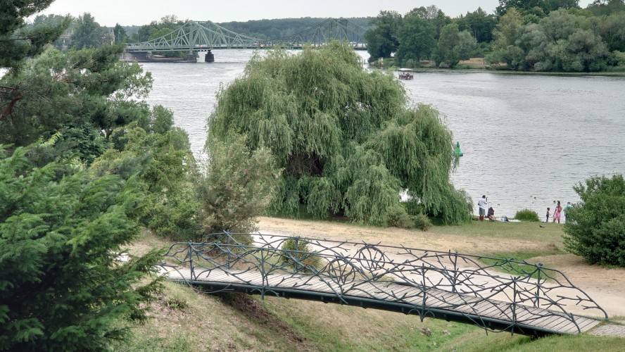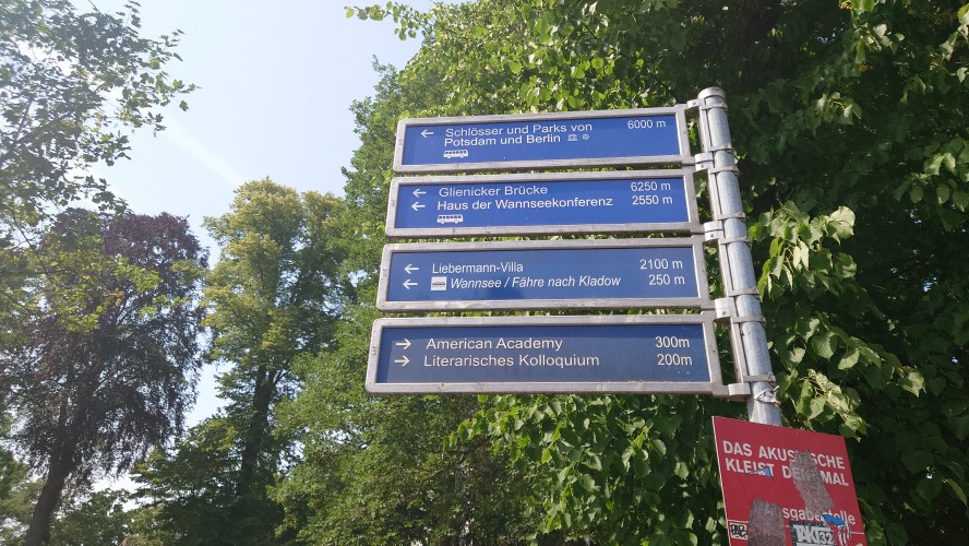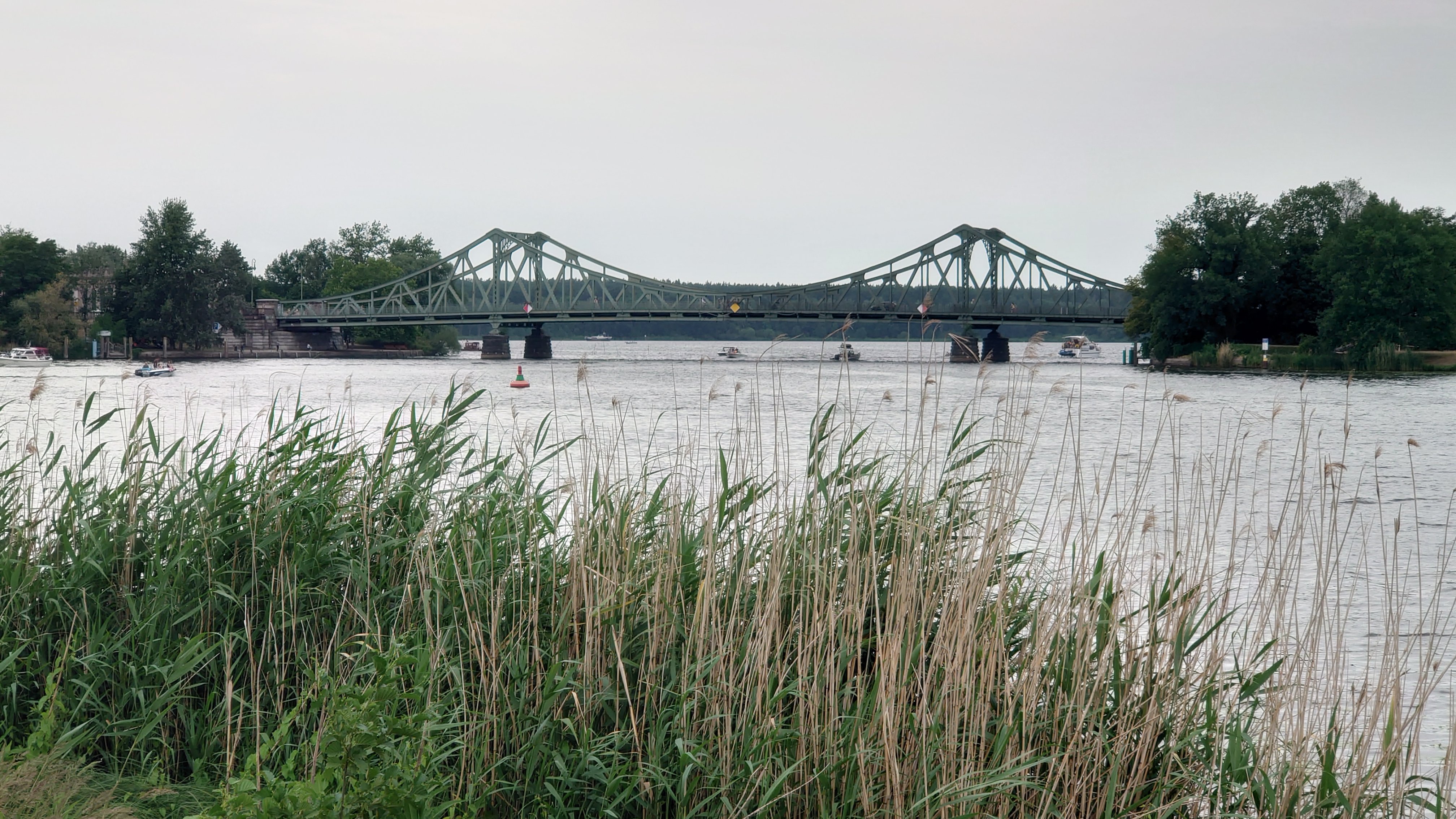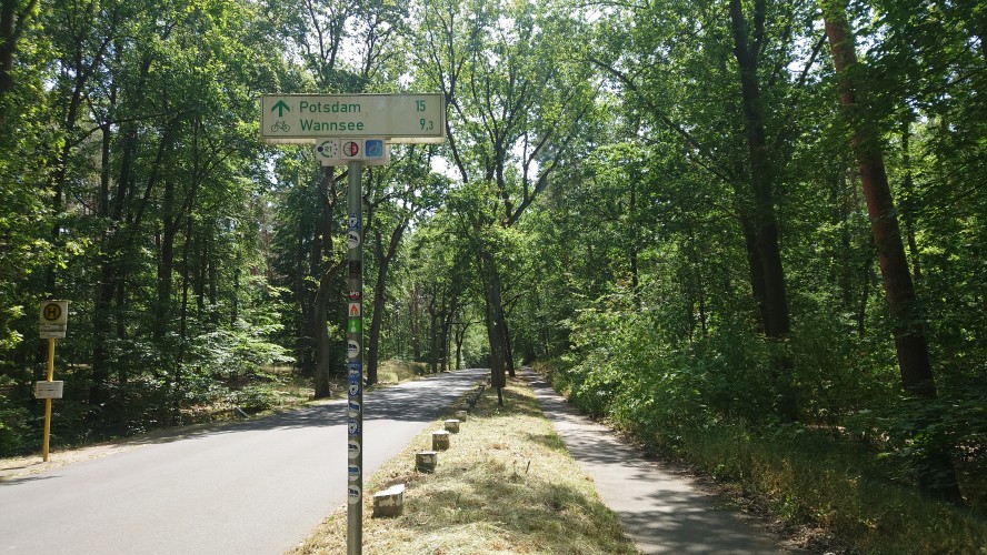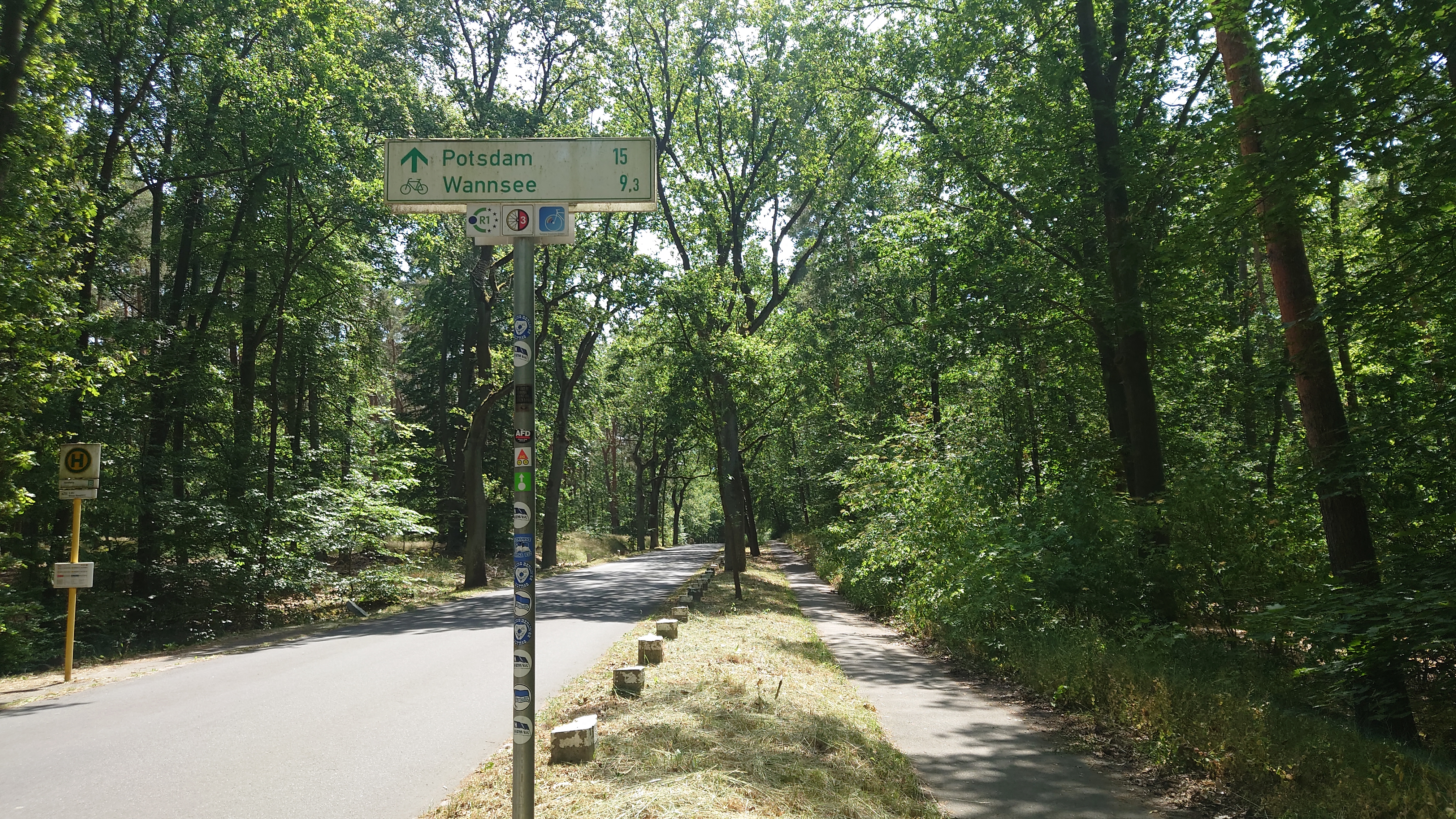 Irgendwann erreiche ich die Königsstraße bzw. B1 bei Wannsee. Jetzt weiß ich, was der Wannsee ist, der früher mal eine Grenze war. Irgendwie hatte der See für mich bis dato immer eine Art mystische Aura, etwas Besonderes. Keine genaue Ahnung warum. Die Königsstraße führt weiter zur Glienicker Brücke, dem Grenztor zwischen Ost und West und dramatischer Mittelpunkt einiger Spionenaustausche zwischen Ost und West. Dort wurde ich vor 10 Jahren mal beim Joggen durch eine Wildschweinherde erschreckt, als ich beruflich in Potsdam war. Mich ziehts weiter an den Bahngleisen entlang, am Grab von Heinrich von Kleist vorbei, weiter durch die Wälder bis hin nach Glienicke und in den Babelsberger Park, ein Weltkulturerbe, wie ich erfahre. Vom weiten donnert es, aber hier kommt nichts an. Keiner ist groß im Wald anzutreffen und so hat es schon was Unheimliches an sich. Naja, falls ein Platzregen kommt, nehme ich ihn dankbar an.