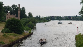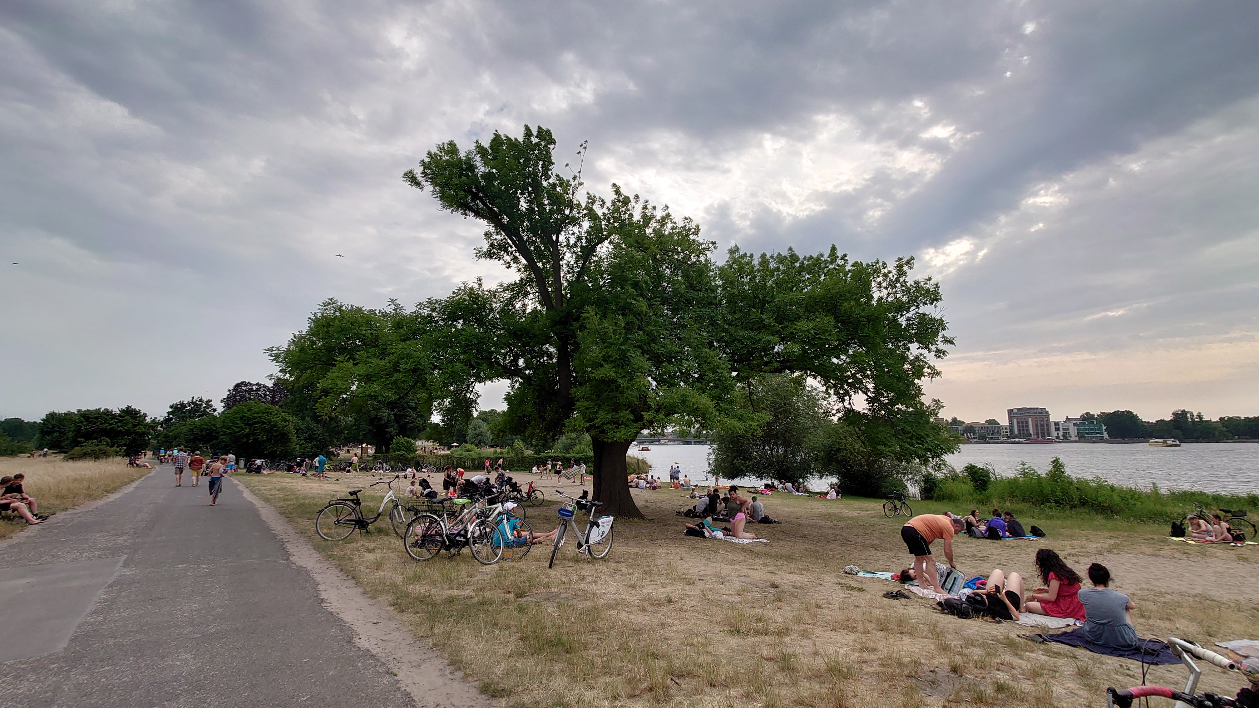 Dann kommt der Park und ich stehe schließ vor dem Babelsberger Schloss. Darunter entspringt sogar eine Wasserquelle. Daneben eine Würstchenbude. Oh toll, ich brauche Energie, nach der Sauna. Er hat Zitroneneis, ich setze mich vors Schloss und schlürfe es genüsslich vor mich hin. Auch das Gewitter zieht ab. Potsdam liegt auf der gegenüberliegenden Seite und wird durch die Rotsdamer Havel von mir getrennt. Auch hieriegt alles im Park und badet. Und ich merke, dass ich in Potsdam: FKK ist kein Thema. Der eine macht’s, der andere nicht. Ich finde, die Leute hier gehen echt entspannt mit dem Thema um.
