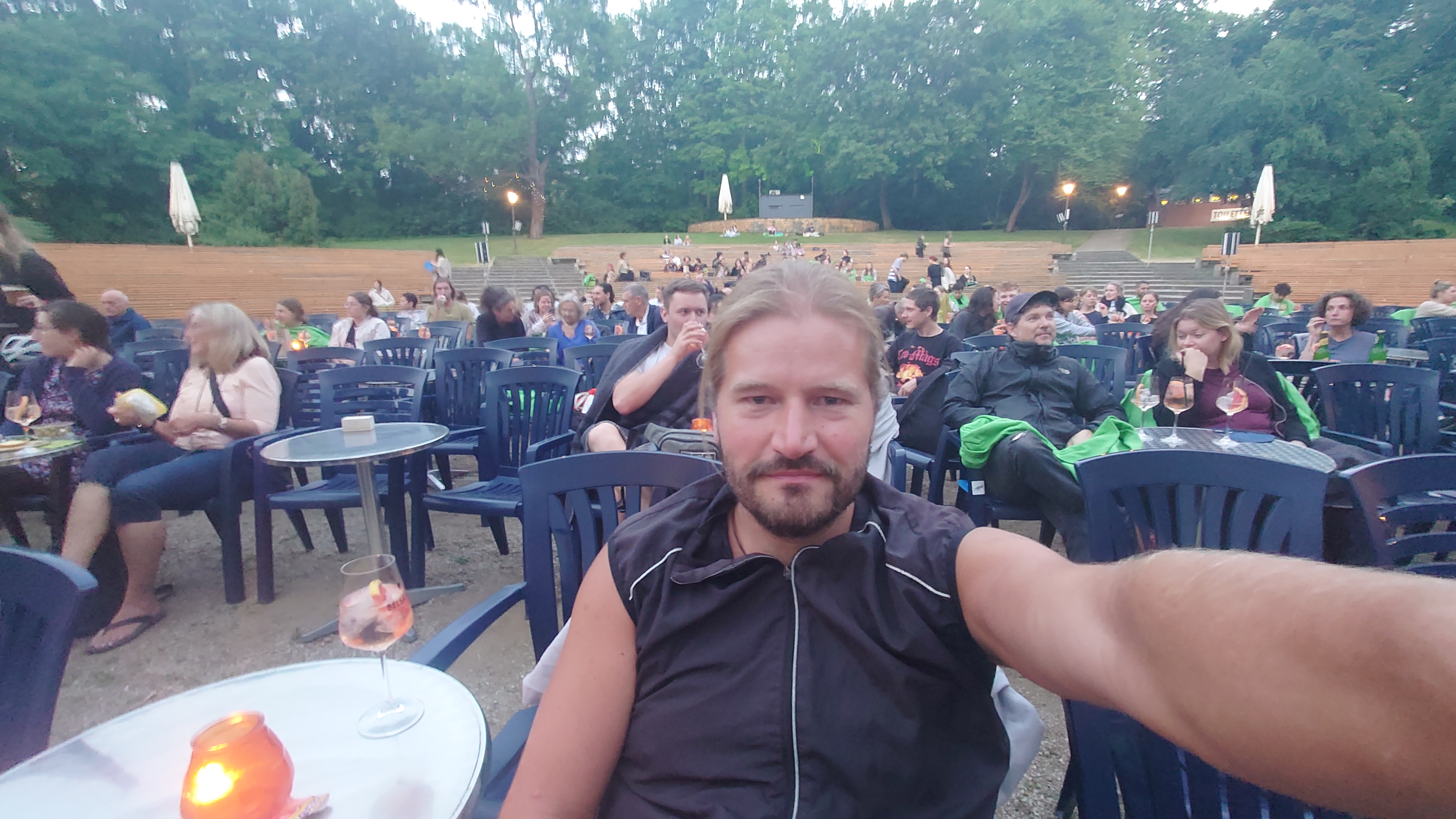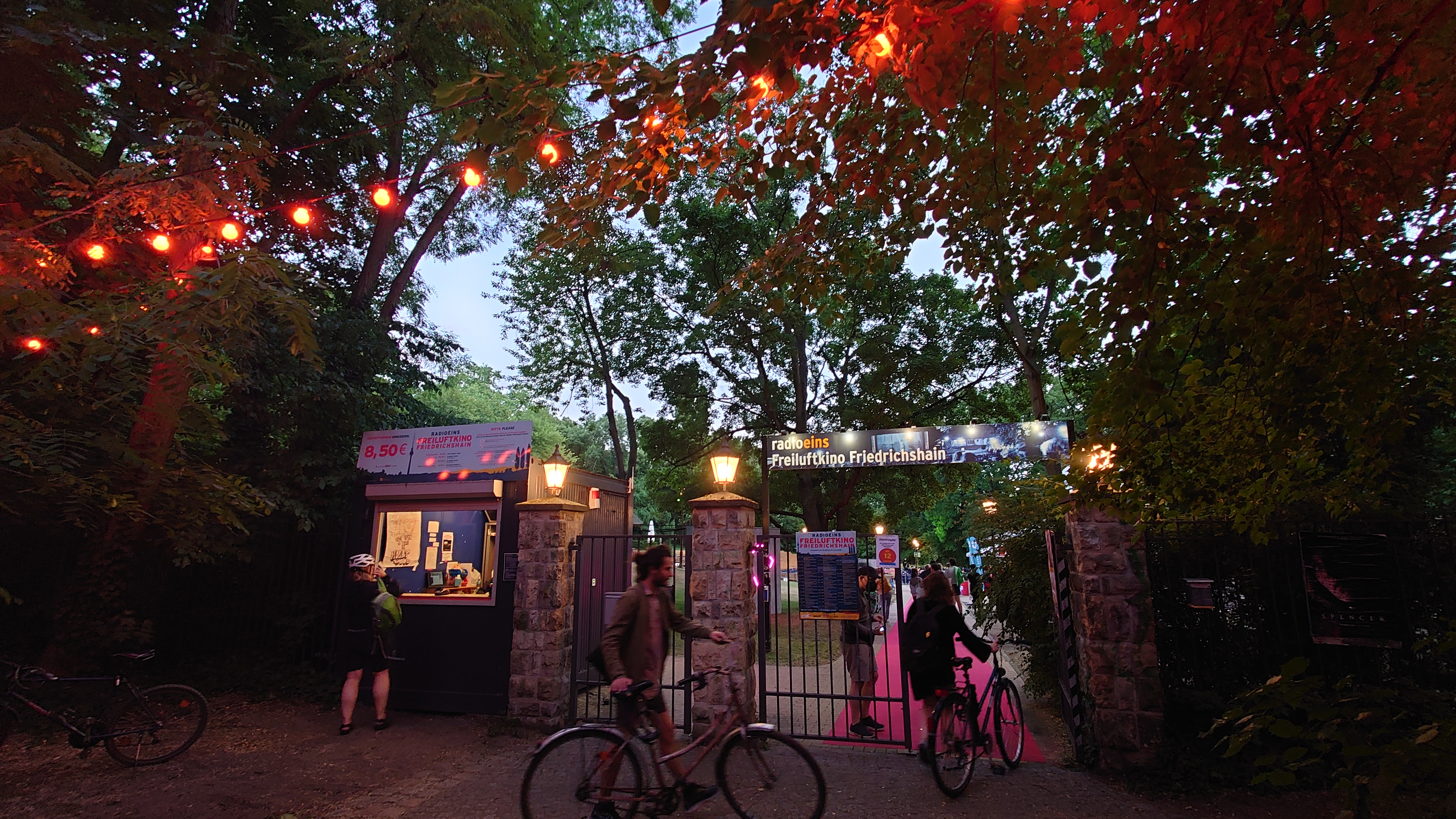 Immer noch sind es 30 Grad. Ich hab noch Lust. Was mache ich damit? Ein Blick ins Netz führt zu einem Glücksgefühlchen: 600 Meter von meiner Wohnung entfernt ist mitten im Friedrichshain ein Freiluftkino, das um 21:45 sogar einen richtig guten Film bringt! Abend mehr als gerettet, es ist perfekt bei diesem Wetter. Also hin!