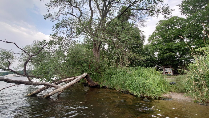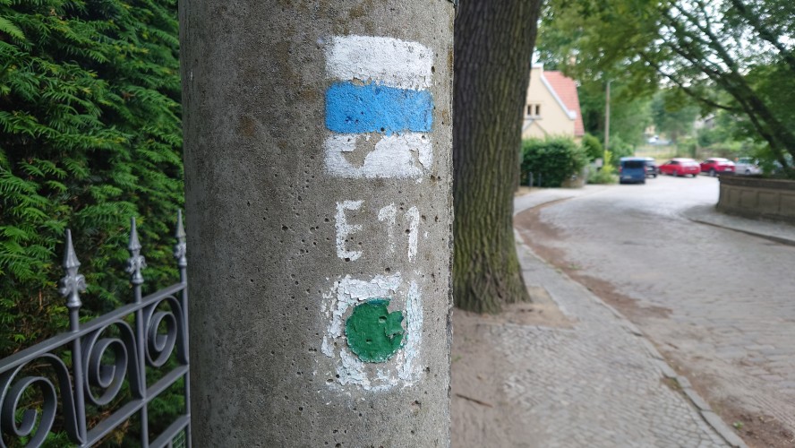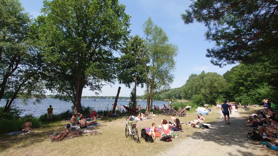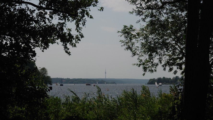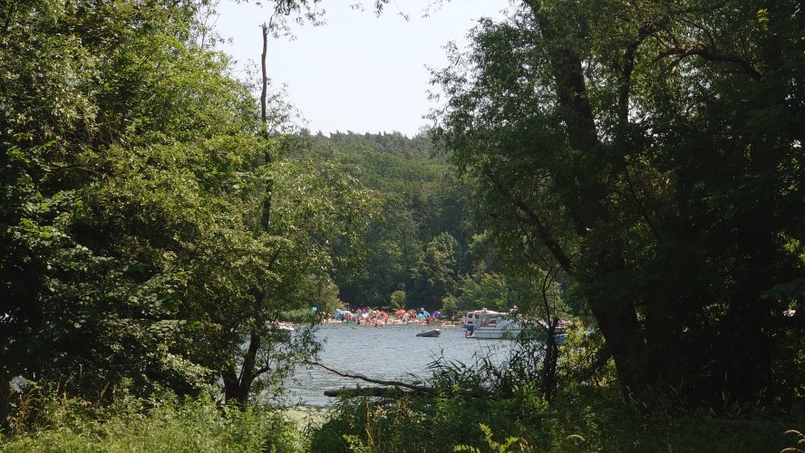 Es führt ein Weg immer am der Havel entlang durch den Wald, bis nach Potsdam hinein. Das verspricht Schatten, Natur, Wasser und sogar Kultur, was will man mehr? Ich habe keine Probleme mit Hitze, dagegen kann man sich ausziehen. Es ist irgendwie eine Verlängerung des GR 133 in ebenwürdigem Klima. Ganz Berlin zieht es hier hin, um sich auszuziehen. Den ganzen Weg entlang hat kaum einer mehr an als Badekleidung. Jedes Loch an der Havel bis hinunter zum Wannsee wird von Familien genutzt. Bis auf die Fahrradwege liegen die Leute. Naja… das ist halt der Nachteil an schönen Ecken in Metropolen: wenn es schön ist, sind wirklich ALLE da. Aber es ist eine gelassene Stimmung und die Leute sind irgendwie grundfreundlich zueinander.