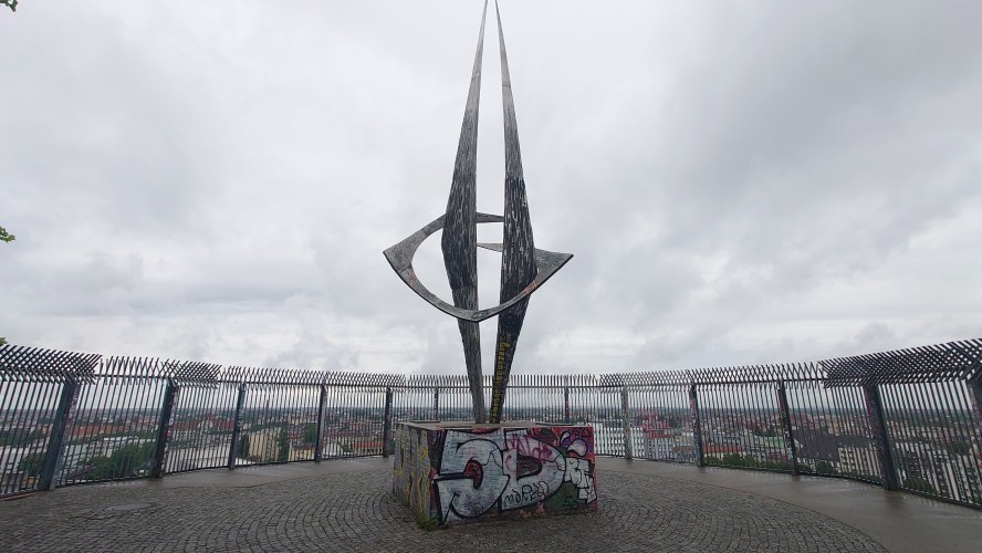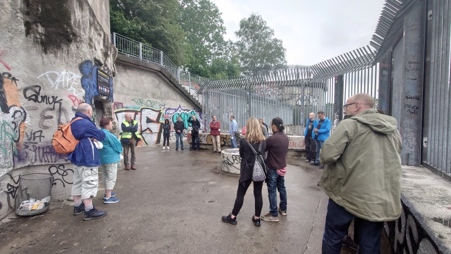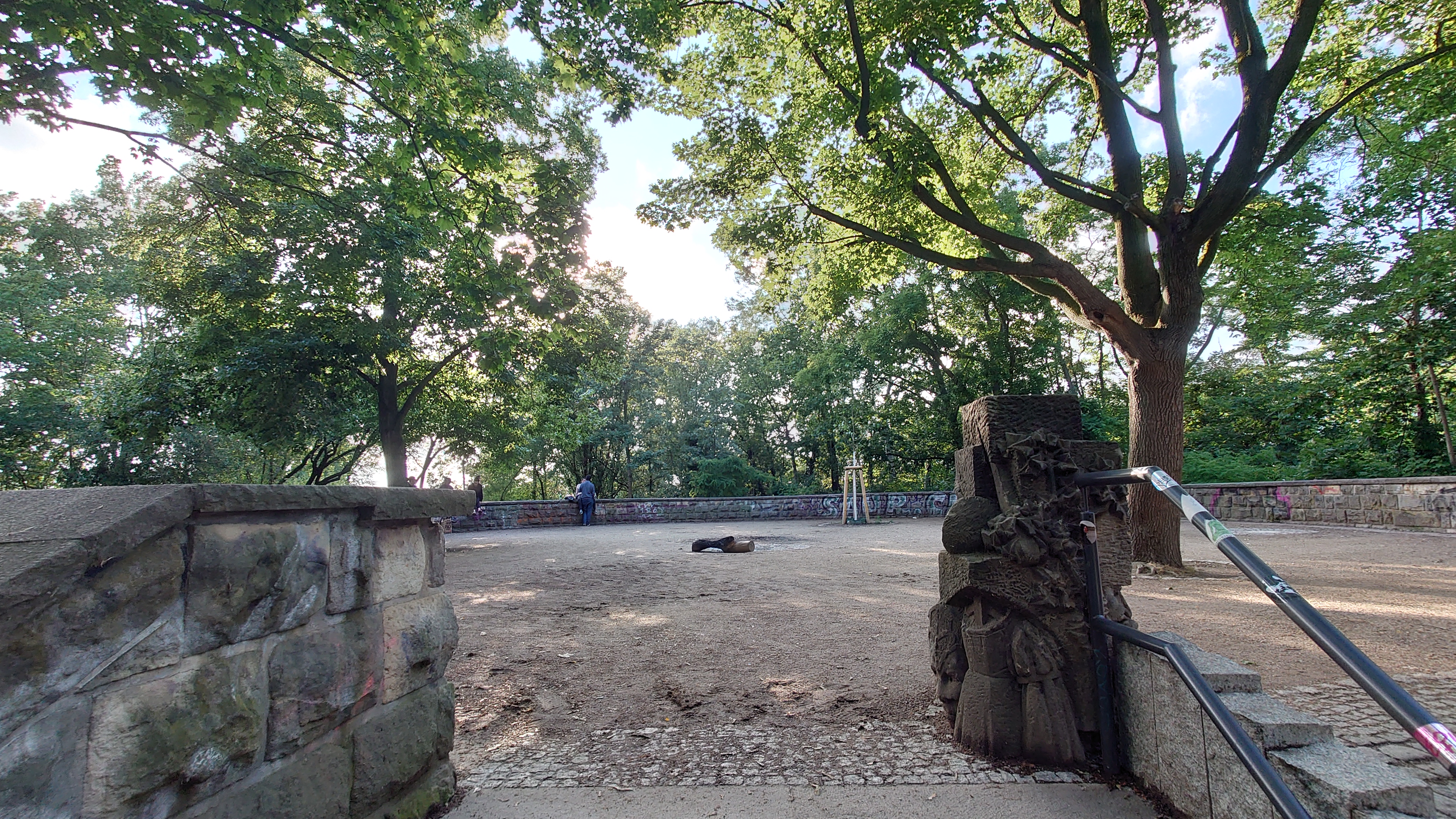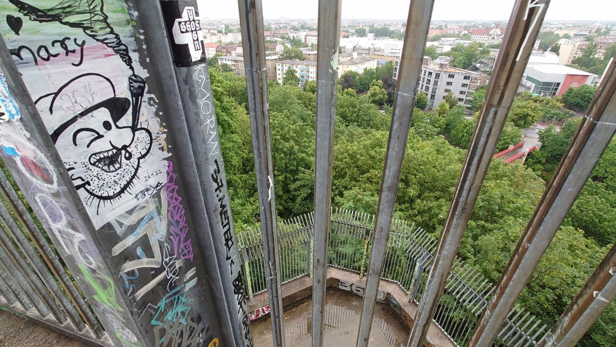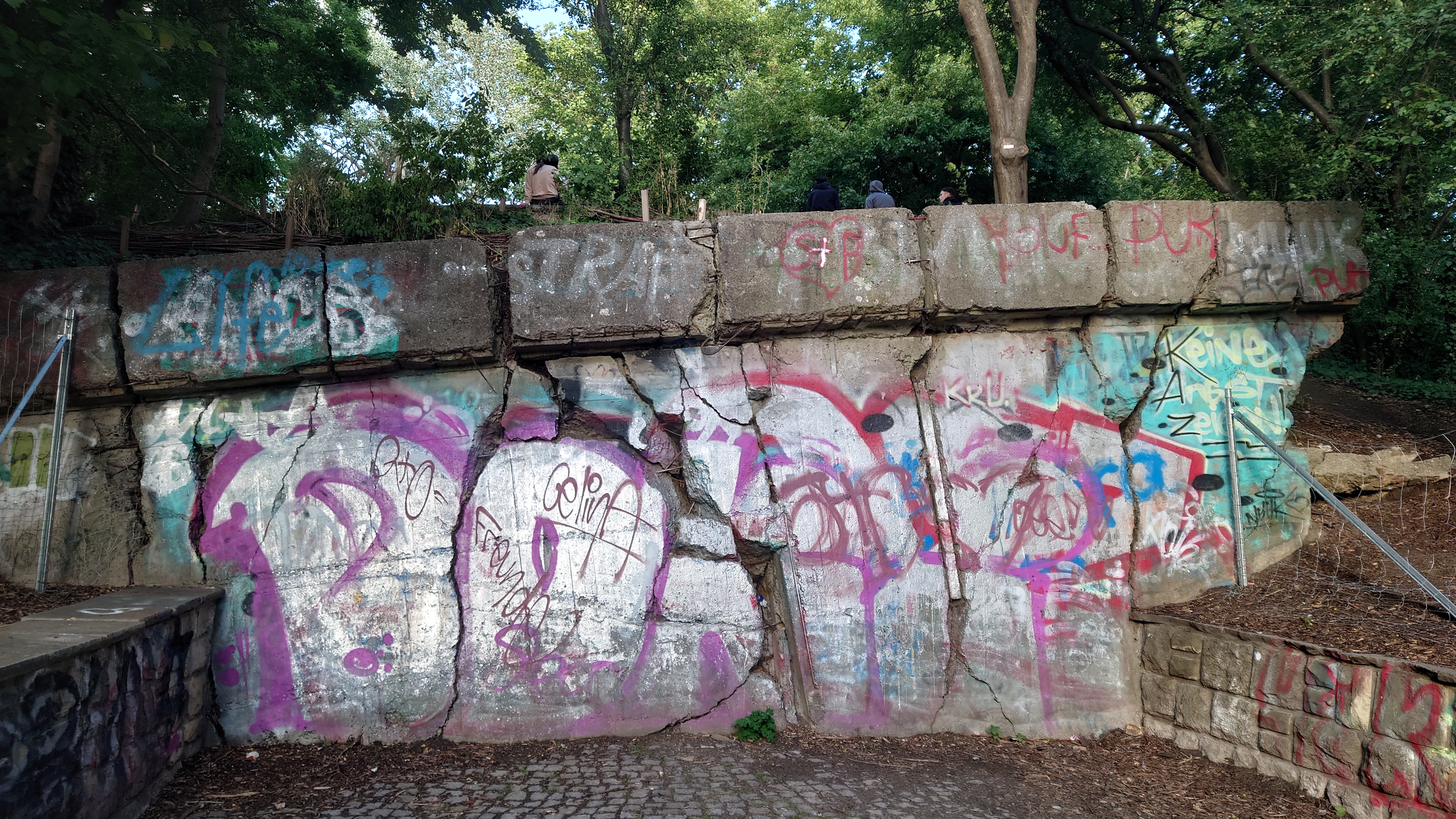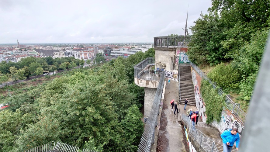 Ich wache auf und es schüttet aus Gießkannen. Der erste Regentag seit dieser Reise. Trotzdem merke ich, wie meine Stimmung instinktiv sinkt, wenn ich in meinen Möglichkeiten draußen eingeschränkt bin. Der Blick aufs Wetterradar zeigt, dass es nur dieser Tag sein wird. Trotzdem ist der Unterschied krass. Gestern 37 Grad, jetzt 13 und ich kann meinen Atem sehen. Mir soll das heute egal sein, ich verziehe mich zur historischen Erkundung Berlins unter die Oberfläche und beschließe die Flakturmführung der Berliner Unterwelten am Gesundbrunnen zu machen. Einmal mehr kommen meine „Tarnkappen“ für die Sandalen zum Einsatz. Man darf die Führung nur mit festem Schuhwerk durchführen, schließlich befinde ich mich in einem dreifach gesprengten Gebäuderest, dessen vierte Etage zu einem kleinen Teil begehbar geblieben ist. Ein gruseliges, totes Stahbetongerippe, das von außen kaum mehr als eine Aussichtsplattform in einem Park mit Schuttberg ist, auf dem mittlerweile Bäume thronen, die zum überwiegenden Teil 75 Jahre alt sind und damit verschleiern, was das Gebäude einst für eine Funktion hatte. Aber auch die nachträgliche Funktion eines Aussichtsturms, zu dem die Ruine Ende der 80er Jahre ausgebaut wurde, ist durch die Subkulturen aktueller Zeiten kräftig übersprüht oder überklebt worden. So werden auf einen Schlag vier oder fünf Kulturüberwucherungen sichtbar. Krieg, Erholung, Erinnerung, Okkupation.