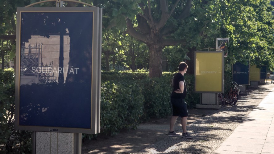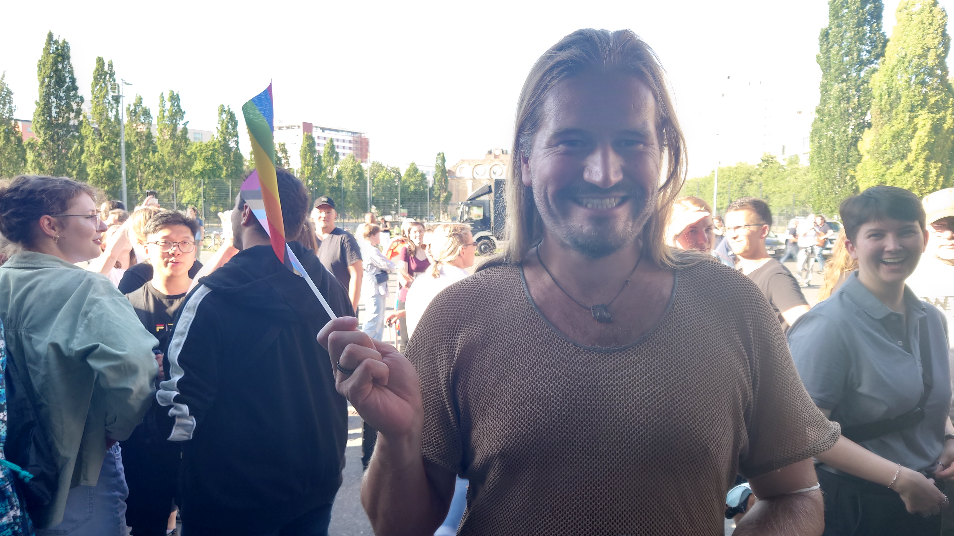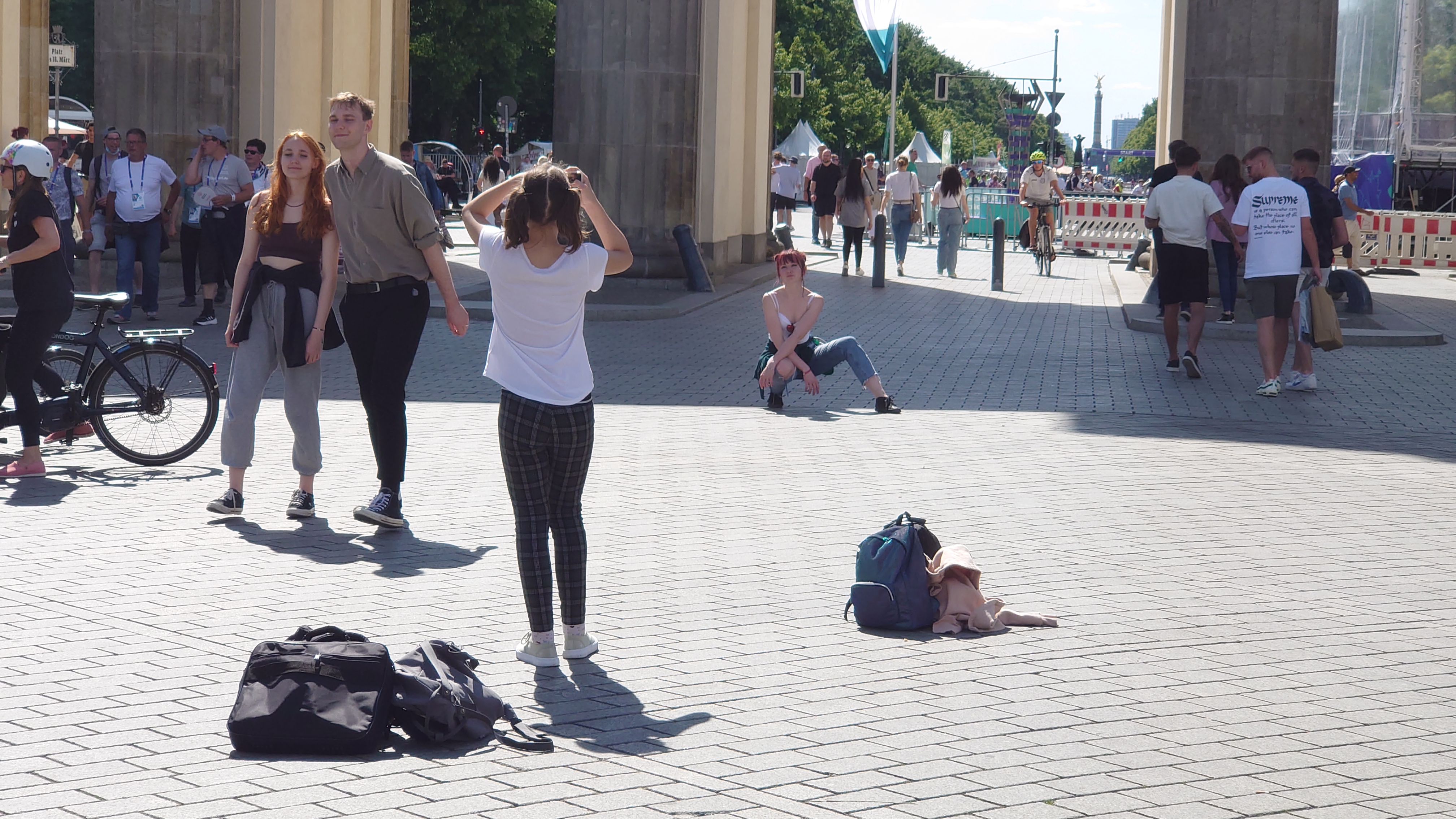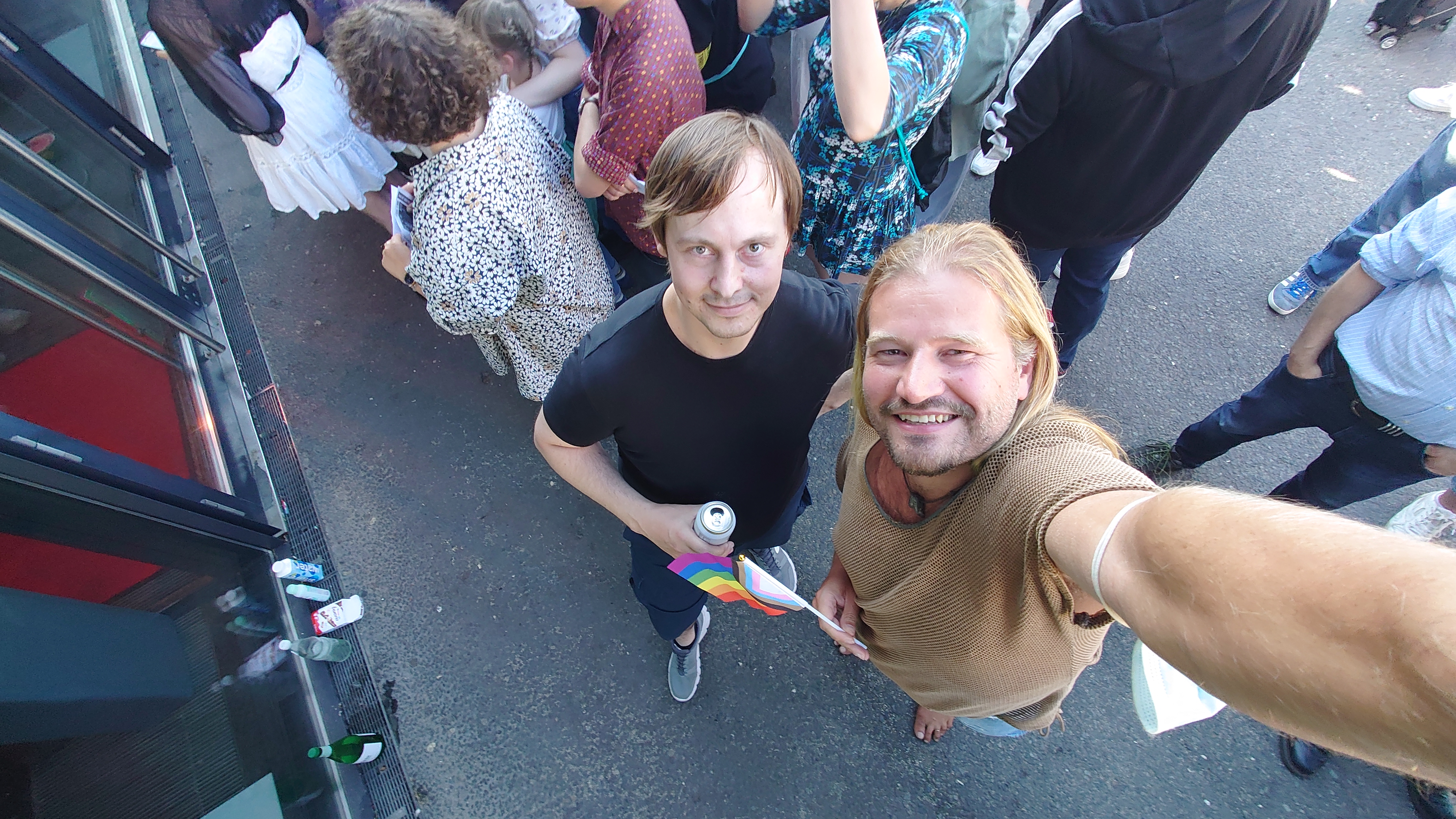 Das ist auf Dauer schon berauschend. Kultur ballt sich in dieser Stadt zu einem unübersichtlichen Klumpen, wenn man nicht aufpasst. Überall stolpert man darüber und es lohnt sich genauer hinzusehen. Ich selbst kann in der Zeit hier nur Funken wahrnehmen, aber die dafür umso intensiver, bis ich schließlich Sebastian abhole. Auch er ist nicht häufig in der Hauptstadt. Nun sind wir beide hier aus gutem Grund. Also lass uns vor wichtigen Gebäuden unserer Demokratie ein paar Selfies machen. Nicht nur wir tun das. Alle tun das, manche sehr exzessiv, viele Mädchen inszenieren sich routiniert als Social Media Produkt. Überall fliegen Regenbögenflaggen im Wind. An der Amerikanischen Botschaft hat sich die Flagge sogar erweitert um ein pastellfarbenes Dreick. Der Bahnhof, Kirchen, Museen, Häuserfassaden. Alle stellen Regenmogenflaggen und vor allem Ukraineflaggen zur Schau. Ich hoffe, dass die Bewegungen hinter den ganzen neuen, omnipräsenten Flaggen überall im Land wirklich verstanden werden. Ich habe das Gefühl, alle werden gerade Pride-Fans und Ukraine-Fans und holen sich passend zu ihrer neuen Geschmacksrichtung die passenden Flaggen, um sie sich ins Fenster zu hängen und sich zu bekennen. "Ich bin einer von den Guten. Ich habe mein Werk getan, um mich vor der dunklen Seite der Macht zu distanzieren." Das hier ist aber kein Popkonzert. Ich bin nicht schwul, ich bin kein Ukrainer, so wie ich auch kein Syrer, Äthiopier oder Afghane bin. Ich male mir keinen blaugeben Wachsmalerstreifen auf die Backe wie bei der Fußball-WM. Ich müsste mich für viele Flaggenfarben Kriegsgeflüchteter bekennen. Die Pride Progress Flagge bündelt sie nahezu alle. Berlin ist nicht Ukraine. Berlin ist die Hauptstadt von Deutschland mit all seinen Farcetten, seiner hoffentlich nicht nur zur Schau gestellten Offenheit für Unterschiede und mit einer funktonierenden Asylpolitik für Flüchtlinge. Ein Bekenntnis zu Pride oder der Ukraine ist nicht das Selbe wie ein Bekenntnis zu Aurora.
