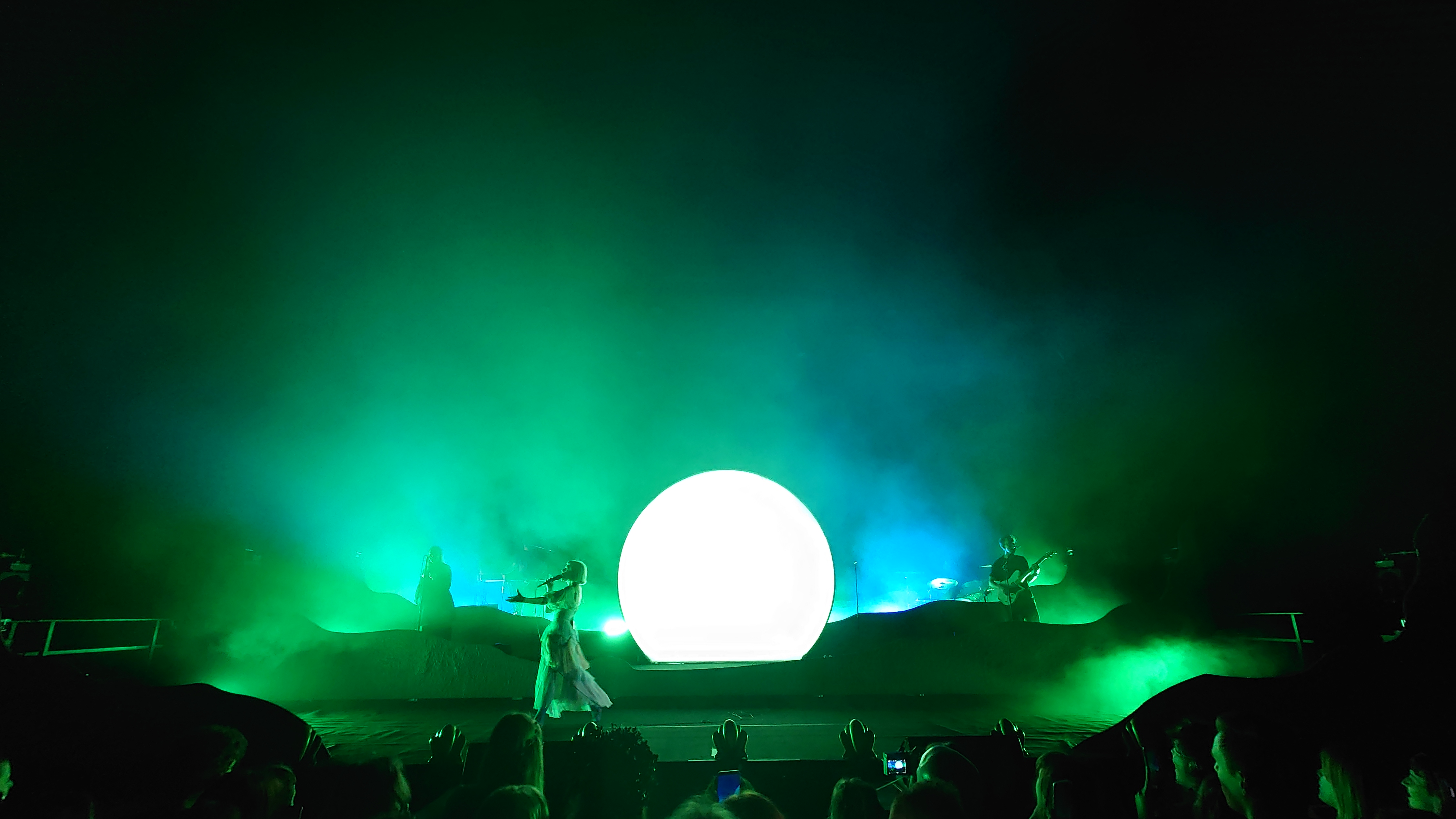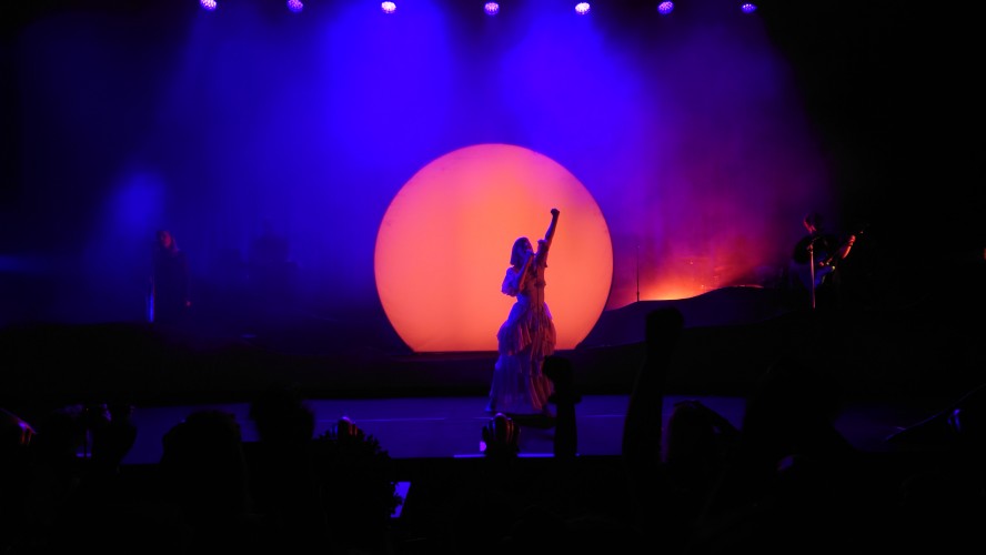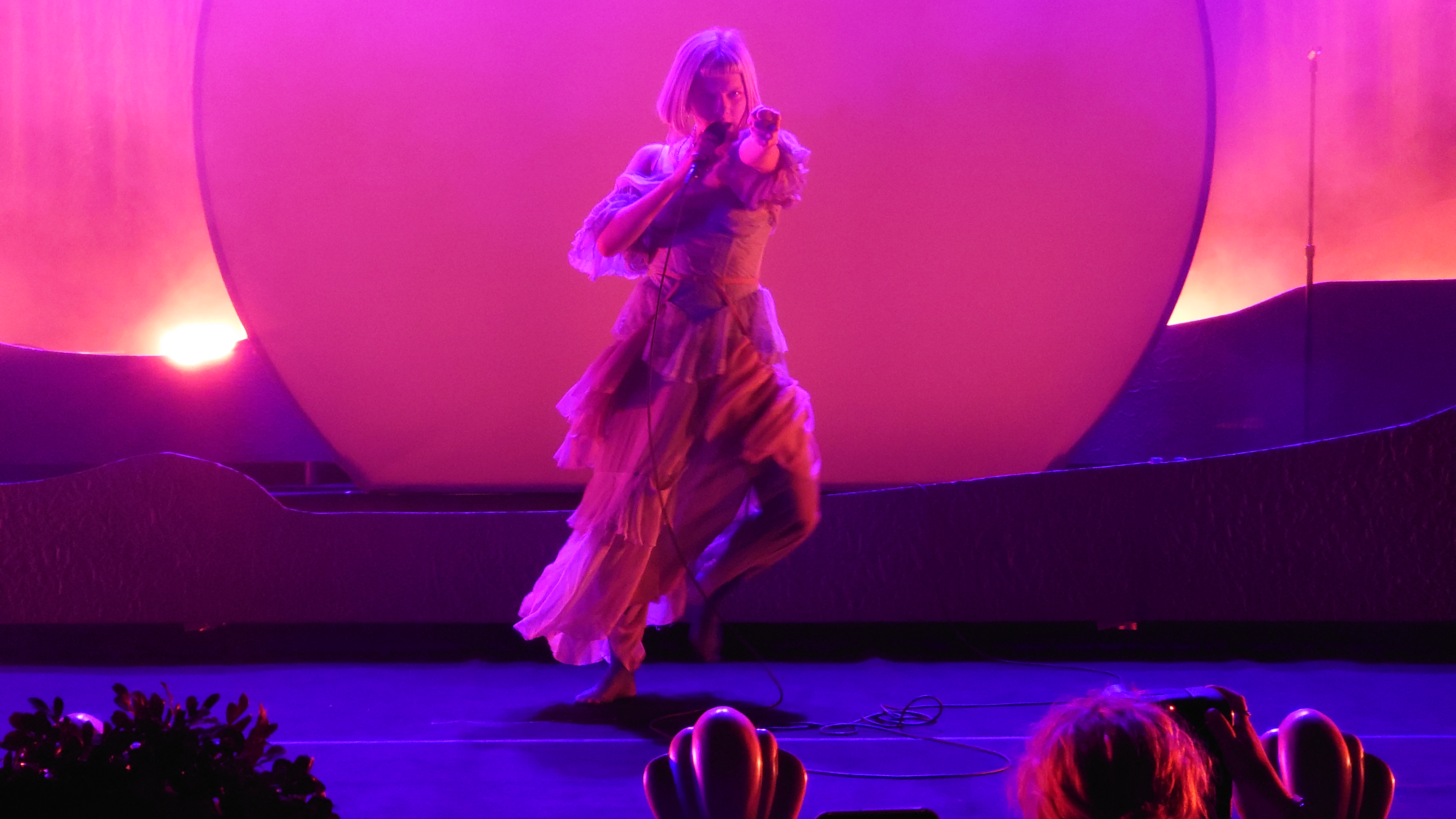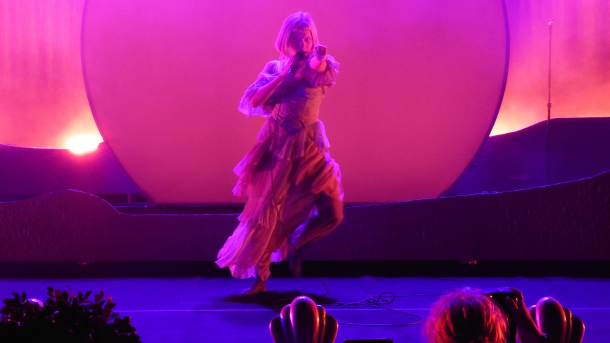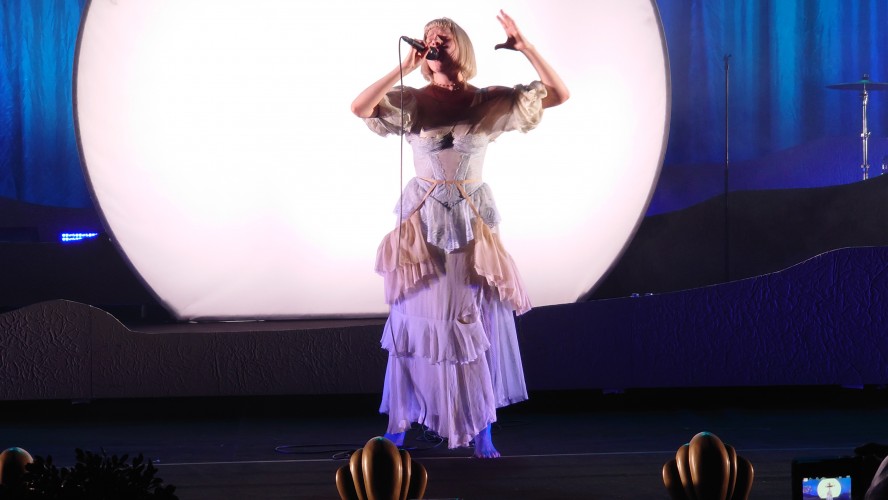 Das Konzert beginnt mit zwei Vorbands, dann ist sie da, es wird laut und ab dem ersten Lied begreife ich die Anziehungskraft dieser 26jährigen Norwegerin, die mit ihrer Bühnenpräsenz die Halle so in Bewegung bringt, dass es keine optischen Aufwertungseffekte braucht, außer eine weiße runde Leinwand und ein wenig Farbe darauf. Über die Bühne schwebt, fliegt und stampft eine kleine, zierliche Frau mit großen Gesten und klaren Botschaften für eine Friedensrevolution und umschließt sie mit ihrer einfühlsamen Musik so intim und berührend, dass selbst Männer um mich herum in Tränen ausbrechen. Geschenke fliegen auf die Bühne. Aurora bedankt sich mit zirpender Stimme, die so gar nicht zum Selbstbewusstsein der musikalischen Darbietungen passen will. Ihre Musik offenbart sich eben auch als inszeniertes Produkt, während Aurora in ihrer Muschelschale sitzt, unsere Gefühle besingt und das Private schützt und ummantelt wie eine Perle. Das ist legitim. Sebastian feiert, ich feiere und wir freuen uns, dass das geklappt hat mit unserer gemeinsam verordneten Kinderauszeit.