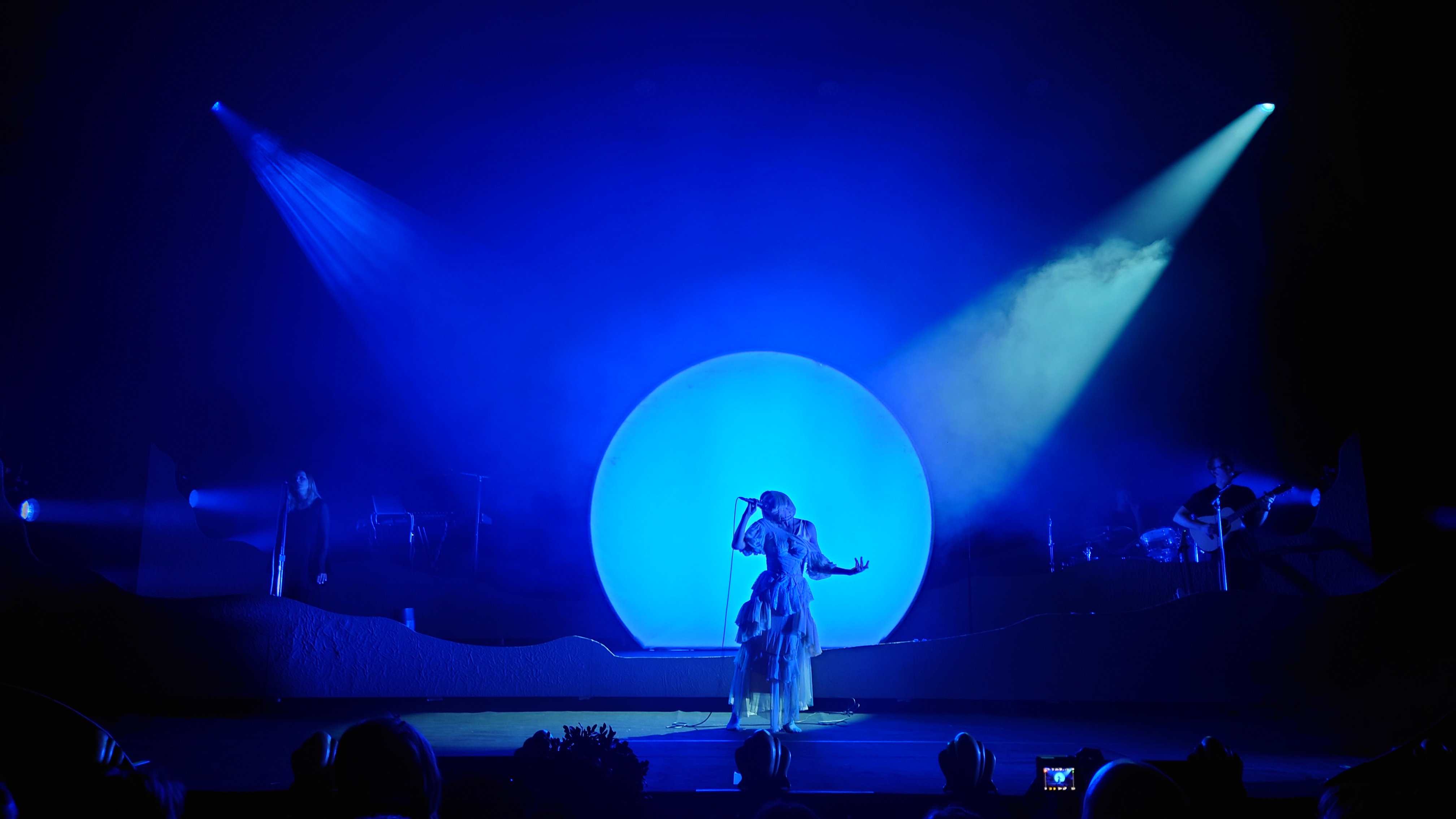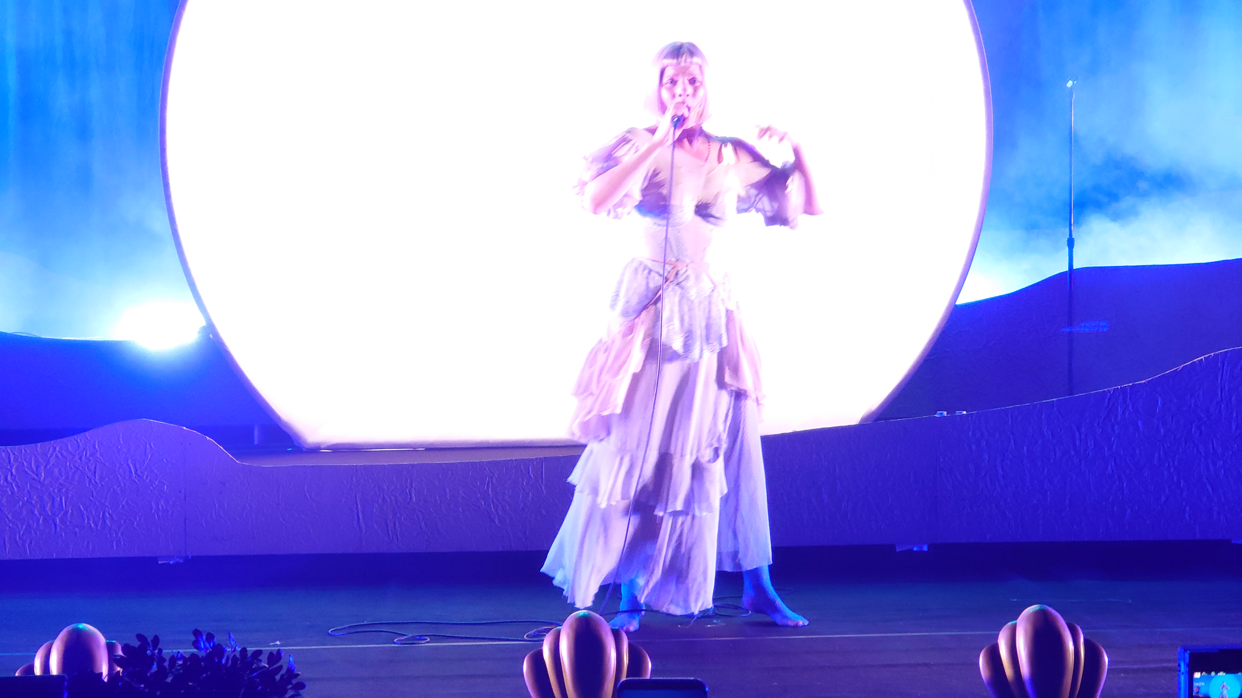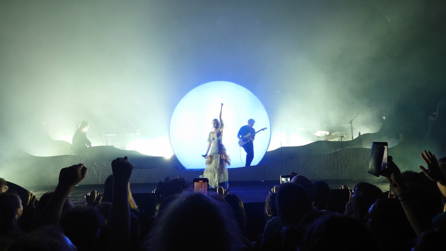 Das Konzert beginnt mit zwei Vorbands, dann ist sie da, es wird laut und ab dem ersten Lied begreife ich die Anziehungskraft dieser 26jährigen Norwegerin, die mit ihrer Bühnenpräsenz die Halle so in Bewegung bringt, dass es keine optischen Aufwertungseffekte braucht, außer eine weiße runde Leinwand und ein wenig Farbe darauf. Über die Bühne schwebt, fliegt und stampft eine kleine, zierliche Frau mit großen Gesten und klaren Botschaften für eine Friedensrevolution und umschließt sie mit ihrer einfühlsamen Musik so intim und berührend, dass selbst Männer um mich herum in Tränen ausbrechen. Geschenke fliegen auf die Bühne. Aurora bedankt sich mit zirpender Stimme, die so gar nicht zum Selbstbewusstsein der musikalischen Darbietungen passen will. Ihre Musik offenbart sich eben auch als inszeniertes Produkt, während Aurora in ihrer Muschelschale sitzt, unsere Gefühle besingt und das Private schützt und ummantelt wie eine Perle. Das ist legitim. Sebastian feiert, ich feiere und wir freuen uns, dass das geklappt hat mit unserer gemeinsam verordneten Kinderauszeit.