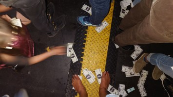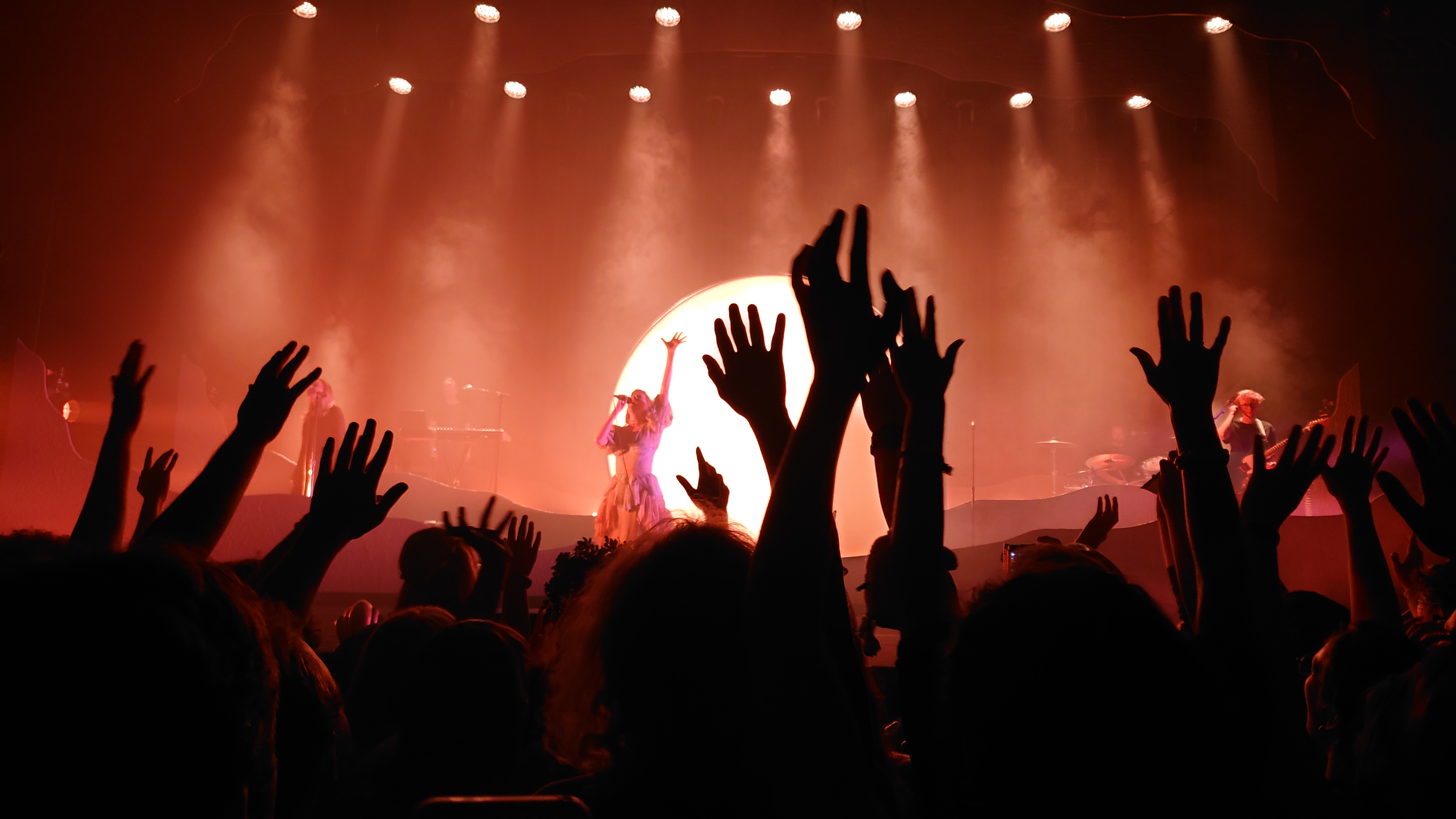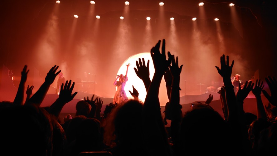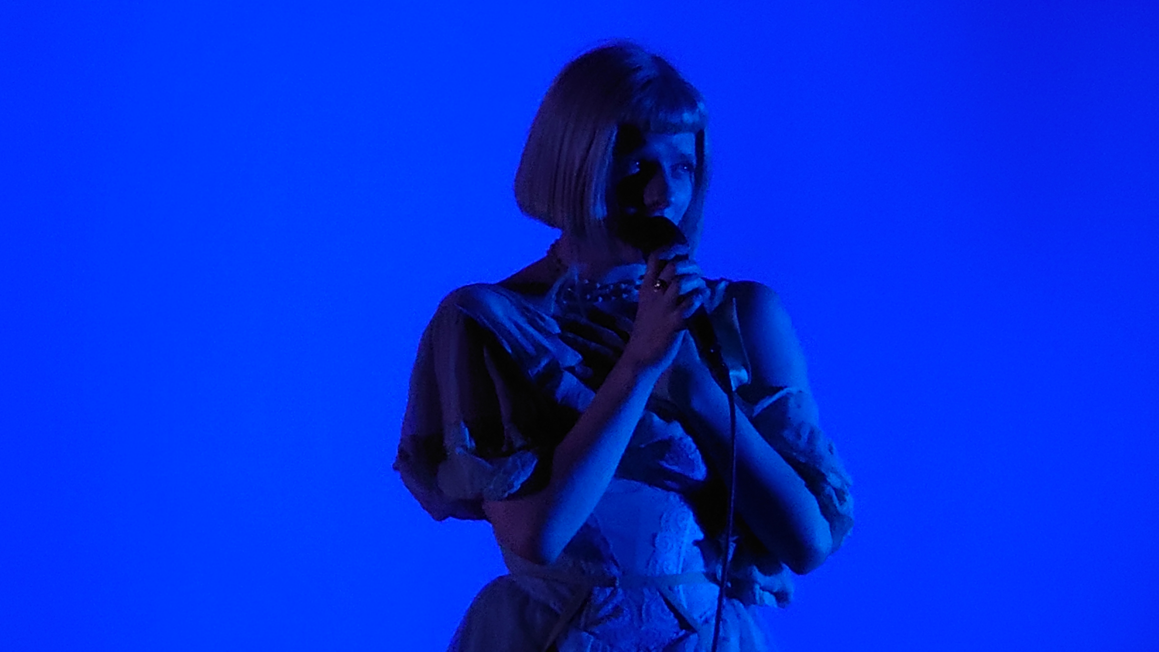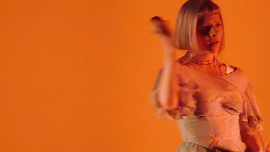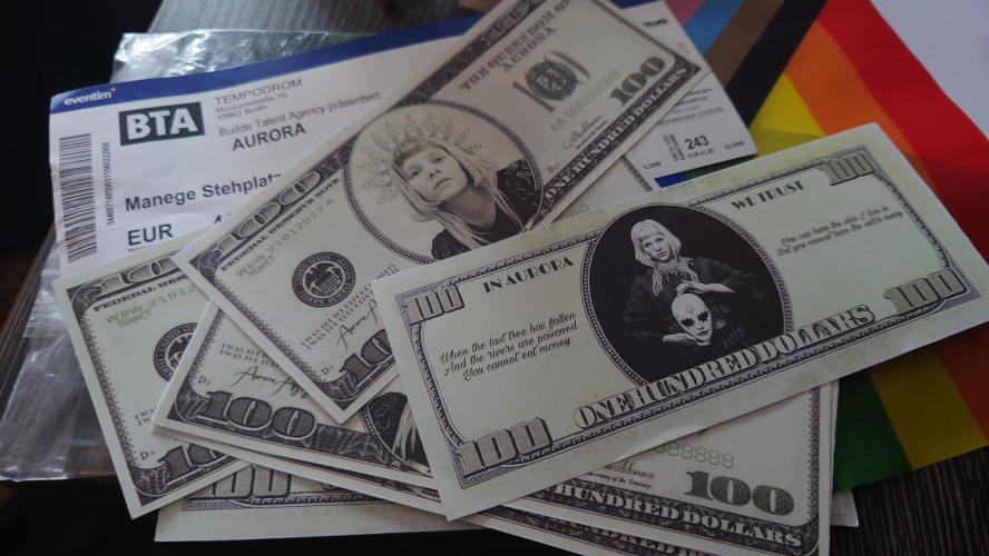 Die Türen gehen auf. Sebastian und ich Rasen in die Halle, wir wollen vorne stehen. Um uns herum versammeln sich viele junge entspannte Gestalten und einige Herren an die 60. Ich frage einen von ihnen, warum gerade Aurora. Ich finde das beachtlich, weil sie doch eigentlich gar nicht die Zielgruppe sind. Denkste. Mein Frontnachbar ist jetzt zum 15. Mal in einem ihrer Konzerte, zweie auch schon in Norwegen, fünf in London. Ein Groupie über 50, ich fasse es nicht. Es wird einen Flashmob geben, verrät er mir, und drückt mir 100 Dollar Noten mit dem Konterfei von Aurora in die Hand. Ich würde das schon mitbekommen und soll die Scheine dann in die Luft werfen.