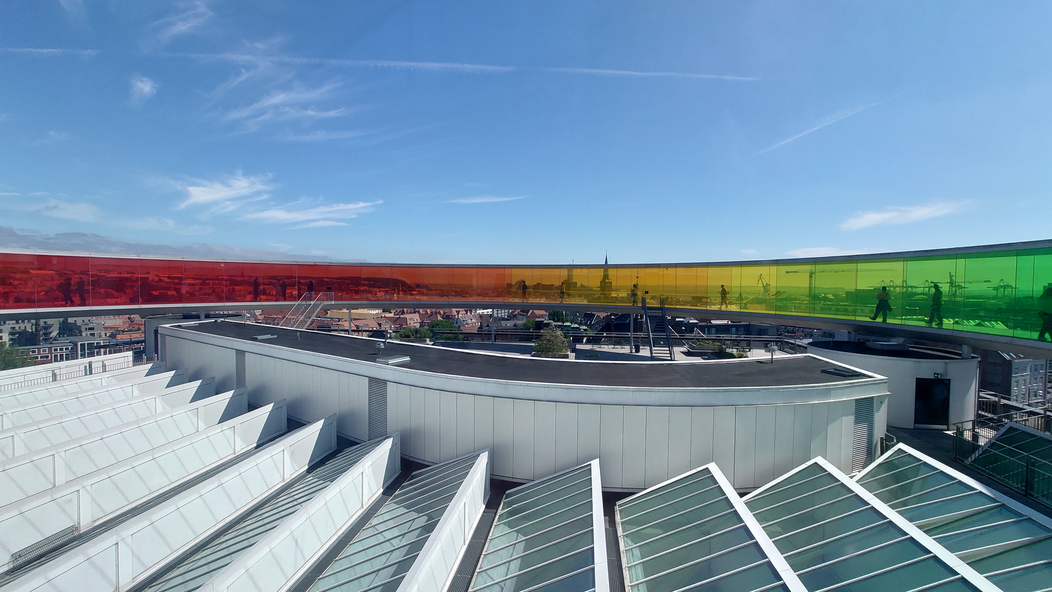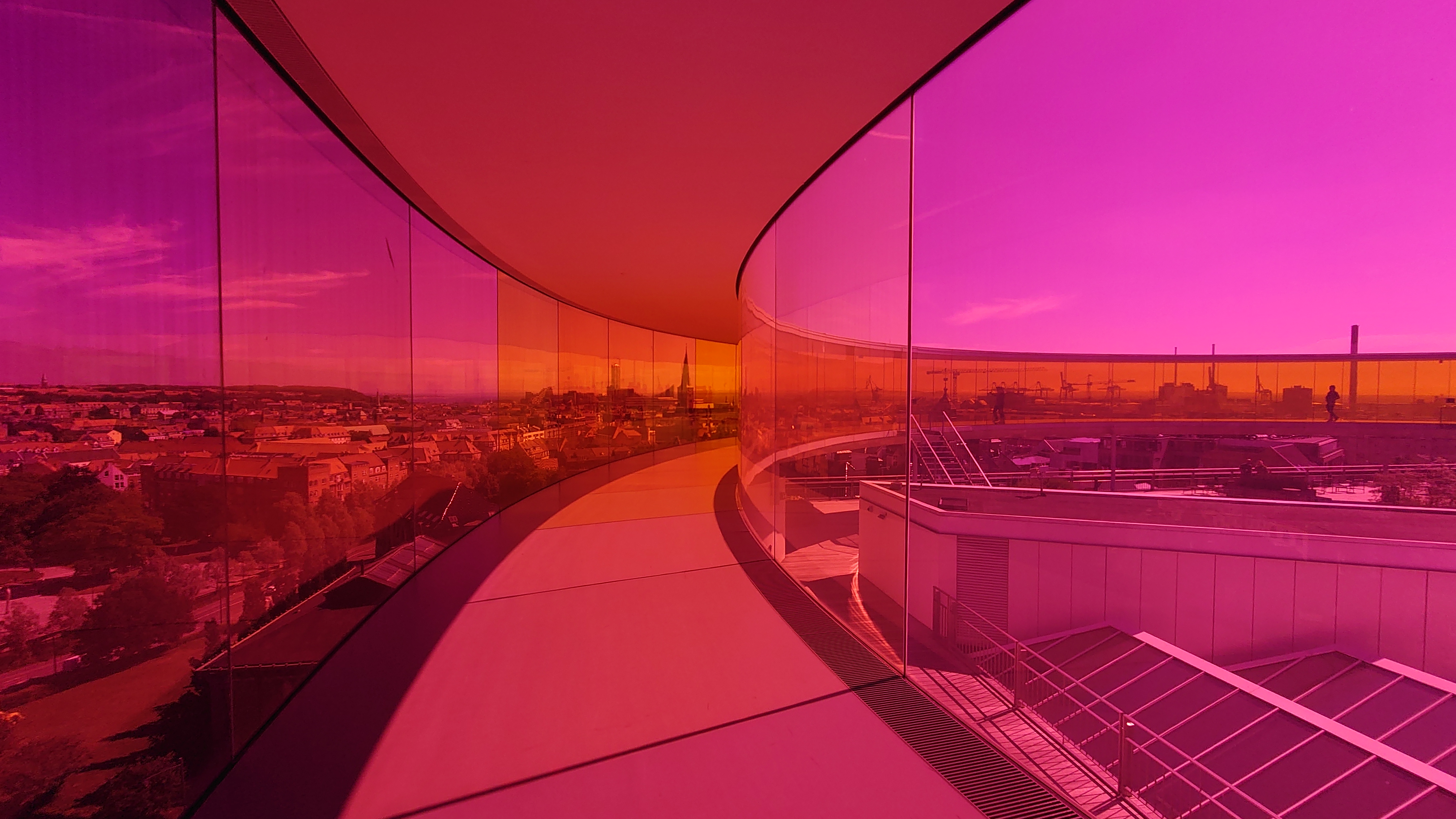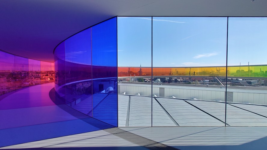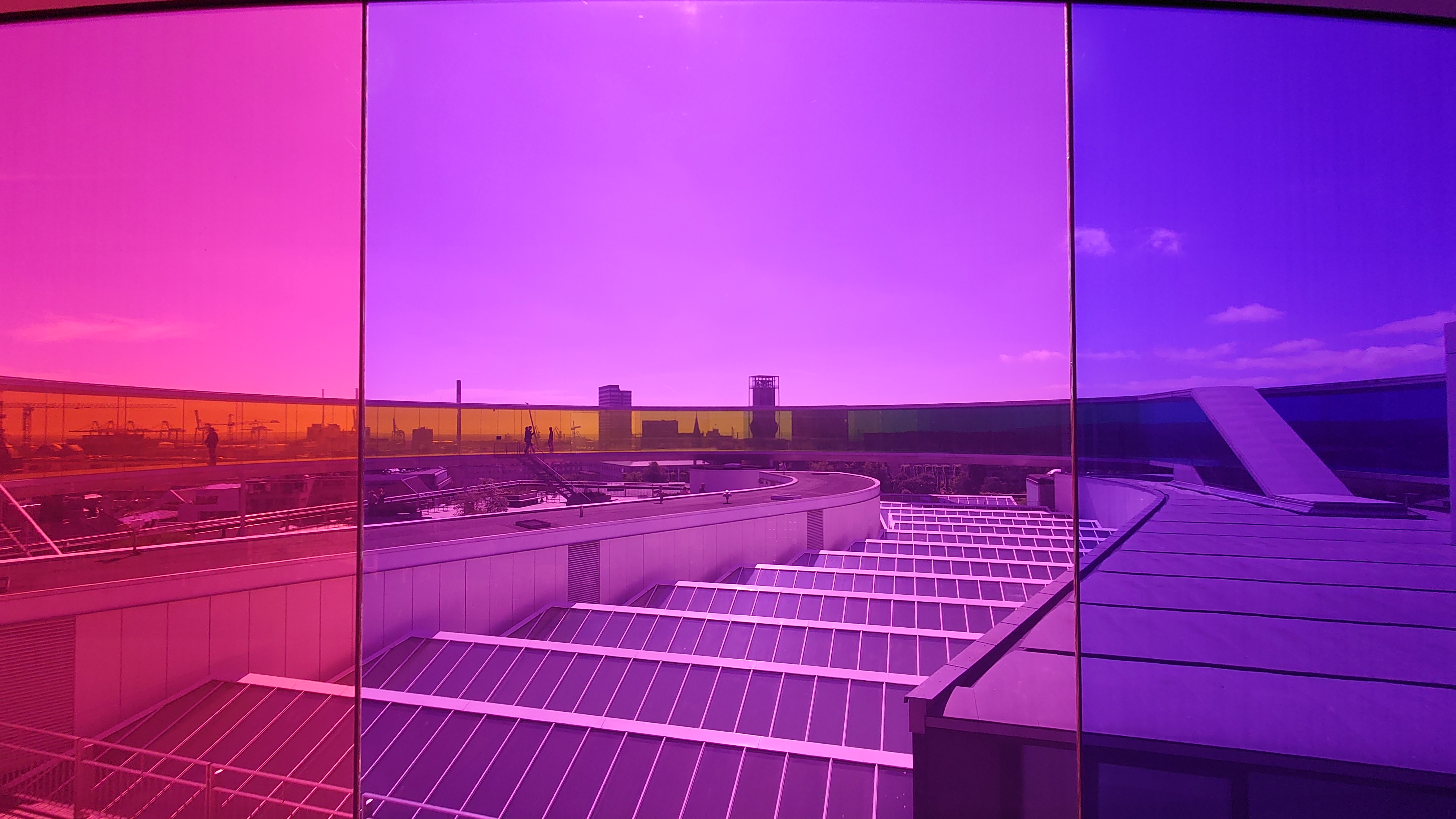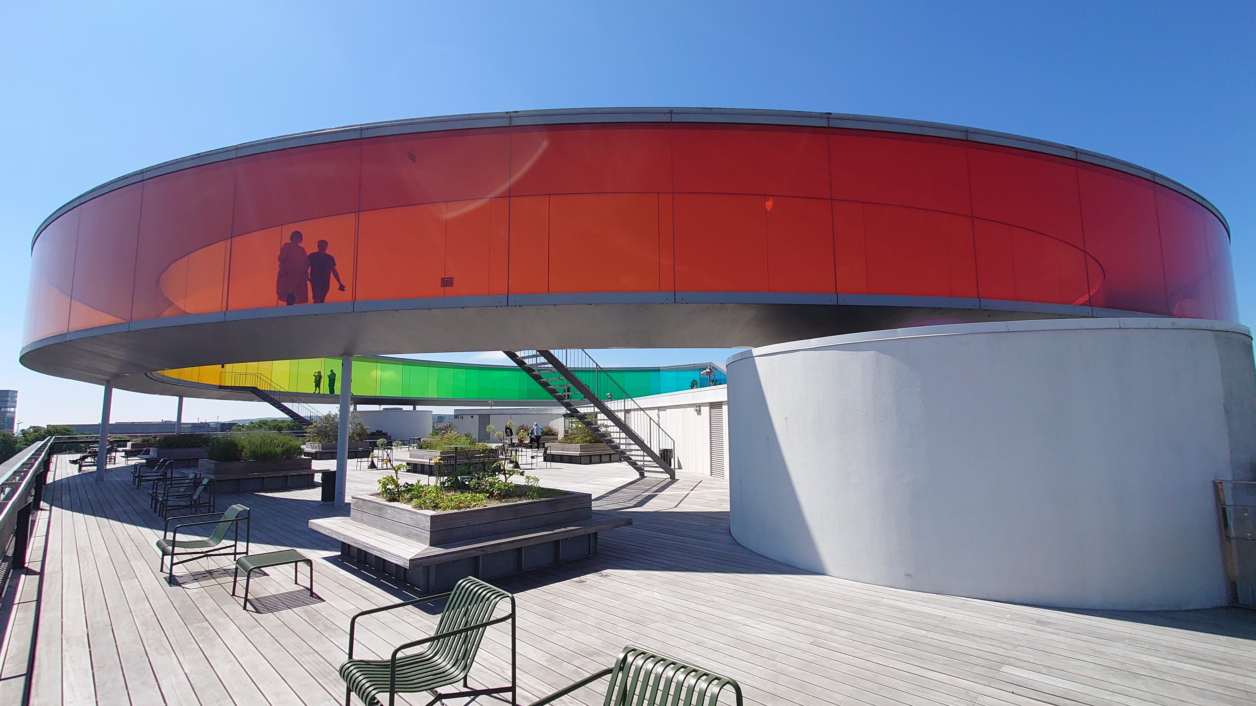 Ich bin gerade in Århus, rufe ich mir noch einmal ins Bewusstsein. Ich möchte einen leisen Abspann haben heute. Ich beschließe die Heimfahrt noch etwas hinauszuzögern und das ARoS Kunstmuseum zu besuchen, auf dessen Dach im zehnten Stock ein gewaltiger, reiseendwürdiger Regenbogen-Wandelgang ruht und einen Rundumblick über die zweitgrößte Stadt Dänemarks liefert. Darunter ist auch eine Kunstausstellung dänischer Künstler von gestern und heute. Ich gebe zu, deswegen bin ich überhaupt nicht hier, aber die Vielfalt und die Darbietung beeindruckt mich dennoch sehr. Viele Schulklassen sind heute hier. Es geht auf die Ferien zu. Draußen fahren häufig hupende Lastwagen am Museum vorbei, gefüllt mit 16-jährigen Schulabsolventen, die ebenfalls ihren Terminus feiern. Die großen Kinder werden in die Künste eingeführt. Sie sitzen im Kreis um eine Führerin, die sie intensiv in den Besinnungsprozess mit einbezieht. Die kleinen Kinder sind wie ich… sie wollen in erster Linie den Regenbogenglaskreis und Farbe erleben.