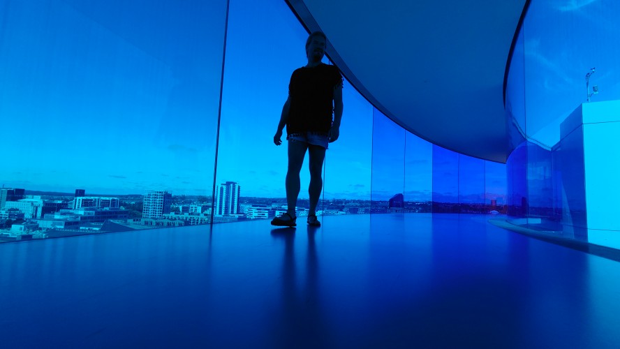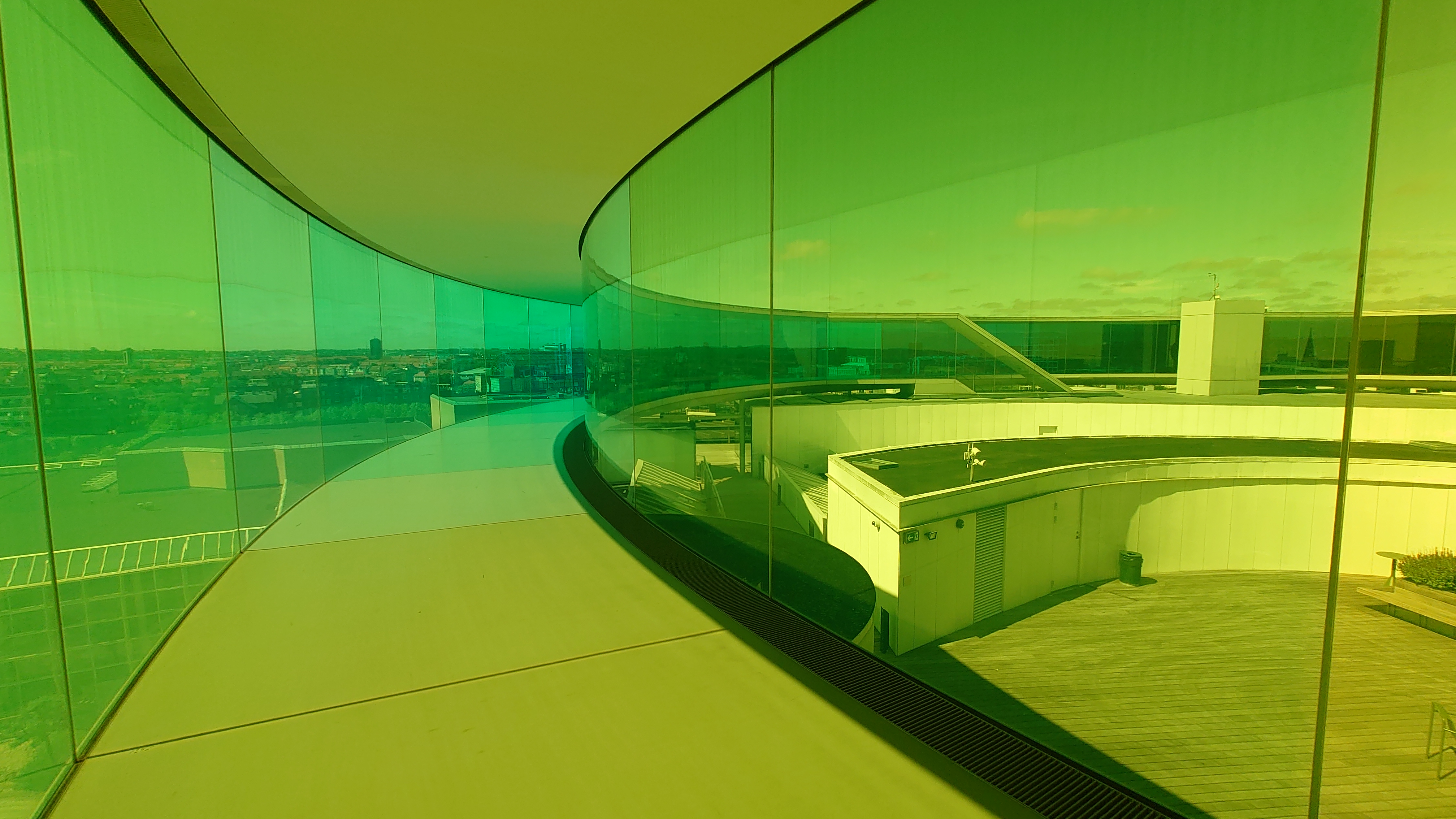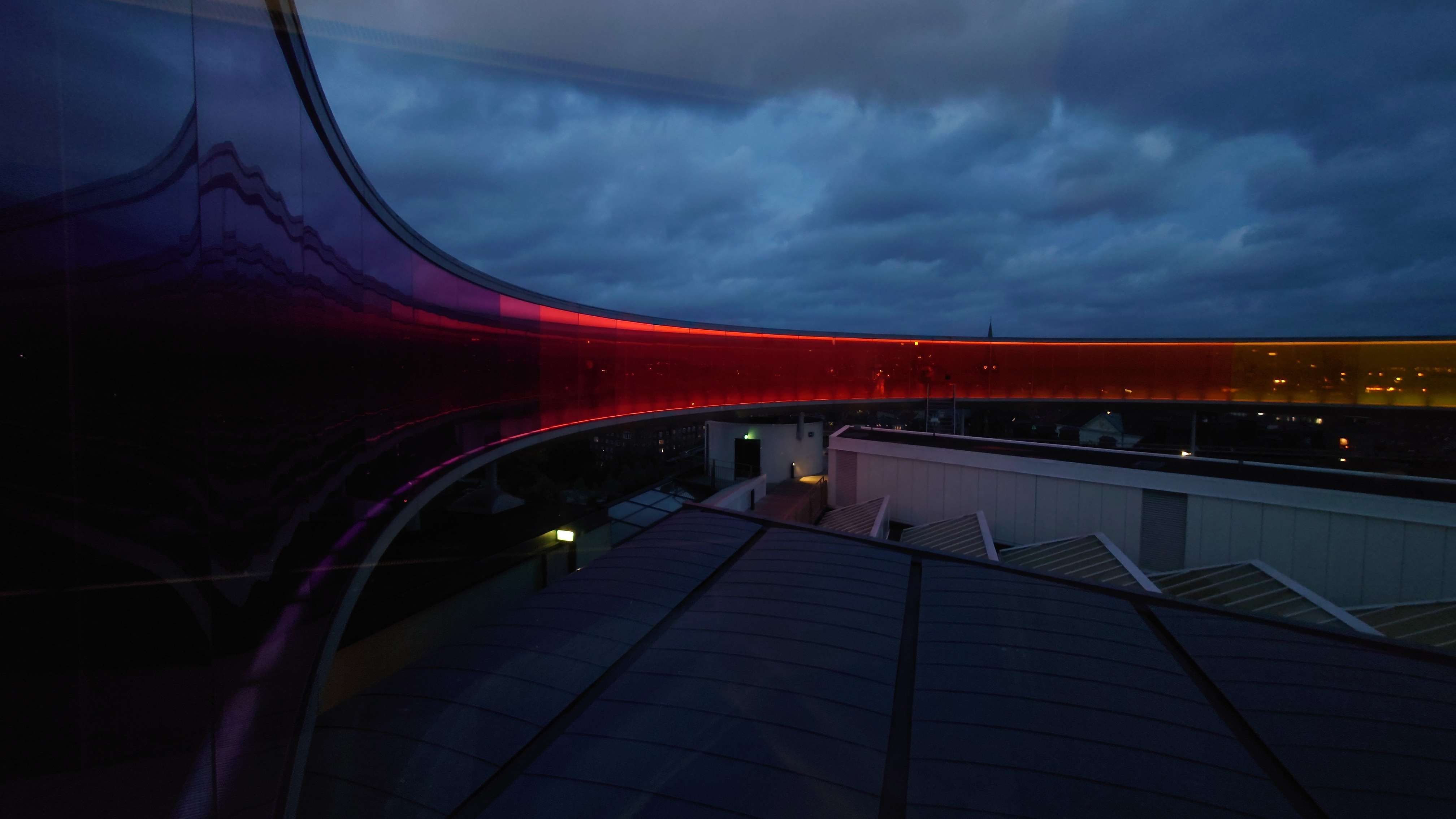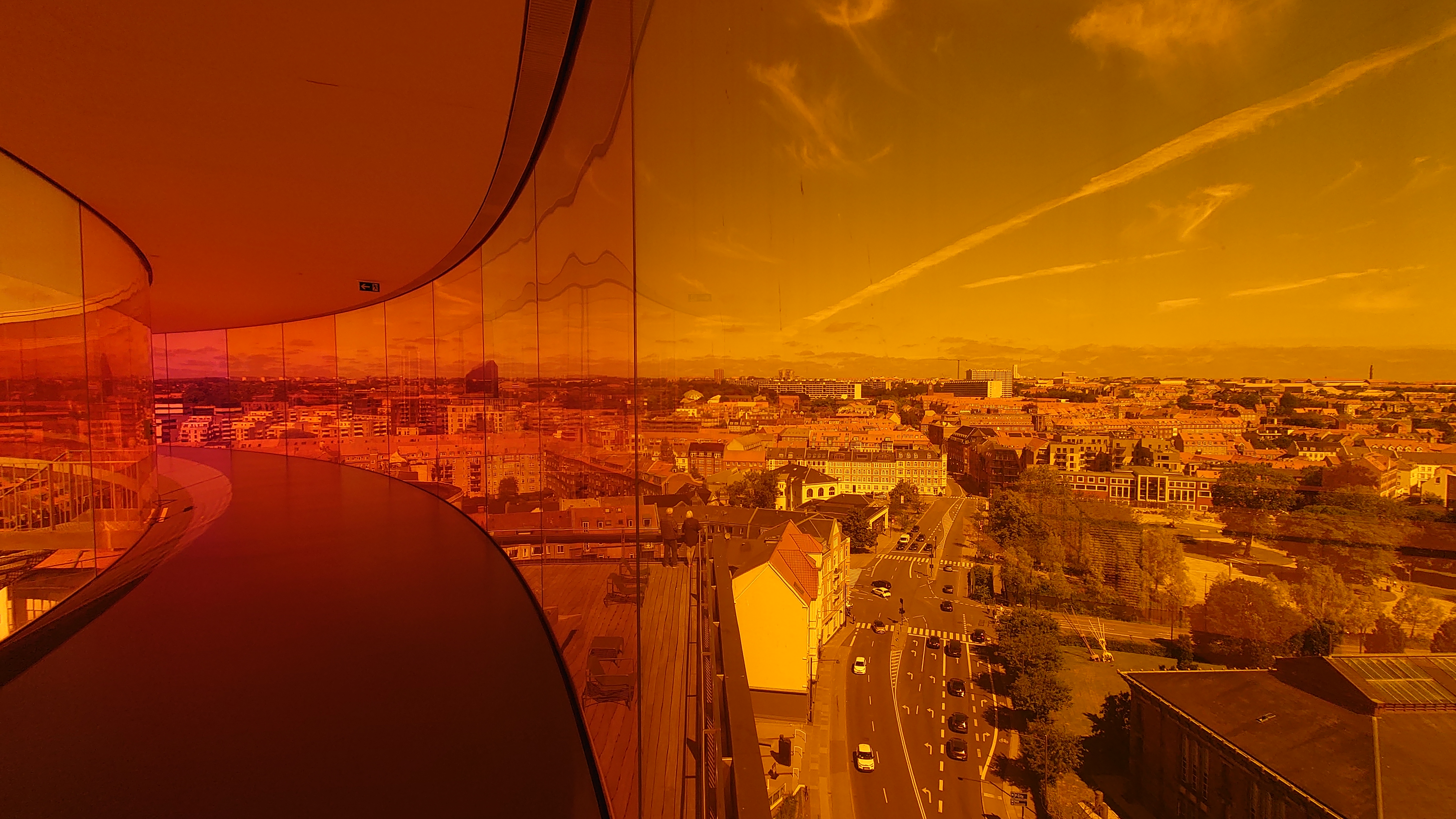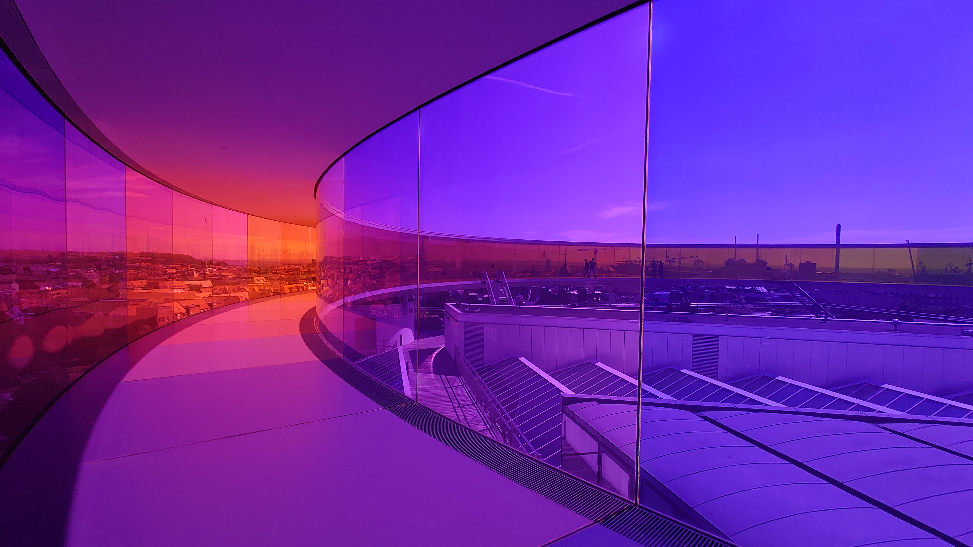 Ich bin gerade in Århus, rufe ich mir noch einmal ins Bewusstsein. Ich möchte einen leisen Abspann haben heute. Ich beschließe die Heimfahrt noch etwas hinauszuzögern und das ARoS Kunstmuseum zu besuchen, auf dessen Dach im zehnten Stock ein gewaltiger, reiseendwürdiger Regenbogen-Wandelgang ruht und einen Rundumblick über die zweitgrößte Stadt Dänemarks liefert. Darunter ist auch eine Kunstausstellung dänischer Künstler von gestern und heute. Ich gebe zu, deswegen bin ich überhaupt nicht hier, aber die Vielfalt und die Darbietung beeindruckt mich dennoch sehr. Viele Schulklassen sind heute hier. Es geht auf die Ferien zu. Draußen fahren häufig hupende Lastwagen am Museum vorbei, gefüllt mit 16-jährigen Schulabsolventen, die ebenfalls ihren Terminus feiern. Die großen Kinder werden in die Künste eingeführt. Sie sitzen im Kreis um eine Führerin, die sie intensiv in den Besinnungsprozess mit einbezieht. Die kleinen Kinder sind wie ich… sie wollen in erster Linie den Regenbogenglaskreis und Farbe erleben.
