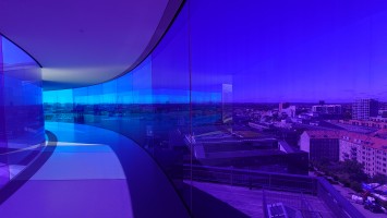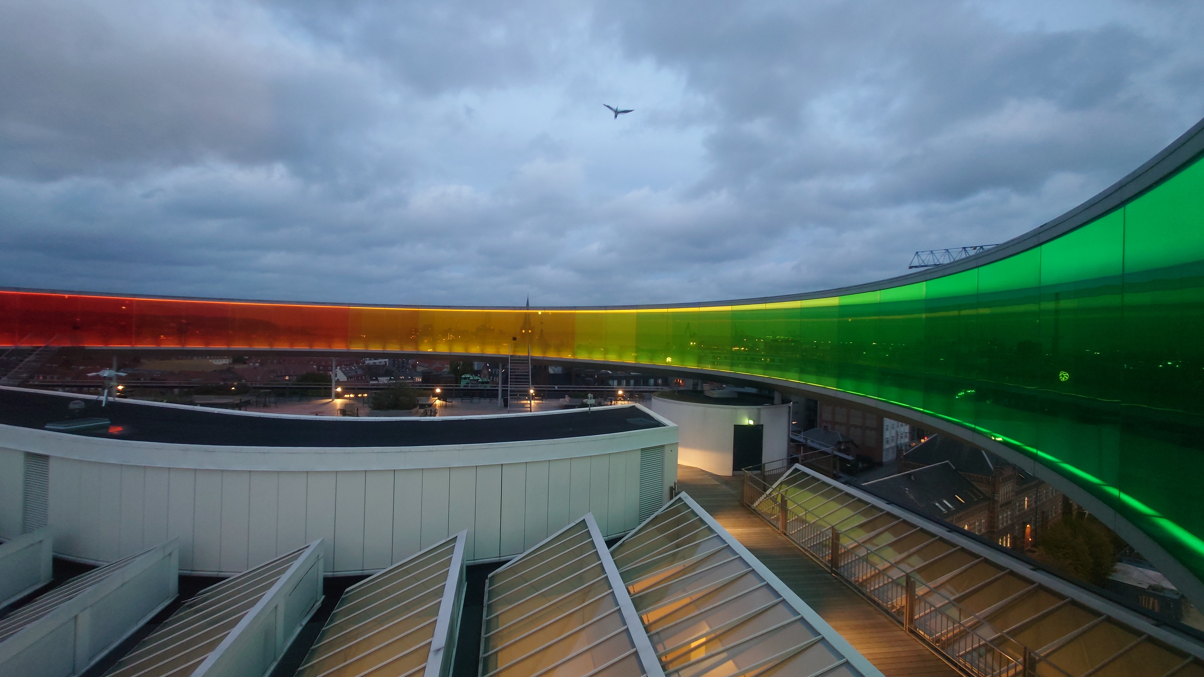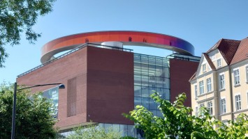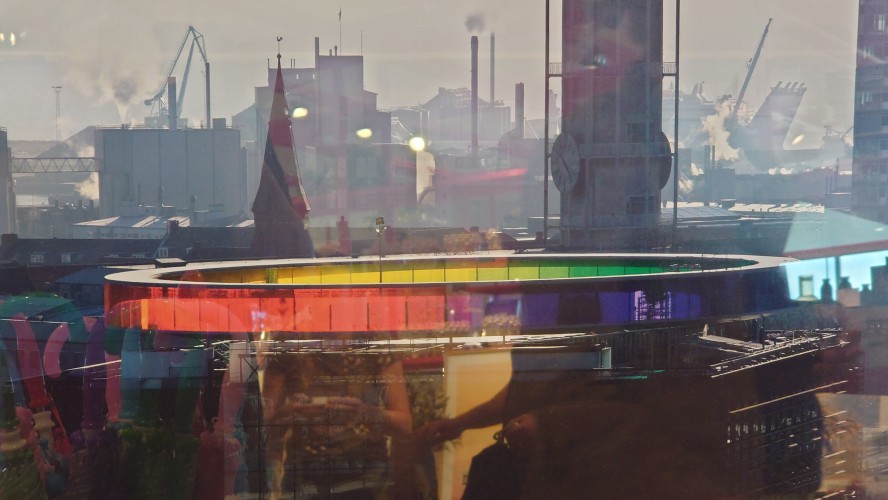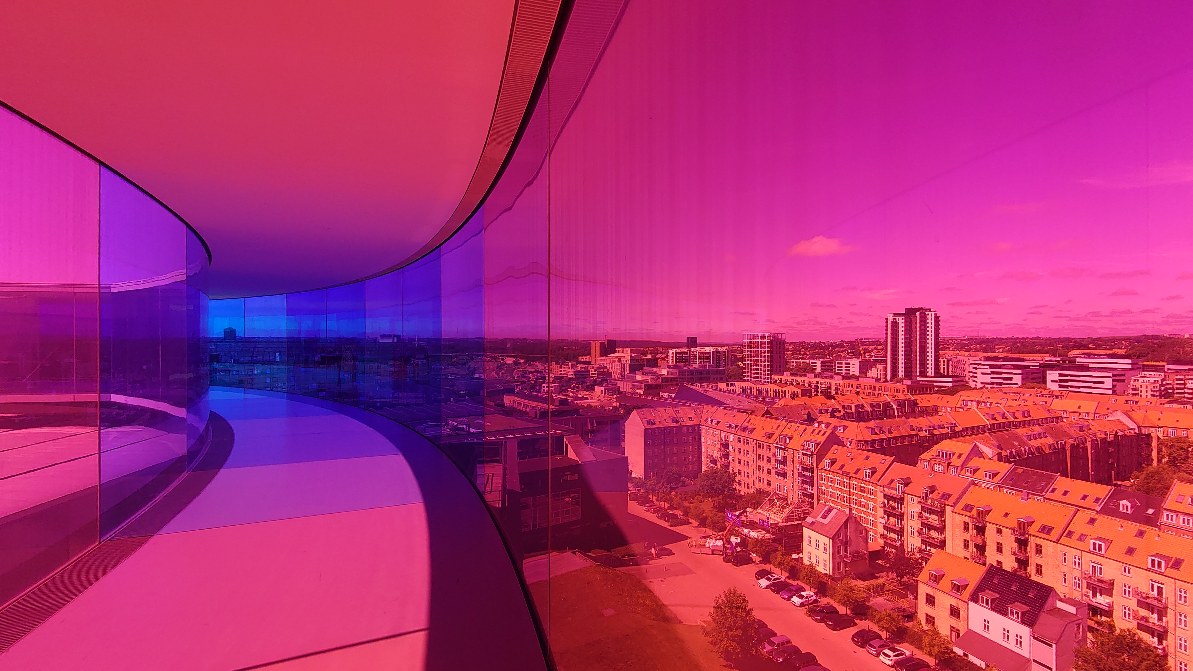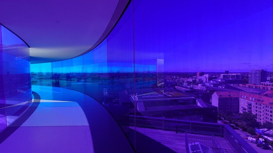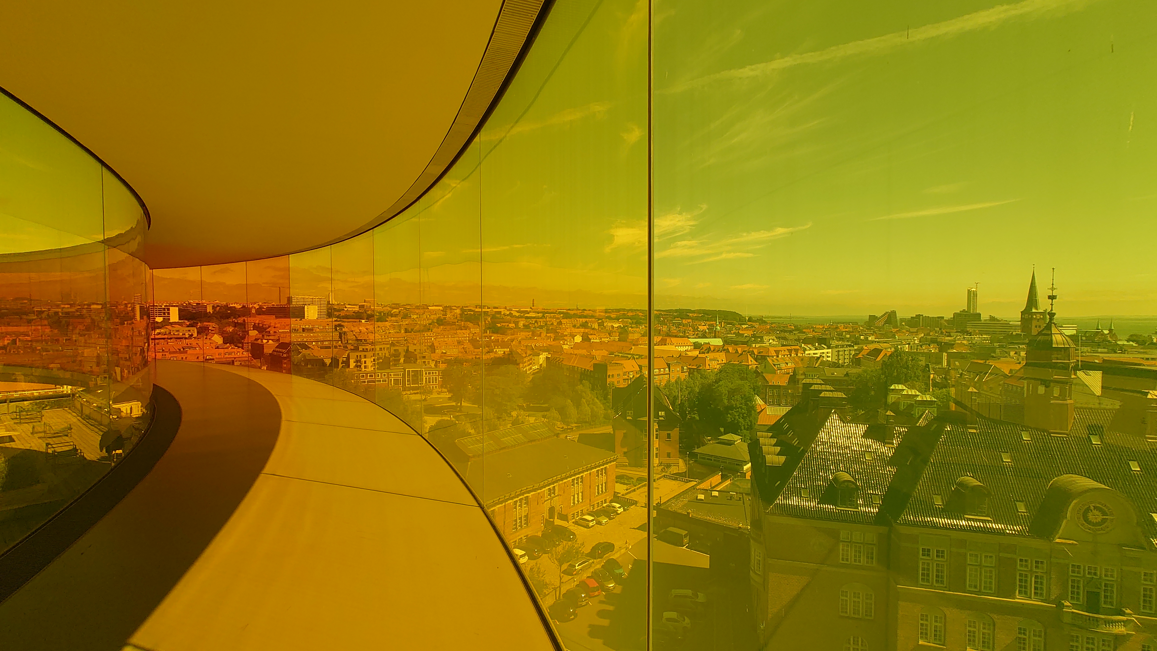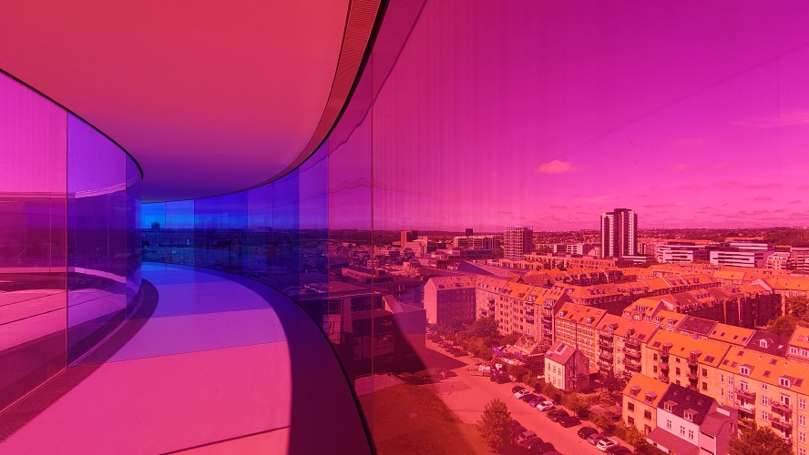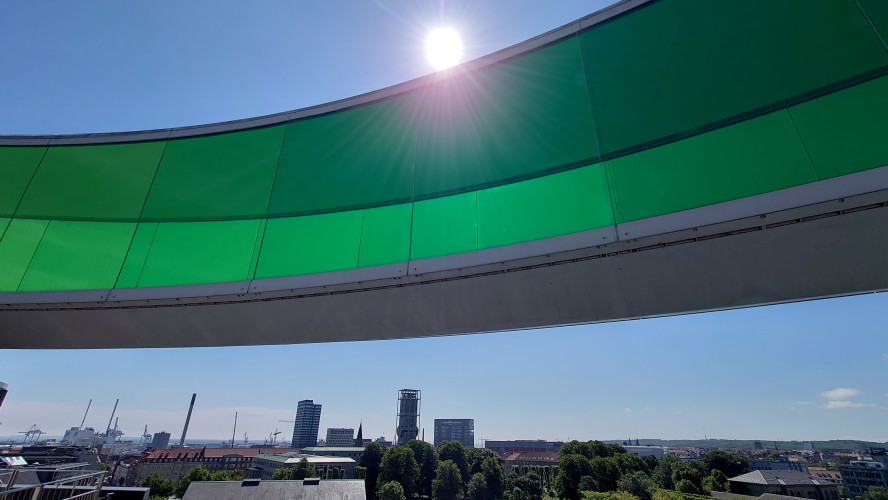 Ich bin gerade in Århus, rufe ich mir noch einmal ins Bewusstsein. Ich möchte einen leisen Abspann haben heute. Ich beschließe die Heimfahrt noch etwas hinauszuzögern und das ARoS Kunstmuseum zu besuchen, auf dessen Dach im zehnten Stock ein gewaltiger, reiseendwürdiger Regenbogen-Wandelgang ruht und einen Rundumblick über die zweitgrößte Stadt Dänemarks liefert. Darunter ist auch eine Kunstausstellung dänischer Künstler von gestern und heute. Ich gebe zu, deswegen bin ich überhaupt nicht hier, aber die Vielfalt und die Darbietung beeindruckt mich dennoch sehr. Viele Schulklassen sind heute hier. Es geht auf die Ferien zu. Draußen fahren häufig hupende Lastwagen am Museum vorbei, gefüllt mit 16-jährigen Schulabsolventen, die ebenfalls ihren Terminus feiern. Die großen Kinder werden in die Künste eingeführt. Sie sitzen im Kreis um eine Führerin, die sie intensiv in den Besinnungsprozess mit einbezieht. Die kleinen Kinder sind wie ich… sie wollen in erster Linie den Regenbogenglaskreis und Farbe erleben.