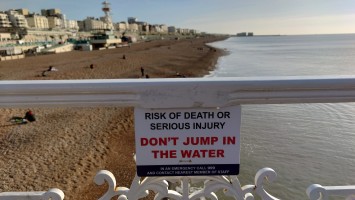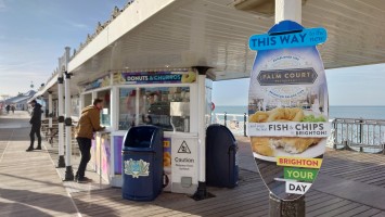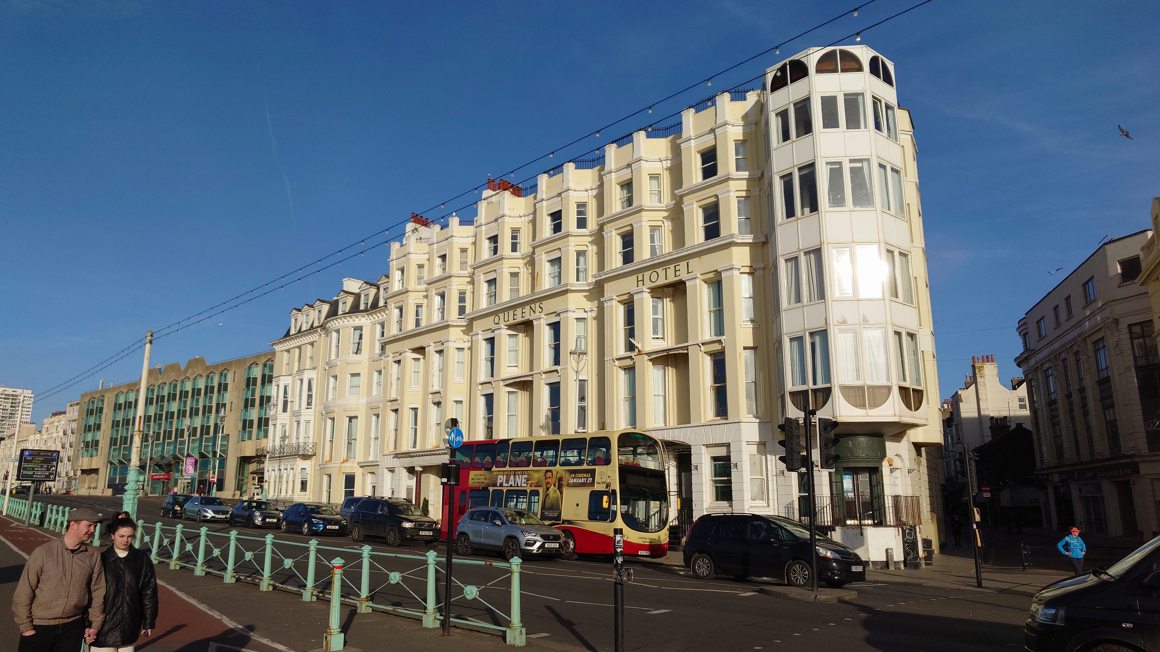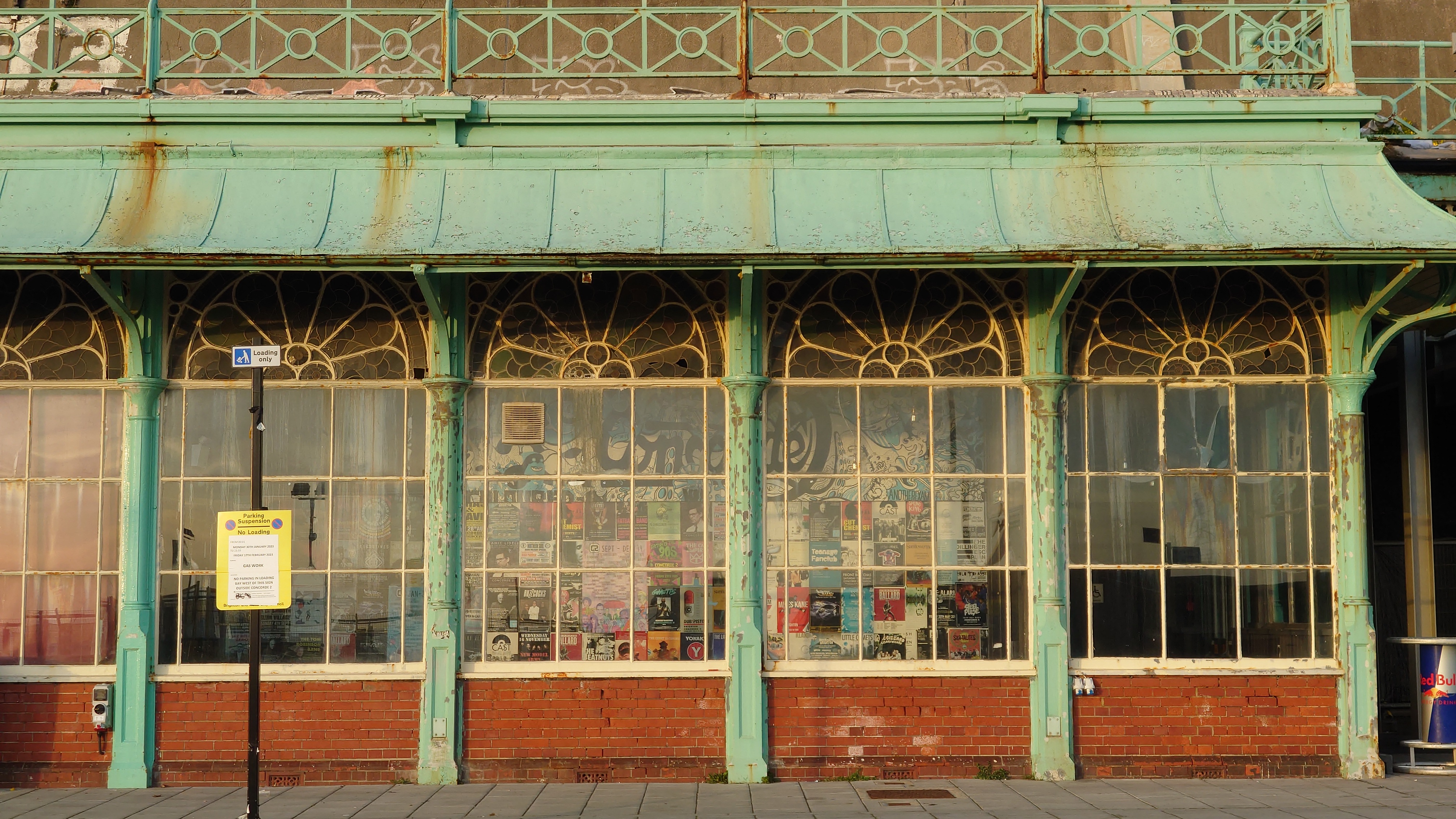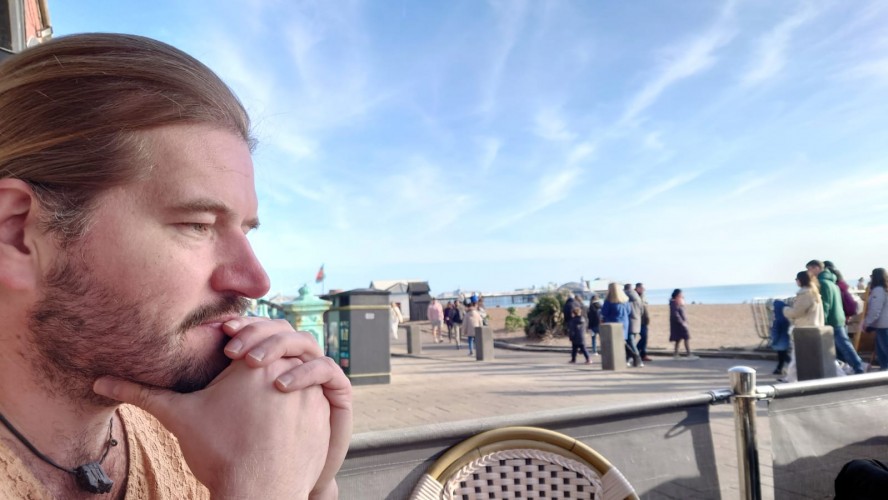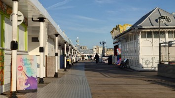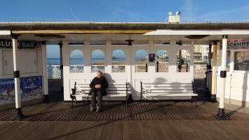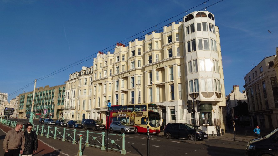 Drei Stunden später... ich sitze im National Express Bus von Stansted nach London Liverpool Street. Meine Planung steht. Damit geht der erste Lampion an. Dieses Mal wird es keine schmerzbelastete Corona-Lichterkette wie letztes Jahr. Eher ein Startsignal: bitte freuen Sie sich jetzt! Nutzen Sie dafür ein Küstenstädtchen und läuten Sie es mit Röhrenglocken im Brighton Dome ein. Solche Trips fühlen sich immer wie Aufbrechen in die Freiheit an, wenn auch nur für einen Tag. Der aber dafür mit allen Farben. Sonne. Keine Wolken. Und das nach 2 Monaten grauer Tristesse. Es sind 8 Grad. In der Sonne mehr. Wir wohnen am Brighton Palace Pier im ziemlich abgewohnten Queens Hotel mit Spa, bestehend aus 80er-Jahre-Pool und schlecht isoliertem Holzkasten, der sich Sauna nennt. Es ist überall eng und mit dicken Teppichen belegt. Alles wirkt hier wettergegerbt, alt und verrostet. Alle Fassaden der Stadt bröckeln. Venezianischer Steampunk. Die Zwischentöne zeichnen ein anderes Bild, ähnlich wie Reykjavik. Brighton ist jung und präsentiert sich als alternative, diverse Szenestadt und künstlerischer Blutgefäßknotenpunkt Großbritanniens. Berlin kann einpacken dagegen. Regenbogenflaggen und Regenbogenmenschen gehen einen Jing-Jang-Tanz mit sturz konservativer, britischer Lebensweise ein. Letztere manifestiert sich vor allem in textschwangeren Warn- und Hinweisschildern, verbal mahnenden Zugtüren, Bustüren und Rolltreppen, die einem am liebsten alle Mündigkeit entziehen wollen zu Gunsten der royal umrandeten Gesellschafts-Safetiness eines Eilands, das viel lieber wieder Imperium wäre anstelle eines Landes von 28 EU-Mitgliedern. Selten sieht man noch Autoschilder mit dem blauen EU-Streifen auf der linken Seite. VPay und EC-Karten? Vergiss es. Wir brauchen wieder einen Reisepass. Schade, wenn das gesellschaftlicher Fortschritt sein soll. Lebte die Queen noch, trüge sie bestimmt ein blaues Kleid mit gelben Blümchen.