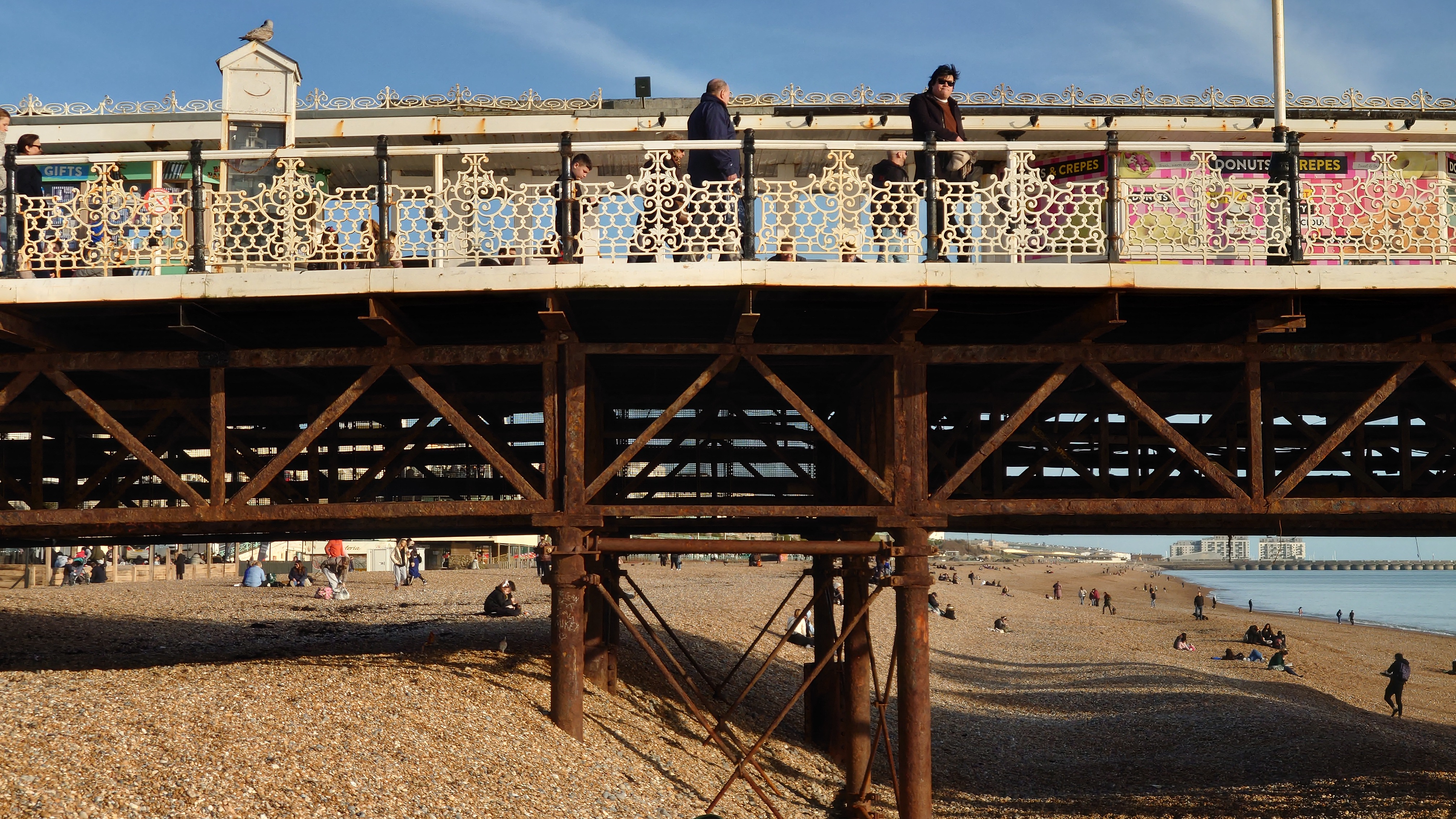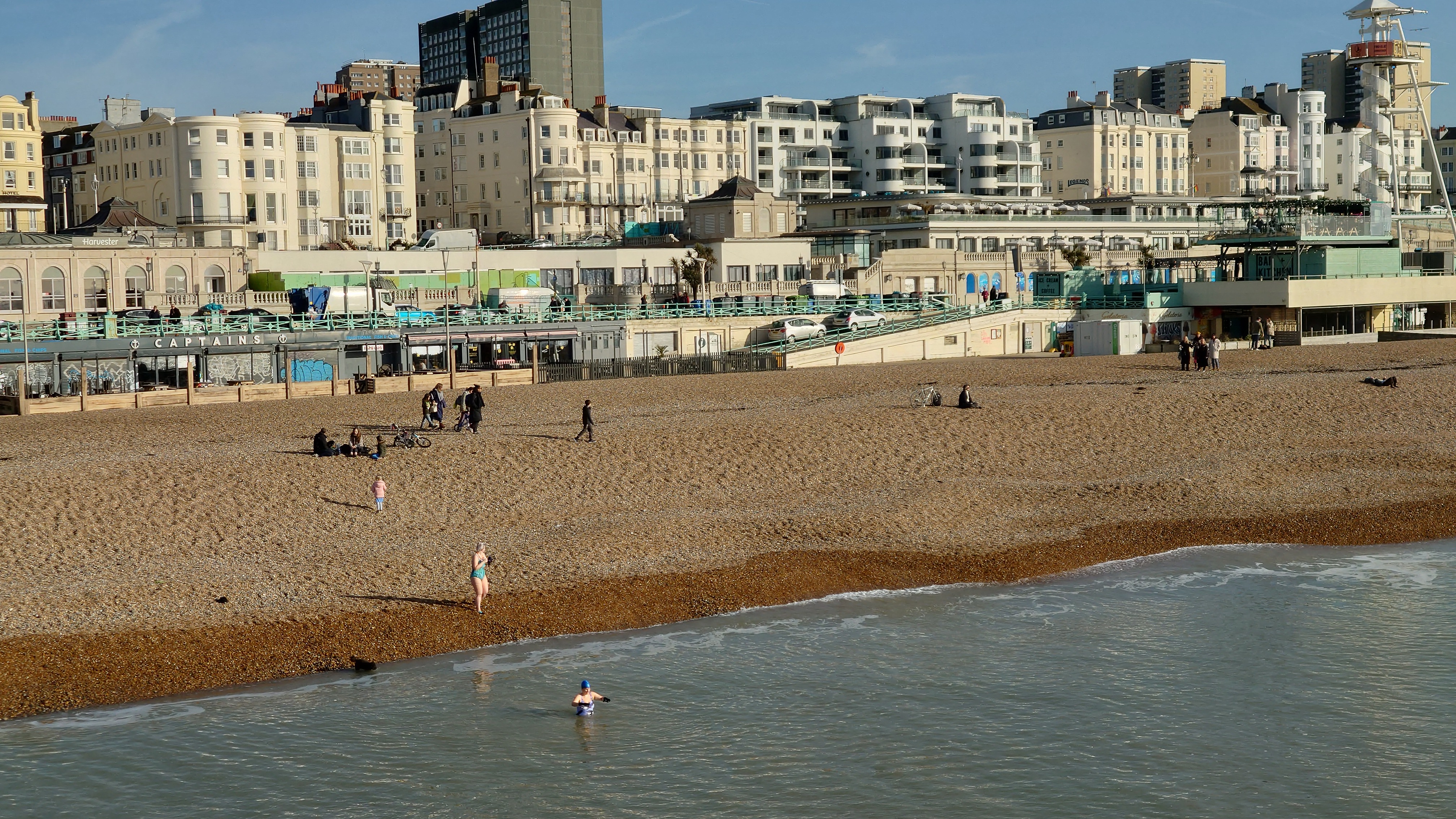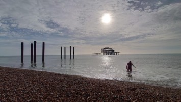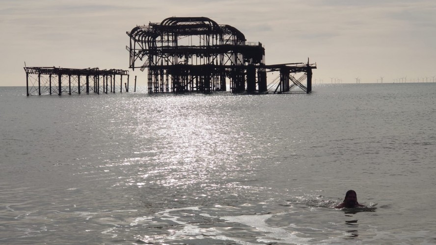 Wir genießen den ins Wasser rostenden Pier, einst glanzvolles, ins Meer ragendes Leuchtfeuer eines Ortes, der den Beginn von Strandtourismus während der Industrialisierung begründete mit auf Stahlstelzen stehenden Theater- und Festsälen. Heute eher Herberge unzähliger Spiel- und Videoautomaten, sowie einer Achterbahn und Fahrgeschäften aller Art fürs Fußvolk. Den stolzen, 1866er West Pier zwangen schwelende Bedeutungslosigkeit in Gestalt eines Großbrandes vor 20 Jahren in die Knie. Es steht nurmehr ein dünnes Gerippe im Meer. Viele Leute sitzen hier am Strand und an der langen Promenade und spielen Sommer. Viele gehen ins Wasser schwimmen, bewaffnet mit Neopren-Handschuhen und -schuhen, schwimmen zum Pierskelett und zurück. Pah. Was die können, kann ich auch. Also, Klamotten aus und rein. 5 Grad. Ein Schock durchfährt mich. Wie soll man das länger als 10 Sekunden unbeschadet aushalten? Es ist der 5. Februar verdammt, auch wenn die Sonne einen Junisonntag herbeischeint. Mannomann, lass dich nicht von der Kneippfestigkeit alter Brighton-Damen und den Club-Besucherinnen in nahezu transparenten Mini-Mini-Miniröckchen fehlleiten. Keine Ahnung, wie Briten Kälte interpretieren. Ich dachte, ich wäre wetterfest.