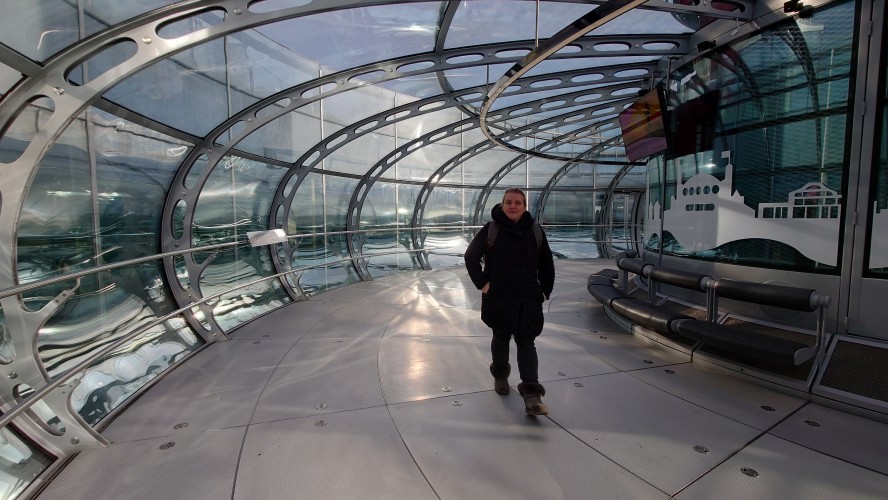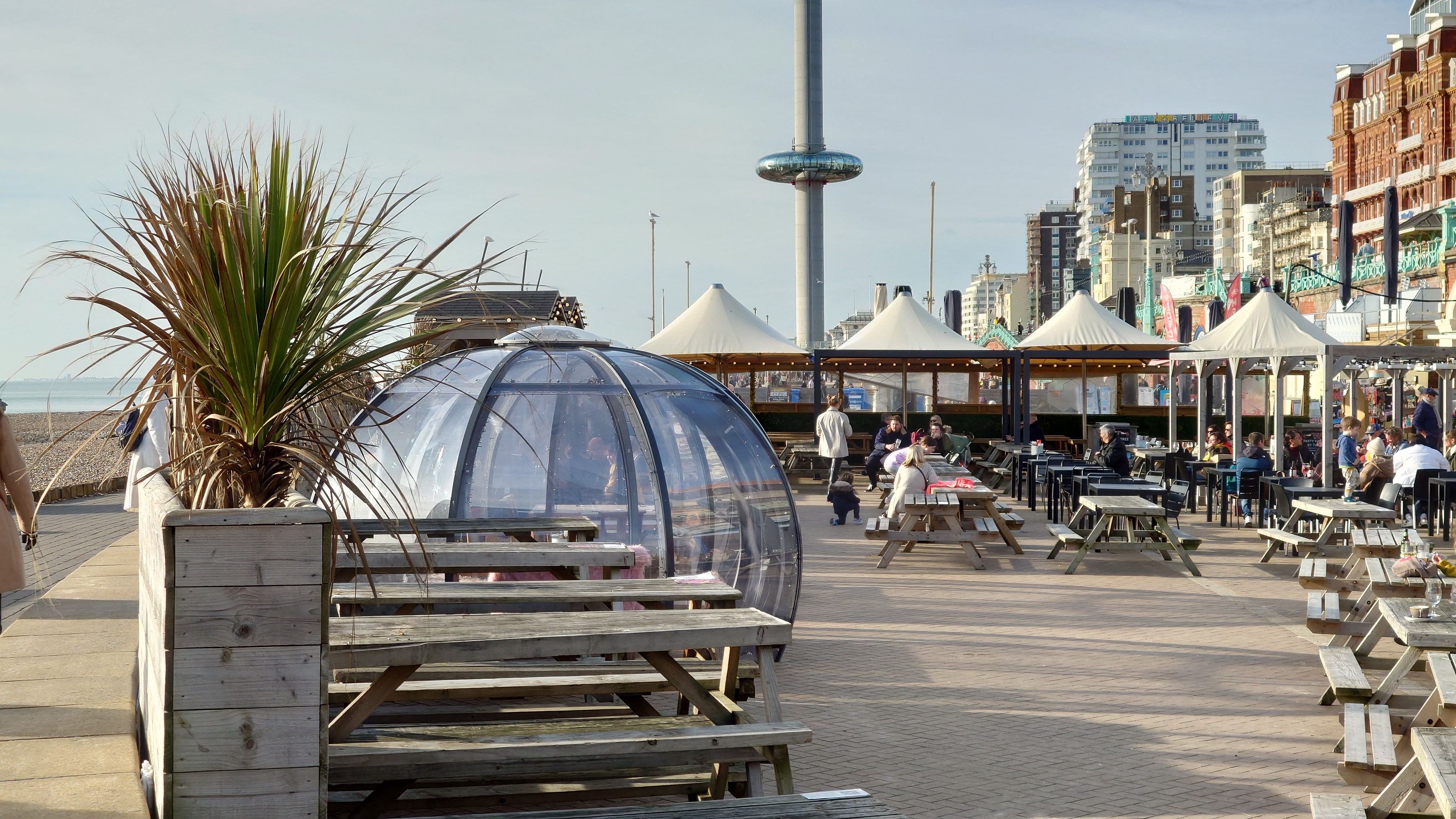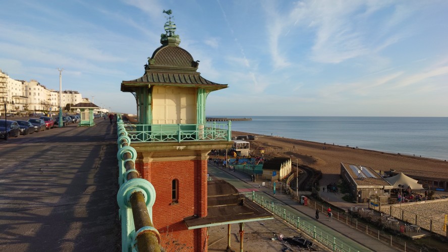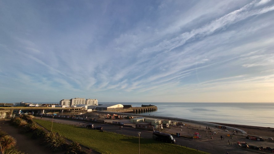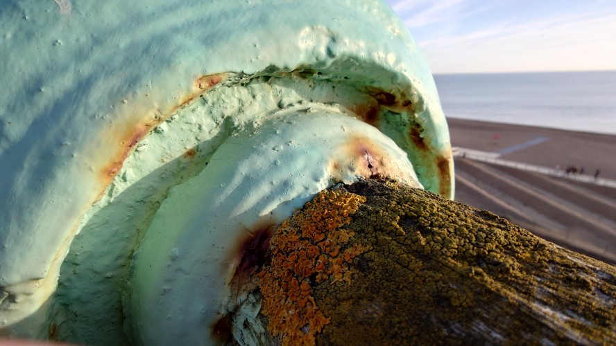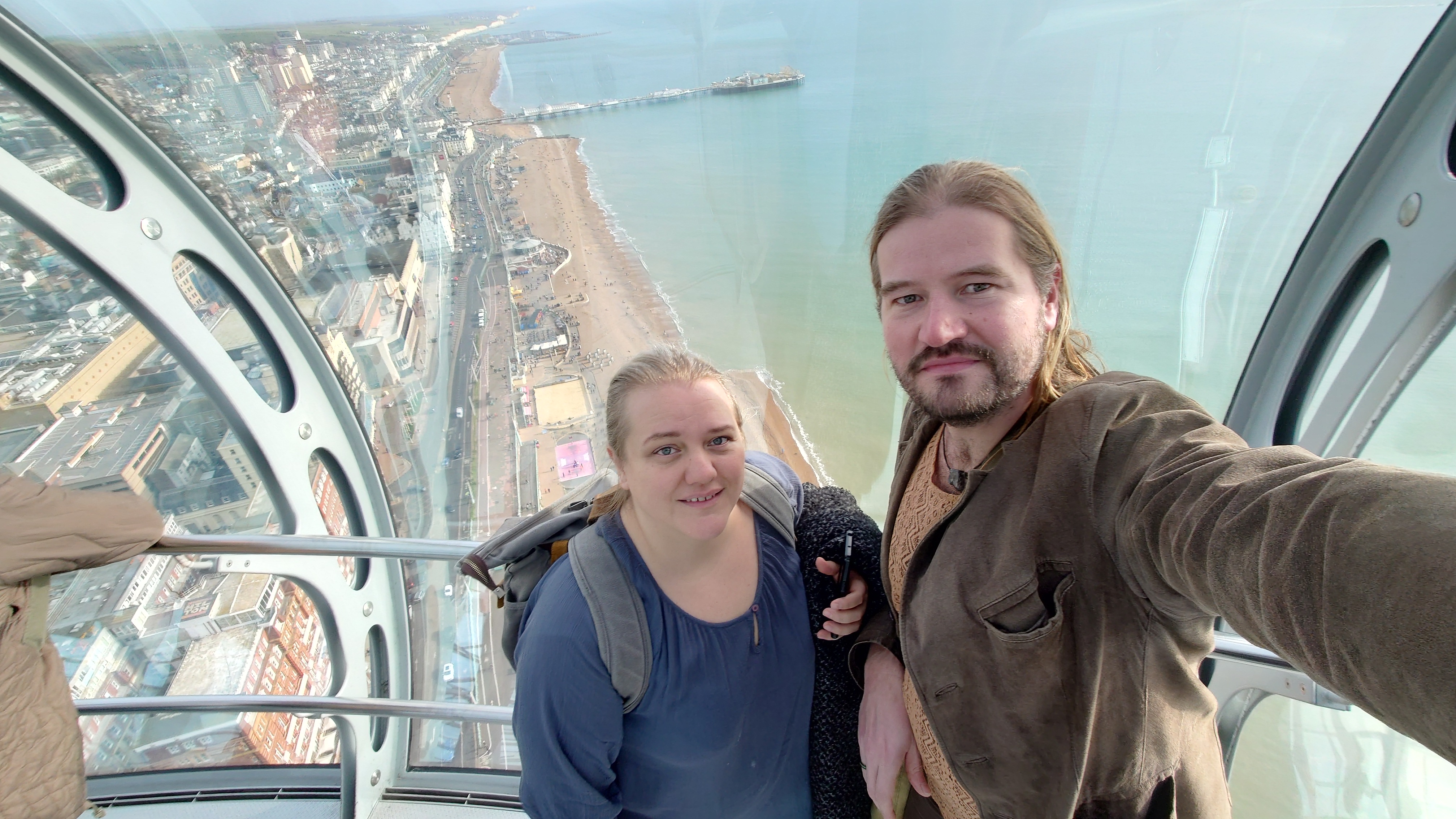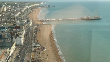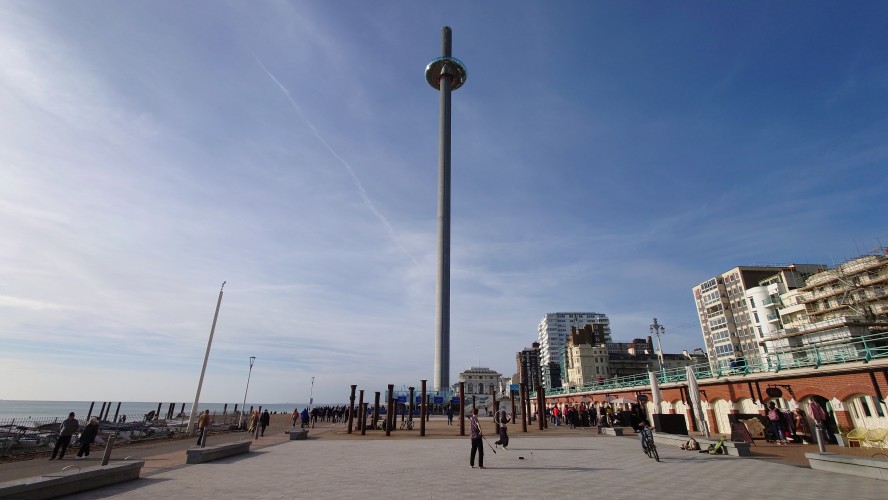 Uns zieht es nach dieser "Frische" im i360-Himmelslift vor dem West Pier in die Luft. Mal einen Überblick erhalten. Brighton ist kompakt und sieht sehr geplant aus. Ein Meer von Reihenhaus-Adern. Weit und breit keine Photovoltaik auf Dächern oder Windräder. Überhaupt sind nahezu alle Fenster einfach verglaste, verkantende, aufquellende Feuchtgebiete in Form von Schiebereglern für Frischluftzufuhr, die in Punkto Isolation nur den Zustand "offen" kennen. Energiewende? Hier nich so. Dafür Palmen und Südseeflora, die erahnen lassen, wie warm der Golfstrom den Süden Englands im Sommer werden lässt. Erstaunlich, dass das Nordsee sein soll. Kein Watt, nur riesige, runde Kieselsteine. Irgendwie unwirklich sauber alles, kein Treibgut, keine Alge.