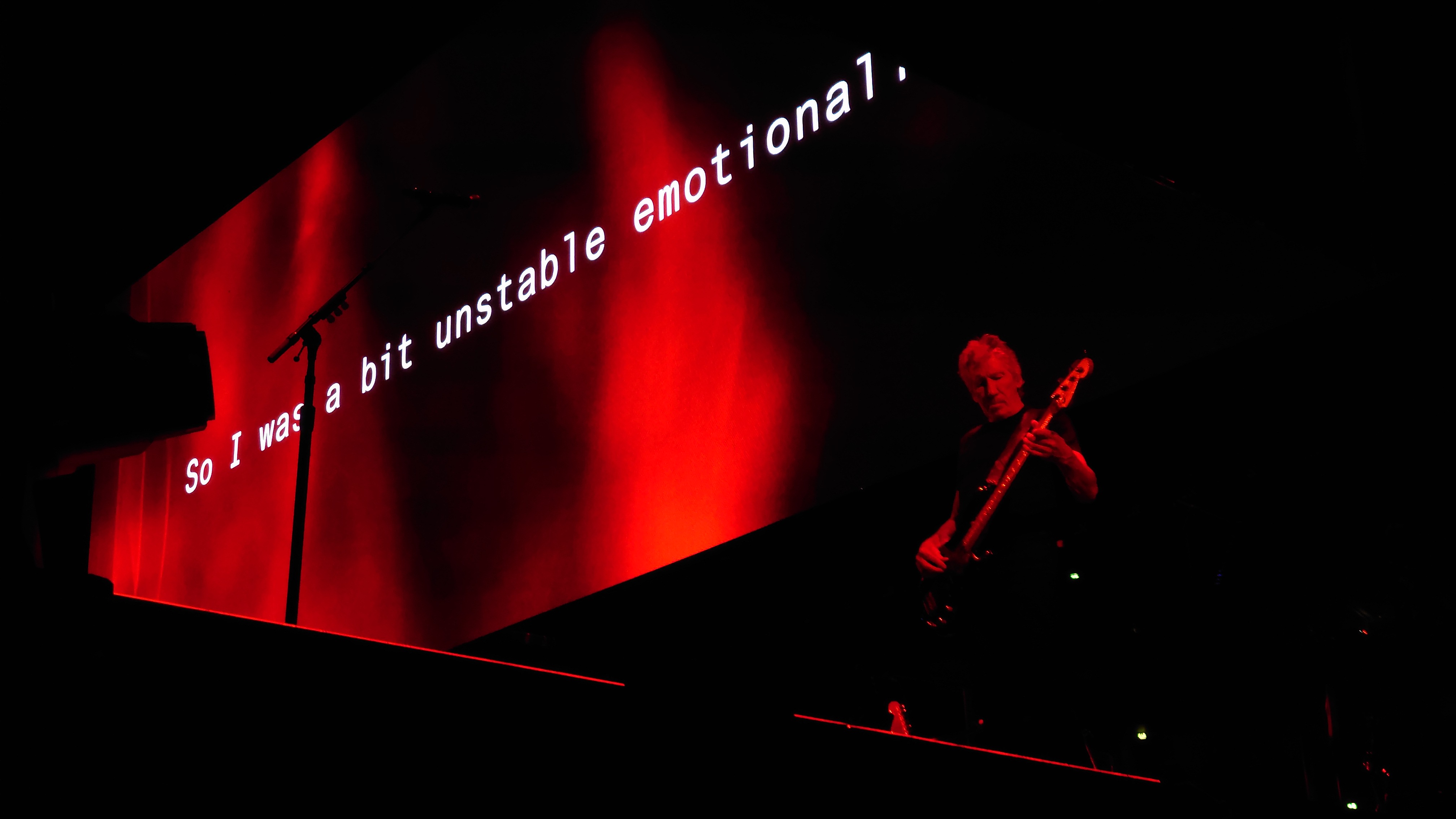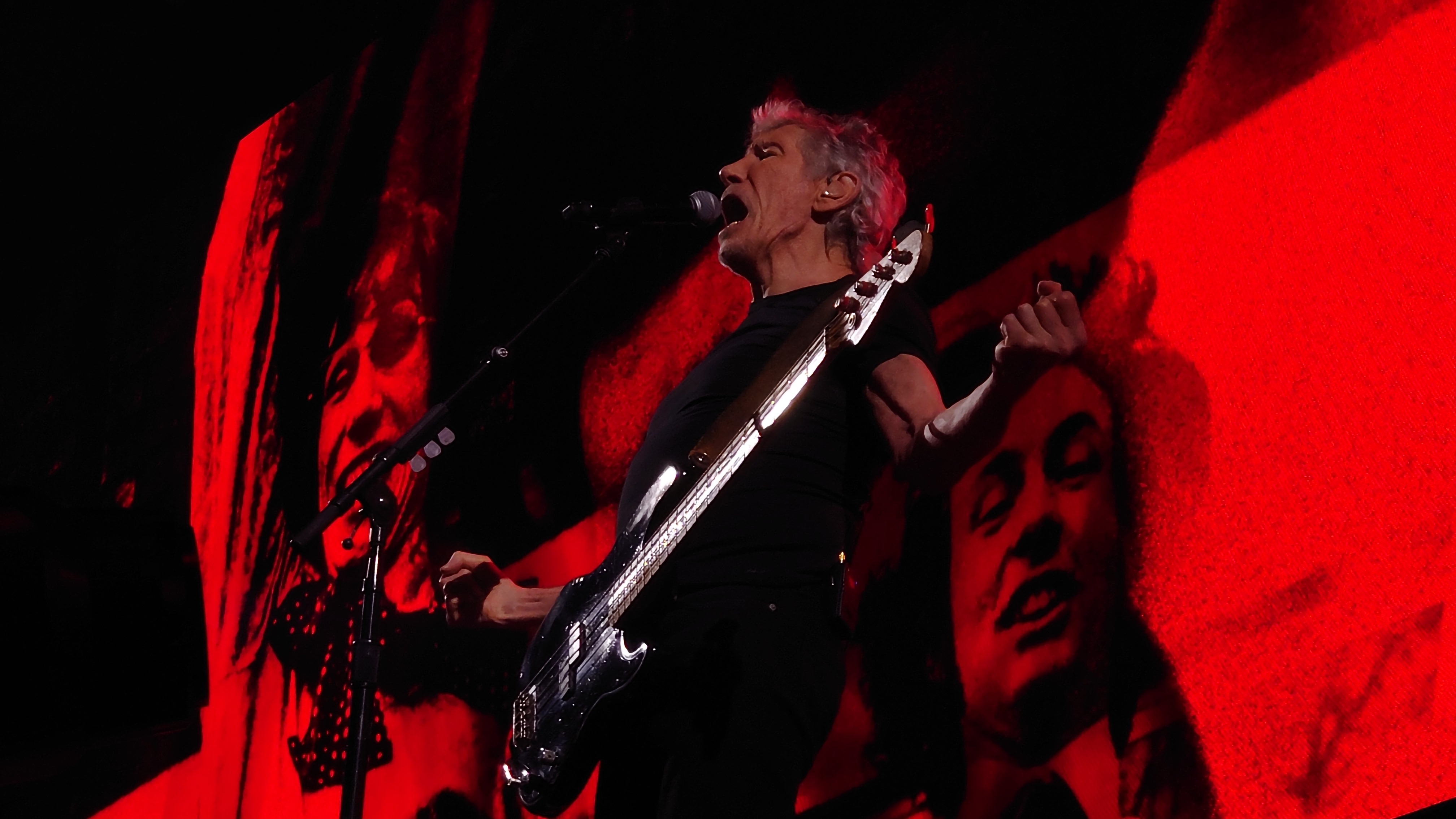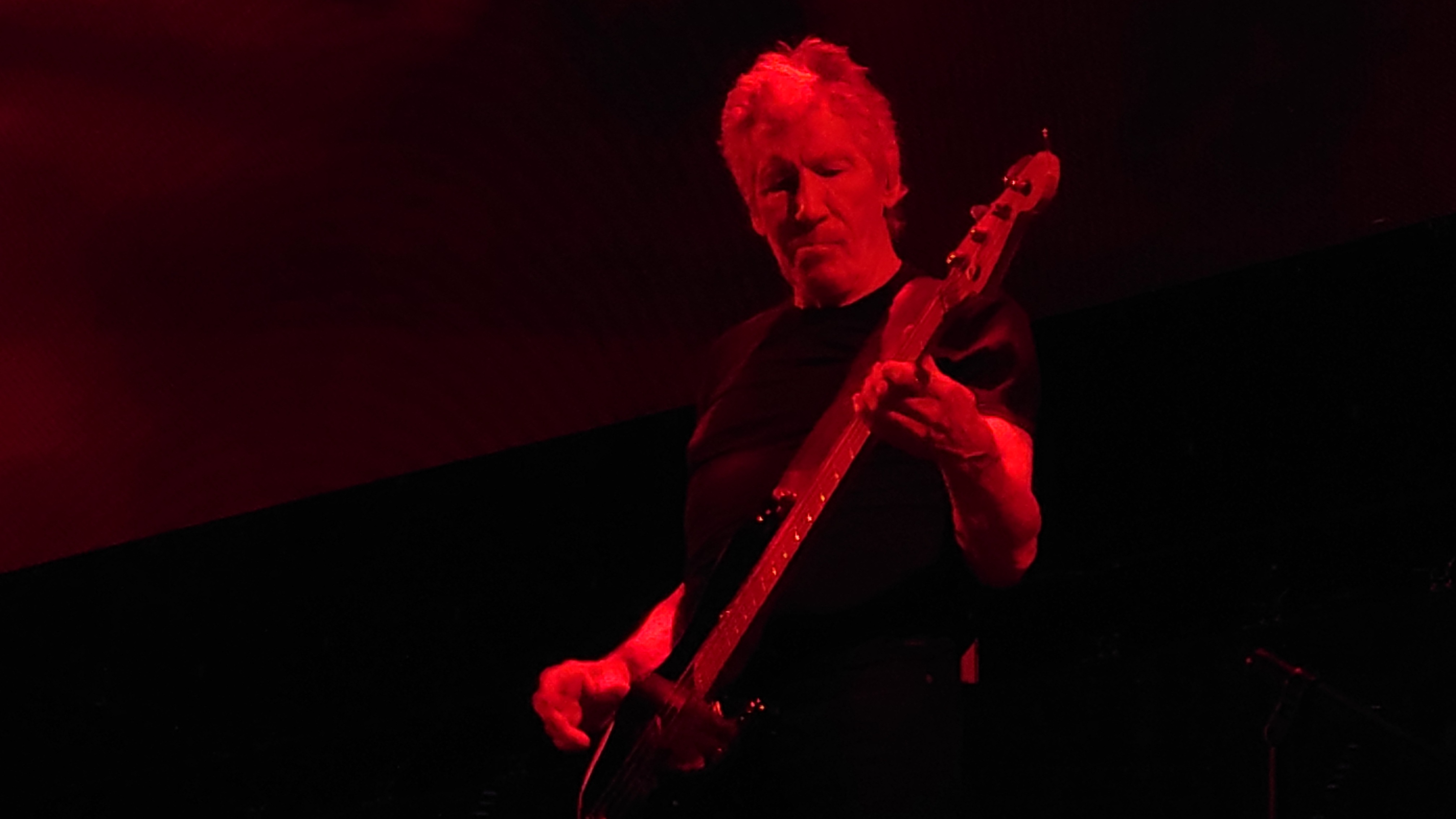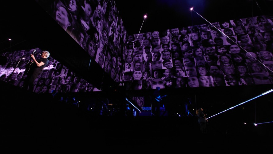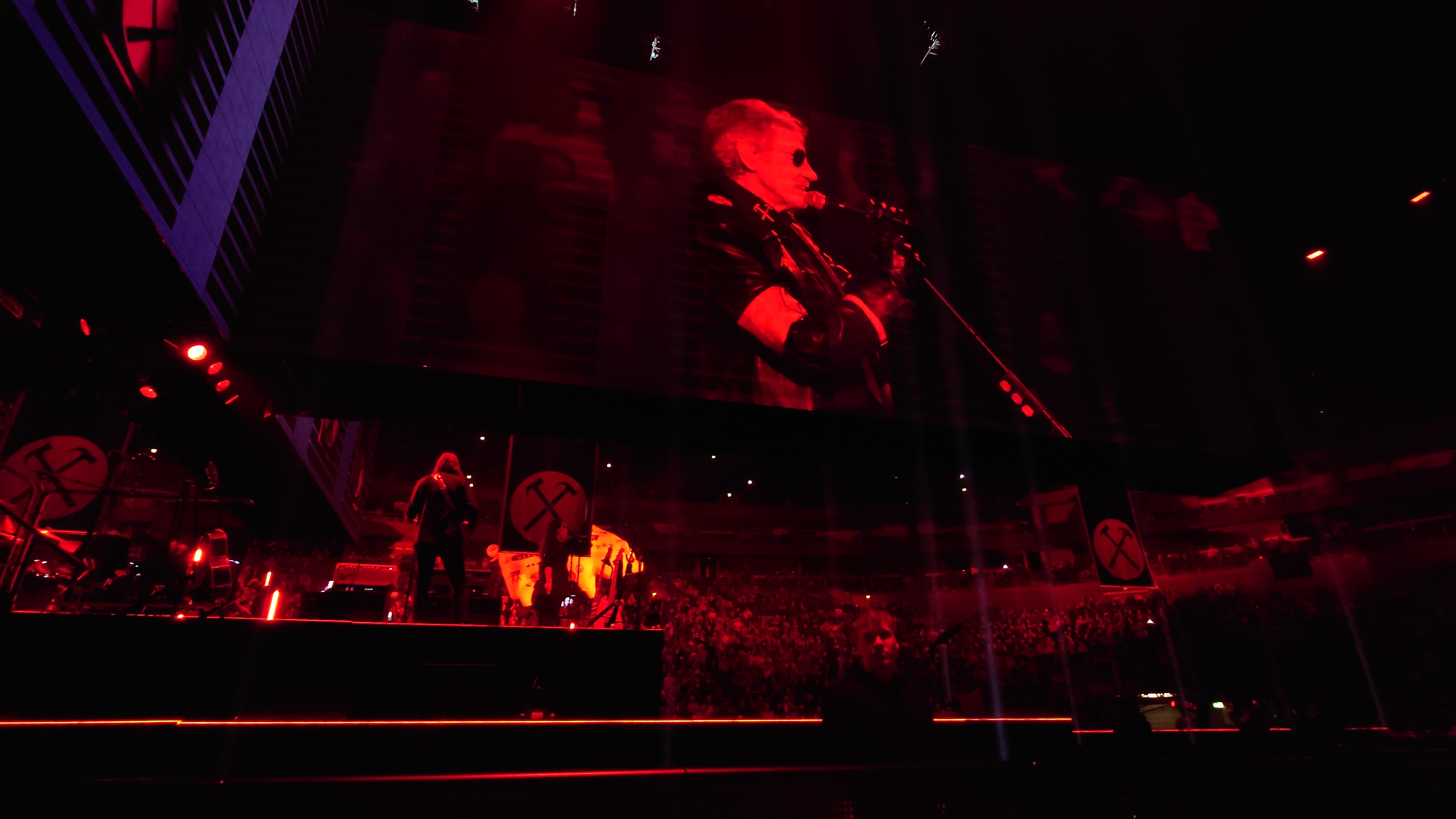 Waters macht uns in seiner Show zu blökenden Schafen, die eine monströse Center Stage umgrasen, auf der er sich als unnahbarer Schäfer inszeniert. Ich werde förmlich platt gewalzt von der soundtechnisch perfekt ausgesteuerten Dreifaltigkeit in Form von Politik, Kino und irgendwie auch Musik, die zu heiß gewaschen vom Hauptakt zum unterworfenen Soundtrack der politischen Ansichten Roger Waters einläuft. Art Noire prägt das Bild; alles ist rot, schwarz und weiß, manchmal blau statt rot. Es ist kalt wie das gewaltige, schwebende LED-Kreuz über der Bühne, das mit der schwergewichtigen Anmut eines Sternenzerstörers unterdrückende Macht symbolisiert. Und Waters gibt sich mächtig. Einerseits als herrischer, unnahbarer Autokrat, dann wieder als anbidernder Kumpel, der uns angetrunken in einer kleinen Eckkneipe um die Schultern liegt und uns unkontrolliert lachend in die Visage rülpst. Dabei ist der Mann dort oben 79 und wirkt agil wie ein 40jähriger. Ich muss an Graf Drakula denken...
