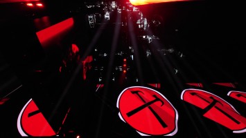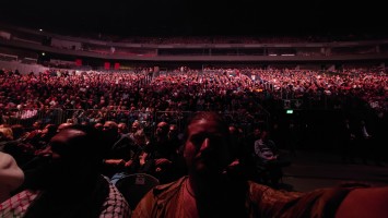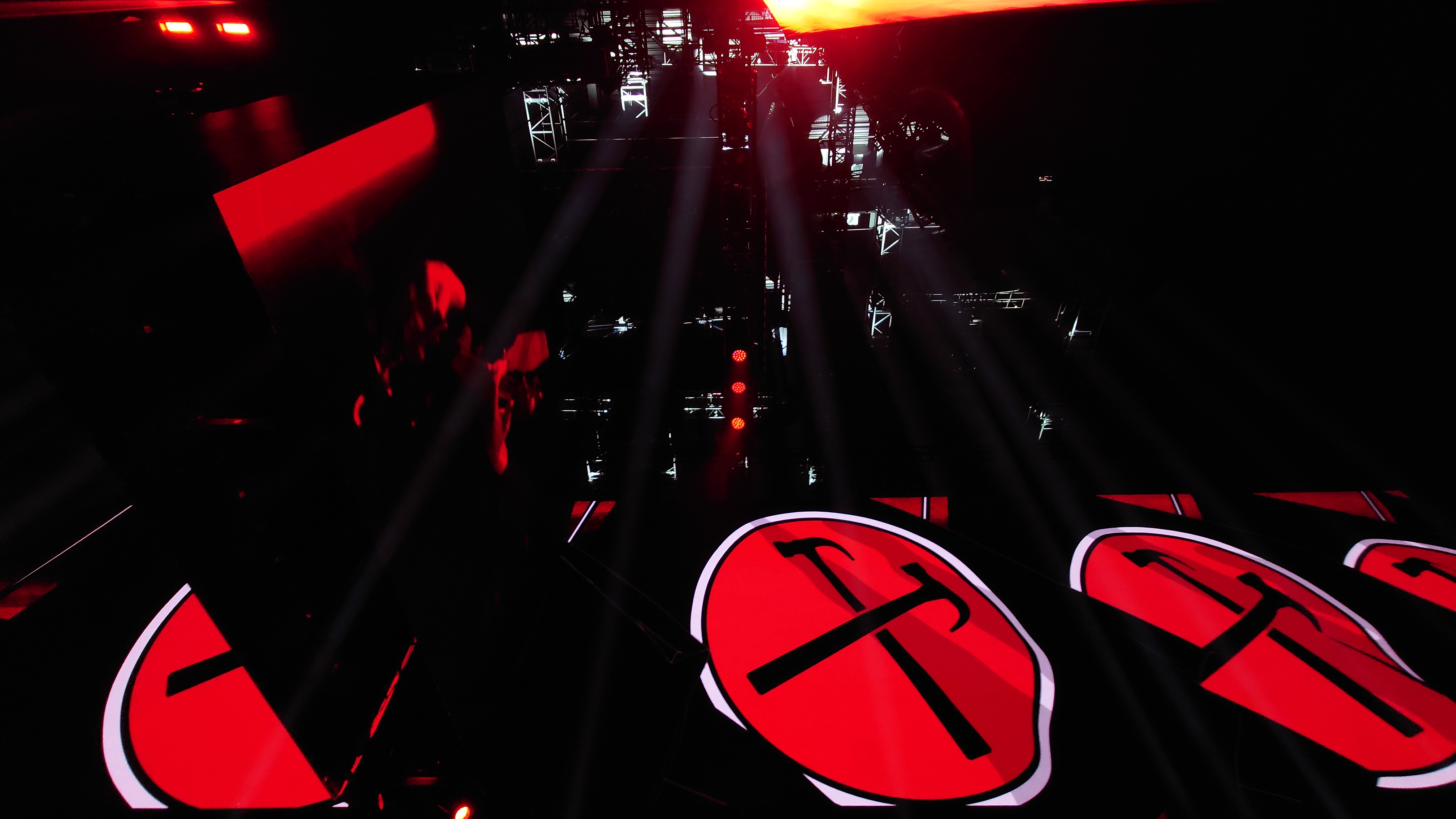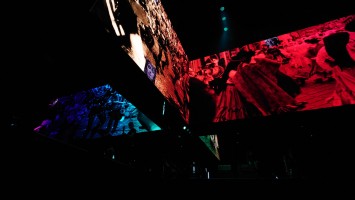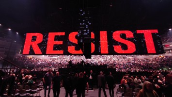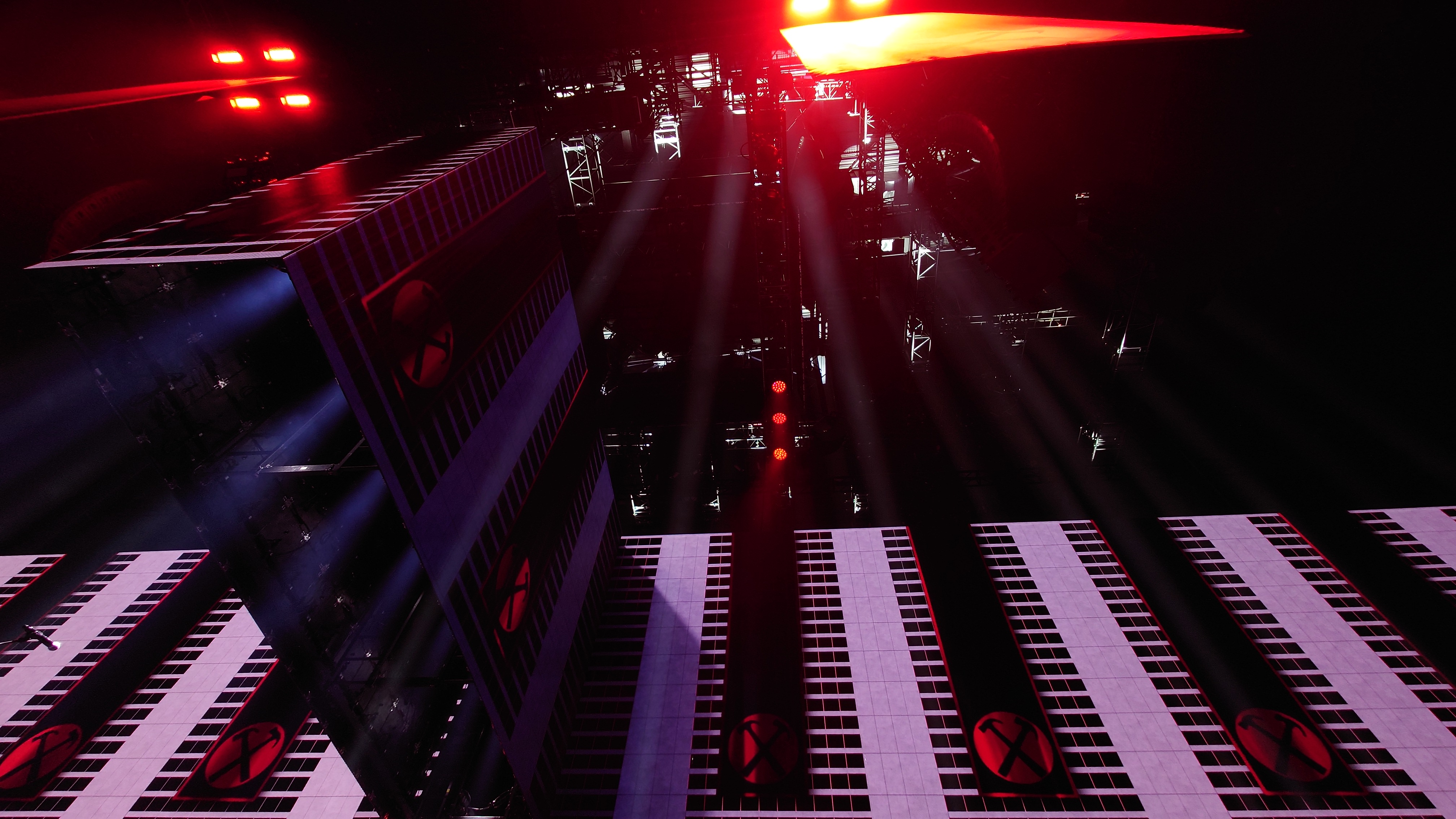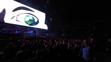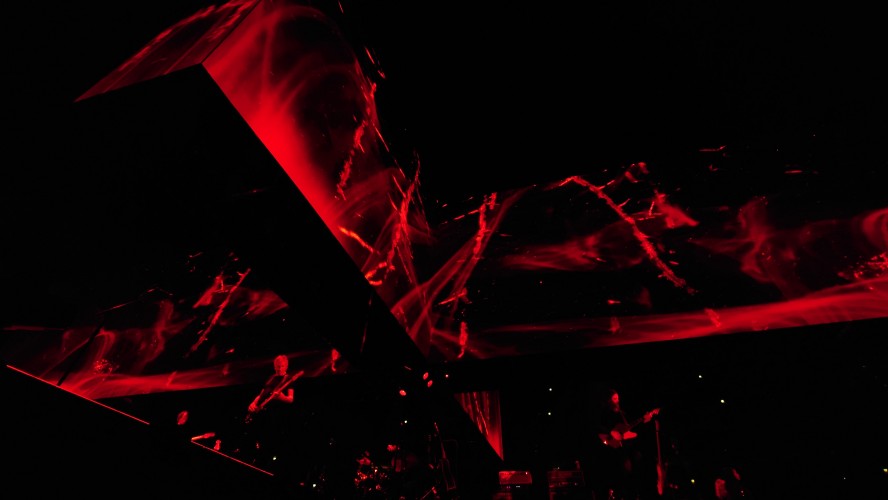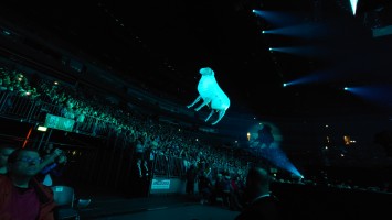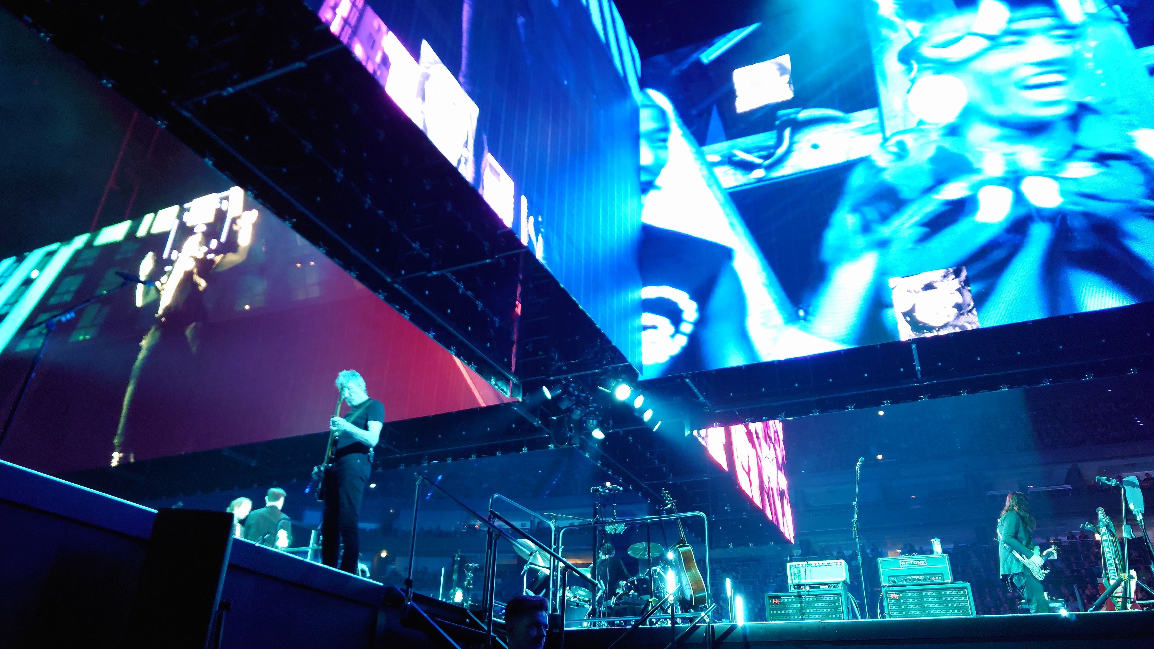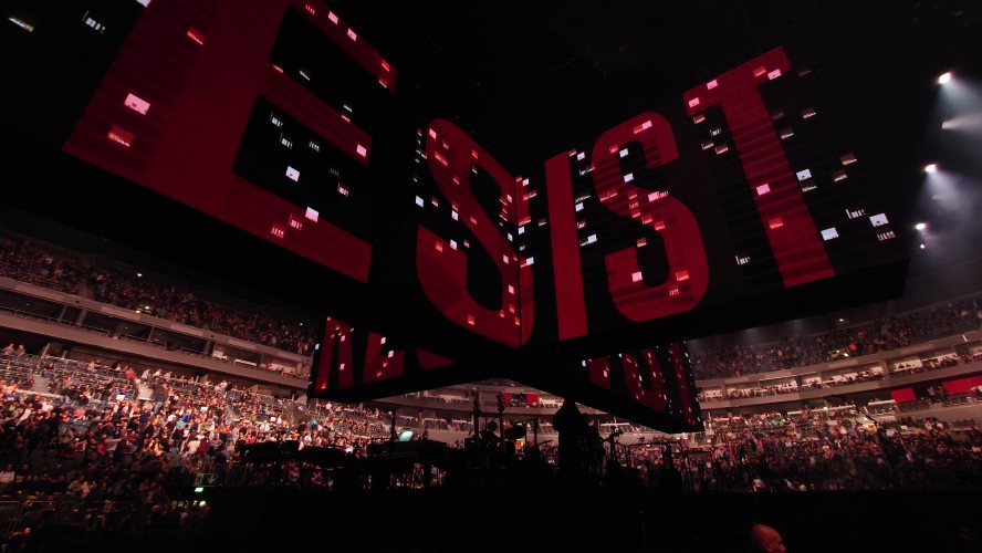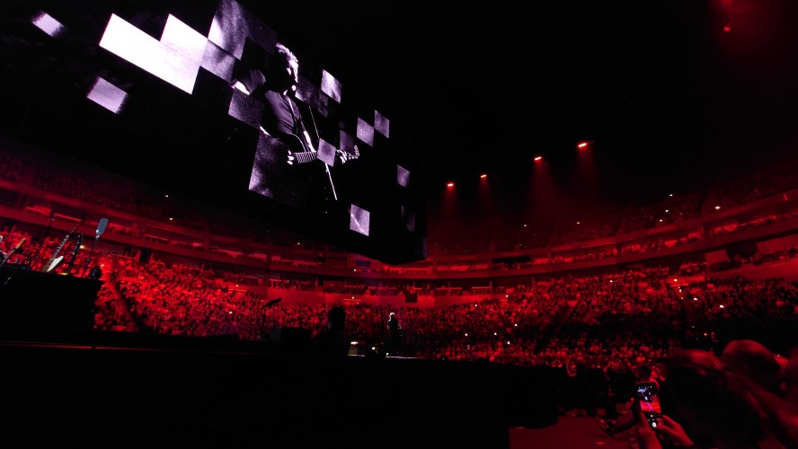 Waters macht uns in seiner Show zu blökenden Schafen, die eine monströse Center Stage umgrasen, auf der er sich als unnahbarer Schäfer inszeniert. Ich werde förmlich platt gewalzt von der soundtechnisch perfekt ausgesteuerten Dreifaltigkeit in Form von Politik, Kino und irgendwie auch Musik, die zu heiß gewaschen vom Hauptakt zum unterworfenen Soundtrack der politischen Ansichten Roger Waters einläuft. Art Noire prägt das Bild; alles ist rot, schwarz und weiß, manchmal blau statt rot. Es ist kalt wie das gewaltige, schwebende LED-Kreuz über der Bühne, das mit der schwergewichtigen Anmut eines Sternenzerstörers unterdrückende Macht symbolisiert. Und Waters gibt sich mächtig. Einerseits als herrischer, unnahbarer Autokrat, dann wieder als anbidernder Kumpel, der uns angetrunken in einer kleinen Eckkneipe um die Schultern liegt und uns unkontrolliert lachend in die Visage rülpst. Dabei ist der Mann dort oben 79 und wirkt agil wie ein 40jähriger. Ich muss an Graf Drakula denken...
