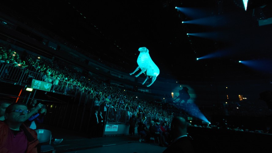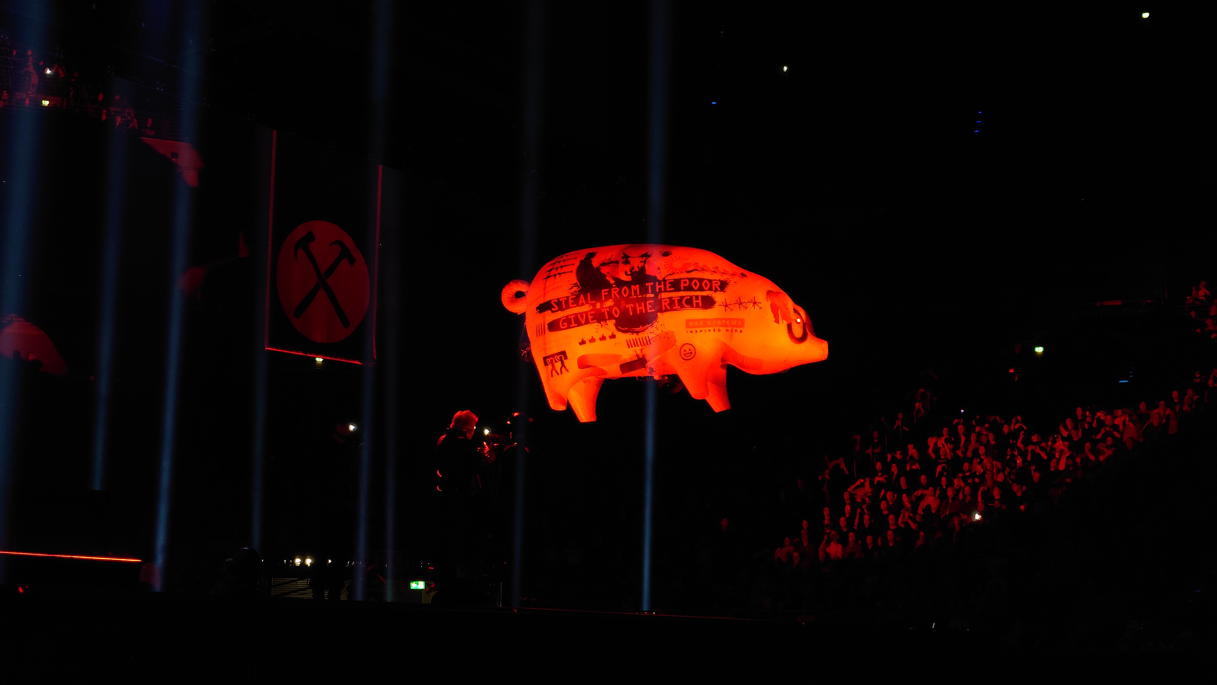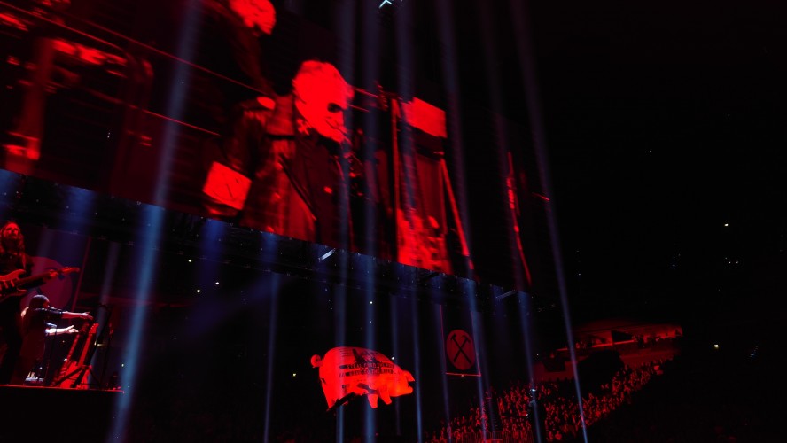 Ich werde neugierig, ich informiere mich. Ich verfolge die Debatten der vergangenen Wochen und entschließe mich kurzer Hand eine Karte zu kaufen. Reihe 1 Mitte, direkt vor dem Mikro. Karten direkt an der Bühne, die eigentlich binnen Sekunden verkauft sind unter normalen Umständen, ist extrem ungewöhnlich. Also will ich mir das Ganze so nahbar wie möglich machen, will seine Krampfadern sehen, stelle mich auf ein Buh-rufendes Publikum ein. Wie ungestüm kann ein steinalter Rockstar heute noch sein? Musikalisch hat mich Pink Floyd beinahe ebenso lange wie Mike Oldfield fasziniert, vor allem das Dark Side of the Moon, das witzigerweise vor 50 Jahren im Brighton Dome uraufgeführt wurde. Ein würdiger Ort für große Kompositionen, scheint mir. Erst begeistert mich also die avantgardistische Musik der 70er, dann wollte ich auch die Hintergründe wissen um den Split 1985, als Waters die Band verließ und David Gilmour der Frontmann wurde. Scharfe Kapitalismus- und Imperialismuskritik war lange Tenor der Konzeptalben. Waters treibt es auch solo bis heute auf die Spitze und polarisiert spätestens seit der Ukrainekrise wieder extrem. Ich will mir meine eigene Meinung bilden und nicht nur aus den Medien lesen. Ich nehme mir also das Geld und die Zeit und gehe ins Konzert, gehe aber ebenso zu den Podiumsdiskussionen. Ich sehe 11.000 begeisterte Fans in der Arena, größtenteils im Rentenalter, mit FPP2 Masken neben ein paar Dutzend Demonstranten. Das las sich in den Zeitungen aber empörter, denke ich mir. Seit Waters zwei Tage zuvor beim Deutschlandstart in Hamburg festgestellt hat, dass er kein Antisemit ist, haben sich die vielen Restkarten binnen Stunden verkauft, als wenn Fans nur auf dieses Statement gewartet haben, um guten Gewissens die Show doch besuchen zu dürfen. Ich spreche mit zwei Studenten neben mir in Reihe 1, die ihr Glück kaum fassen können und aus Belgien angereist sind. Sie verstehen den Ärger nicht. Ich verfolge die Gründe gegen ihn in den Medien, schaue mir seine Äußerungen an, erkenne den Anstoß und frage mich gleichzeitig, was bei Waters bzw. Pink Floyd neu daran ist. Ein durch die Halle fliegender Schweinezeppelin mit Parolen, Produkt- und Machtsymbolen ist der Brennpunkt, der das Fass zum Überlaufen brachte. Ein Symbol, das seit dem Album Animals immer wieder Teil einer dystopischen Inszenierung wird. Waters zitiert oft aus Animal Farm, so auch das Schwein als Symbol der Gleicheren unter den Gleichen und skaliert das Bild hoch auf alle US-Präsidenten seit Ronald Reagan, bezeichnet sie als Kriegsverbrecher.