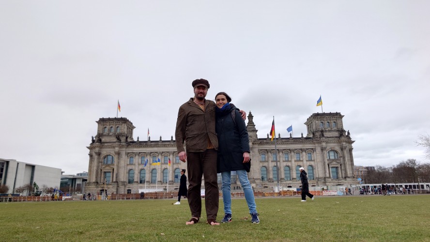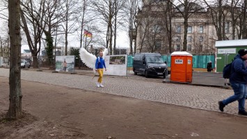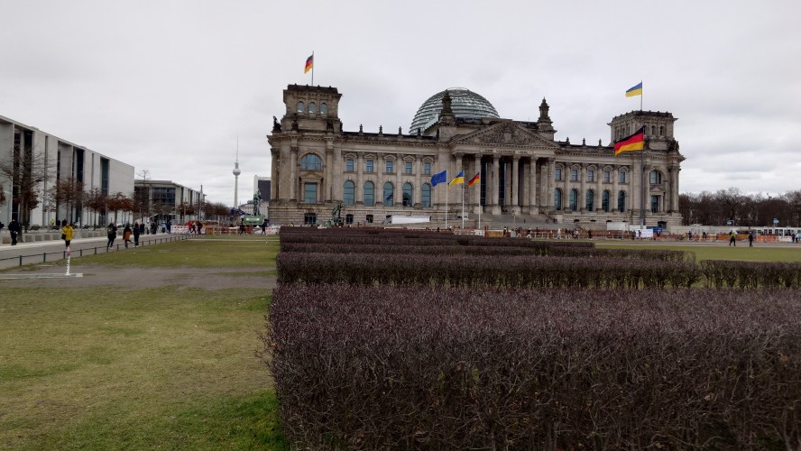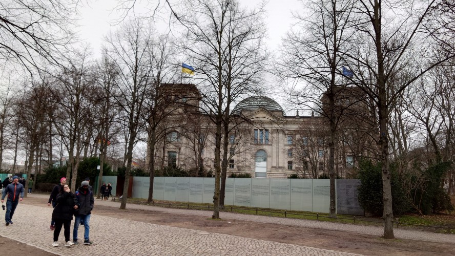 Der nächste Tag. Ein kleines Selfie vor dem Bundestag, das ebenfalls zur Feier des Tages Blaugelb trägt wie alle Behörden der Stadt. Berlin ist zwar kalt heute, die meisten Regenbogenflaggen sind wieder zusammengerollt und durch noch mehr Ukraineflaggen angesichts des morgigen Jahrestags des Kriegs ersetzt worden, die Toleranzgrenze ist hoch. Die blau gelbe Flagge ist auf den Bundestag hochgekrabbelt, als wären wir alle in einer Ukraineunion vereint. Das wird rückwirkend betrachtet vielleicht ein seltenes Bild sein.