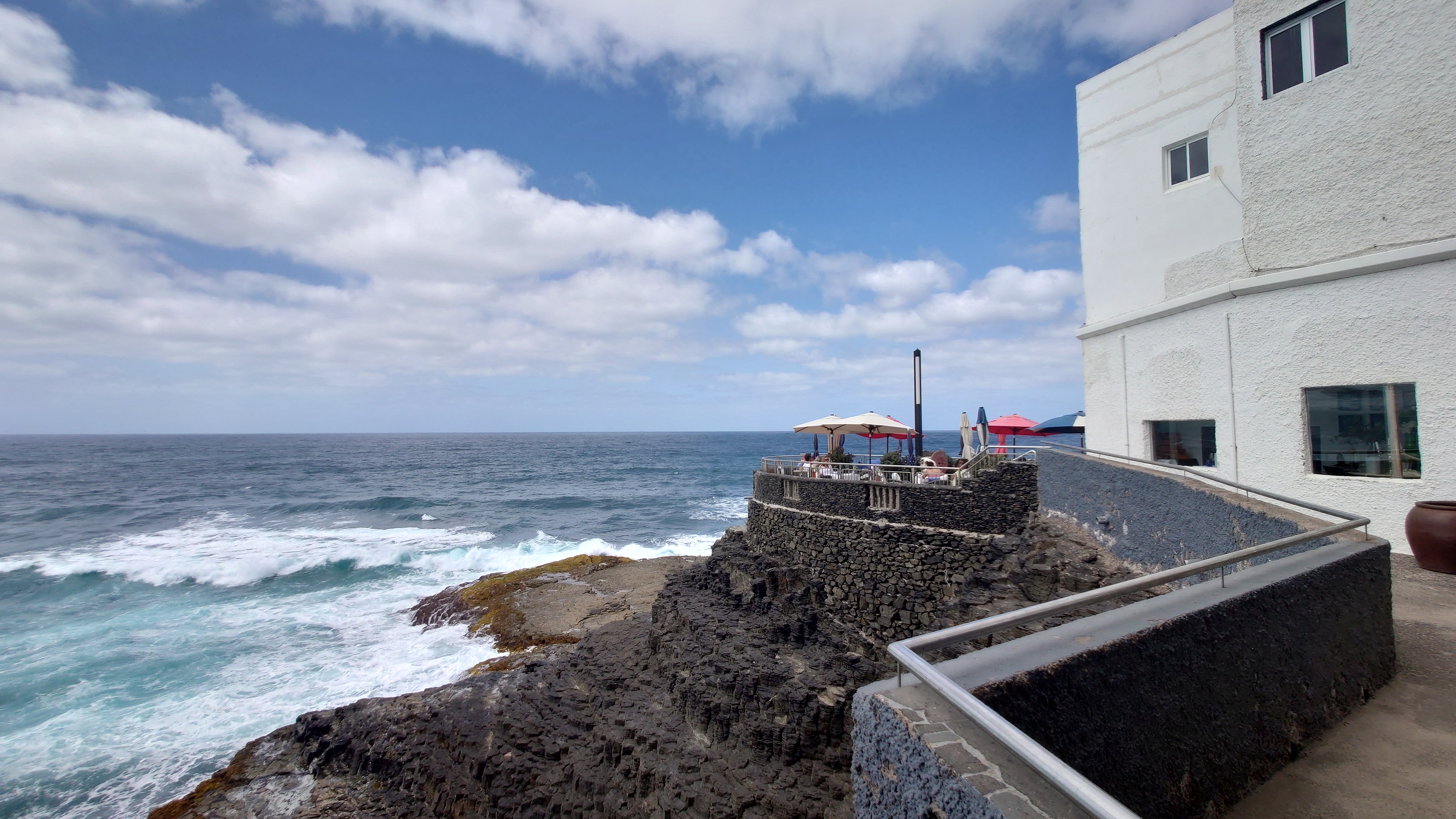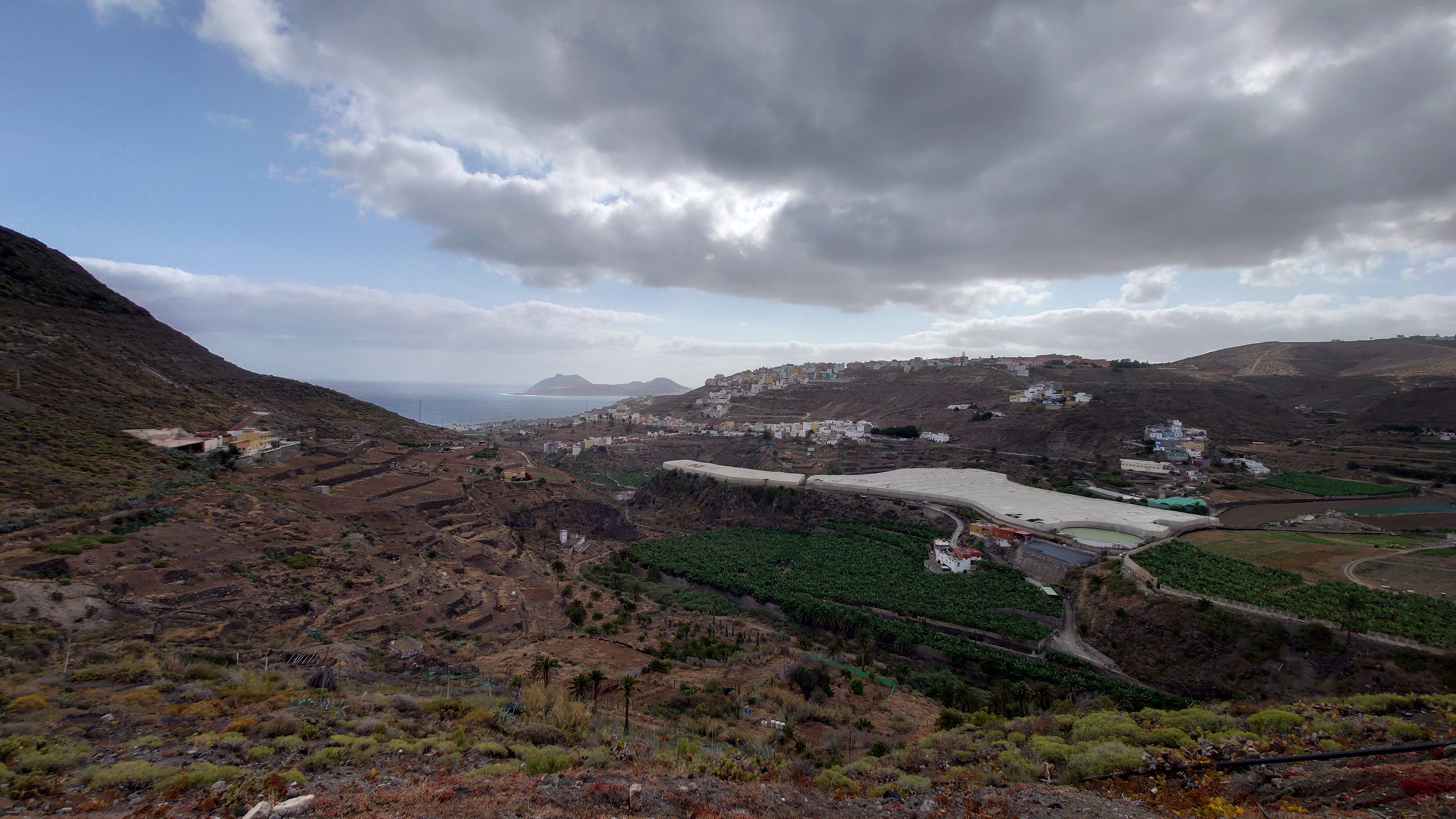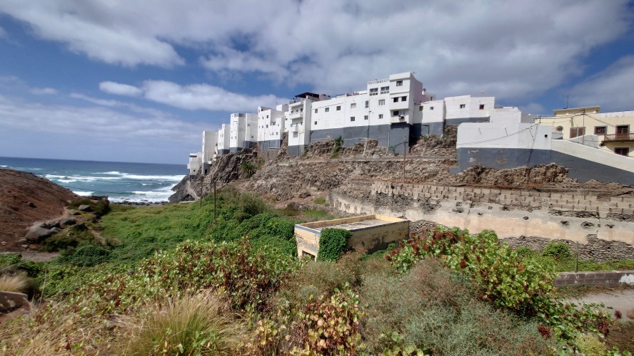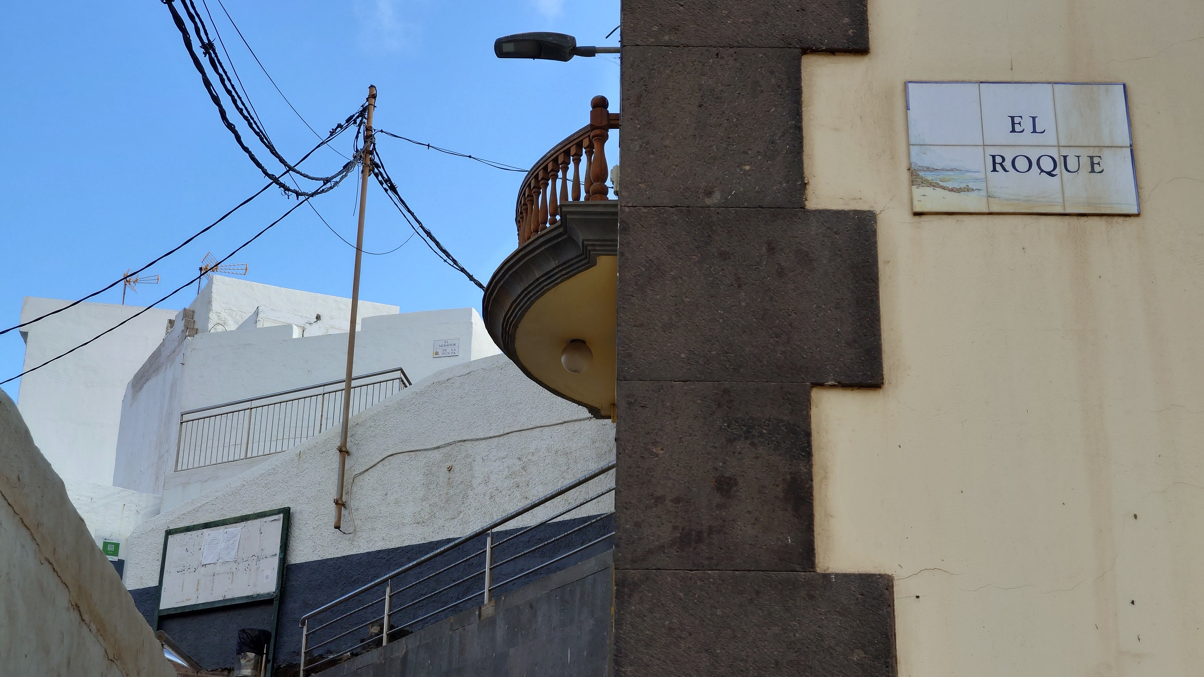Ich verlasse meinen Betonschwitzkasten am Meer ohne Meer und laufe die alte Straße entlang in Richtung Westen. Bananenplantagen säumen mehr und mehr die Täler wie auf La Palma. Tourismus ist hier oben nicht, dafür ist die Nordküste einfach zu rauh. Aber es wird schöner, je mehr ich Las Palmas hinter mir verschwinden lasse. Es geht einen gehörigen Umweg übers Hochland auf einer kleinen Straße und durch wunderschöne grüne Täler. Die Sonne versteckt sich oft zwischen lockeren Wolken und es sind gerade mal 20 Grad... sagt mein Gerät. Das merke ich schon die ganze Zeit, weil es sich auch in meinem Wasserbedarf widerspiegelt. Ich brauche kaum was, schwitze sogar kaum. Entweder es liegt am rauhen Norden oder im Mai ist das Wetter wechselhafter als die vorherigen Male im Juni und September. Außerdem hab ich gelernt, dass es eine Art Hemd gibt, die besser ist als gar kein Hemd anhaben, obwohl es als das Beste scheint, sich komplett auszuziehen, wenn man schweißnass wird. Bislang hatte ich entweder Polyesterhemden, die sich aber auf Dauer echt unangenehm beim Wandern anfühlen oder ein Baumwollnetzhemd, das sich zwar luftig anfühlt, das Wasser aber aufsaugt wie ein Schwamm. Das Beste aus beiden ist die geniale Lösung: ein Polyesternetzhemd. Es schützt gegen Sonne, lässt aber alle Luft hindurch und trocknet binnen Minuten. Genial... Optisch ist das erstmal wieder ne Herausforderung für mich, obwohl ich es toll finde und mir damit gefalle. Ich könnte aber möglicherweise auch wie so ne Musclemary auszusehen, auch wenn ich es nicht so empfinde und ich auch sonst diesem Stereotyp nicht entspreche, glaub ich. Es wird mir schließlich egal, als ich merke, dass außer mir selbst keiner so wirklich Notitz davon nimmt, außer ein junger Verkäufer in ner BP-Tankstelle, bei dem ich Zitronenjoghurt kaufe. Supermercados sind rah gesäht hier oben. Er beschallt seine Tankstelle laut mit Bob Marley über die Brüllwürfel des Außenbereichs und stellt entspannt fest, dass das Hemd eigentlich rot-gelb-grün gestreift sein muss, um authentisch zu sein. Die Haare passen schon ganz gut! Hm. Hätte eher mit "diverseren" Assoziationen gerechnet, aber seine ist für mich im Vergleich angemessener, finde ich. Ich lasse mir viel Zeit und schlendere auf der GC 300, dann 350, dann 75, mit Hörbuch im Kopf hinunter zu meinem Zielort Moya an der Nordküste. Mein heutiges Ziel ist erhaben wie ich finde. Es heißt "El Roque" und wird seinem Namen gerecht. Ein Häuserklumpen bestehend aus über 60 Einheiten thront auf einem ins Meer ragenden Felsen wie ein eigener Ort im Ort. Er ist nur zu Fuß erreichbar und am Ende ist ein kleines Restaurant. Mein Domizil ist weit außen und unter meinem Balkon donnern die Wellen. Ein bisschen wie ein Schiff... ein bisschen wie eine Leuchtturminsel... ein bisschen unwirklich und unheimlich... und laut. Die Leute wohnen hier tatsächlich vorwiegend. Meine private Ferienwohnung ist eher die Ausnahme. Bemerkenswerter Ort. So langsam komme ich gedanklich an auf der Insel. Hoffentlich mein Schädel auch morgen früh.