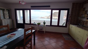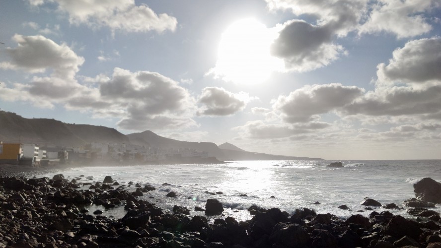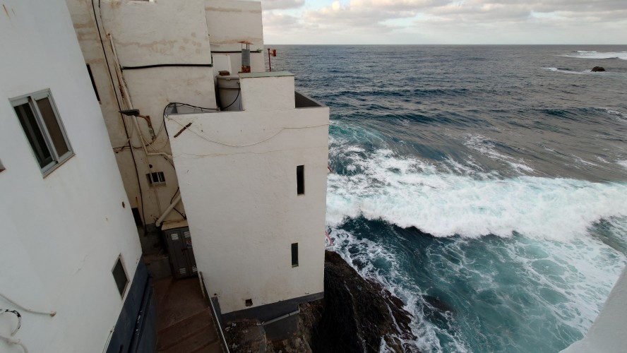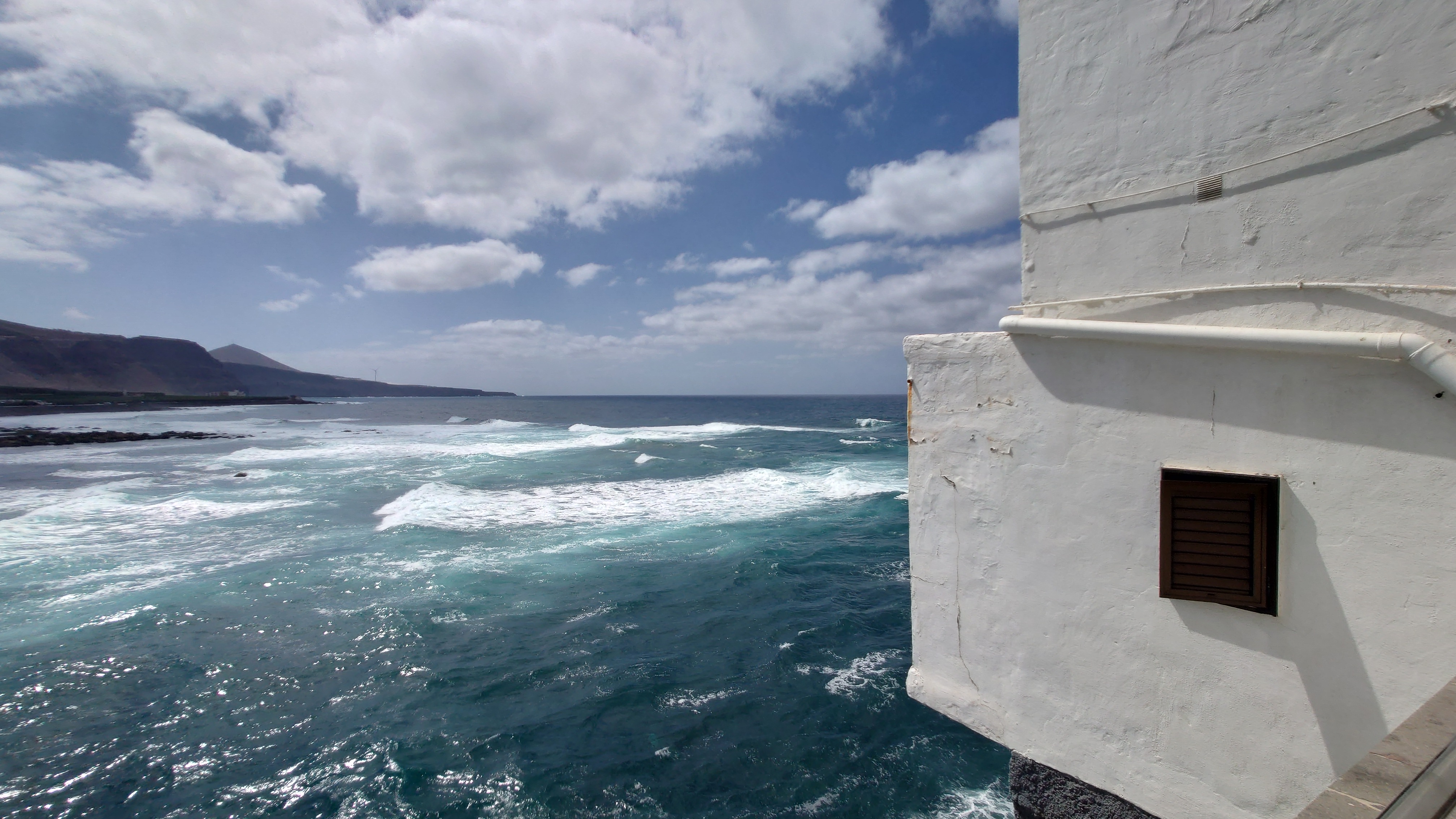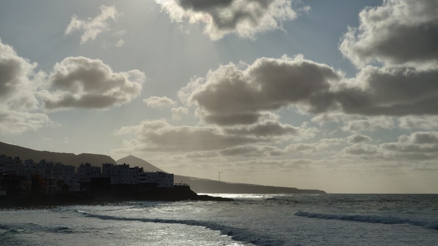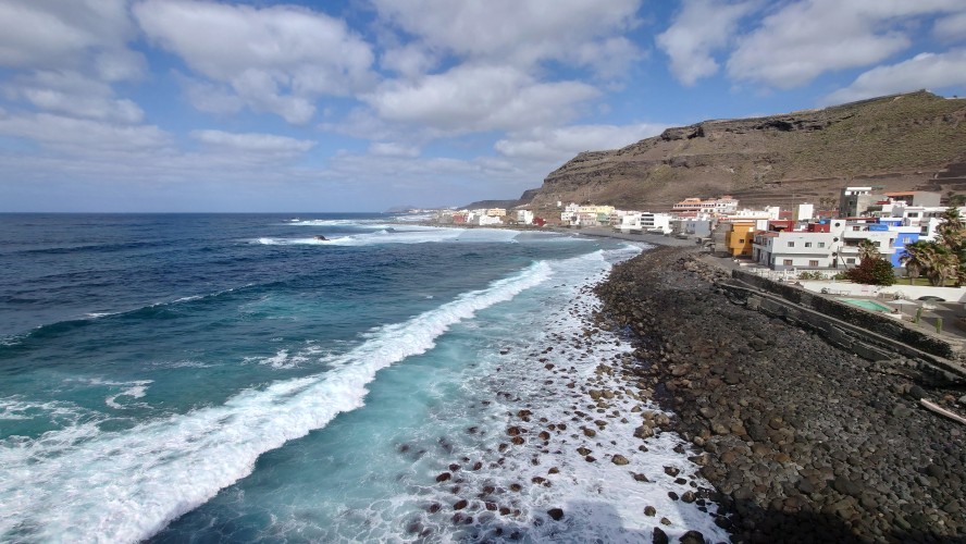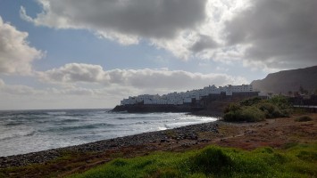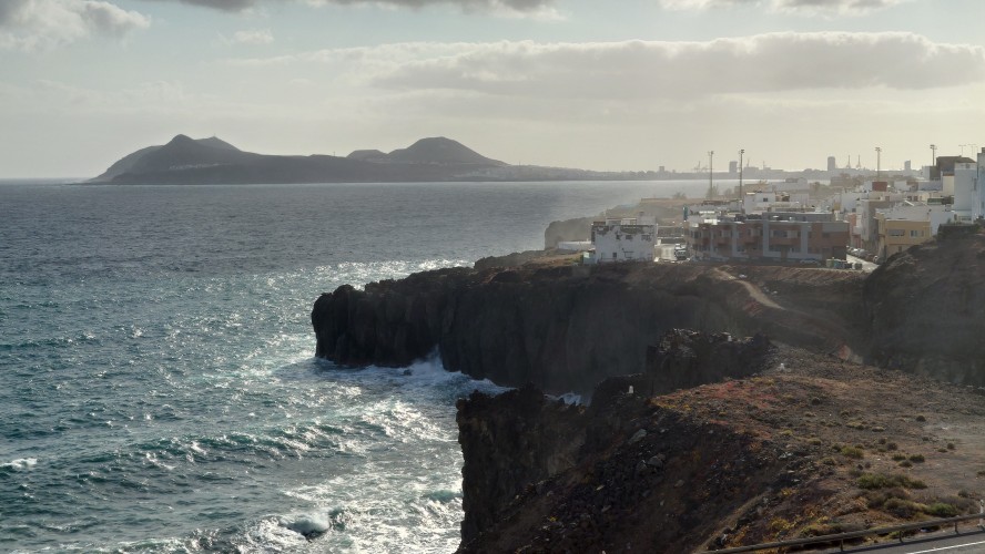 Ich verlasse meinen Betonschwitzkasten am Meer ohne Meer und laufe die alte Straße entlang in Richtung Westen. Bananenplantagen säumen mehr und mehr die Täler wie auf La Palma. Tourismus ist hier oben nicht, dafür ist die Nordküste einfach zu rauh. Aber es wird schöner, je mehr ich Las Palmas hinter mir verschwinden lasse. Es geht einen gehörigen Umweg übers Hochland auf einer kleinen Straße und durch wunderschöne grüne Täler. Die Sonne versteckt sich oft zwischen lockeren Wolken und es sind gerade mal 20 Grad... sagt mein Gerät. Das merke ich schon die ganze Zeit, weil es sich auch in meinem Wasserbedarf widerspiegelt. Ich brauche kaum was, schwitze sogar kaum. Entweder es liegt am rauhen Norden oder im Mai ist das Wetter wechselhafter als die vorherigen Male im Juni und September. Außerdem hab ich gelernt, dass es eine Art Hemd gibt, die besser ist als gar kein Hemd anhaben, obwohl es als das Beste scheint, sich komplett auszuziehen, wenn man schweißnass wird. Bislang hatte ich entweder Polyesterhemden, die sich aber auf Dauer echt unangenehm beim Wandern anfühlen oder ein Baumwollnetzhemd, das sich zwar luftig anfühlt, das Wasser aber aufsaugt wie ein Schwamm. Das Beste aus beiden ist die geniale Lösung: ein Polyesternetzhemd. Es schützt gegen Sonne, lässt aber alle Luft hindurch und trocknet binnen Minuten. Genial... Optisch ist das erstmal wieder ne Herausforderung für mich, obwohl ich es toll finde und mir damit gefalle. Ich könnte aber möglicherweise auch wie so ne Musclemary auszusehen, auch wenn ich es nicht so empfinde und ich auch sonst diesem Stereotyp nicht entspreche, glaub ich. Es wird mir schließlich egal, als ich merke, dass außer mir selbst keiner so wirklich Notitz davon nimmt, außer ein junger Verkäufer in ner BP-Tankstelle, bei dem ich Zitronenjoghurt kaufe. Supermercados sind rah gesäht hier oben. Er beschallt seine Tankstelle laut mit Bob Marley über die Brüllwürfel des Außenbereichs und stellt entspannt fest, dass das Hemd eigentlich rot-gelb-grün gestreift sein muss, um authentisch zu sein. Die Haare passen schon ganz gut! Hm. Hätte eher mit "diverseren" Assoziationen gerechnet, aber seine ist für mich im Vergleich angemessener, finde ich. Ich lasse mir viel Zeit und schlendere auf der GC 300, dann 350, dann 75, mit Hörbuch im Kopf hinunter zu meinem Zielort Moya an der Nordküste. Mein heutiges Ziel ist erhaben wie ich finde. Es heißt "El Roque" und wird seinem Namen gerecht. Ein Häuserklumpen bestehend aus über 60 Einheiten thront auf einem ins Meer ragenden Felsen wie ein eigener Ort im Ort. Er ist nur zu Fuß erreichbar und am Ende ist ein kleines Restaurant. Mein Domizil ist weit außen und unter meinem Balkon donnern die Wellen. Ein bisschen wie ein Schiff... ein bisschen wie eine Leuchtturminsel... ein bisschen unwirklich und unheimlich... und laut. Die Leute wohnen hier tatsächlich vorwiegend. Meine private Ferienwohnung ist eher die Ausnahme. Bemerkenswerter Ort. So langsam komme ich gedanklich an auf der Insel. Hoffentlich mein Schädel auch morgen früh.