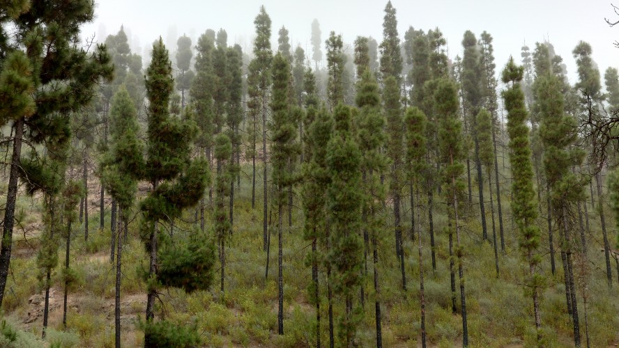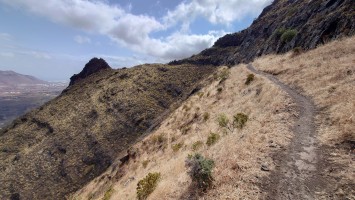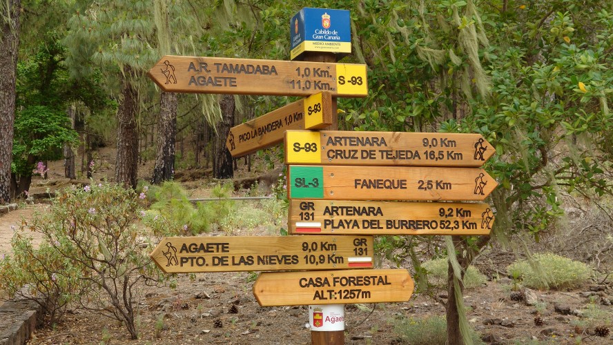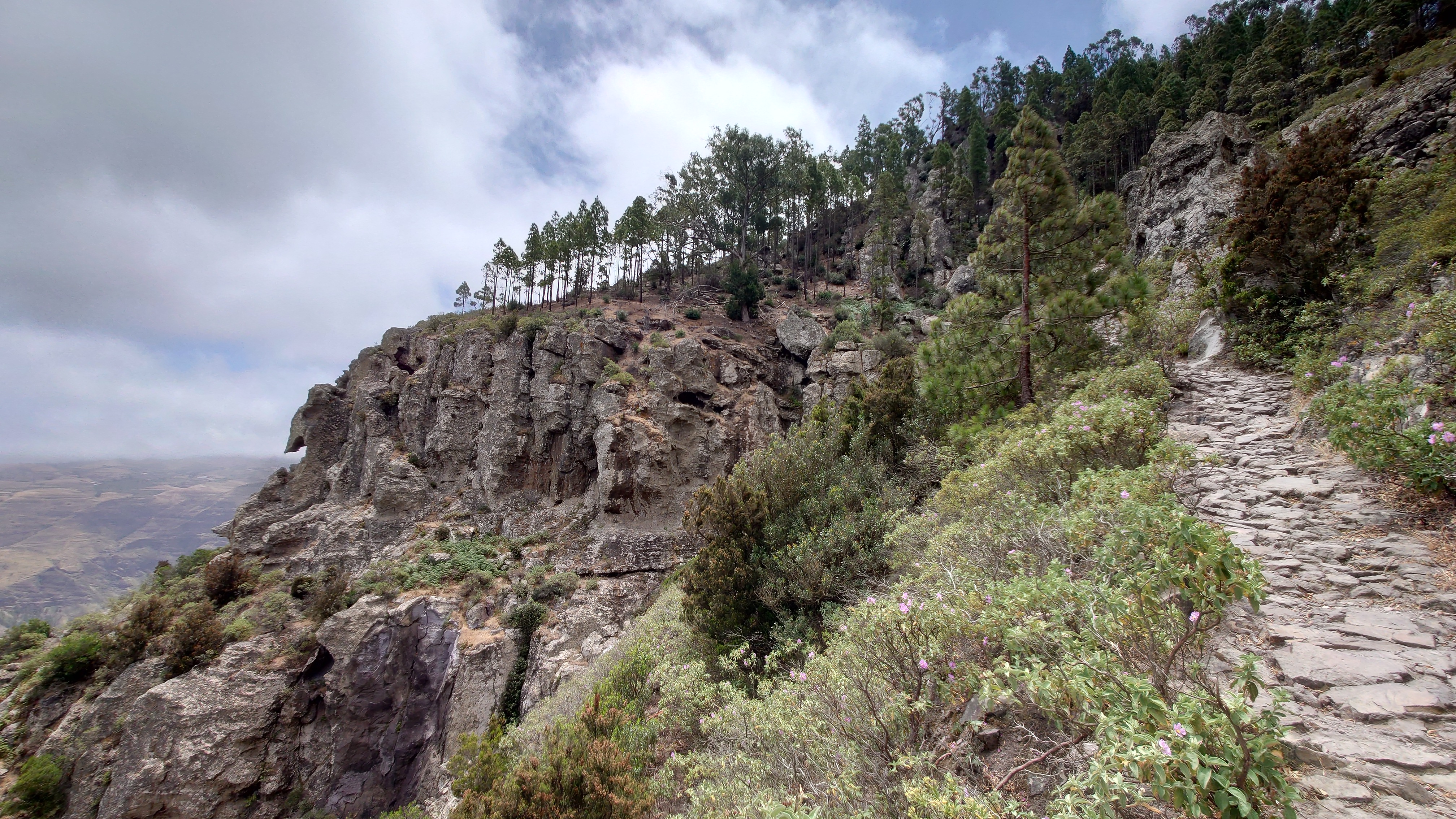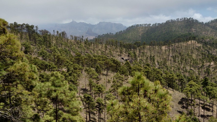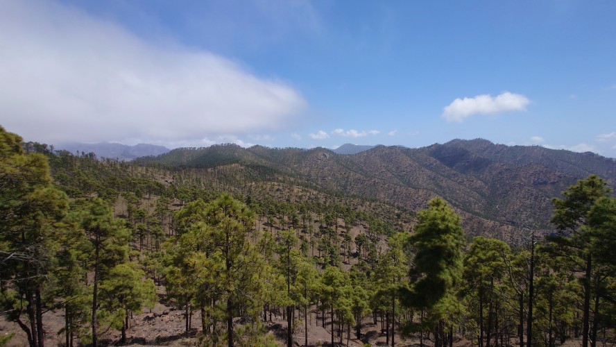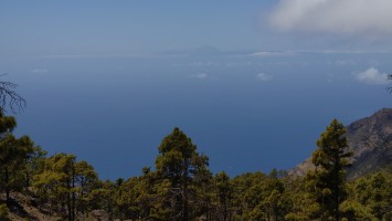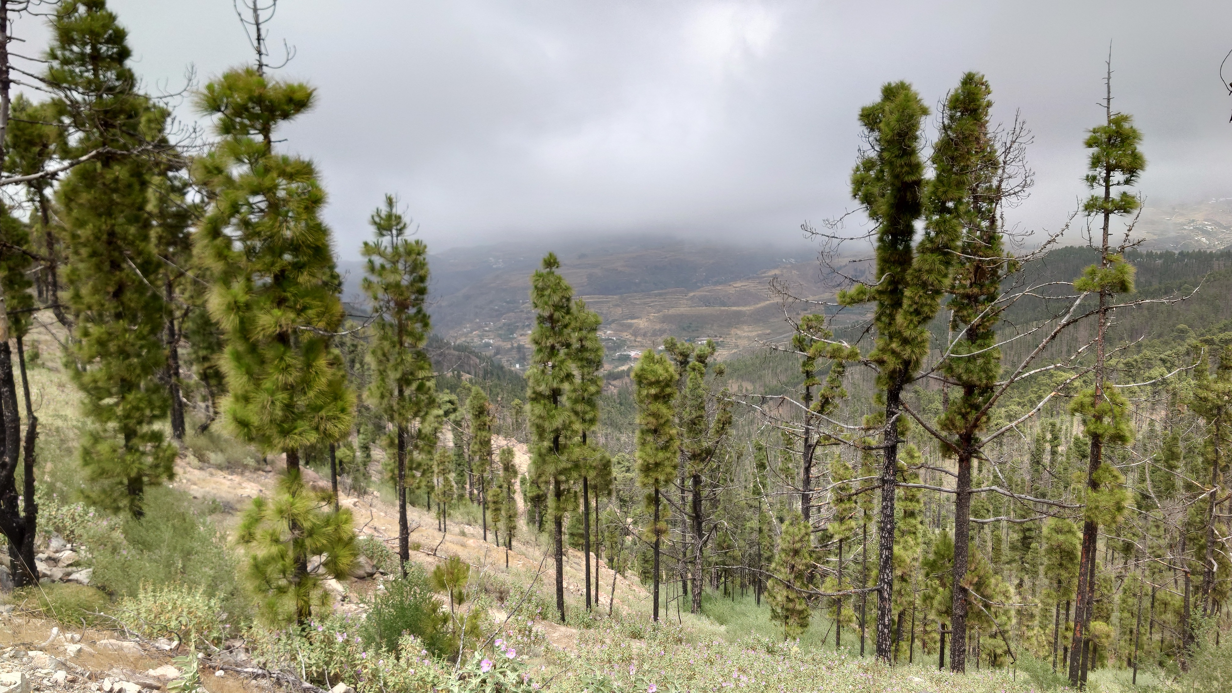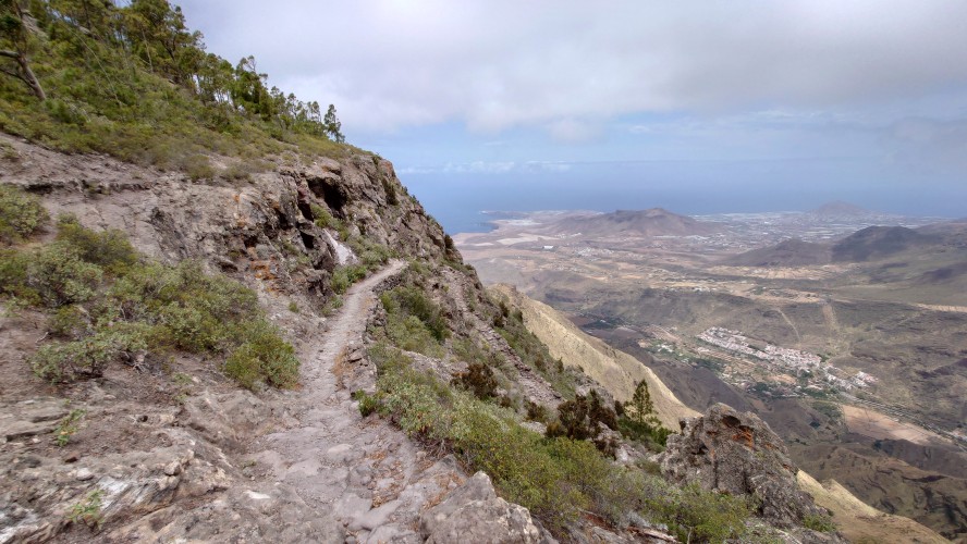 Ich lasse den Ort hinter mir und steige direkt in die Natur ein. Von Weitem sieht man den Abbruch, auf dem die Baumgrenze ist. Ganz im umgekehrten Sinne wie in den Alpen: Auf 1000 Höhenmetern fangen hier die Bäume erst an zu gedeihen. im Tiefland an der Küste hält die Wolken nichts auf. Und ich komme verdammt schnell voran. von wegen Herausforderung an Höhenmetern. Es ist schon krass, wie sehr eine schöne Landschaft der Kondition zuträglich wird. Der Weg ist wunderschön und einsam. Ein paar Ziegen mit Glöckchen hängen an den Hängen ab. Sonst begegnet mir keiner und ich verstaue meine Kleidung wieder im Rucksack. Mag sein, dass das neue Netzhemd praktisch ist. Aber Kleidung stört dann doch eher hier oben. Auch die Wolken halten sich an die Vorhersage. Die Landschaft wechselt im Zeitraffer: unten Wüste, dann Kakteenhaine, dann Wiesen, dann Farne und Blumen, dann Sträucher und schließlich die geliebten Kiefern, als ich nach etwas mehr als 2 Stunden den Gebirgskamm auf 1200 Metern Höhe erreiche. Es ist windig und kalt geworden. Wolken preschen durch mich hindurch und hinterlassen Tröpfen in den Haaren. Und ich habe keinen Durst. Ich setze mich an der Abbruchkante auf einen kurios gewachsenen Eukalyptusbraum und mache ausgiebig Pause. Am Horizon geben die Wolken den Blick auf eine Himmelspyramide frei. Komische Wettererscheinung, denke ich. Als die Pyramide bei den zurückweichenden Wolken immer mehr Konturen annimmt, erkenne ich, dass es der Teide ist. Er ist ziemlich genau 100 Kilometer entfernt, sagt die Landkarte.