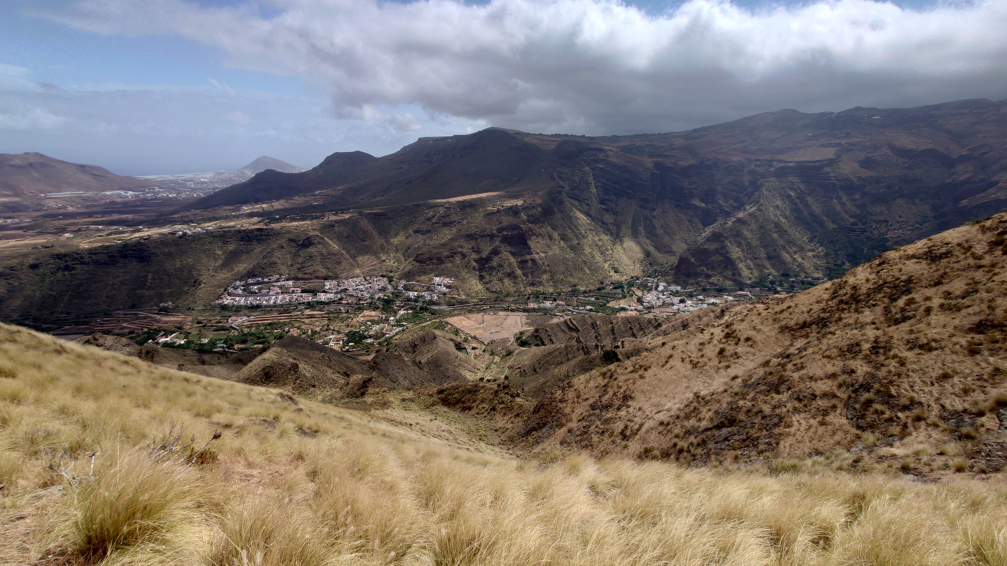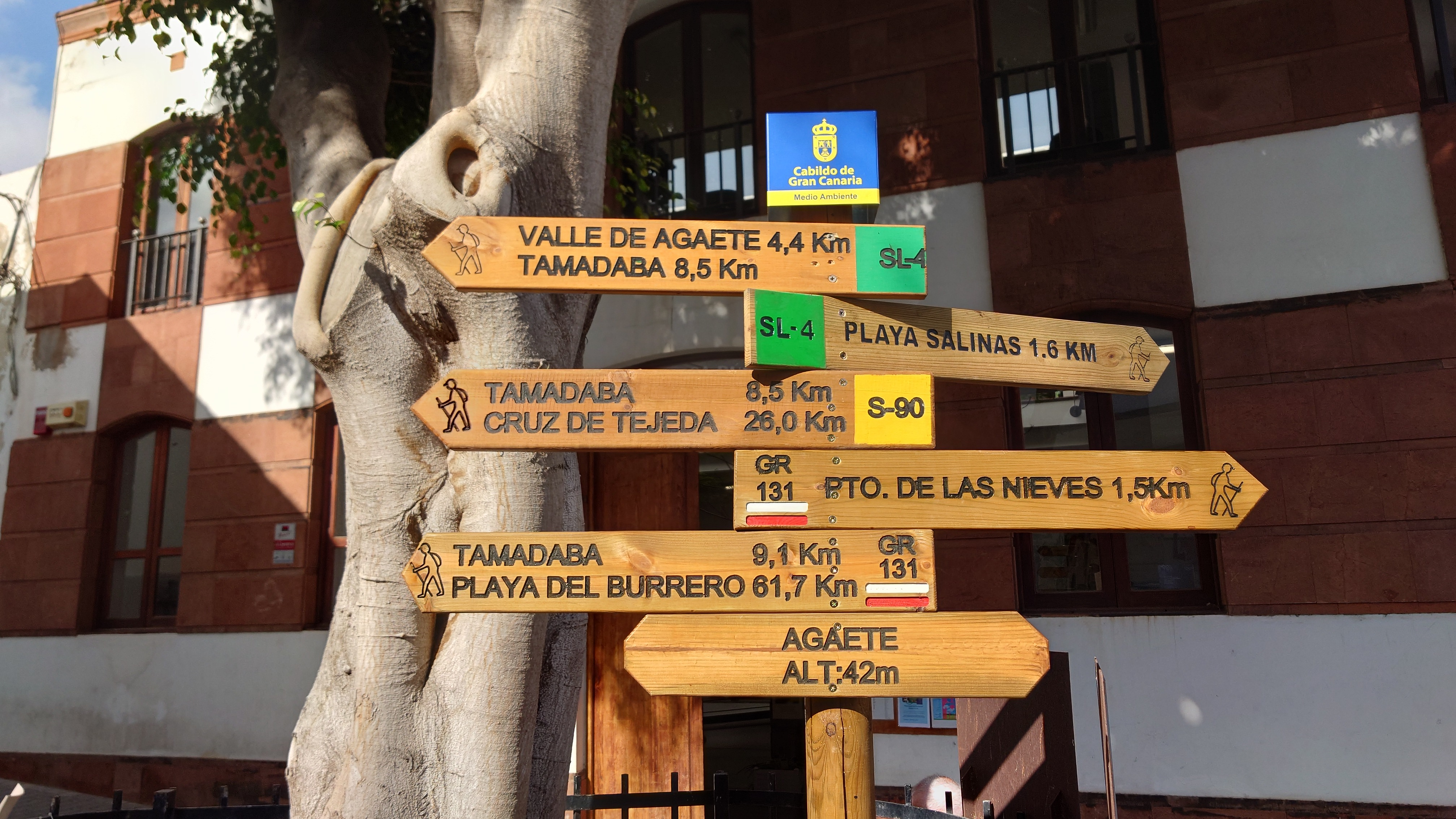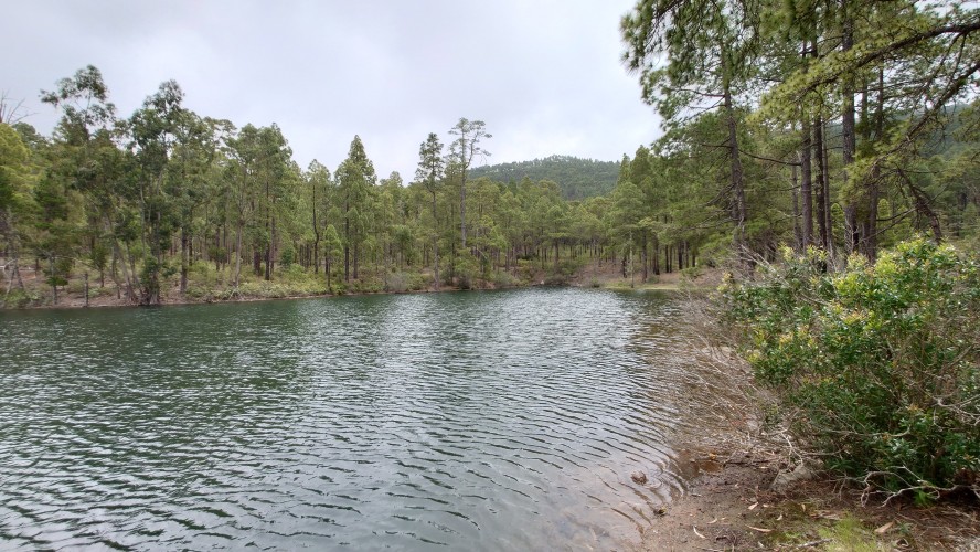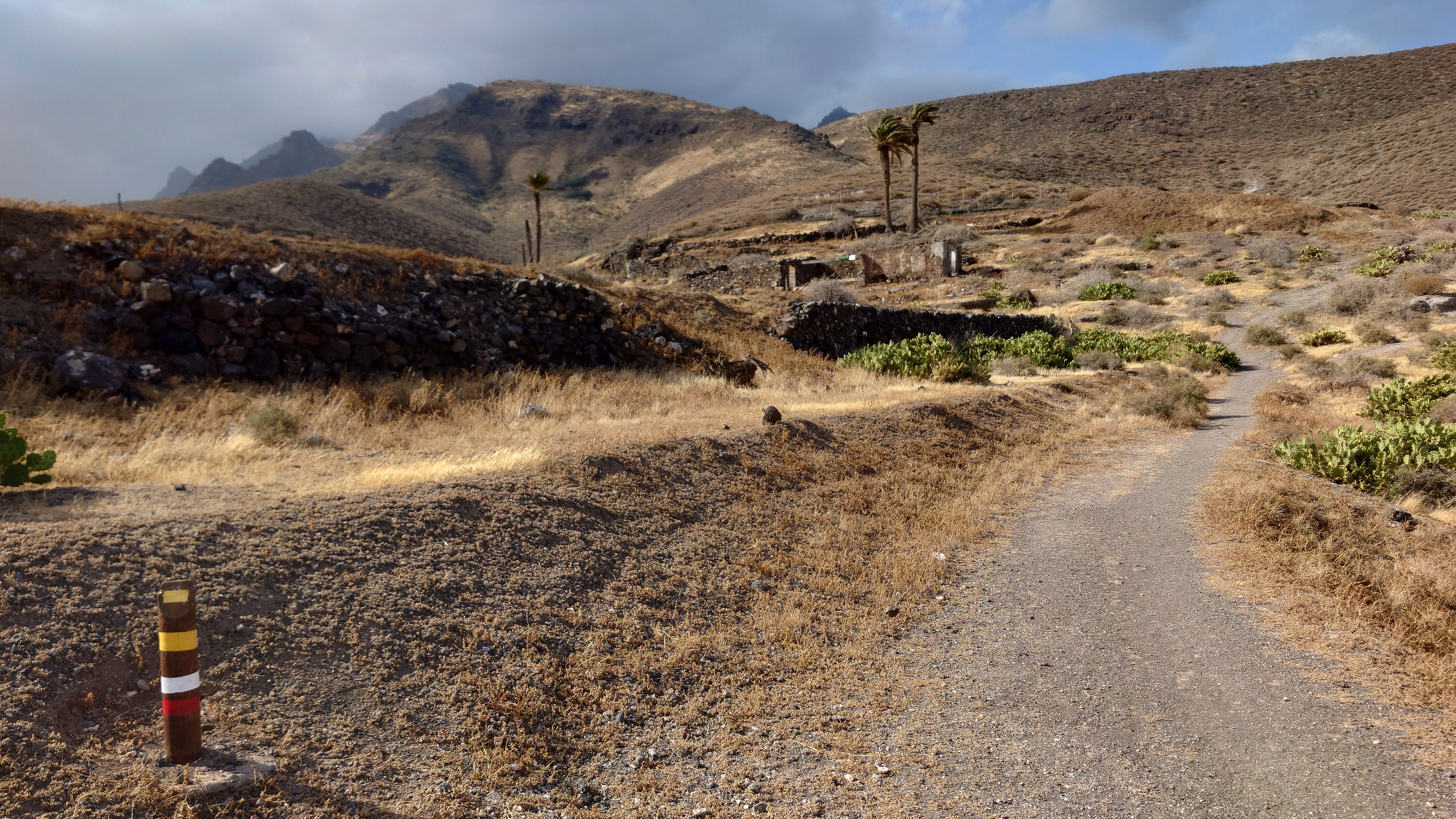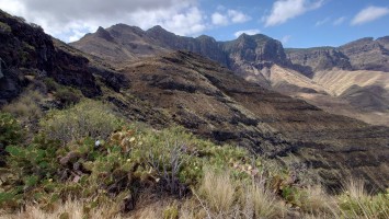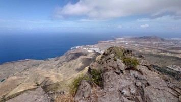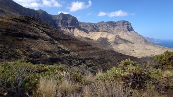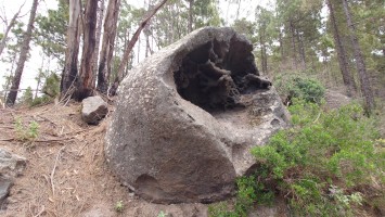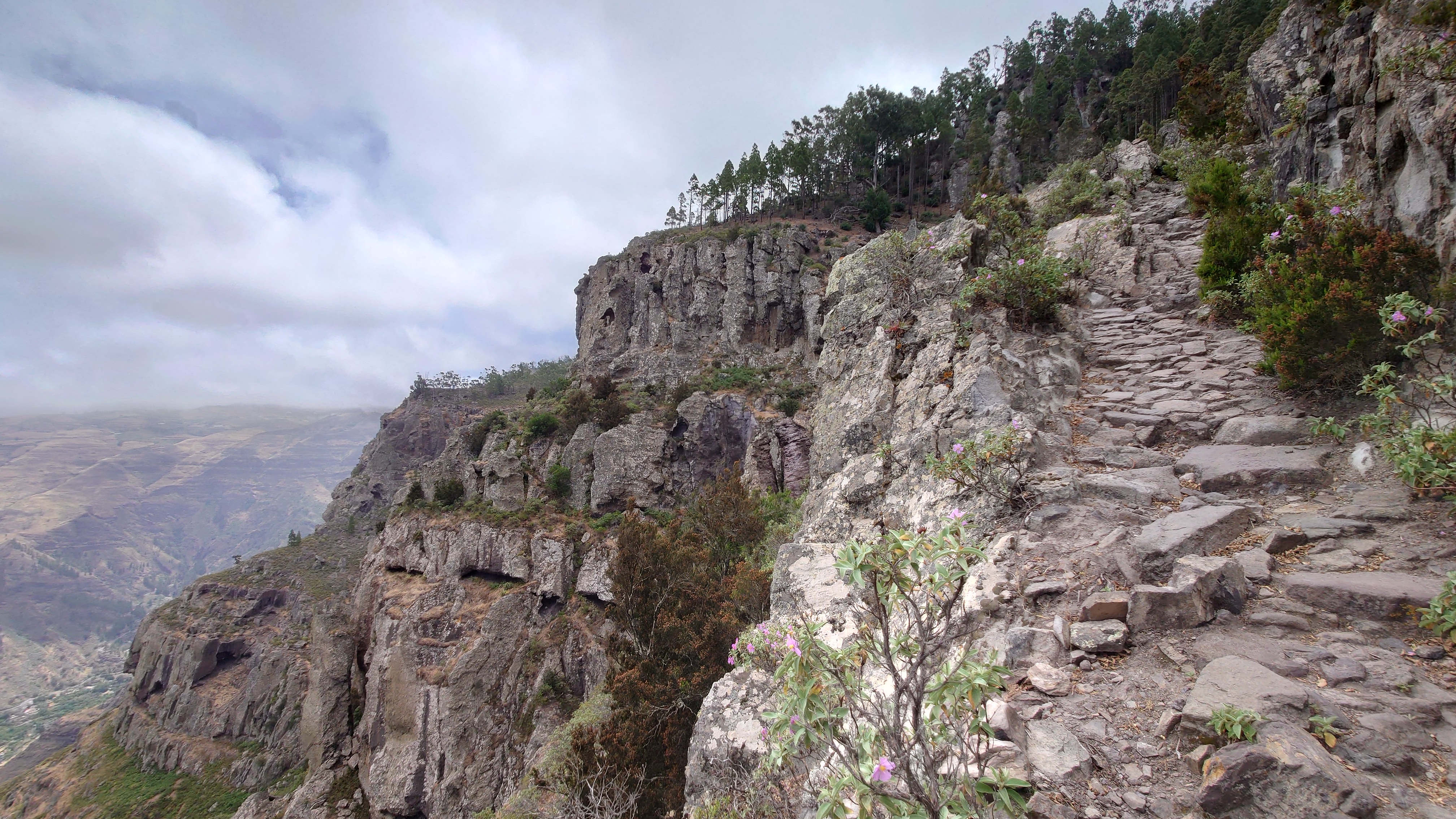 Ich lasse den Ort hinter mir und steige direkt in die Natur ein. Von Weitem sieht man den Abbruch, auf dem die Baumgrenze ist. Ganz im umgekehrten Sinne wie in den Alpen: Auf 1000 Höhenmetern fangen hier die Bäume erst an zu gedeihen. im Tiefland an der Küste hält die Wolken nichts auf. Und ich komme verdammt schnell voran. von wegen Herausforderung an Höhenmetern. Es ist schon krass, wie sehr eine schöne Landschaft der Kondition zuträglich wird. Der Weg ist wunderschön und einsam. Ein paar Ziegen mit Glöckchen hängen an den Hängen ab. Sonst begegnet mir keiner und ich verstaue meine Kleidung wieder im Rucksack. Mag sein, dass das neue Netzhemd praktisch ist. Aber Kleidung stört dann doch eher hier oben. Auch die Wolken halten sich an die Vorhersage. Die Landschaft wechselt im Zeitraffer: unten Wüste, dann Kakteenhaine, dann Wiesen, dann Farne und Blumen, dann Sträucher und schließlich die geliebten Kiefern, als ich nach etwas mehr als 2 Stunden den Gebirgskamm auf 1200 Metern Höhe erreiche. Es ist windig und kalt geworden. Wolken preschen durch mich hindurch und hinterlassen Tröpfen in den Haaren. Und ich habe keinen Durst. Ich setze mich an der Abbruchkante auf einen kurios gewachsenen Eukalyptusbraum und mache ausgiebig Pause. Am Horizon geben die Wolken den Blick auf eine Himmelspyramide frei. Komische Wettererscheinung, denke ich. Als die Pyramide bei den zurückweichenden Wolken immer mehr Konturen annimmt, erkenne ich, dass es der Teide ist. Er ist ziemlich genau 100 Kilometer entfernt, sagt die Landkarte.