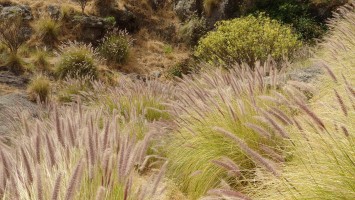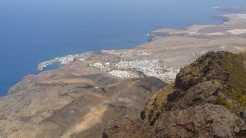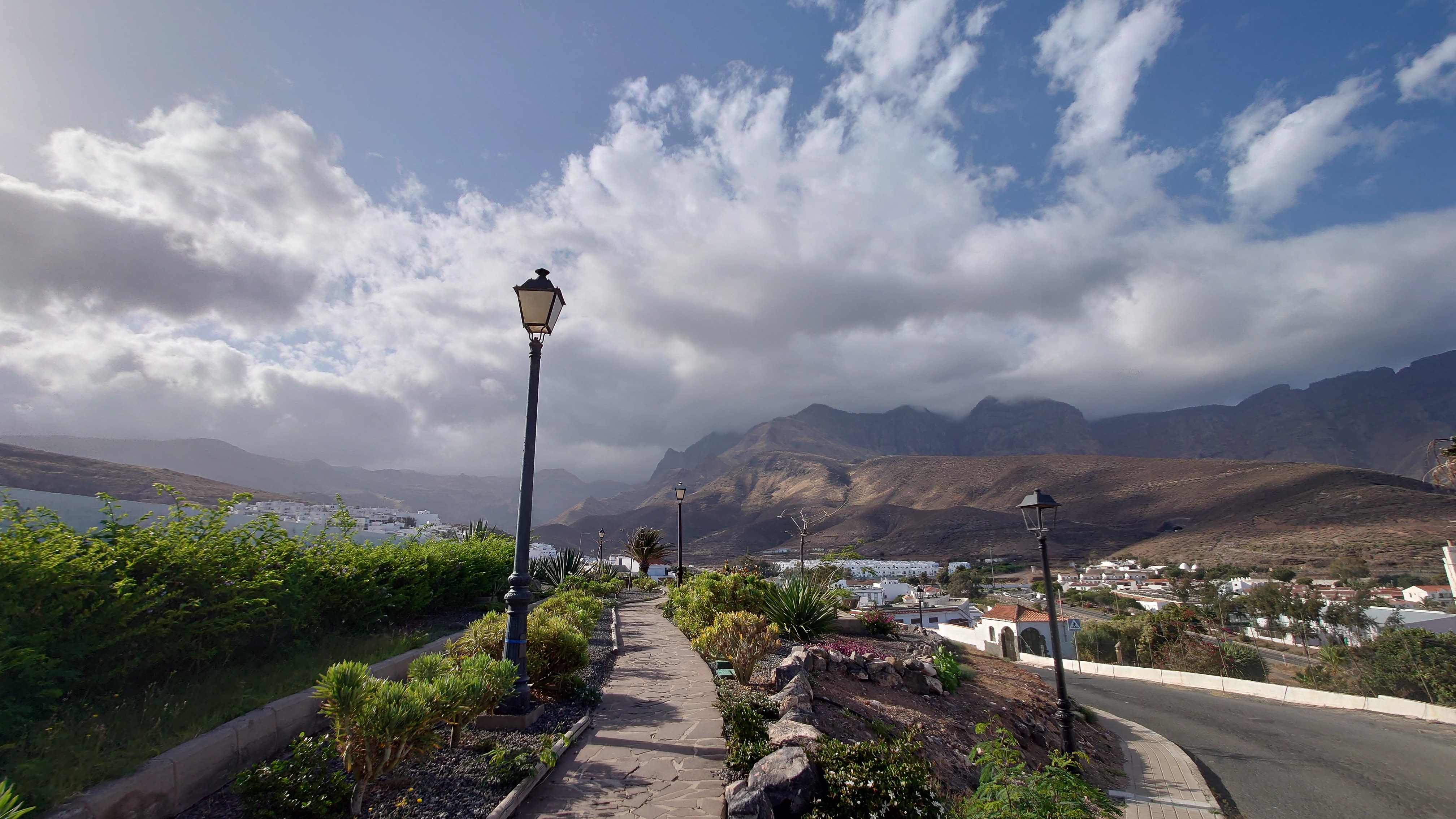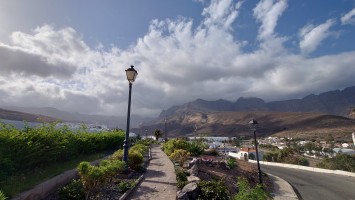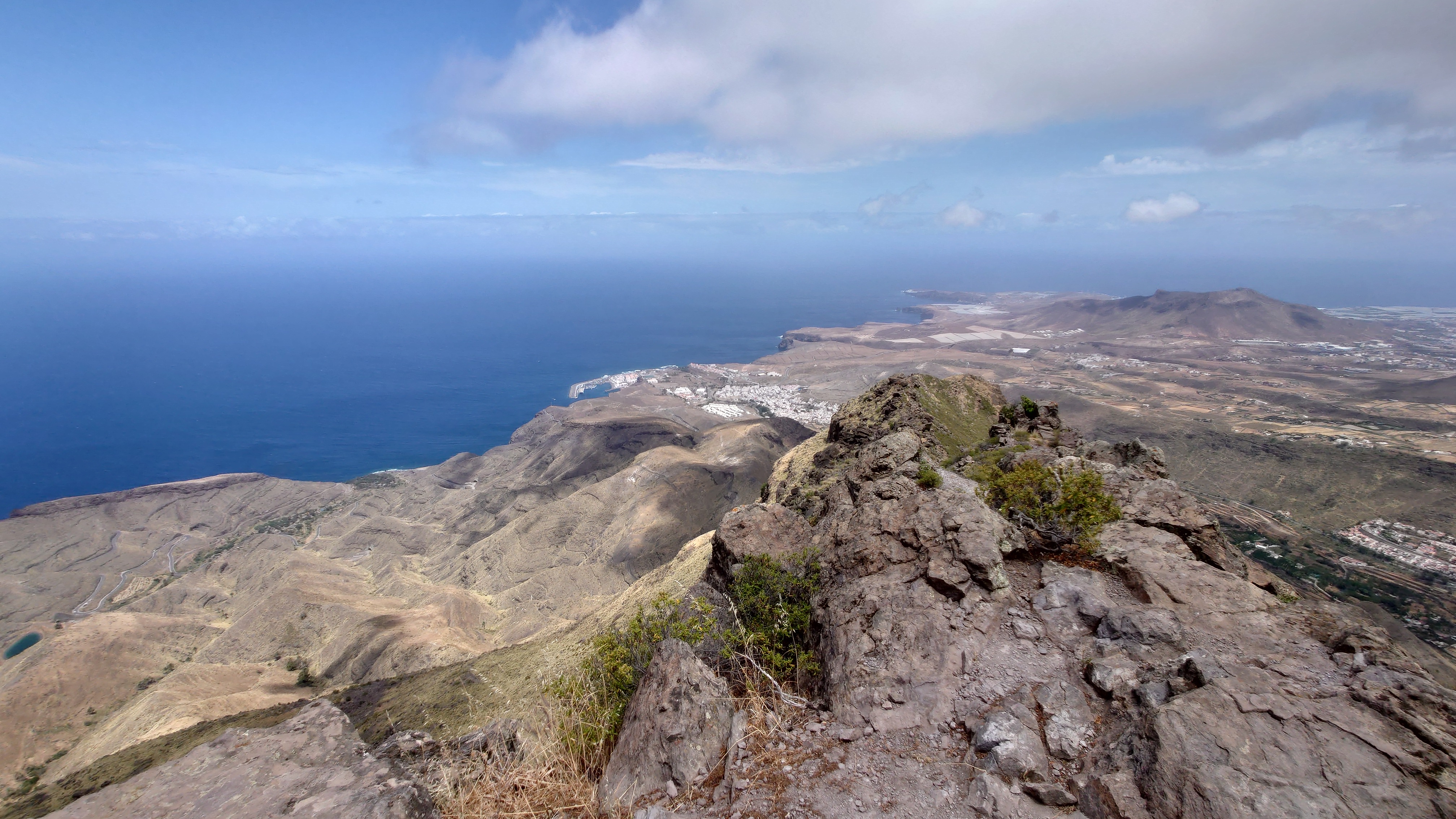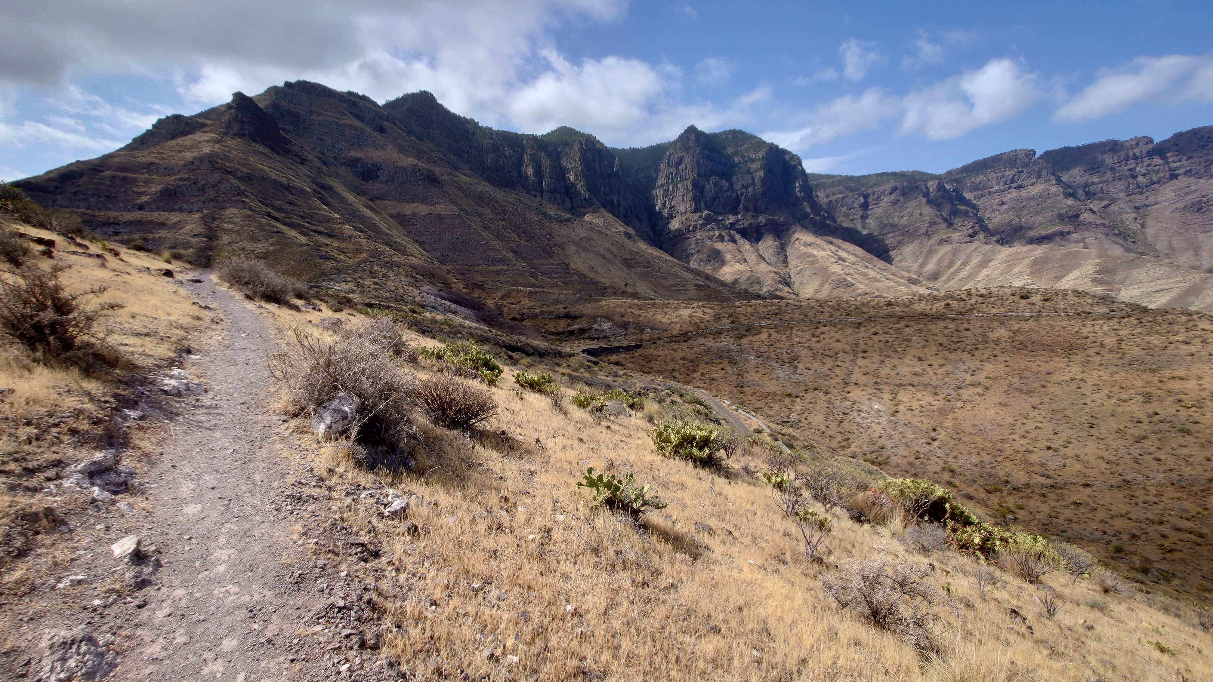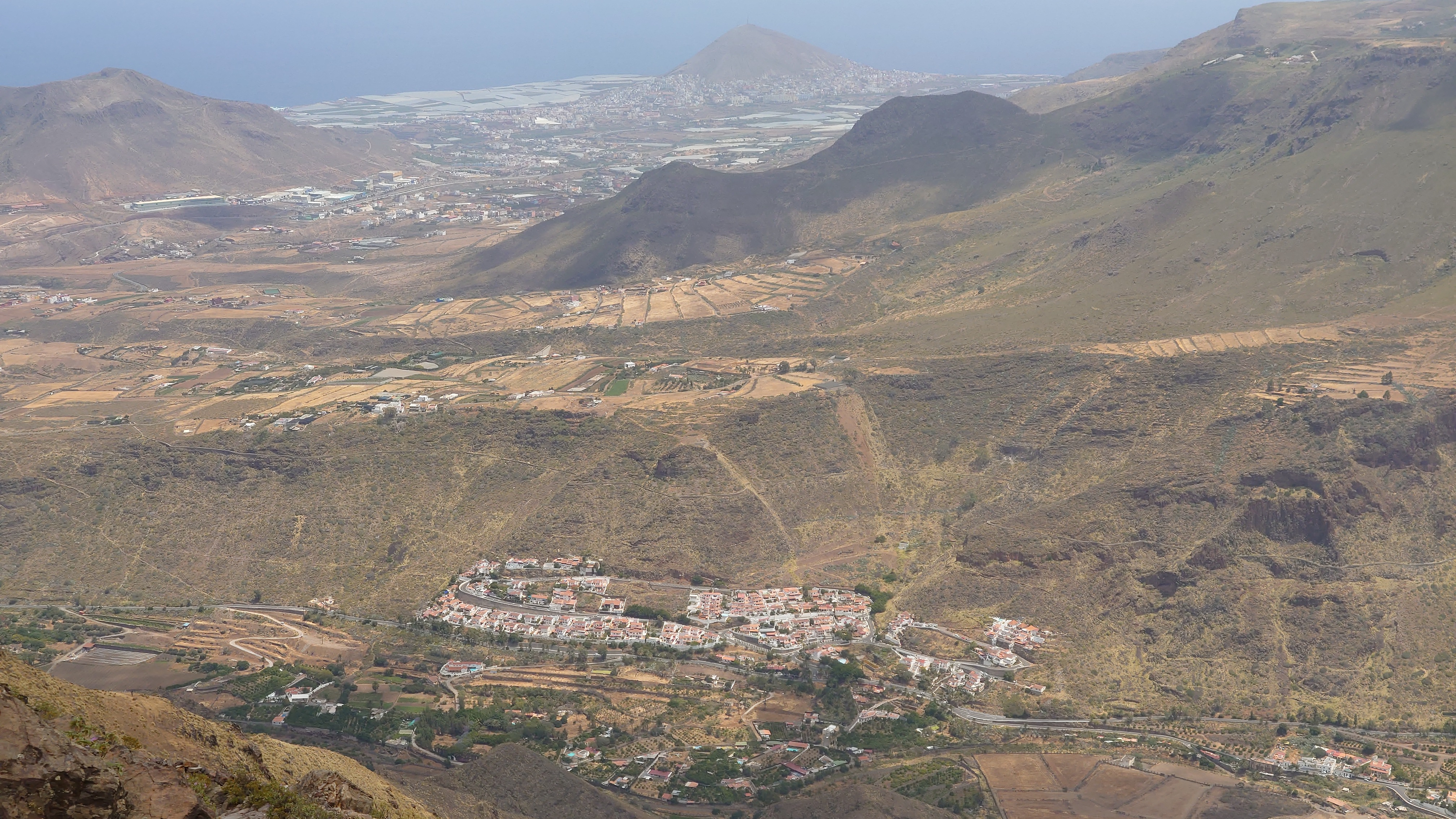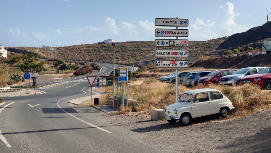 Ich lasse den Ort hinter mir und steige direkt in die Natur ein. Von Weitem sieht man den Abbruch, auf dem die Baumgrenze ist. Ganz im umgekehrten Sinne wie in den Alpen: Auf 1000 Höhenmetern fangen hier die Bäume erst an zu gedeihen. im Tiefland an der Küste hält die Wolken nichts auf. Und ich komme verdammt schnell voran. von wegen Herausforderung an Höhenmetern. Es ist schon krass, wie sehr eine schöne Landschaft der Kondition zuträglich wird. Der Weg ist wunderschön und einsam. Ein paar Ziegen mit Glöckchen hängen an den Hängen ab. Sonst begegnet mir keiner und ich verstaue meine Kleidung wieder im Rucksack. Mag sein, dass das neue Netzhemd praktisch ist. Aber Kleidung stört dann doch eher hier oben. Auch die Wolken halten sich an die Vorhersage. Die Landschaft wechselt im Zeitraffer: unten Wüste, dann Kakteenhaine, dann Wiesen, dann Farne und Blumen, dann Sträucher und schließlich die geliebten Kiefern, als ich nach etwas mehr als 2 Stunden den Gebirgskamm auf 1200 Metern Höhe erreiche. Es ist windig und kalt geworden. Wolken preschen durch mich hindurch und hinterlassen Tröpfen in den Haaren. Und ich habe keinen Durst. Ich setze mich an der Abbruchkante auf einen kurios gewachsenen Eukalyptusbraum und mache ausgiebig Pause. Am Horizon geben die Wolken den Blick auf eine Himmelspyramide frei. Komische Wettererscheinung, denke ich. Als die Pyramide bei den zurückweichenden Wolken immer mehr Konturen annimmt, erkenne ich, dass es der Teide ist. Er ist ziemlich genau 100 Kilometer entfernt, sagt die Landkarte.