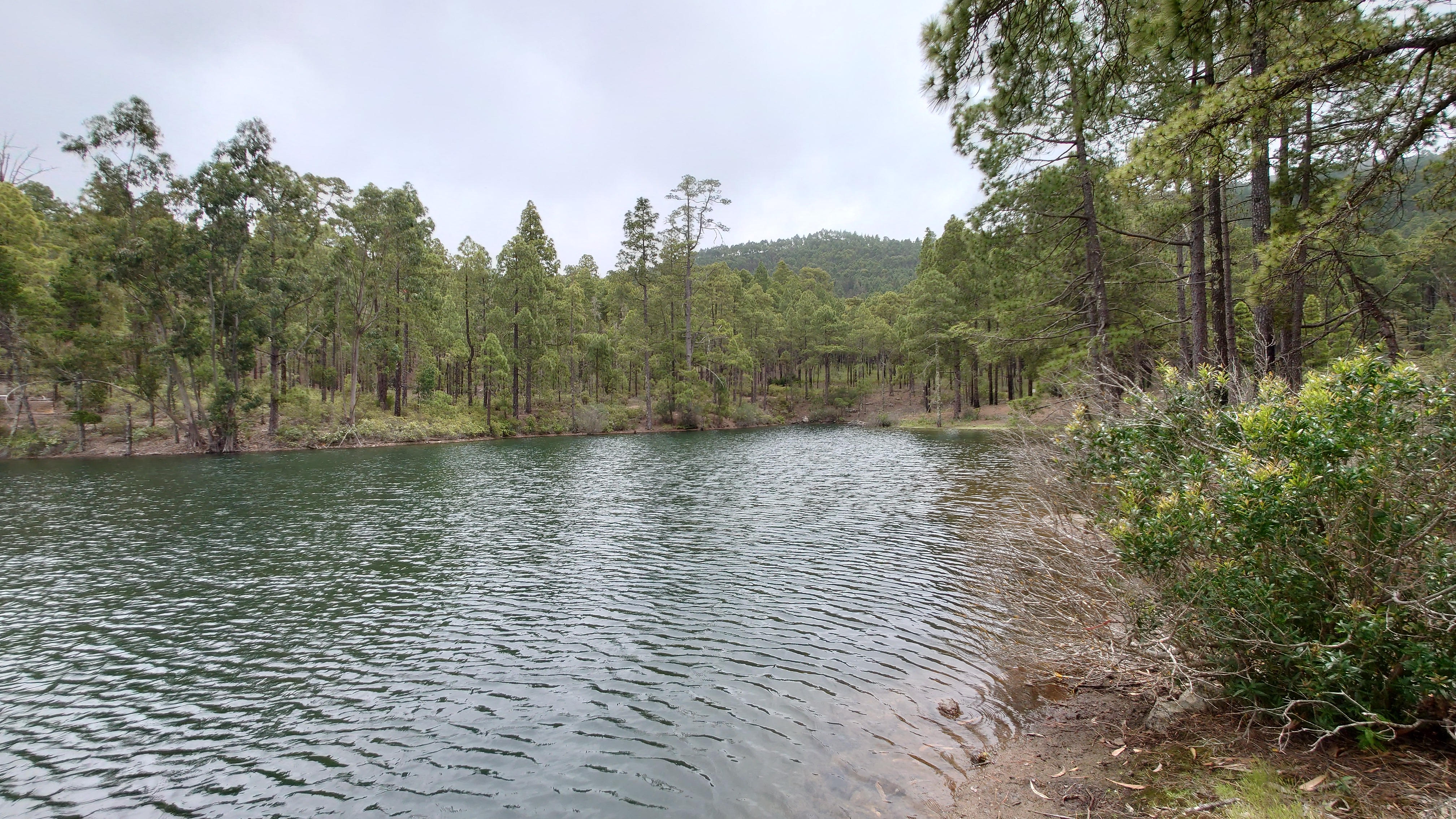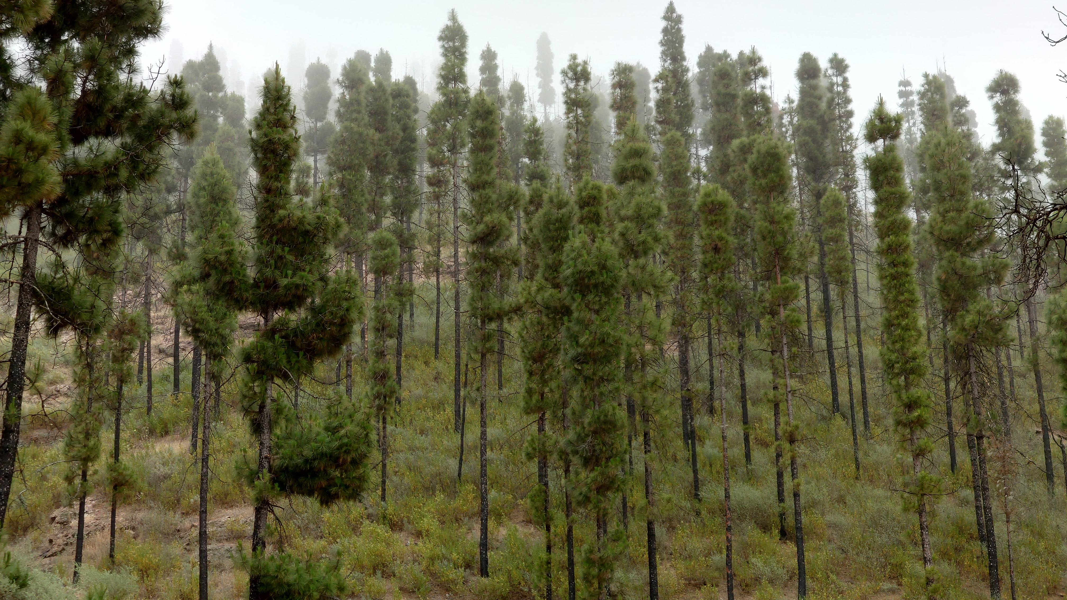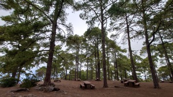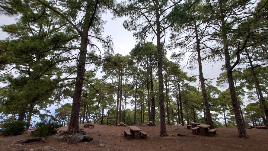 Ich komme schließlich an einem dieser Ausflugsziele im Wald heraus mit Bänken, Grills und Wasserbrunnen. Und jetzt ist auch in Spanien Corona vorbei. Sie geben wieder Wasser frei. Niemand hier. Hmm... wahrscheinlich nur am Wochenende. Touristenzeit ist auch nicht und Hotelbesucher der Küste verirren sich nicht an solche Orte. Eine Gebirgsstraße beginnt hier, der ich folgen will und ich ziehe mich wieder an. Schon aus dem Grund, dass es auf einmal empfindlich kalt wird. Eine weitere Wolkenfront ist nach einer kurzen Sonnenphase vor die Gebirgswand geknallt, wuchtet ihren wassergefüllten Bauch über den Kamm und verliert dabei einiges an Gewicht. Es regnet irgendwie. Die Kiefern fangen die kleinen Tröpfchen auf, um daraus große Tropfen zu machen und zu Boden platschen zu lassen. Die Straße führt über Kiefern bewachsene Hügel. Erstaunlich weit auseinander stehen die hier aber. Und sie sind so dünn. Nach einiger Zeit verstehe ich auch warum: vor nicht allzu langer Zeit muss hier oben ein Waldbrand gewütet haben, dsr alle Bäume in Mitleidenschaft zog. Die einen sind verbannt, die anderen haben das Massaker als nackter Pin überlebt, dem sämtliche Zweige weggebrannt sind. Jetzt haben sich neue Zweige gebildet und geben den Bäumen die Anmut von Ohrenwattestäbchen. Auf dem Boden sprießt alles, was vorher kein Sonnenlicht abbekam und macht dem Wand Konkurrenz. Auch die Straße muss viel abbekommen haben. Sie ist brandneu. Immer wieder gucken Hydranten bei Parkplatzeinbuchtungen aus dem Boden. Man hat wohl vorgesorgt für die nächste Katastrophe. Ein Blick ins Internet verrät mir, dass besagter Waldbrand 2019 stattfand. 9000 Leute mussten aus 50 Orten evakuiert werden.