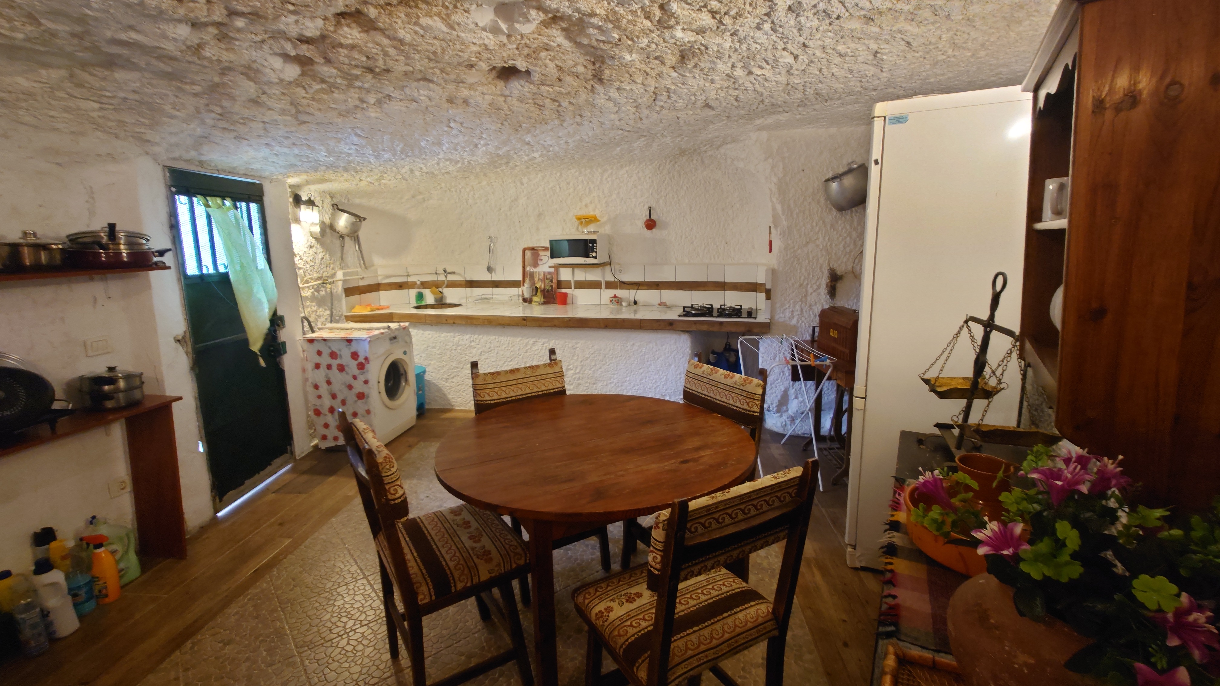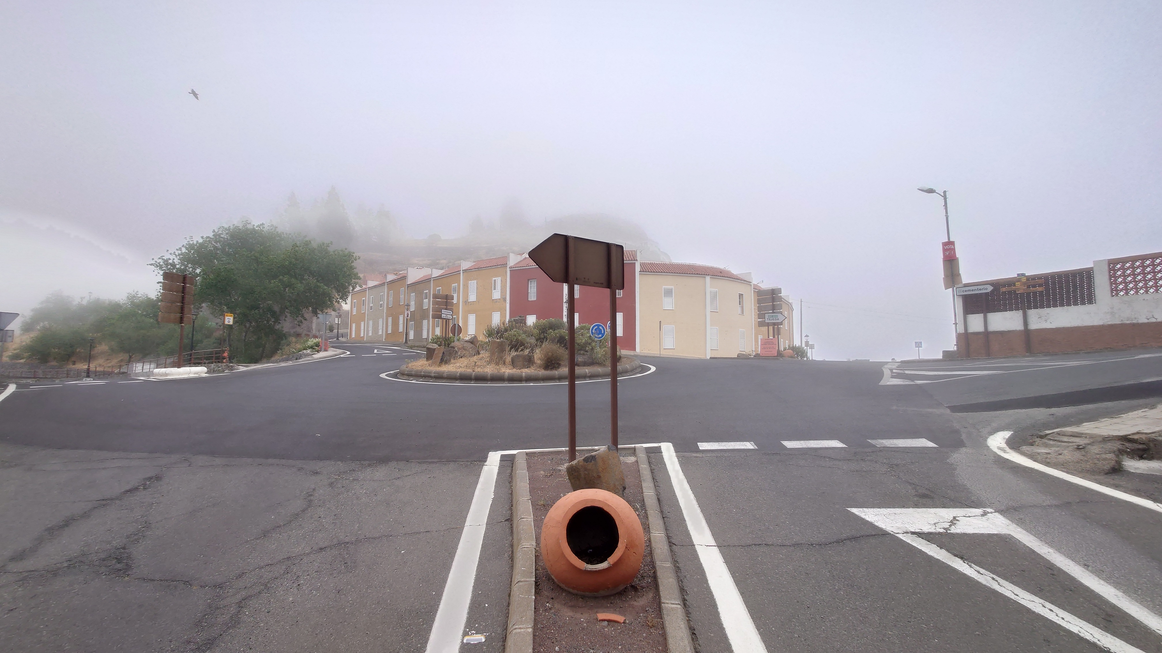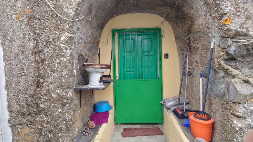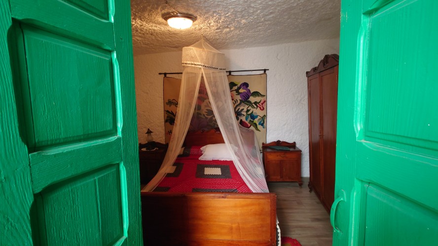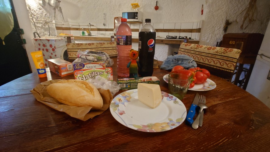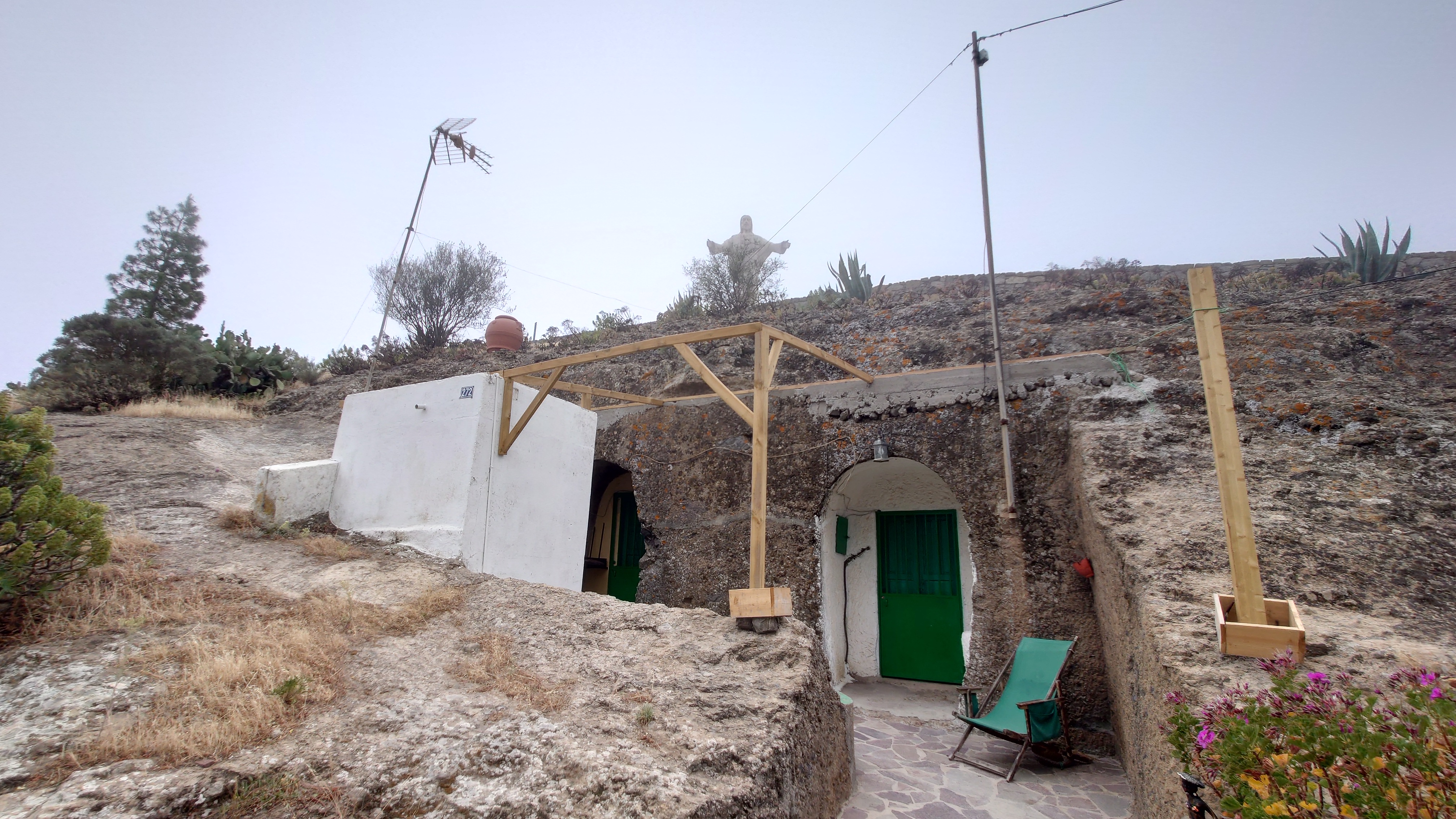 Die Wolken verdichten sich zu einer undurchschaubaren Nebeldusche, bis ich gegen 18 Uhr Artenara erreiche. Hätte ich das Navi nicht, ich wüsste nicht, ob hier jetzt eine Ortschaft ist. Ne wahnsinns Aussicht soll man hier genießen dürfen. Hmm... naja, vielleicht morgen. Jetzt will ich mich vor allem aufwärmen. Auf so ein Wetter bin ich unzureichend eingestellt. Beim örtlichen Supermarkt decke ich mich ein. Ich will Tomaten, Thunfisch und Käse. Meine Unterkunft ist direkt unterhalb einer Christusstatue. Was das bedeutet sehe ich erst, als ich davor stehe: ich habe eine Höhle gebucht. Also wirklich ein in dem Stein gehauenes Hobbitloch. Innen ist die Zeit stehen geblieben. Die Möbel sind uralt. Wer hat hier wohl mal gelebt? Vielleicht war das ja auch ein Ziegenstall. Egal. Es hat ein Bett und einen Tisch, aber keine Fenster. Es weht einfach durch Türgitter. Ich schlafe also irgendwie halb draußen. Internet gibt's auch nicht. Also setze ich mich an den Tisch, höre Hörbuch dabei und gehe ins Himmelbett mit Moskitonetz. Scheint wohl notwendig zu sein. Ich habe heute genauso lange gebraucht für die 22 Kilometer wie gestern, knapp 8 Stunden. Den Beinen und Füßen geht es richtig gut, kein Vergleich zu gestern. Und das nach 1500 Höhenmetern. Anstrengung ist echt relativ, wenn's schön ist.