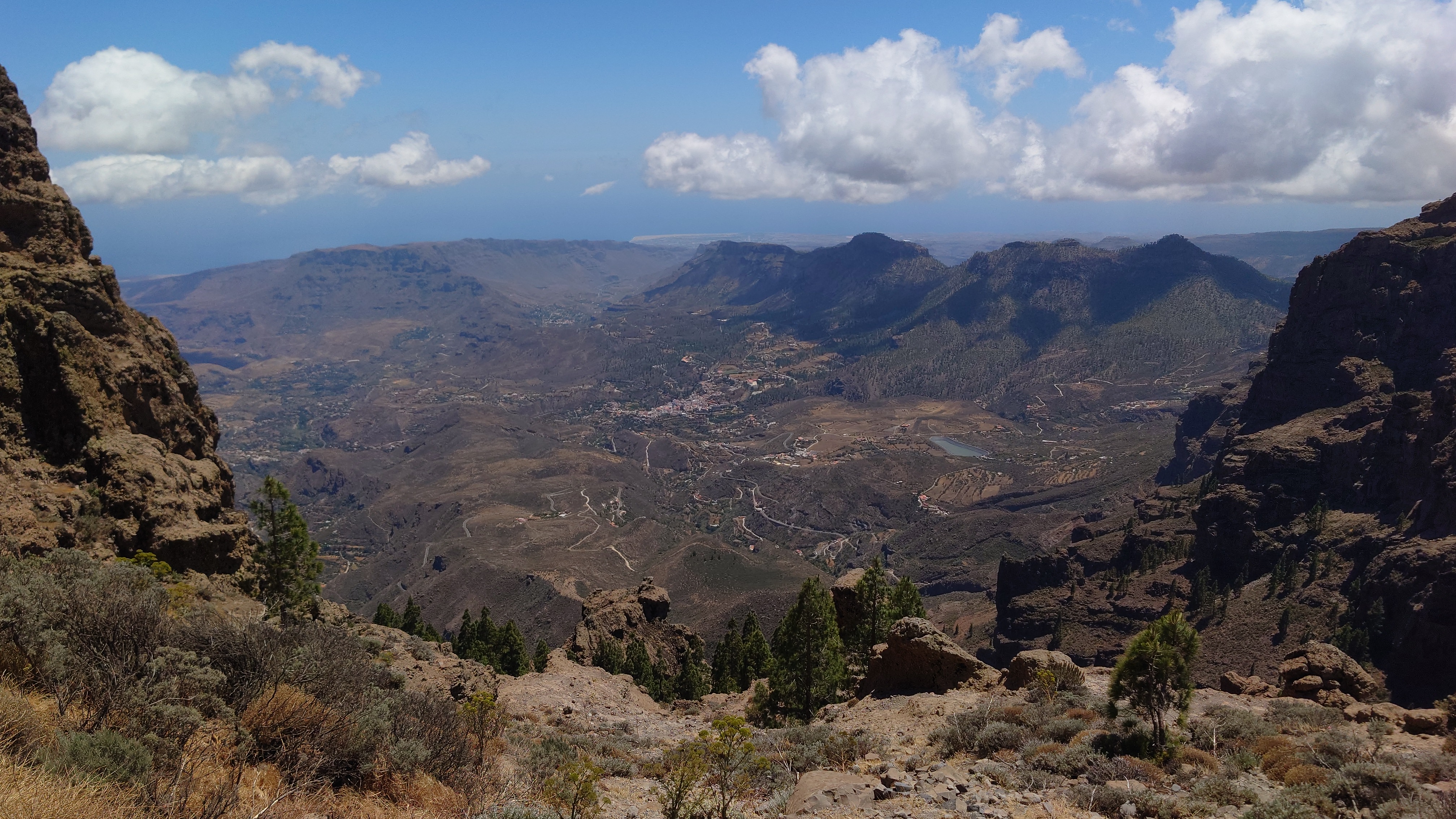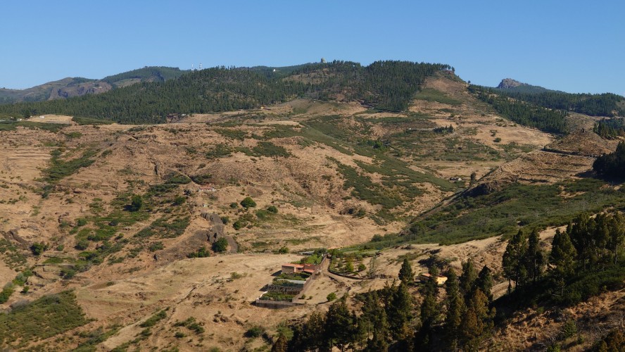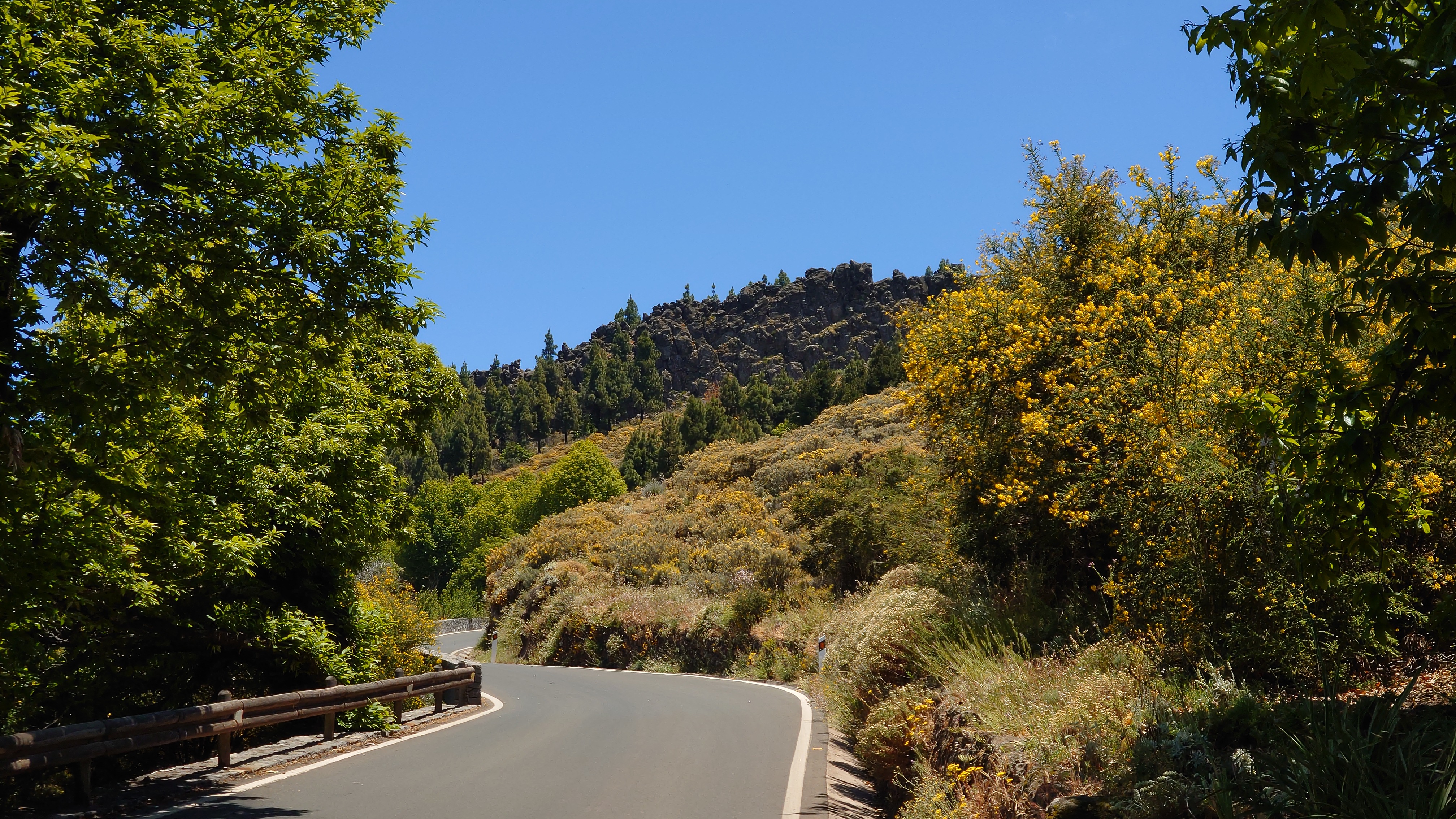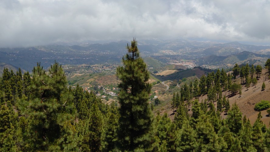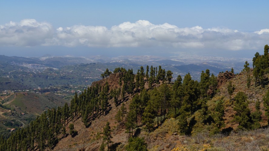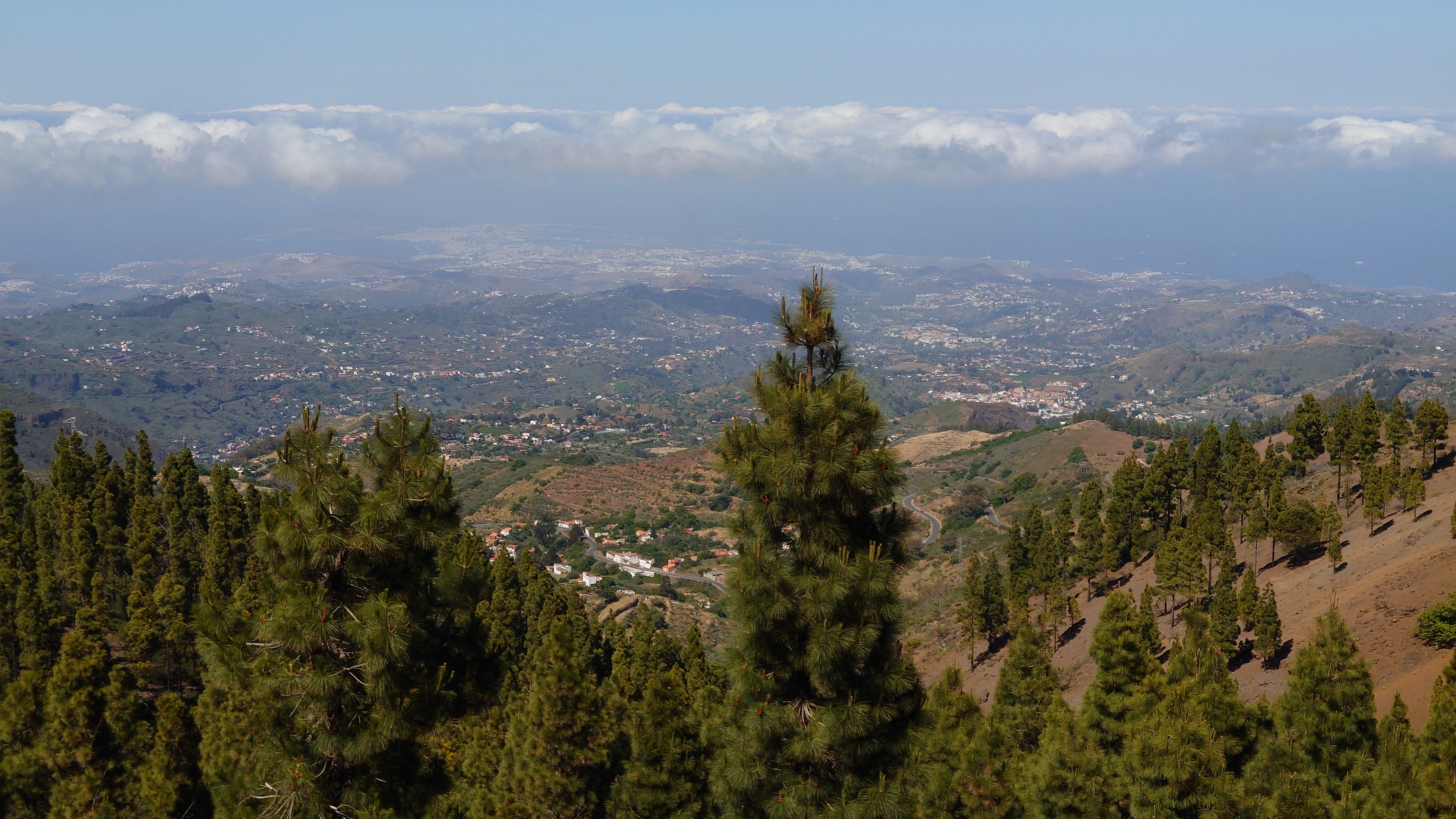 Hier fahren alle hin. Im 17. Jahrhundert hat man hier Schneespeicher angelegt, erfahre ich. Daher auch der Name. Aber ich erfahre auch, dass das NICHT der höchste Punkt ist. Das ist ein Zinken etwa 100 Meter weiter südlich, ist ganze 6 Meter höher und heißt Morrón de la Agujereada. So ein Pech, da hat sich der ganze Aufwand ja nicht gelohnt. Beteübt quatsche ich noch Leute an, mein Scheitern in Form eines Selbstbildnisses vor besagtem Zinken festzuhalten und schieße niedergeschlagen noch ein paar Fotos das Tal hinunter, das den Blick auf den weit entfernten Flughafen und Las Palmas freigibt. Ich kann meinen ganzen bisherigen Weg von hier oben nachsehen. Erstaunlich, so groß ist die Insel jetzt auch nicht. Und alles voller Wald. Eine Tafel verrät, das war nicht immer so. Seit den 50ern gibt es intensive Aufforstungsprogramme. Na das sollten sie mal auf Fuerteventura versuchen.