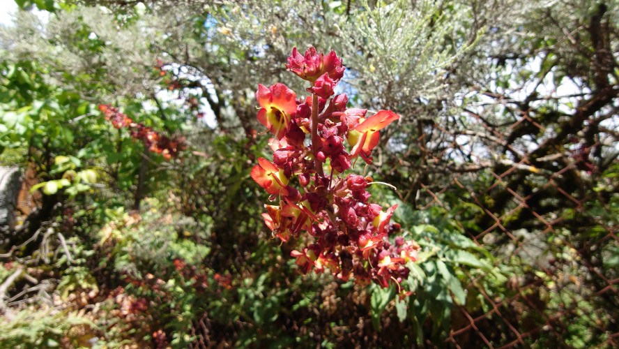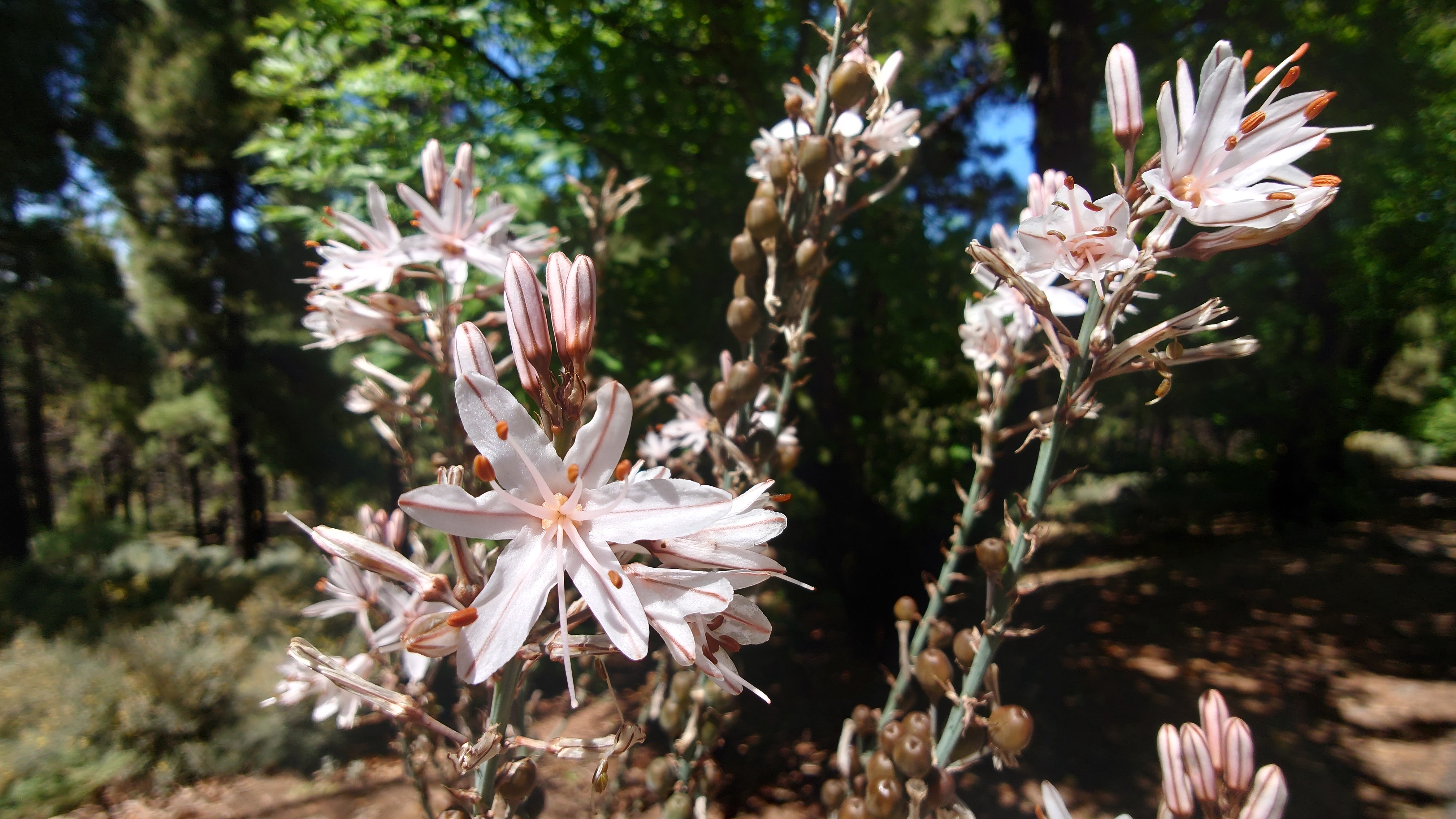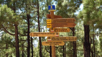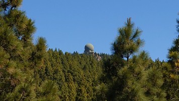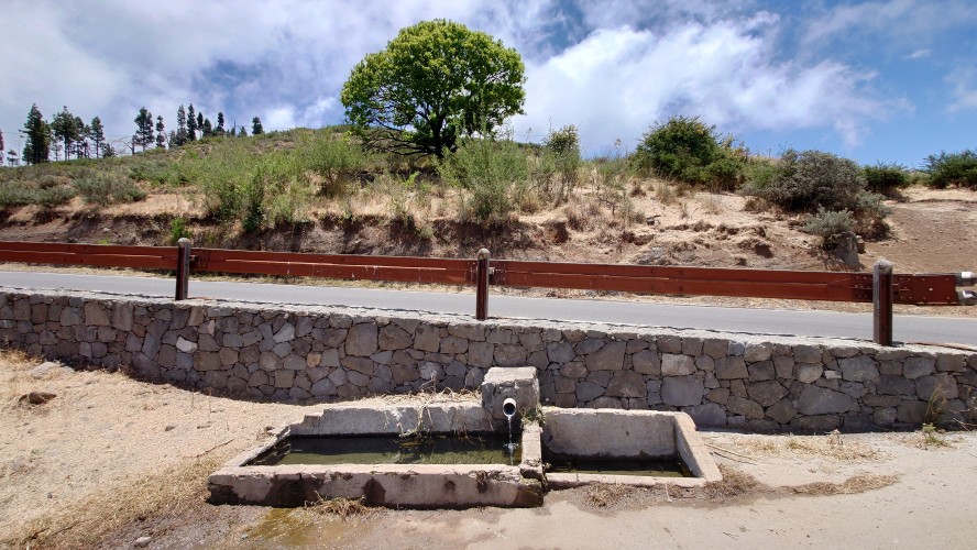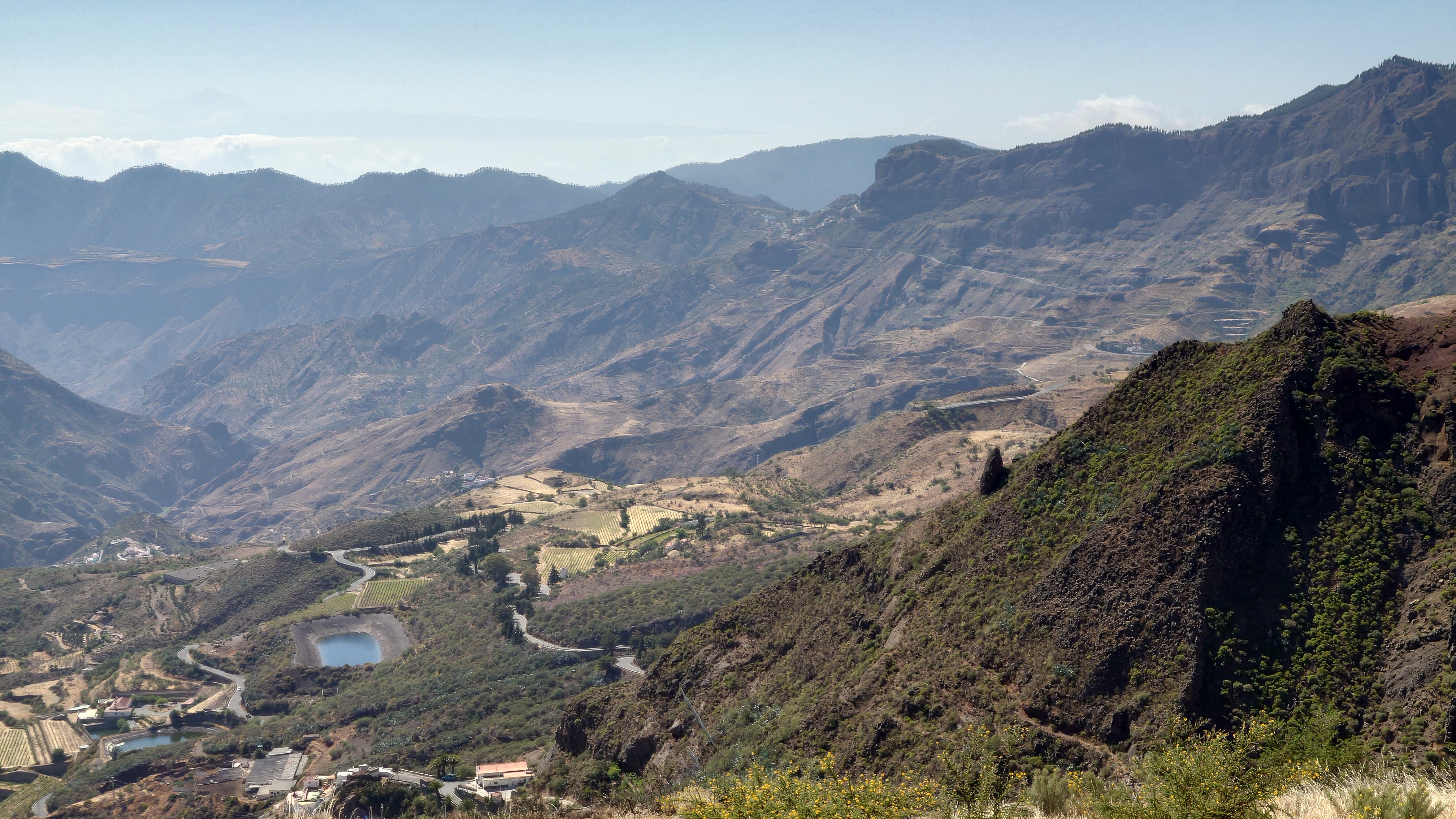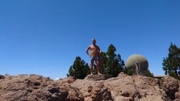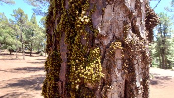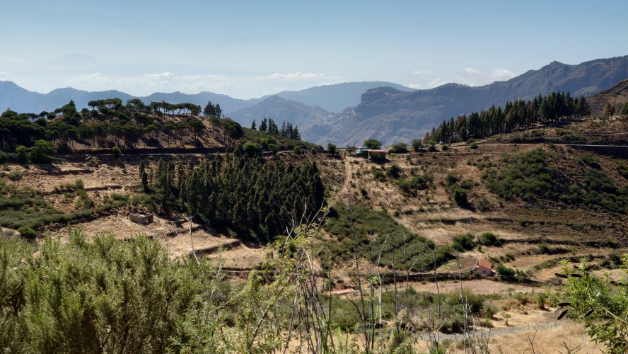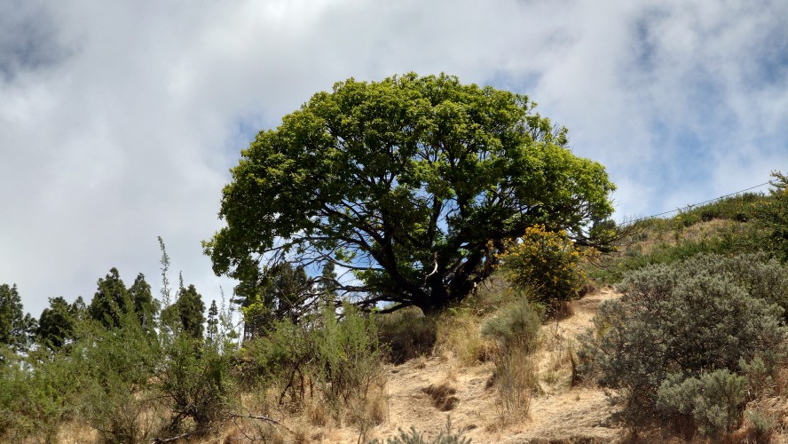 Hier fahren alle hin. Im 17. Jahrhundert hat man hier Schneespeicher angelegt, erfahre ich. Daher auch der Name. Aber ich erfahre auch, dass das NICHT der höchste Punkt ist. Das ist ein Zinken etwa 100 Meter weiter südlich, ist ganze 6 Meter höher und heißt Morrón de la Agujereada. So ein Pech, da hat sich der ganze Aufwand ja nicht gelohnt. Beteübt quatsche ich noch Leute an, mein Scheitern in Form eines Selbstbildnisses vor besagtem Zinken festzuhalten und schieße niedergeschlagen noch ein paar Fotos das Tal hinunter, das den Blick auf den weit entfernten Flughafen und Las Palmas freigibt. Ich kann meinen ganzen bisherigen Weg von hier oben nachsehen. Erstaunlich, so groß ist die Insel jetzt auch nicht. Und alles voller Wald. Eine Tafel verrät, das war nicht immer so. Seit den 50ern gibt es intensive Aufforstungsprogramme. Na das sollten sie mal auf Fuerteventura versuchen.