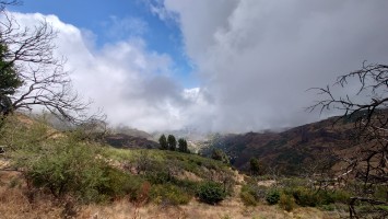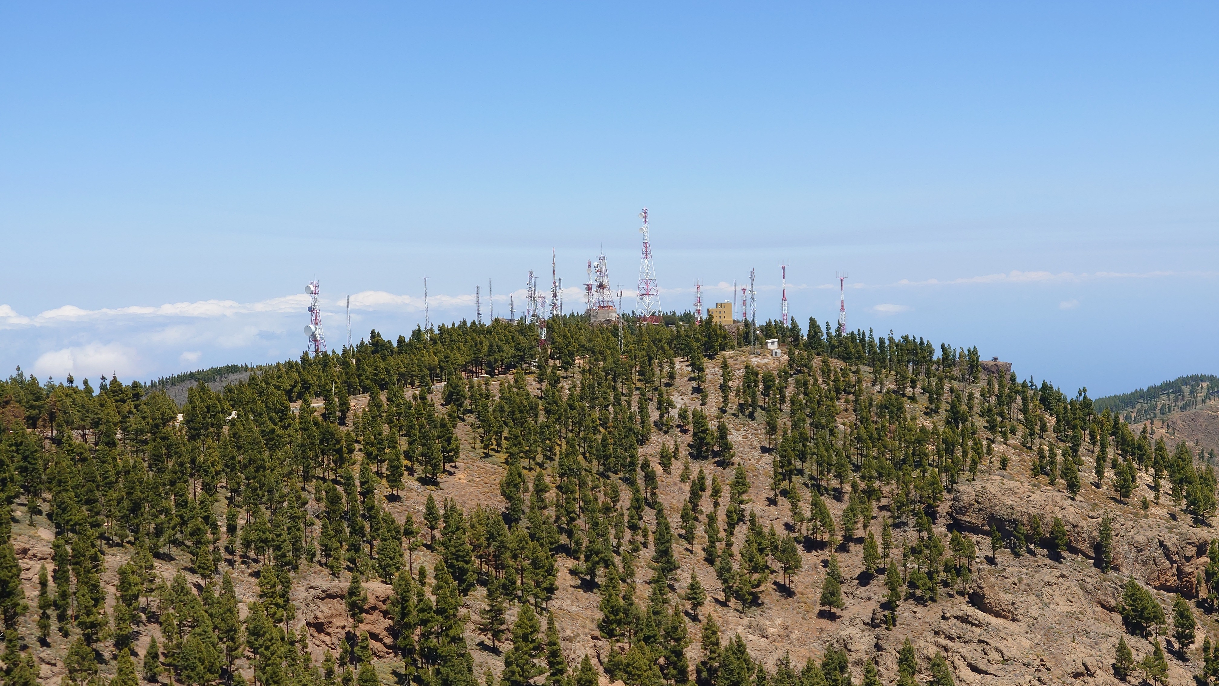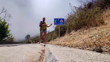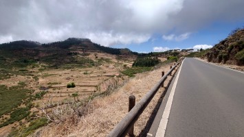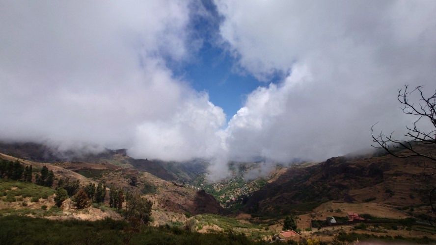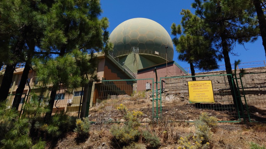 Ich wollte eigentlich heute zum höchsten Punkt Gran Canarias laufen. Sind nur 7,7 Kilometer bis dorthin. Bei der Feuchte brauche ich nichtmal Trinken mitnehmen. Ich trete vor die Tür... und mache auf dem Absatz kehrt. Nä. So nicht. Ohne Sonne wird nichts warm hier. Es sind deutlich unter 10 Grad. Also gehe ich aufs Zimmer und zeichne was, bis mein Balkonkino nen anderen Streifen fährt als das undurchdringliche Nichts der Unendlichen Geschichte. Eineinhalb Stunden später, es geht auf 13 Uhr zu. Ich vertraue meiner Intuition, dass die Wolken in Kürze verschwinden werden wie gestern wirkel alle Röcke zu einem Oberteil zusammen und gehe los in den Nieselregen, hinauf zum Pico de Las Nieves. Es lässt sich irgendwie aushalten und tatsächlich. Nicht mal 20 Minuten später brechen die Wolken mehr und mehr auf und die Temperatur steigt gefühlt um 10 Grad an. Es ist toll, was die sich zerreißenden Wolkengebilde für Formen annehmen. Überhaupt ist die Luft hier oben auffällig klar und allee leuchtet sehr farbintensiv. Bis zum Gipfel geht es entlang einer kaum befahrenen Straße durch weitere brandüberlebte Kiefernwälder. Zeltplätze gibt es hier oben und mittendrin auf dem Weg auf einmal der Hinweis an die Autofahrer, dass das hier ein Jakobsweg ist und entsprechend Pilger auf der Strecke zu erwarten sind.... Jakobsweg?! Es ist schon kurios. Egal wo ich die letzten Jahre hinkomme, kurz über lang treffe ich auf einen Jakobsweg, selbst mitten im Atlantik neben der Sahara. Ja nee is klar. Diese Schilder sollten sie an den Küstenstraßen aufstellen, damit ich mir als Fußgänger nicht mehr so ausgeliefert vorkomme.Etwas weiter ein Aussichtspunkt. Hot Spot. Also gibt's auch ein Leckerlizelt für Autotouris, die hier ihr Selfie vom Tal machen und dann nocn schnell nen Käse und ne traditionelle Kanarentracht einkaufen. Als Wanderer habe ich den Luxus Hot Pots ablichten zu können, wo nie ein Autofahrer hinkommen könnte. Also uninteressant und ich gehe weiter, bis ich nach etwa eineinhalb Stunden den Gipfel erreiche. Daneben prangt eine Radarkugel. Der Berg hat sich im Wald so gut versteckt, dass nur der runde Radarfußball verrät, dass es hier wohl nirgens höher hinaus geht. Schwalben fliegen hier wie damals auf dem Gipfel auf La Gomera.