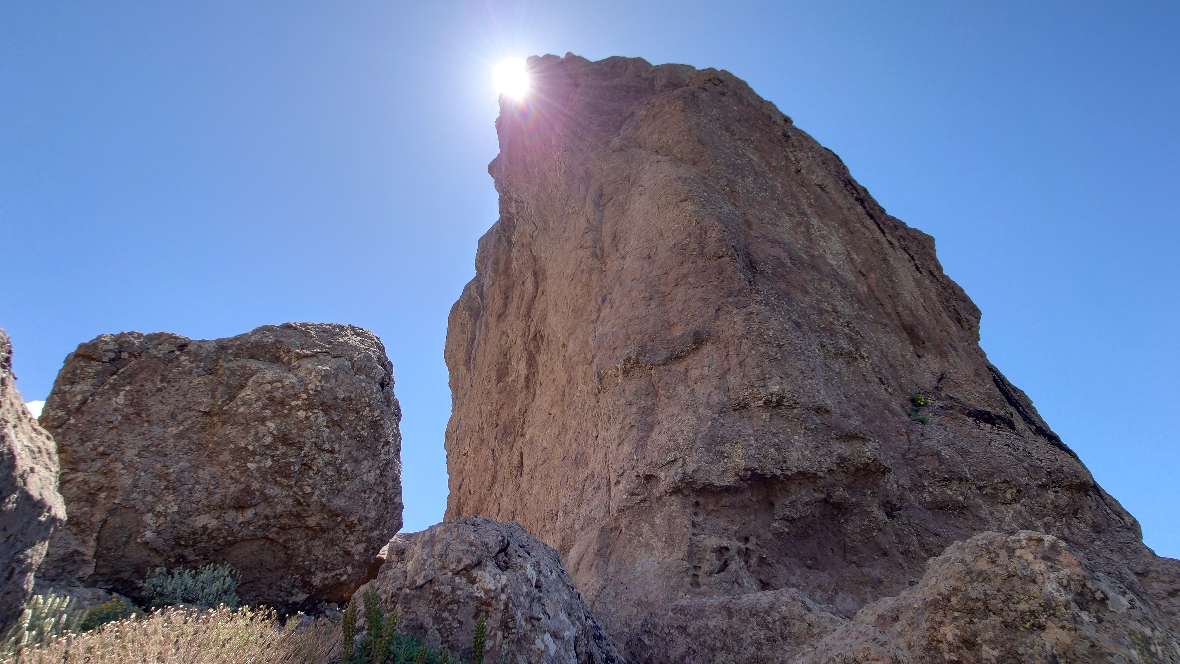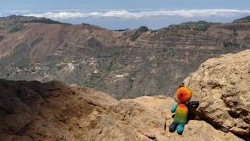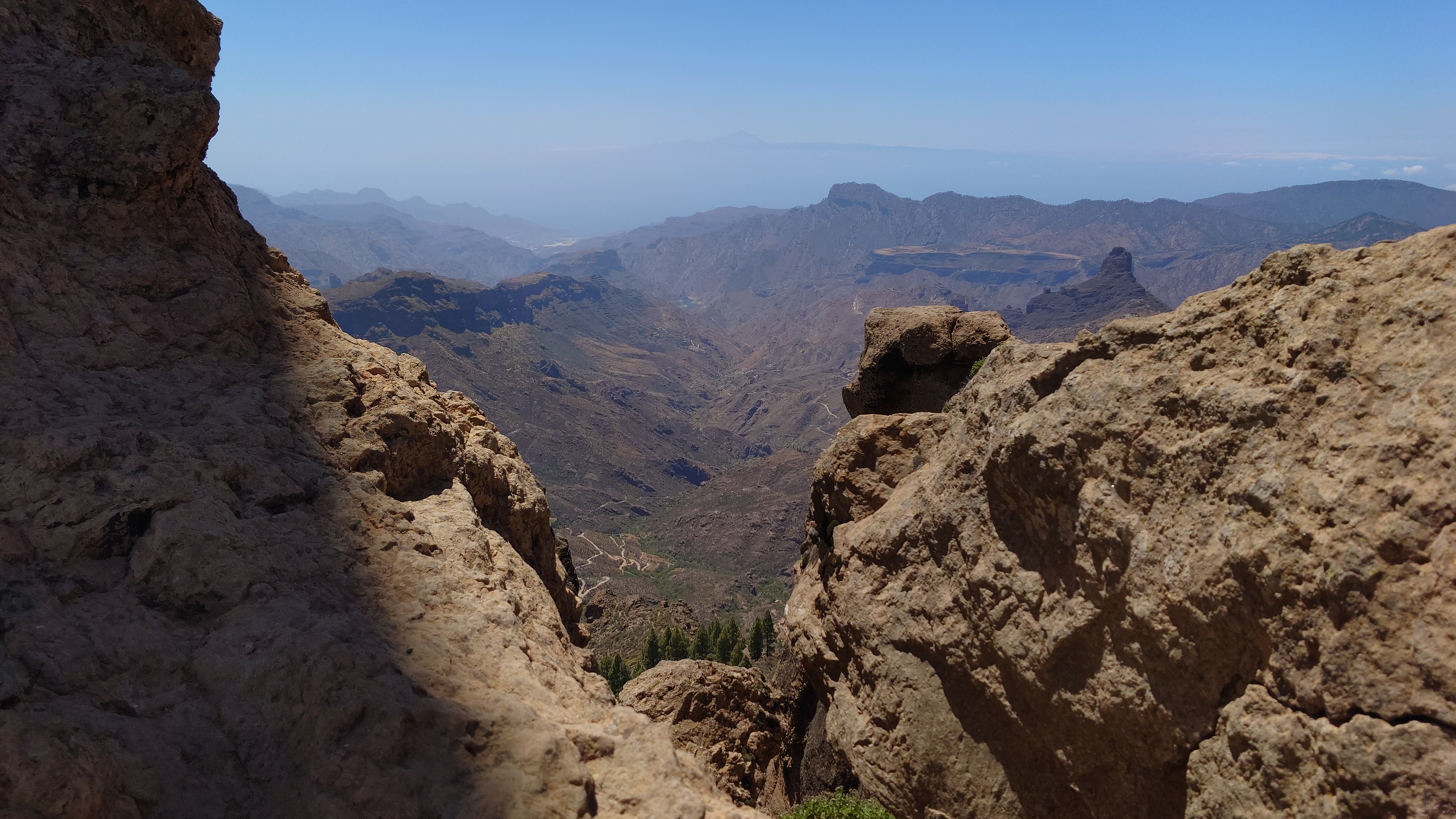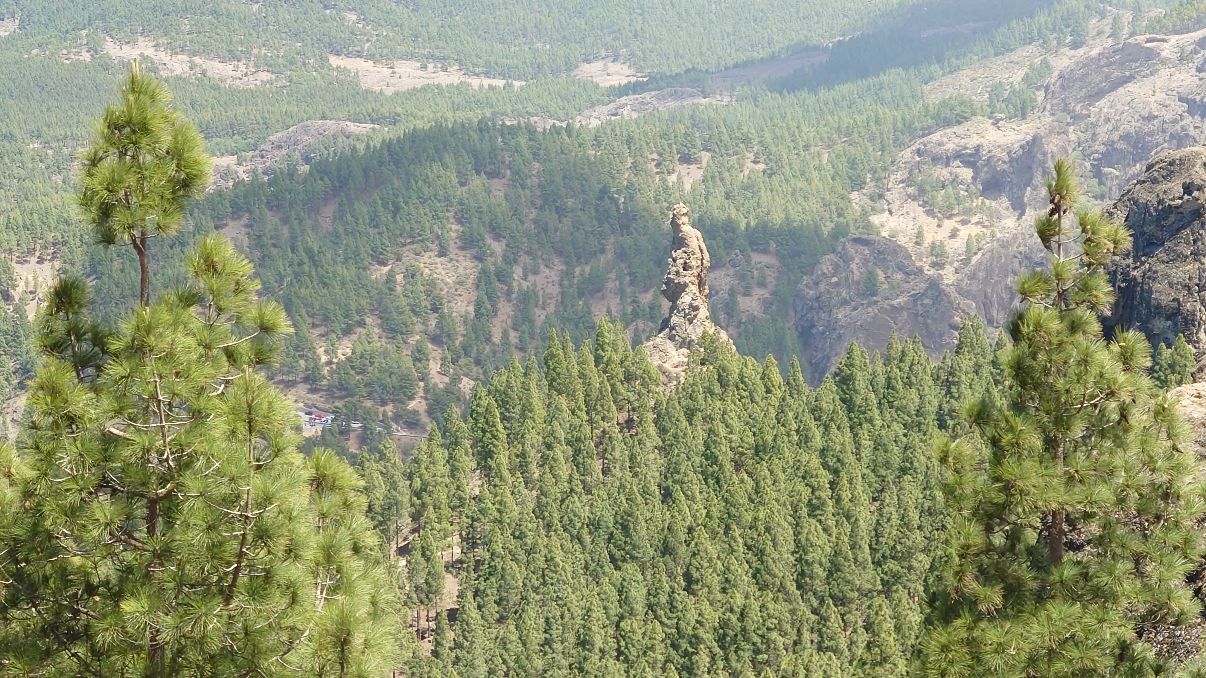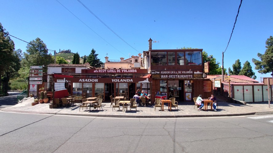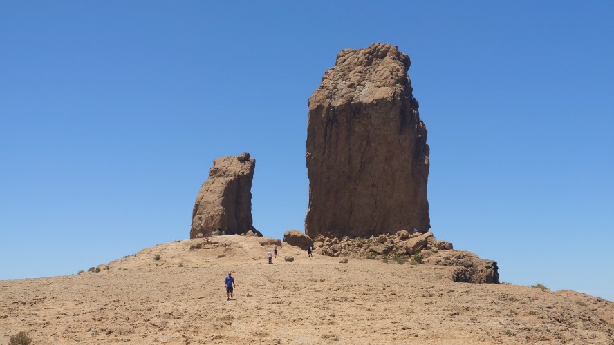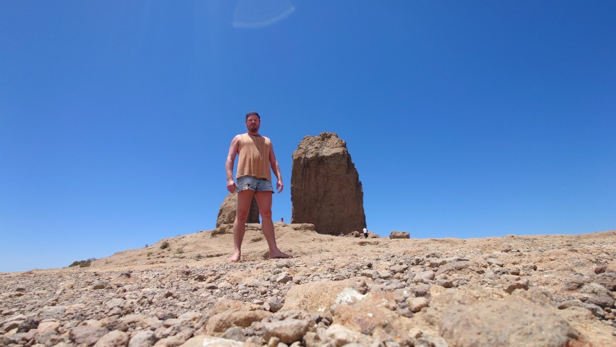 Die Hälfte des Wegs kenne ich schon von gestern. Gute Hörspielzeit. Auf dem Weg gibt es viele Wasserstellen auf Zeltplätzen und die funktionieren auch alle wieder. Also auch kein Rucksack. 23 Kilometer hin und zurück sind es dennoch, also eine volle Tagesetappe. Aber es geht gut voran. Es macht Spaß ein Ziel im Spaziergehmodus mit Hörbuch im Kopf zu erlaufen und ich bin tatsächlich in der von Google angegebenen Zeit von 2,5 Stunden dort und nicht wie sonst mindestens eine Stunde später, weil irgendwas nicht so recht nach Plan verläuft. Vor Ort ist Hotspot angesagt. Ein Lieferwagen mit Sonnenschirm ist natürlich auch da mit Ponchos, Totenkopfmagneten für den heimischen Kühlschrank und Helado für teuer Geld. Reisebusse quetschen sich in die spärlichen Buchten an der GC 600, die sich etwa 1,5 Kilometer weit unterhalb des Zinkens vorbeischlängelt. Im Anblick des steilen Aufstiegs will dann doch nicht jeder Beflipflopte hinauf und begnügt sich mit einem der Roque Nublo Kühlschrankmagneten. Dennoch ist der Amdrang verhältnismäßig groß. Der Weg endet auf einem steinigen Hochplateau. Und da steht der Roque gemeinsam mit seinem Sidekick erhaben über den Kiefern. Es könnte auch ein konstruierter Tempel sein. Ich setze mich in eine Mulde im Schatten des Gebildes und schaue hinüber auf das fünf Kilometer Luftlinie entfernte Parador Hotel. Um mich herum schwirren Schwalben in chaotischen, schnellen und lautlosen Kreisen wie Insekten. Ein paar Raben zanken sich mit ihnen um die Luftherrschaft. Hinter mir fängt's an zu quasseln. Zwei junge Spanier setzen sich direkt hinter mir hin, quasseln einen Wasserfall an Nichtigkeiten und fangen irgendwann an lustige TikTok Videos durchzuscrollen. Ich kenne die Soundtracks der Memes mittlerweile schon. Ich werde richtig sauer, bis ich mich schließlich entnervt mit dem Kopf kopfüber im Nacken an sie wende und frage, ob sie das wirklich ernst meinen. Sie gucken ebenso entnervt an: "Que?!" Nee, diesmal kein Spanisch, sondern langsames, aber dafür einprägsames Englisch direkt ins Gesicht: "You seriously come all the way up to this viewpoint to just watch videos on a smartphone? Do that elsewhere!" Entgegen meiner Erwartungen machen sie betroffene Augen und ziehen mit einem "Lo siento" ab. Selstzufrieden setze ich mich wieder hin und glaube wieder an den gesunden Menschenverstand der mir folgenden Generation.