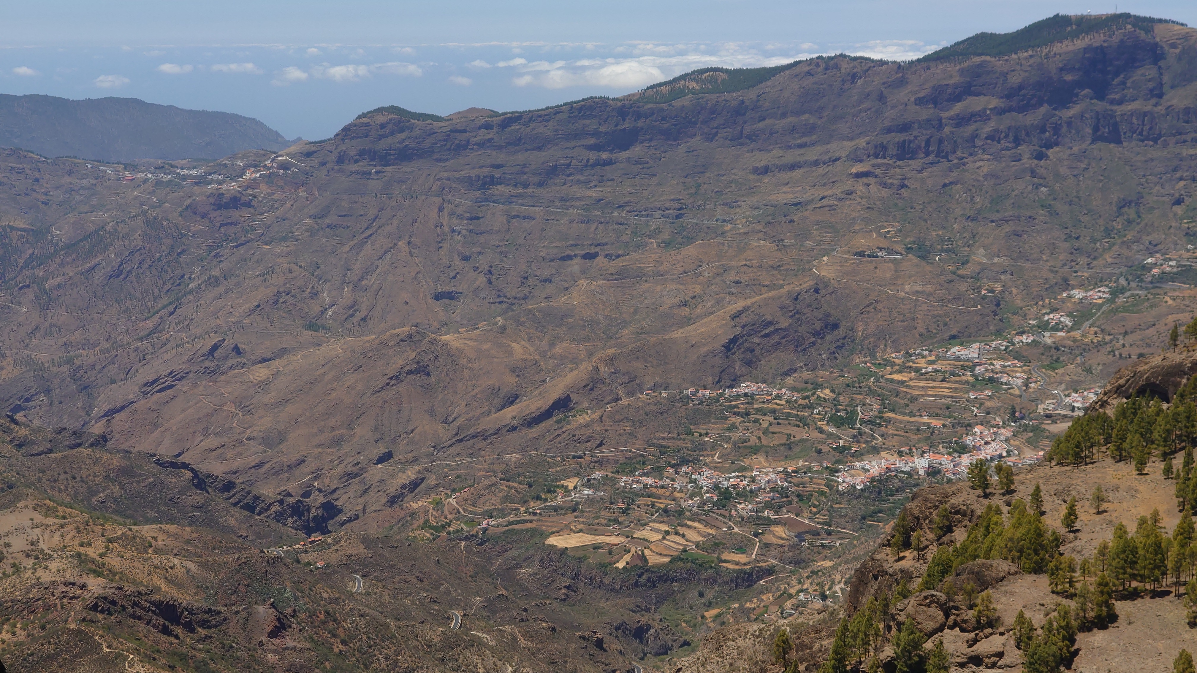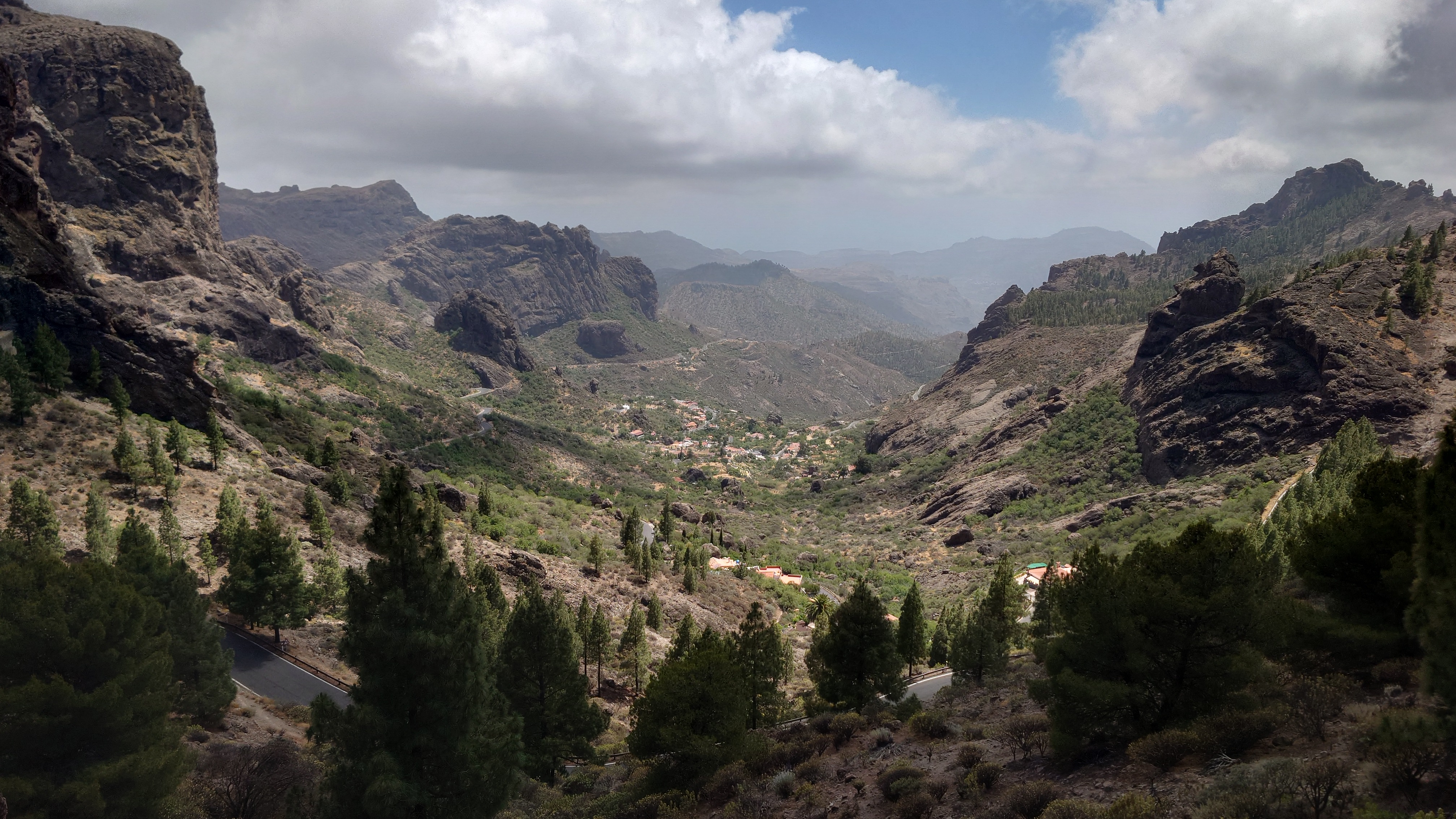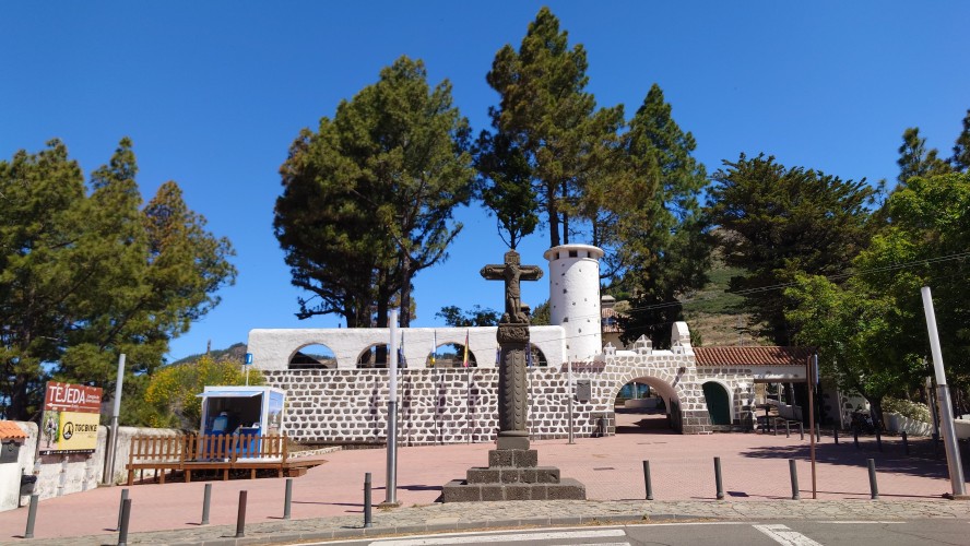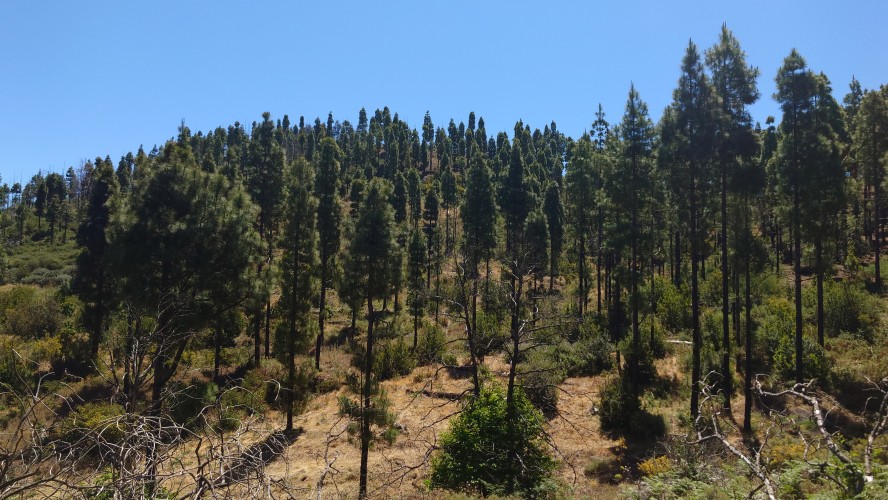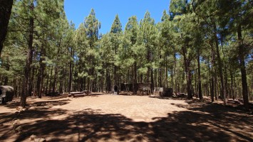 Die Hälfte des Wegs kenne ich schon von gestern. Gute Hörspielzeit. Auf dem Weg gibt es viele Wasserstellen auf Zeltplätzen und die funktionieren auch alle wieder. Also auch kein Rucksack. 23 Kilometer hin und zurück sind es dennoch, also eine volle Tagesetappe. Aber es geht gut voran. Es macht Spaß ein Ziel im Spaziergehmodus mit Hörbuch im Kopf zu erlaufen und ich bin tatsächlich in der von Google angegebenen Zeit von 2,5 Stunden dort und nicht wie sonst mindestens eine Stunde später, weil irgendwas nicht so recht nach Plan verläuft. Vor Ort ist Hotspot angesagt. Ein Lieferwagen mit Sonnenschirm ist natürlich auch da mit Ponchos, Totenkopfmagneten für den heimischen Kühlschrank und Helado für teuer Geld. Reisebusse quetschen sich in die spärlichen Buchten an der GC 600, die sich etwa 1,5 Kilometer weit unterhalb des Zinkens vorbeischlängelt. Im Anblick des steilen Aufstiegs will dann doch nicht jeder Beflipflopte hinauf und begnügt sich mit einem der Roque Nublo Kühlschrankmagneten. Dennoch ist der Amdrang verhältnismäßig groß. Der Weg endet auf einem steinigen Hochplateau. Und da steht der Roque gemeinsam mit seinem Sidekick erhaben über den Kiefern. Es könnte auch ein konstruierter Tempel sein. Ich setze mich in eine Mulde im Schatten des Gebildes und schaue hinüber auf das fünf Kilometer Luftlinie entfernte Parador Hotel. Um mich herum schwirren Schwalben in chaotischen, schnellen und lautlosen Kreisen wie Insekten. Ein paar Raben zanken sich mit ihnen um die Luftherrschaft. Hinter mir fängt's an zu quasseln. Zwei junge Spanier setzen sich direkt hinter mir hin, quasseln einen Wasserfall an Nichtigkeiten und fangen irgendwann an lustige TikTok Videos durchzuscrollen. Ich kenne die Soundtracks der Memes mittlerweile schon. Ich werde richtig sauer, bis ich mich schließlich entnervt mit dem Kopf kopfüber im Nacken an sie wende und frage, ob sie das wirklich ernst meinen. Sie gucken ebenso entnervt an: "Que?!" Nee, diesmal kein Spanisch, sondern langsames, aber dafür einprägsames Englisch direkt ins Gesicht: "You seriously come all the way up to this viewpoint to just watch videos on a smartphone? Do that elsewhere!" Entgegen meiner Erwartungen machen sie betroffene Augen und ziehen mit einem "Lo siento" ab. Selstzufrieden setze ich mich wieder hin und glaube wieder an den gesunden Menschenverstand der mir folgenden Generation.