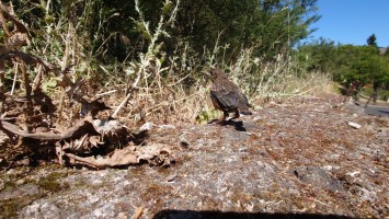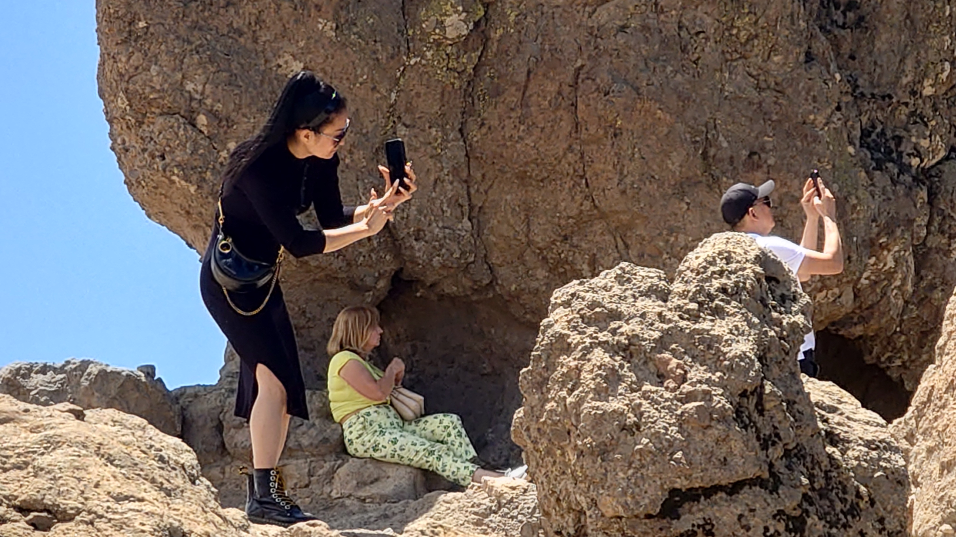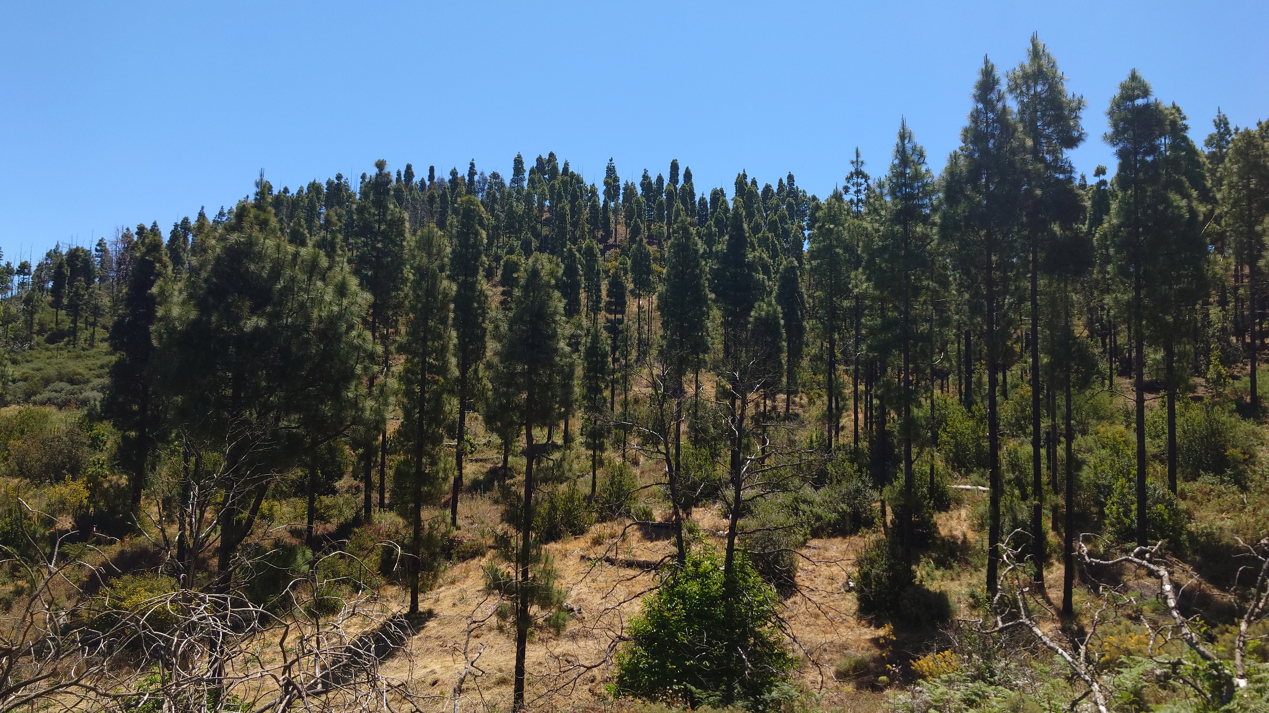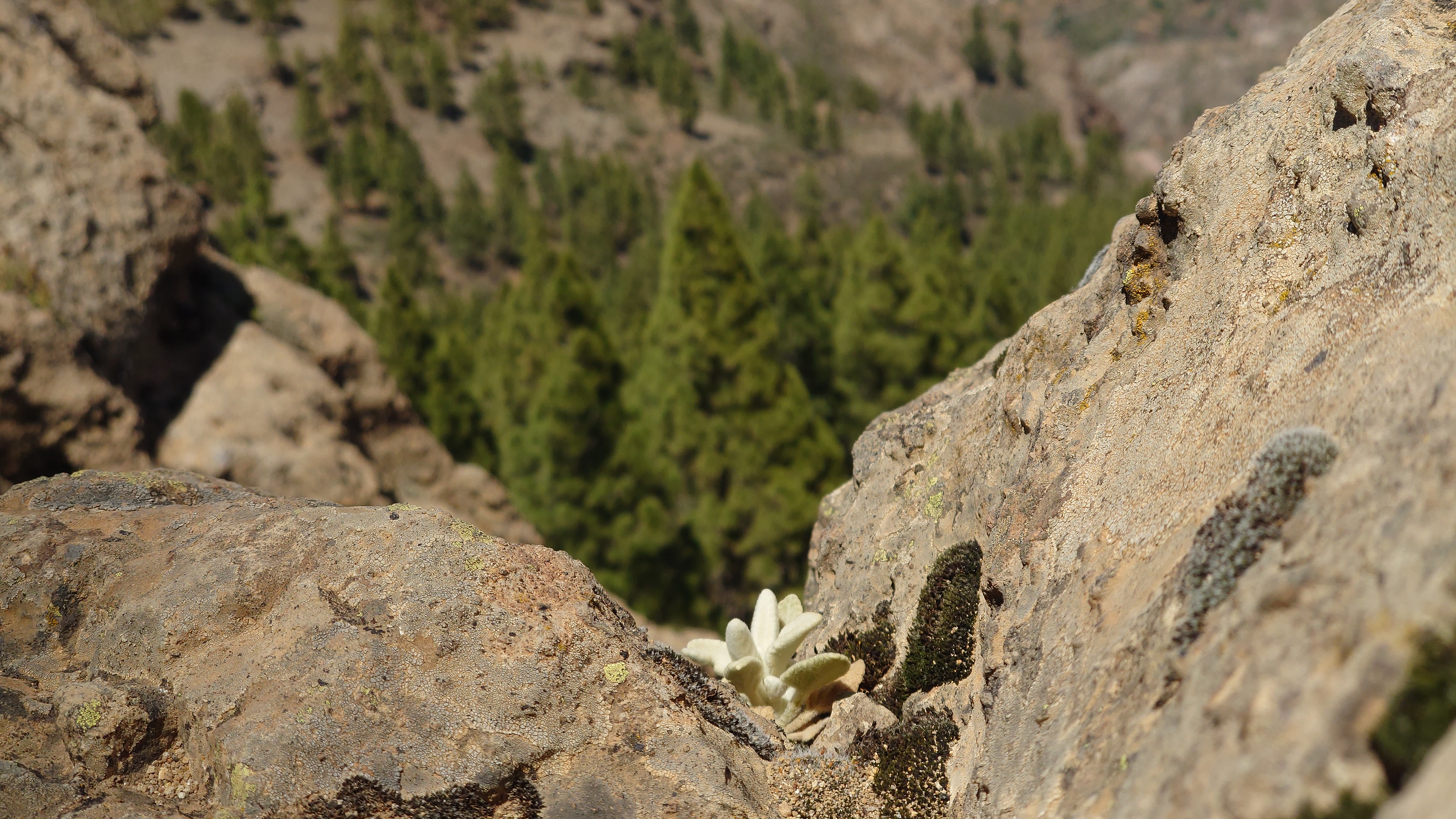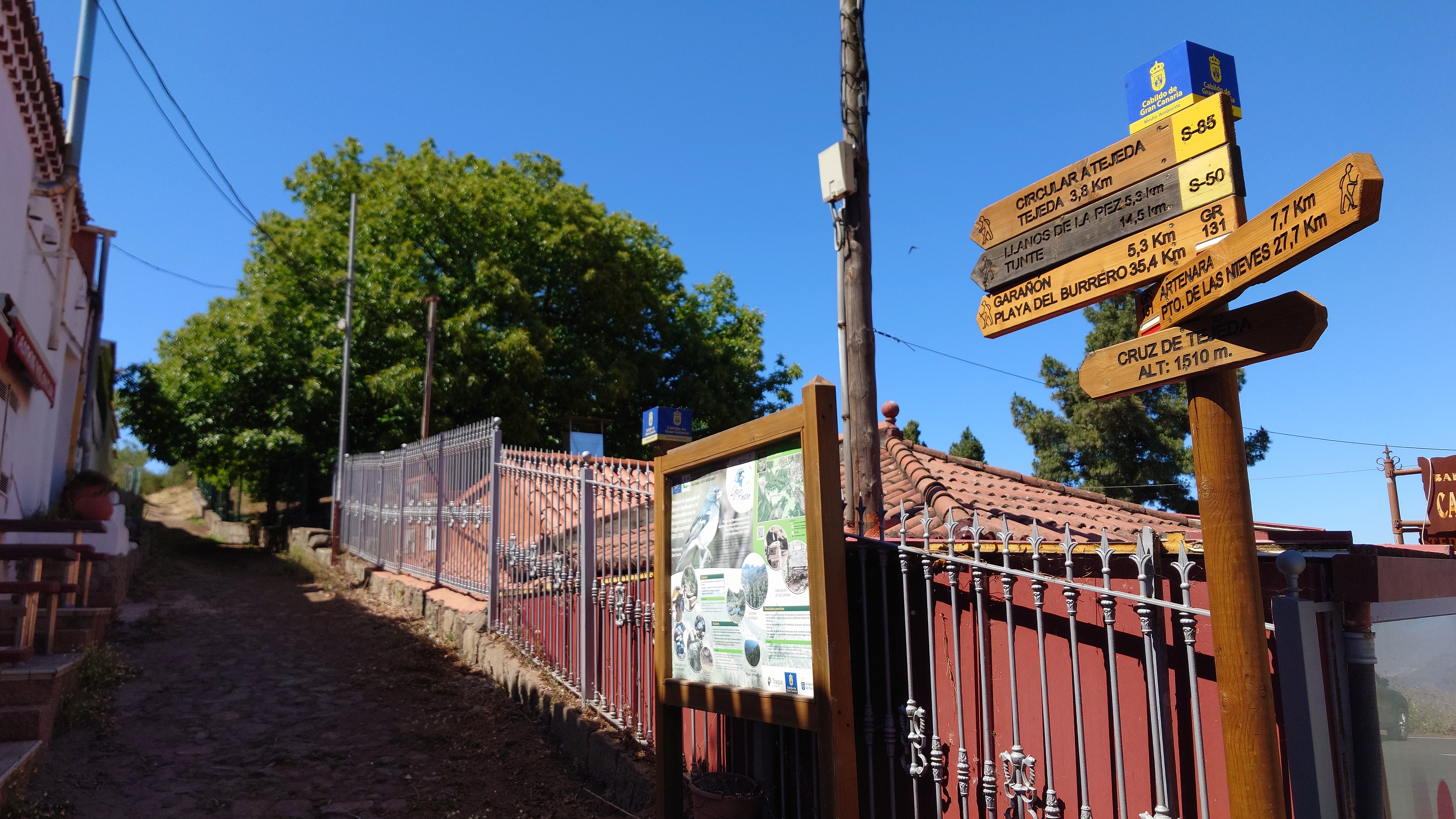 Die Hälfte des Wegs kenne ich schon von gestern. Gute Hörspielzeit. Auf dem Weg gibt es viele Wasserstellen auf Zeltplätzen und die funktionieren auch alle wieder. Also auch kein Rucksack. 23 Kilometer hin und zurück sind es dennoch, also eine volle Tagesetappe. Aber es geht gut voran. Es macht Spaß ein Ziel im Spaziergehmodus mit Hörbuch im Kopf zu erlaufen und ich bin tatsächlich in der von Google angegebenen Zeit von 2,5 Stunden dort und nicht wie sonst mindestens eine Stunde später, weil irgendwas nicht so recht nach Plan verläuft. Vor Ort ist Hotspot angesagt. Ein Lieferwagen mit Sonnenschirm ist natürlich auch da mit Ponchos, Totenkopfmagneten für den heimischen Kühlschrank und Helado für teuer Geld. Reisebusse quetschen sich in die spärlichen Buchten an der GC 600, die sich etwa 1,5 Kilometer weit unterhalb des Zinkens vorbeischlängelt. Im Anblick des steilen Aufstiegs will dann doch nicht jeder Beflipflopte hinauf und begnügt sich mit einem der Roque Nublo Kühlschrankmagneten. Dennoch ist der Amdrang verhältnismäßig groß. Der Weg endet auf einem steinigen Hochplateau. Und da steht der Roque gemeinsam mit seinem Sidekick erhaben über den Kiefern. Es könnte auch ein konstruierter Tempel sein. Ich setze mich in eine Mulde im Schatten des Gebildes und schaue hinüber auf das fünf Kilometer Luftlinie entfernte Parador Hotel. Um mich herum schwirren Schwalben in chaotischen, schnellen und lautlosen Kreisen wie Insekten. Ein paar Raben zanken sich mit ihnen um die Luftherrschaft. Hinter mir fängt's an zu quasseln. Zwei junge Spanier setzen sich direkt hinter mir hin, quasseln einen Wasserfall an Nichtigkeiten und fangen irgendwann an lustige TikTok Videos durchzuscrollen. Ich kenne die Soundtracks der Memes mittlerweile schon. Ich werde richtig sauer, bis ich mich schließlich entnervt mit dem Kopf kopfüber im Nacken an sie wende und frage, ob sie das wirklich ernst meinen. Sie gucken ebenso entnervt an: "Que?!" Nee, diesmal kein Spanisch, sondern langsames, aber dafür einprägsames Englisch direkt ins Gesicht: "You seriously come all the way up to this viewpoint to just watch videos on a smartphone? Do that elsewhere!" Entgegen meiner Erwartungen machen sie betroffene Augen und ziehen mit einem "Lo siento" ab. Selstzufrieden setze ich mich wieder hin und glaube wieder an den gesunden Menschenverstand der mir folgenden Generation.