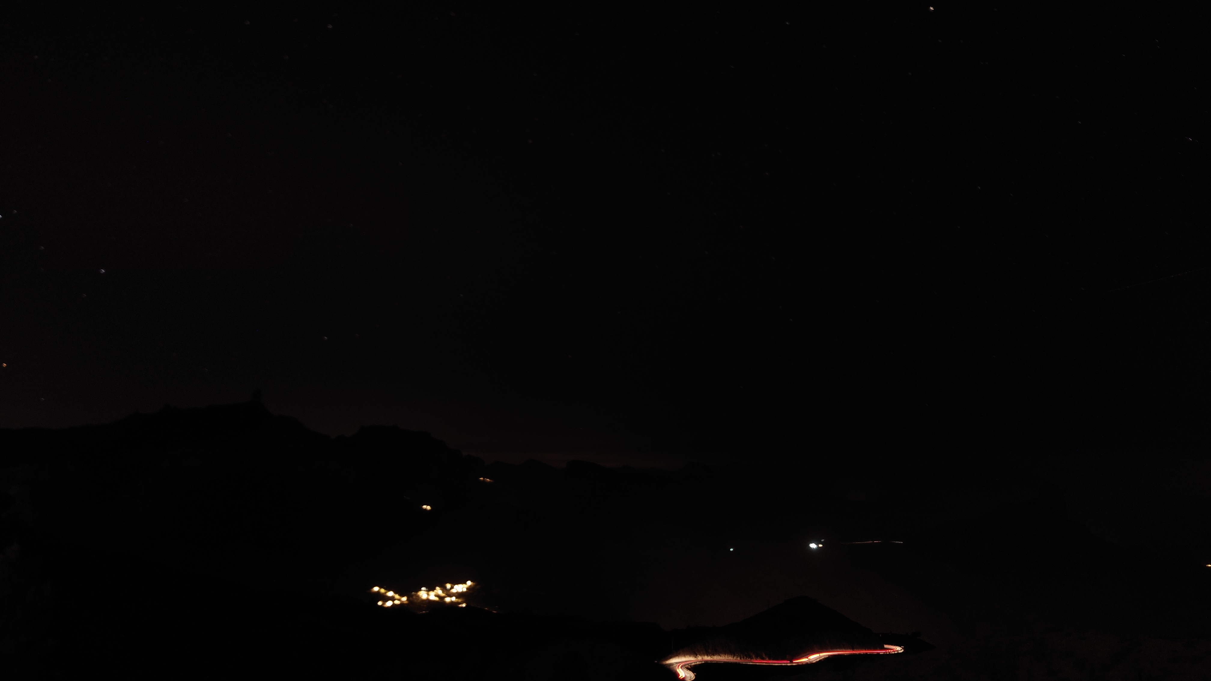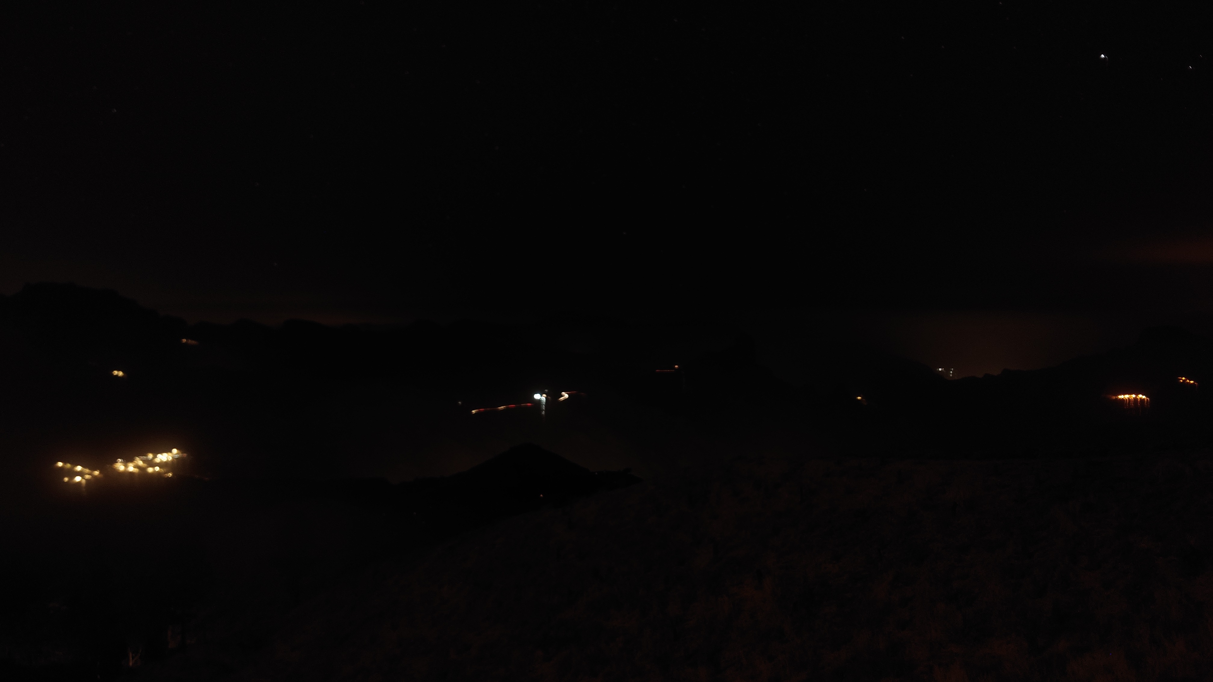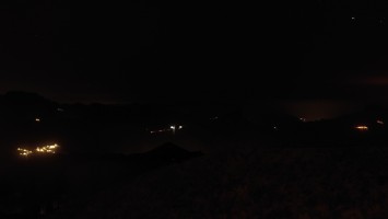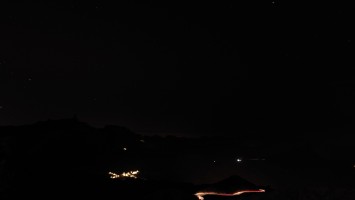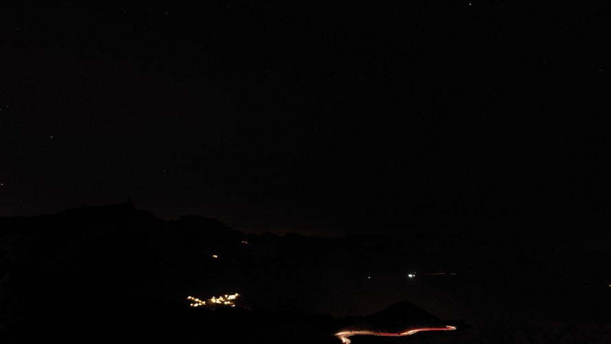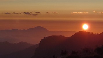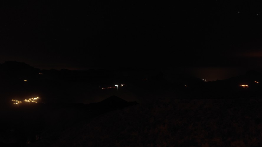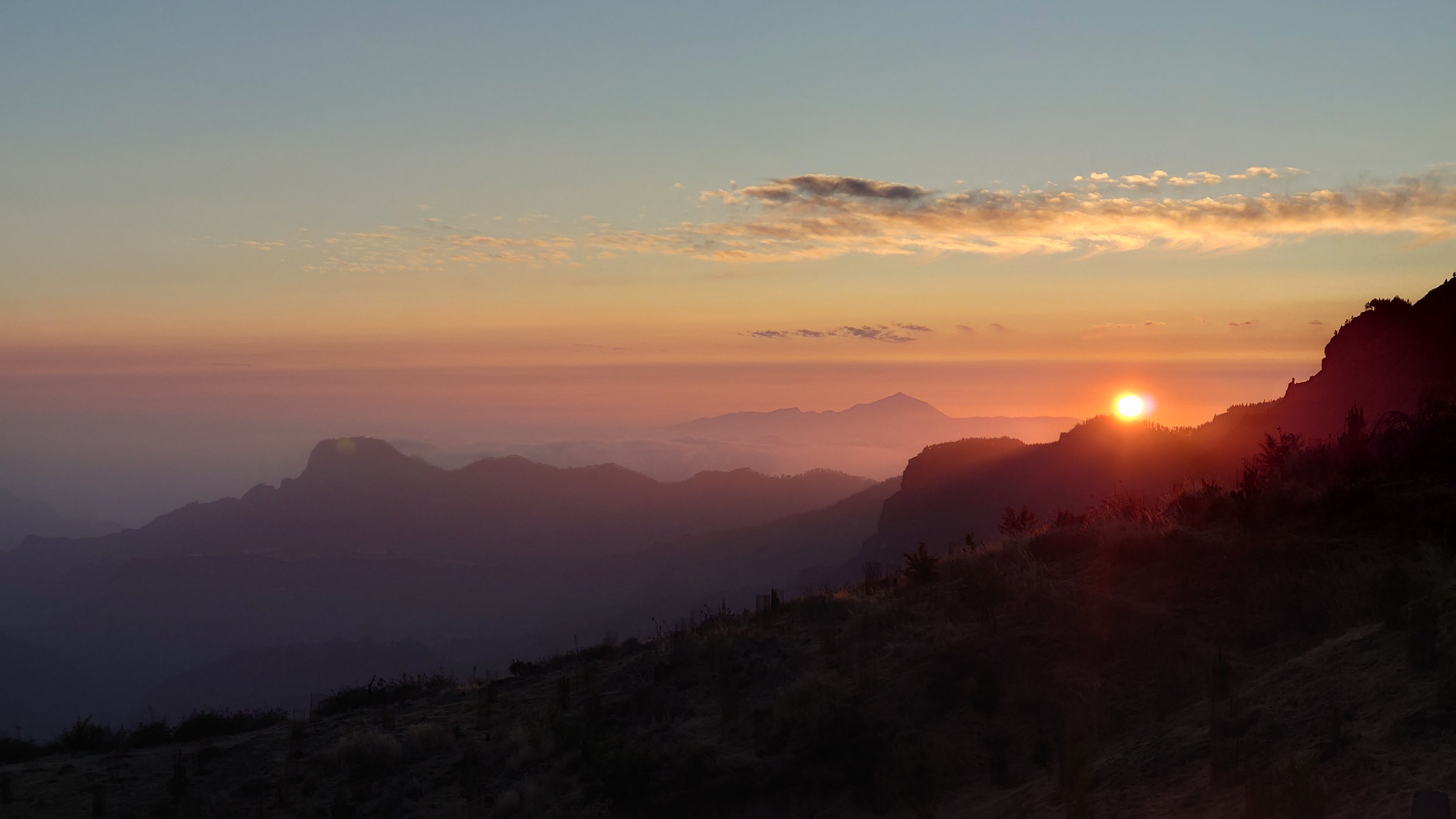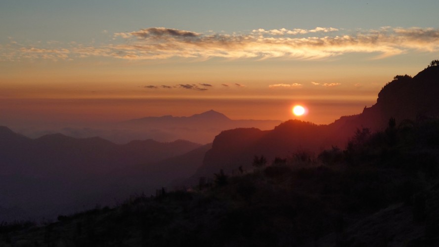 Die ganze Zeit versuche ich den Teide irgendwie auf Bildern festzuhalten. Es gelingt mir nicht, zu kontrastarm. Um 20:42 Uhr schließlich ist es soweit. Ich stehe auf dem Balkon zum Wäsche aufhängen und Mandeln essen, als der Horizont sich bunt färbt und die untergehende Sonne das gewaltige Massiv des Teides für nichtmal drei Minuten als dunkelgrauen Scherenschnitt herausstellt. Allein dafür lohnt es sich hier oben zu bleiben.