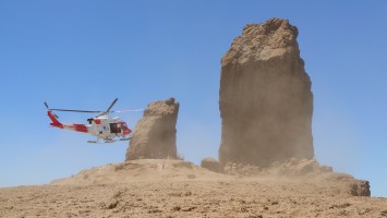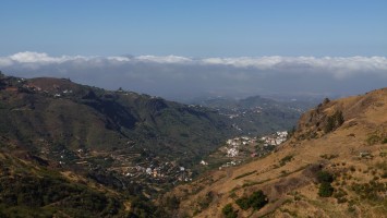 Ich muss aber auch mal langsam zurück. 2 Stunden mindestens liegen noch vor mir. Beim Abstieg nähert sich ein Helicopter aus der Richtung von Las Palmas, umkreist einmal den Roque und setzt genau dort zur Landung an, wo ich stehe. Ich stehe ratlos rum und weiß nicht wohin. Staub wirbelt auf und ich presse mich am einen Felsen. Mein erster Gedanke ist kurioserseise "Was hab ich falsch gemacht?". Sie kommen aber nicht wegen mir. Eine Frau ist auf dem Plateau erschöpft kreislaufkollabiert. Sie wird ins Krankenhaus geflogen. Ich bin fasziniert davon wie der Heli versucht einen Landeplatz auszumachen. Ich merke, dass es doch eher selten ist, dass man einen Heli direkt vor der Nase landen sieht... und kehre zurück zum Hotel. Am Horizont zieht sich ein Wolkenband entlang und grenzt darunter eine gelbliche Smogschicht vom tiefen Blau darüber ab. Hier oben ist es definitiv schöner. Zum Abendessen hole ich mir vom Zeltmarkt am Parkplatz noch Tomaten und gebrannte Mandeln mit Paprika und Knoblauch. Die sind tatsächlich süß. Eine schräge Erfindung, die es wohl nur hier so gibt.