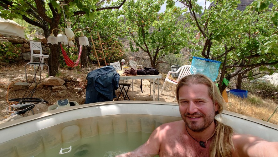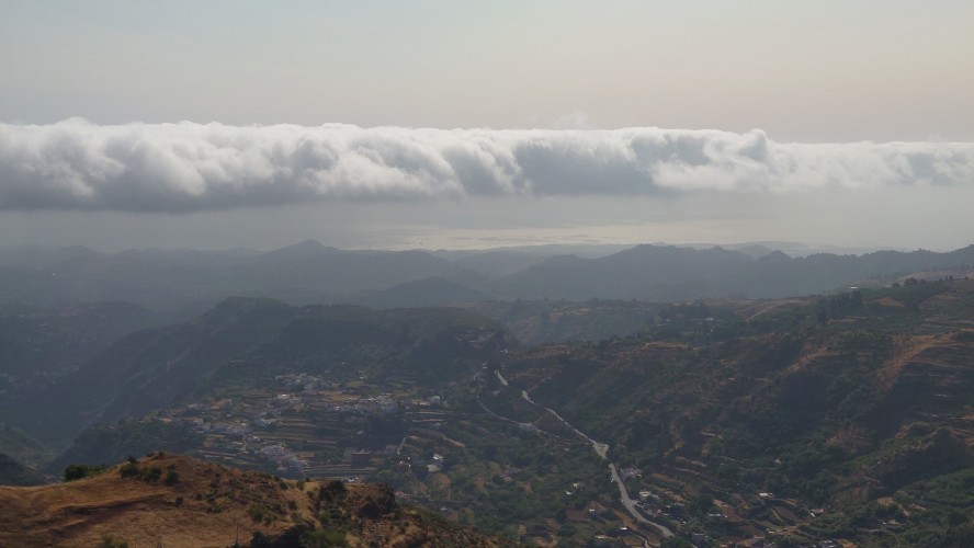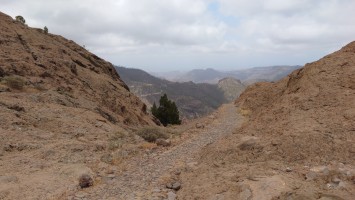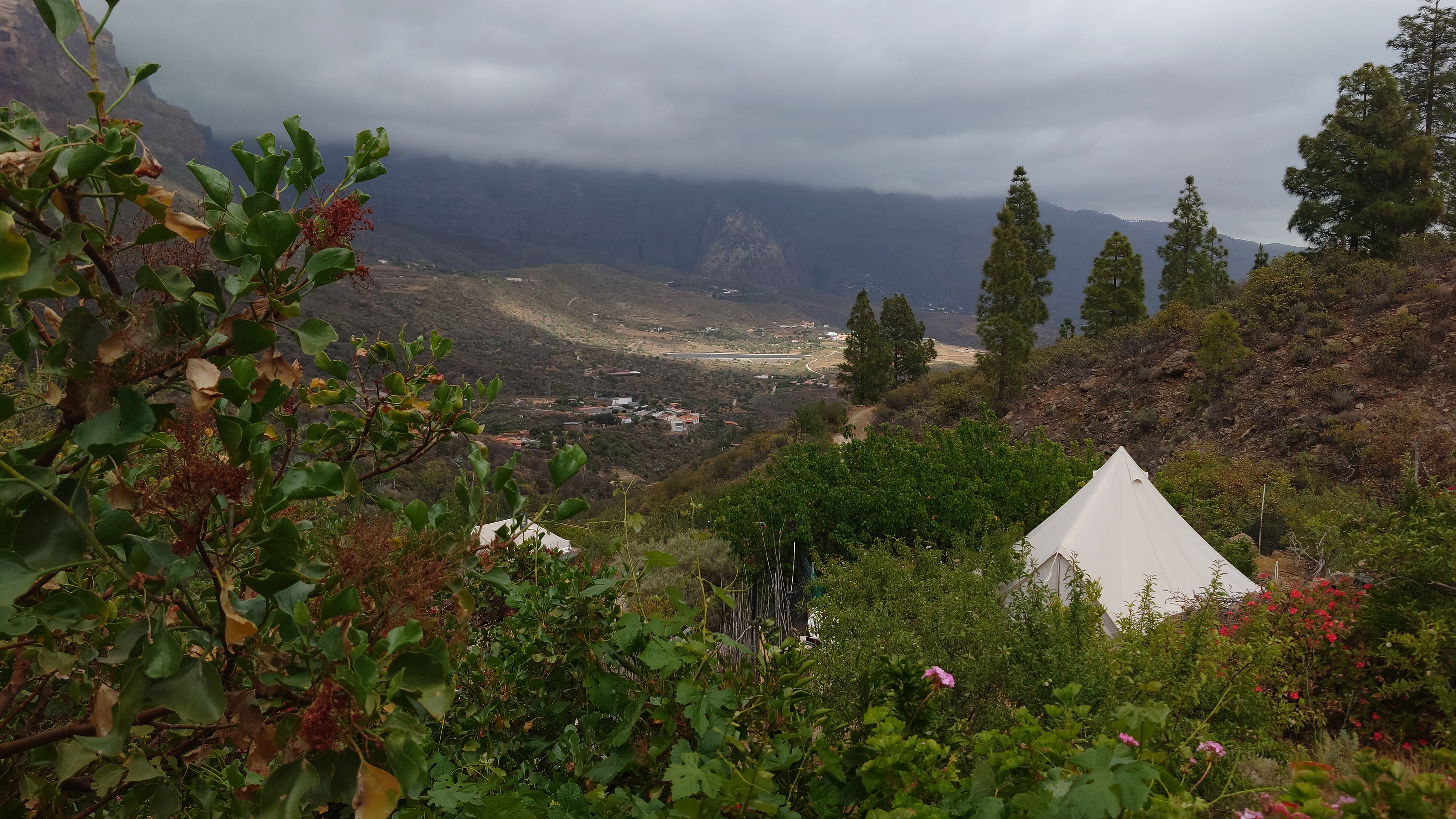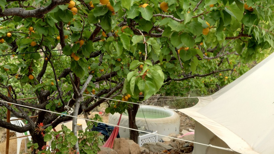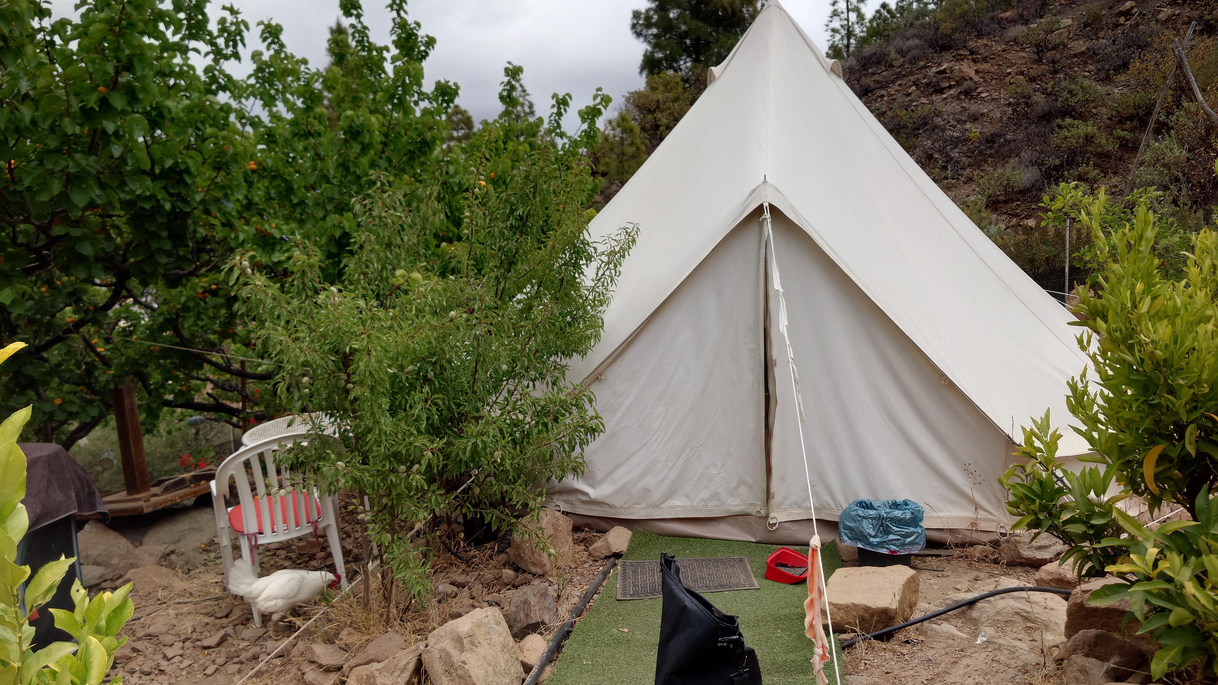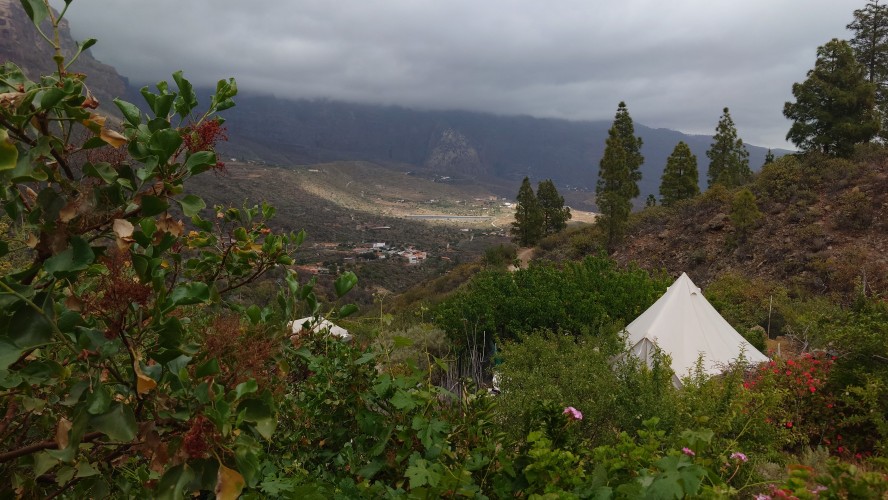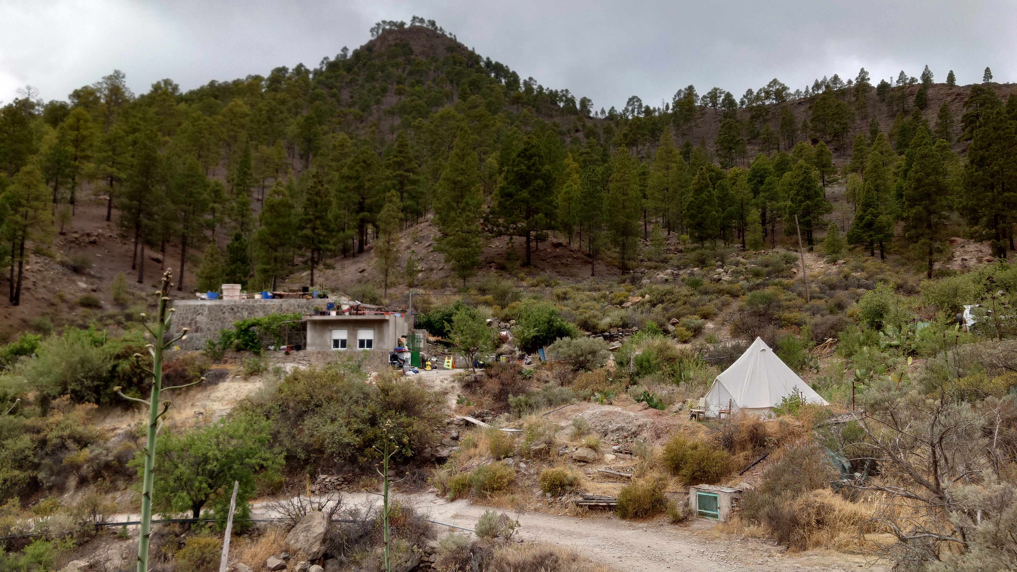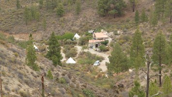 Dann geht es steil bergab. Nach drei Tagen über den Wolken bin ich jetzt wieder unter ihnen und die Luft wird deutlich milder. Ich bin ein bisschen betrübt. Oben gefällt es mir gut. Andererseits habe ich das sehen können, was sich fußläufig erreichen lässt und von daher darf es auch gerne weiter gehen. Meine Unterkunft kann ich schon von weit oben erlennen. Es ist ein kleines Zeltdorf am Einstieg des Caminos. Als ich ankomme bin ich erst einmal verwirrt. Es gibt kein wirkliches Haus, nur eine Art Schuppen. Drum herum stehen weiße Zelte viele Aprikosen. Eines davon wird wohl meins sein, aber es ost keiner da, den ich fragen könnte. Na gut, ich habe mich auch erst abends angekündigt, jetzt ist es 14 Uhr. Dann setze ich mich mal hier irgendwo hin. Und so sitze ich da und schaue mich um. Es herrscht ein Chaos aus verschlissenen Gegenstäden, die irgendwo herumstehen. Dabei hat zwar alles irgendwie einen Zweck, es ist keine Müllhalde. Aber wirklich alles ist irgendwie zurecht improvisiert mit dem Allernötigsten. Darunter mischt sich viel Kinderspielzeug, also wird hier auch ein Kind leben. Viele Katzen und Kätzchen umschleichen meine Beine.. Mich beschleicht ein Verdacht. Alles erinnert mich an Abracaribes vor drei Jahren auf La Palma. Das muss ein Aussteiger sein, der hier wohnt oder eine Familie. Ich warte keine 10 Minuten, da schleicht ein schrottreifer Nissan die Piste hinab zum Haus. Heraus kommen ein älterer Mann, eine Frau und ein Kind. Sie begrüßen mich und sind meine Gastfamilie. Er heißt Patrice und ist Franzose. Sie heißt Simone und ist Deutsche, das Kind heißt Mibella, ist fünf und spricht Englisch. Eine Aussteiger-Familie mit fantasievollem Improvisationstalent allem Anschein nach. Sie zeigt mir die Finca und zu meiner Freude gibt es sogar einen Whirlpool mit warmen Wasser. Na das kommt mir Recht, der Tag ist noch lang. Nur Essen habe ich keins mehr. Der nächste Supermarkt liegt 6 Kilometer entfernt in einem Ort mit dem lieblichen Namen Tunte.