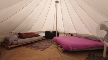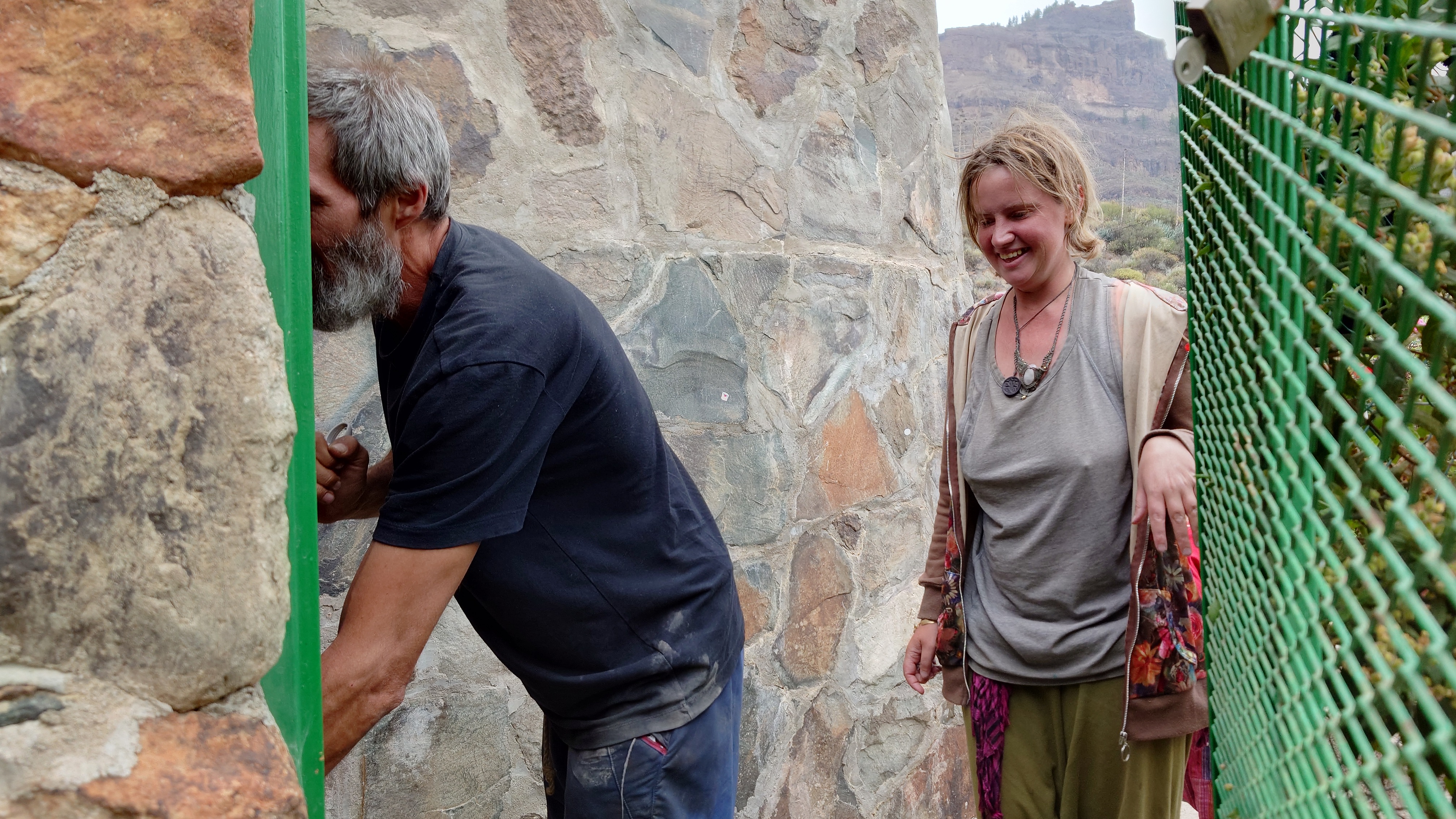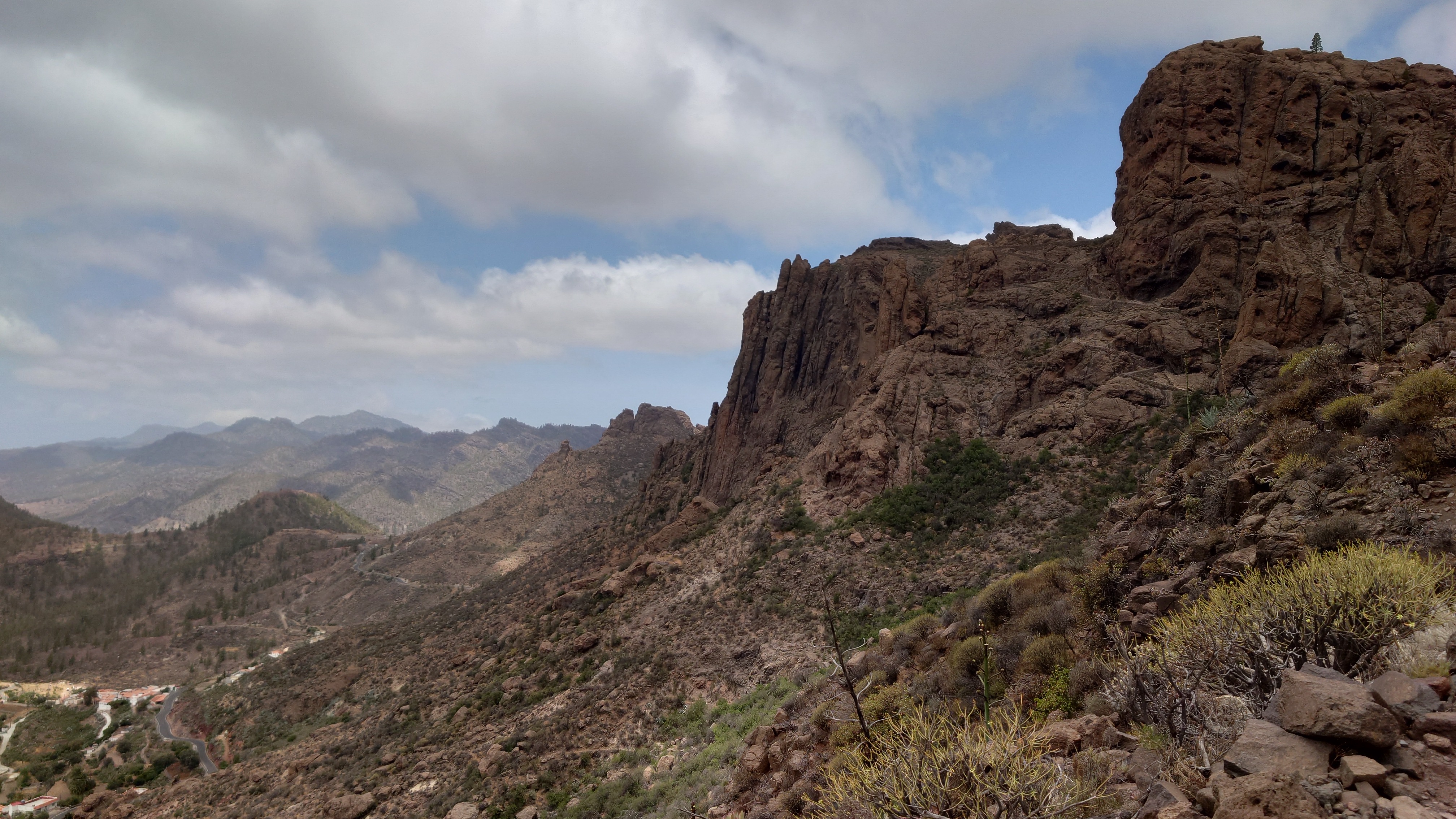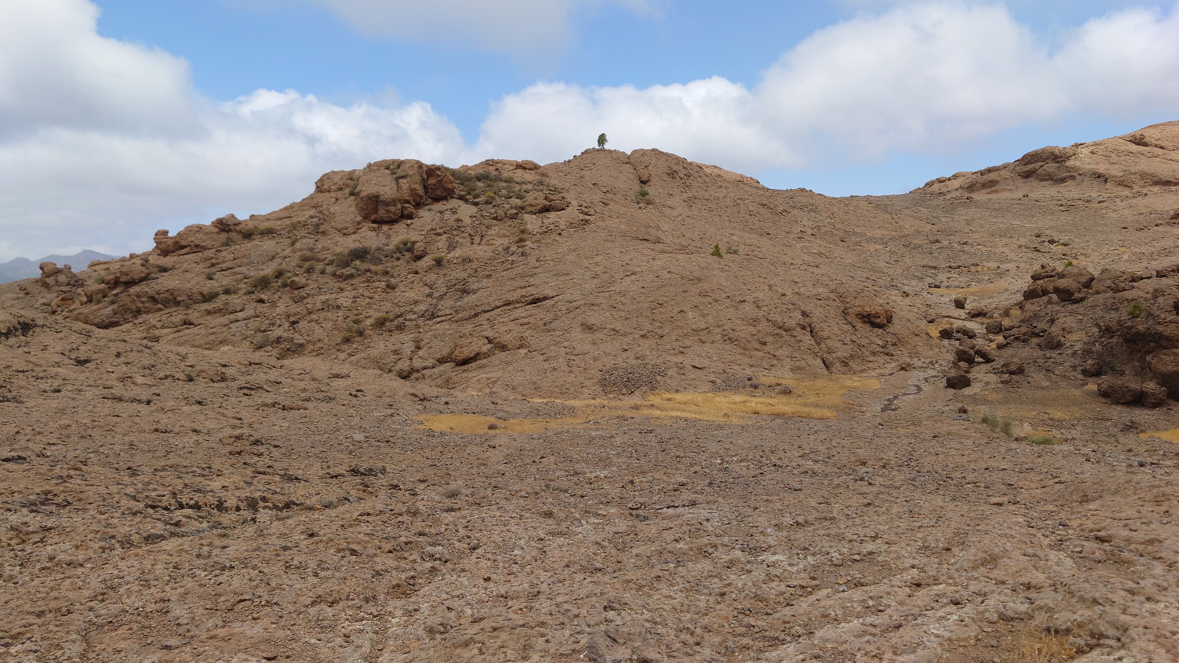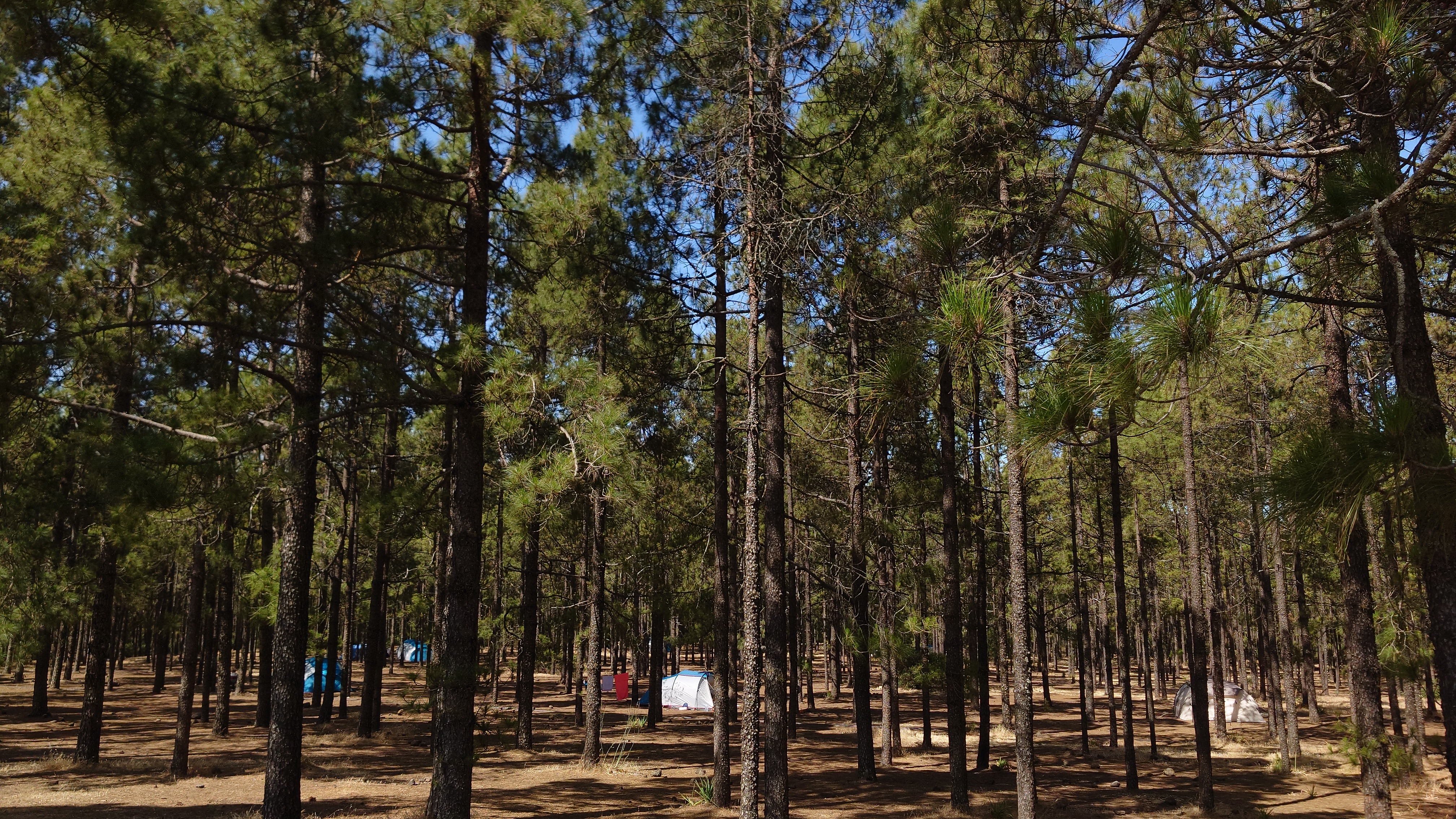 Dann geht es steil bergab. Nach drei Tagen über den Wolken bin ich jetzt wieder unter ihnen und die Luft wird deutlich milder. Ich bin ein bisschen betrübt. Oben gefällt es mir gut. Andererseits habe ich das sehen können, was sich fußläufig erreichen lässt und von daher darf es auch gerne weiter gehen. Meine Unterkunft kann ich schon von weit oben erlennen. Es ist ein kleines Zeltdorf am Einstieg des Caminos. Als ich ankomme bin ich erst einmal verwirrt. Es gibt kein wirkliches Haus, nur eine Art Schuppen. Drum herum stehen weiße Zelte viele Aprikosen. Eines davon wird wohl meins sein, aber es ost keiner da, den ich fragen könnte. Na gut, ich habe mich auch erst abends angekündigt, jetzt ist es 14 Uhr. Dann setze ich mich mal hier irgendwo hin. Und so sitze ich da und schaue mich um. Es herrscht ein Chaos aus verschlissenen Gegenstäden, die irgendwo herumstehen. Dabei hat zwar alles irgendwie einen Zweck, es ist keine Müllhalde. Aber wirklich alles ist irgendwie zurecht improvisiert mit dem Allernötigsten. Darunter mischt sich viel Kinderspielzeug, also wird hier auch ein Kind leben. Viele Katzen und Kätzchen umschleichen meine Beine.. Mich beschleicht ein Verdacht. Alles erinnert mich an Abracaribes vor drei Jahren auf La Palma. Das muss ein Aussteiger sein, der hier wohnt oder eine Familie. Ich warte keine 10 Minuten, da schleicht ein schrottreifer Nissan die Piste hinab zum Haus. Heraus kommen ein älterer Mann, eine Frau und ein Kind. Sie begrüßen mich und sind meine Gastfamilie. Er heißt Patrice und ist Franzose. Sie heißt Simone und ist Deutsche, das Kind heißt Mibella, ist fünf und spricht Englisch. Eine Aussteiger-Familie mit fantasievollem Improvisationstalent allem Anschein nach. Sie zeigt mir die Finca und zu meiner Freude gibt es sogar einen Whirlpool mit warmen Wasser. Na das kommt mir Recht, der Tag ist noch lang. Nur Essen habe ich keins mehr. Der nächste Supermarkt liegt 6 Kilometer entfernt in einem Ort mit dem lieblichen Namen Tunte.