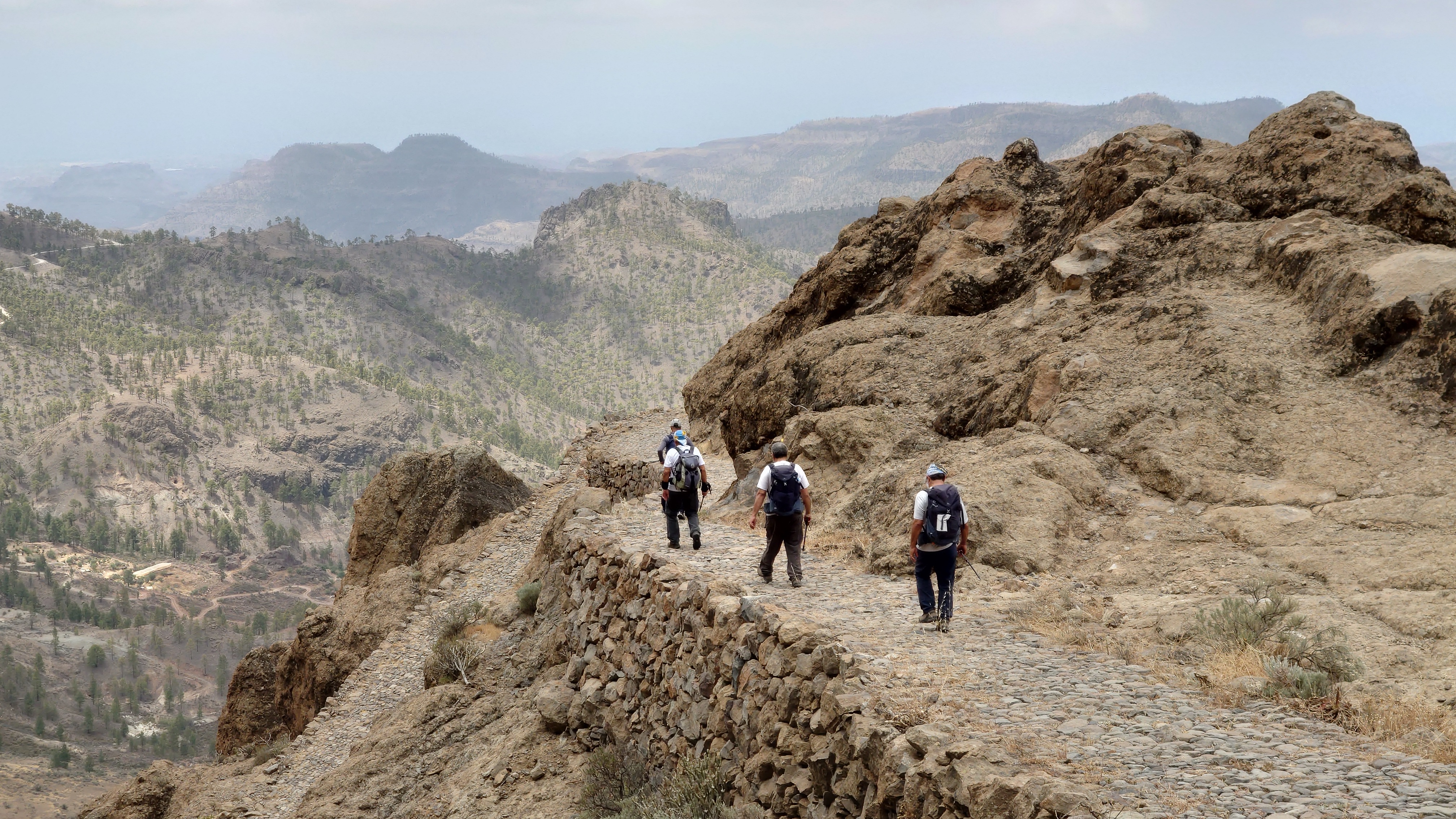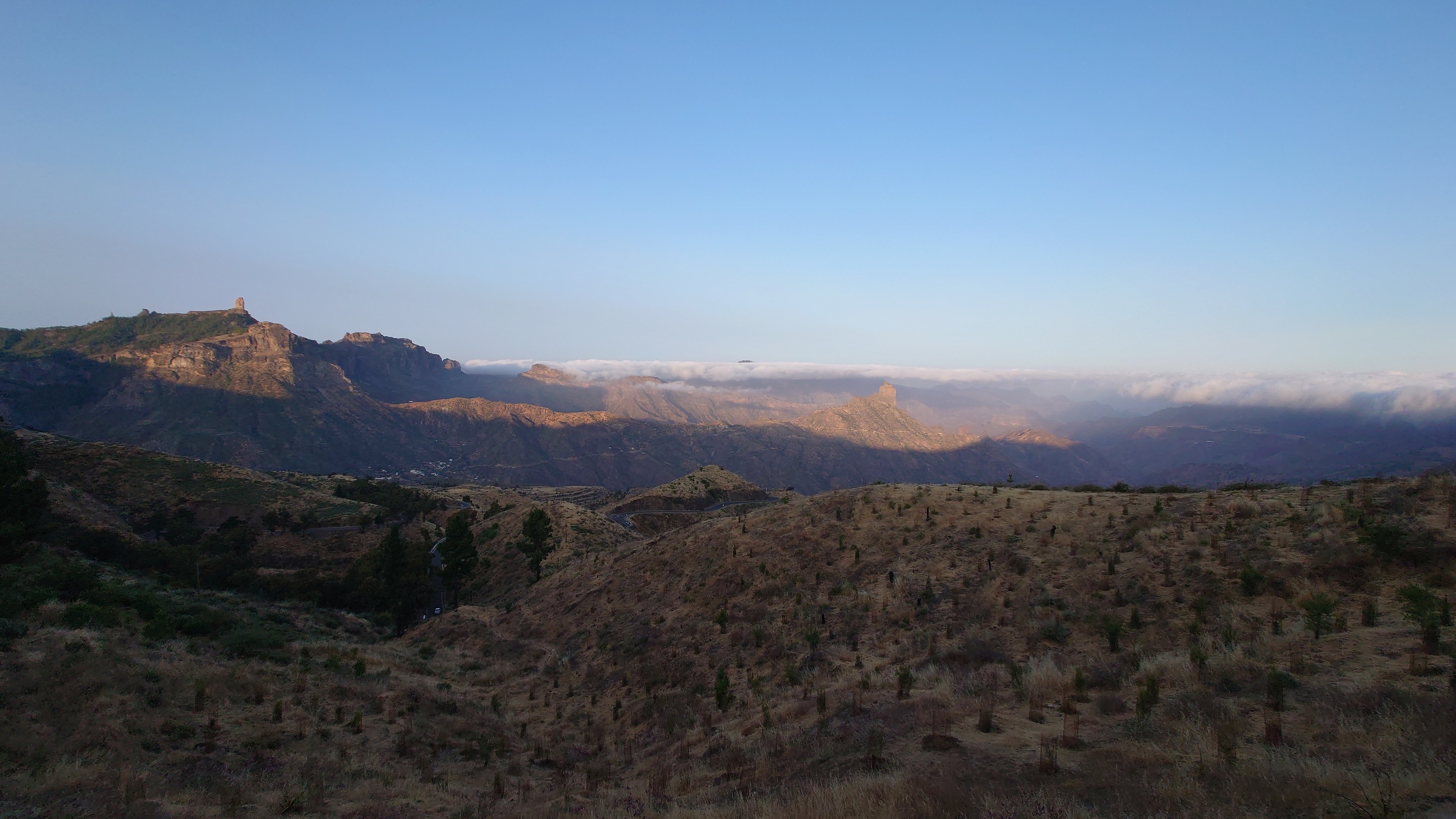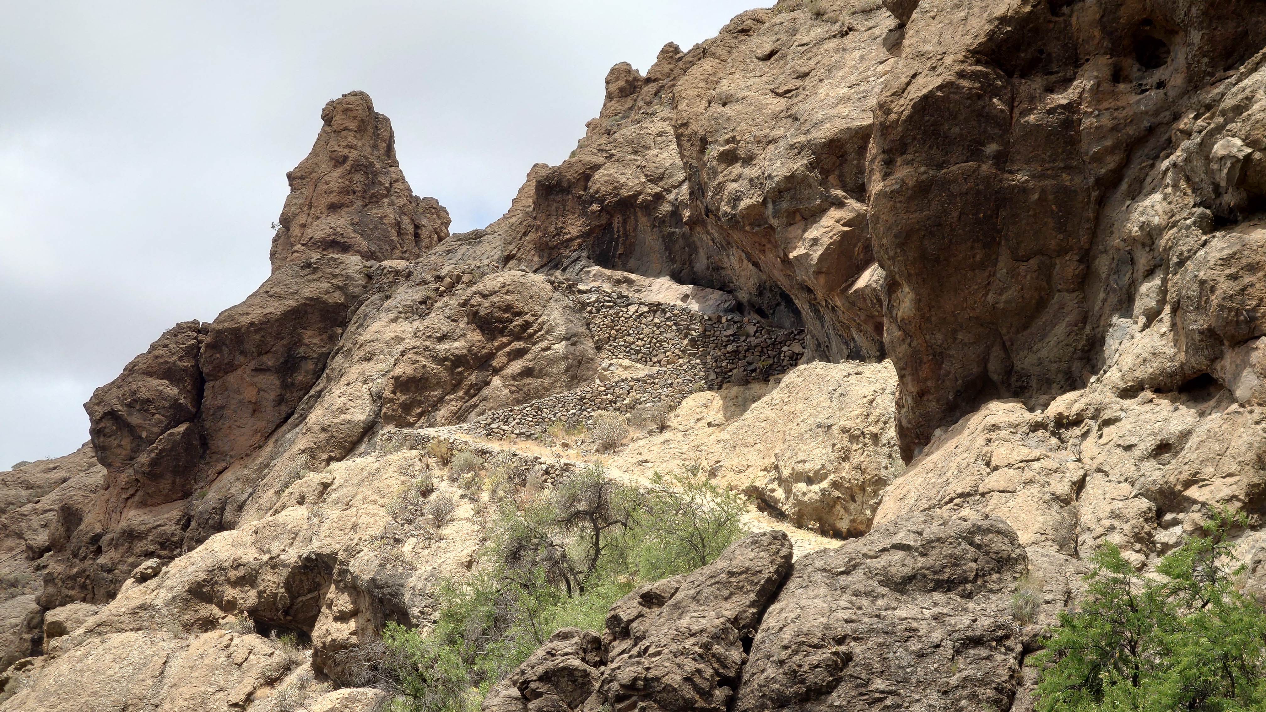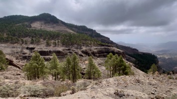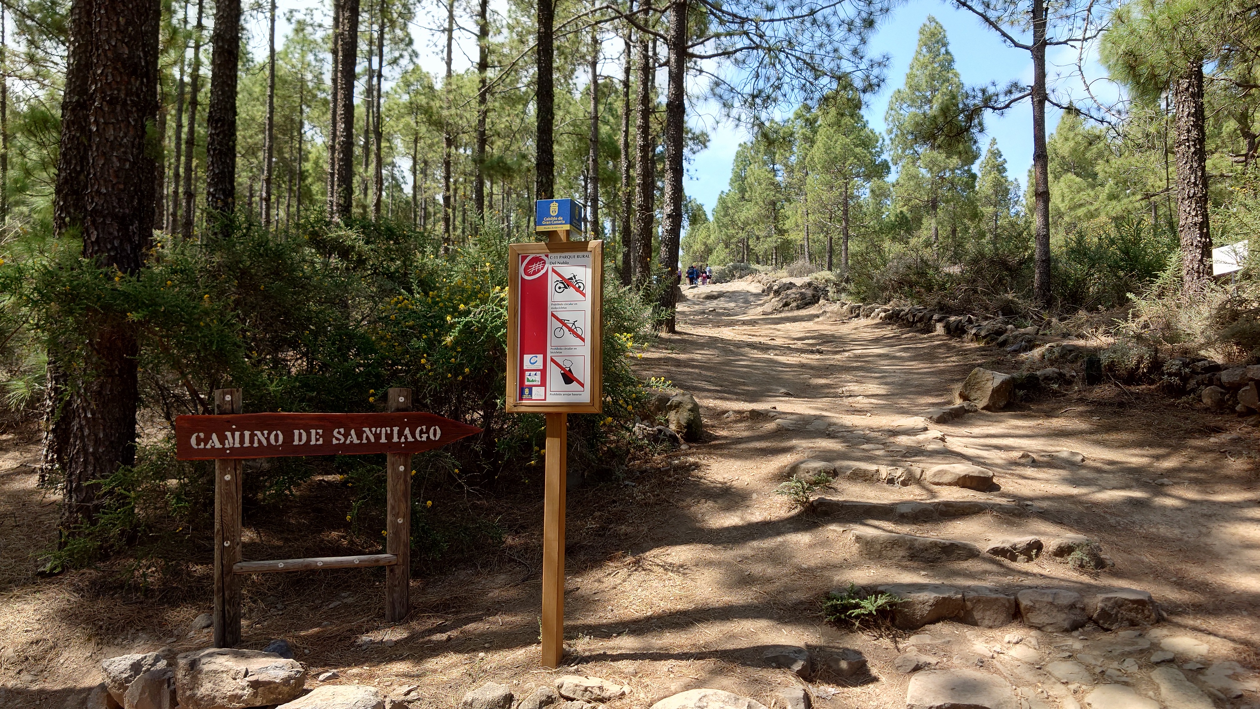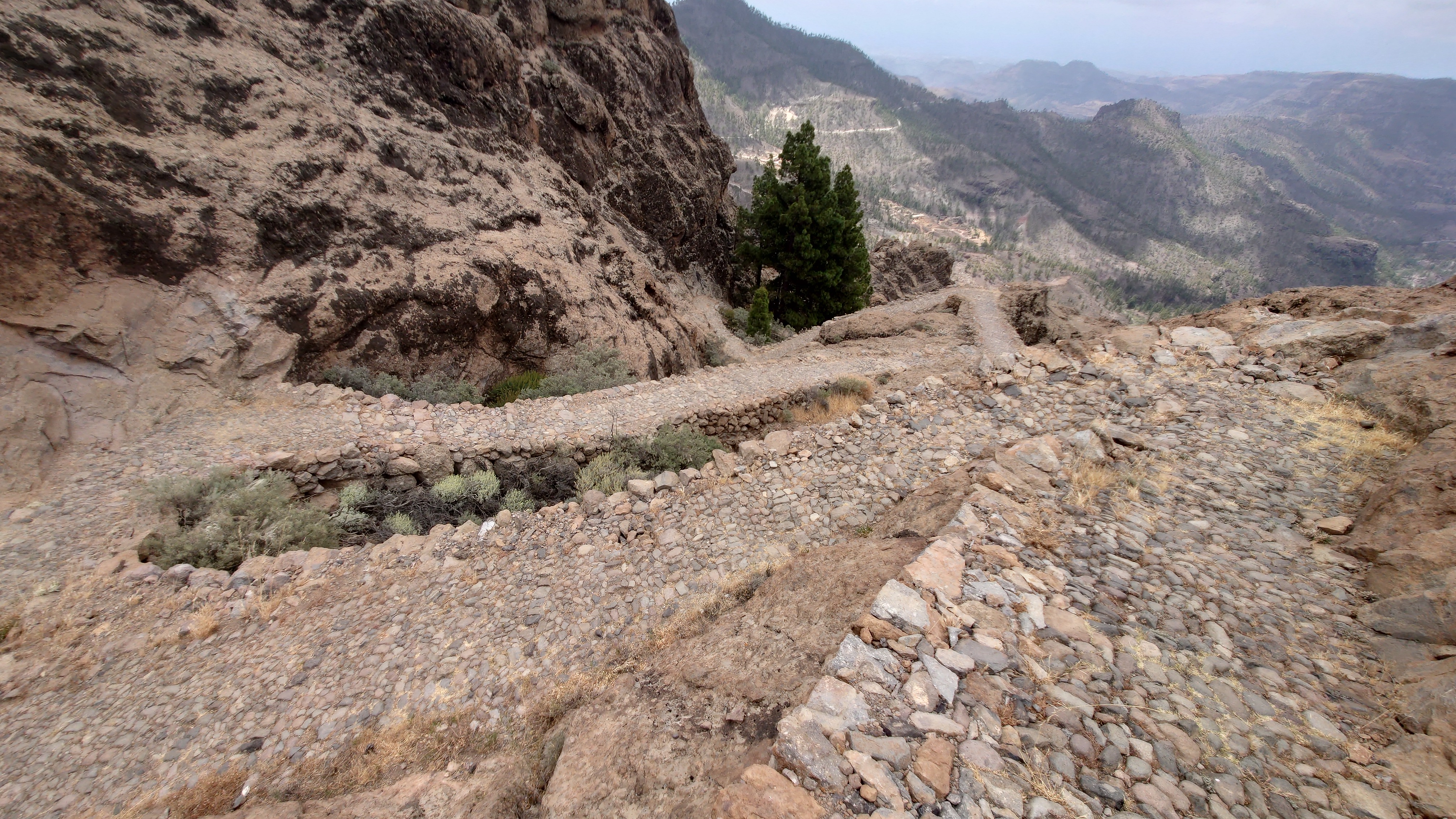 Dann geht es steil bergab. Nach drei Tagen über den Wolken bin ich jetzt wieder unter ihnen und die Luft wird deutlich milder. Ich bin ein bisschen betrübt. Oben gefällt es mir gut. Andererseits habe ich das sehen können, was sich fußläufig erreichen lässt und von daher darf es auch gerne weiter gehen. Meine Unterkunft kann ich schon von weit oben erlennen. Es ist ein kleines Zeltdorf am Einstieg des Caminos. Als ich ankomme bin ich erst einmal verwirrt. Es gibt kein wirkliches Haus, nur eine Art Schuppen. Drum herum stehen weiße Zelte viele Aprikosen. Eines davon wird wohl meins sein, aber es ost keiner da, den ich fragen könnte. Na gut, ich habe mich auch erst abends angekündigt, jetzt ist es 14 Uhr. Dann setze ich mich mal hier irgendwo hin. Und so sitze ich da und schaue mich um. Es herrscht ein Chaos aus verschlissenen Gegenstäden, die irgendwo herumstehen. Dabei hat zwar alles irgendwie einen Zweck, es ist keine Müllhalde. Aber wirklich alles ist irgendwie zurecht improvisiert mit dem Allernötigsten. Darunter mischt sich viel Kinderspielzeug, also wird hier auch ein Kind leben. Viele Katzen und Kätzchen umschleichen meine Beine.. Mich beschleicht ein Verdacht. Alles erinnert mich an Abracaribes vor drei Jahren auf La Palma. Das muss ein Aussteiger sein, der hier wohnt oder eine Familie. Ich warte keine 10 Minuten, da schleicht ein schrottreifer Nissan die Piste hinab zum Haus. Heraus kommen ein älterer Mann, eine Frau und ein Kind. Sie begrüßen mich und sind meine Gastfamilie. Er heißt Patrice und ist Franzose. Sie heißt Simone und ist Deutsche, das Kind heißt Mibella, ist fünf und spricht Englisch. Eine Aussteiger-Familie mit fantasievollem Improvisationstalent allem Anschein nach. Sie zeigt mir die Finca und zu meiner Freude gibt es sogar einen Whirlpool mit warmen Wasser. Na das kommt mir Recht, der Tag ist noch lang. Nur Essen habe ich keins mehr. Der nächste Supermarkt liegt 6 Kilometer entfernt in einem Ort mit dem lieblichen Namen Tunte.