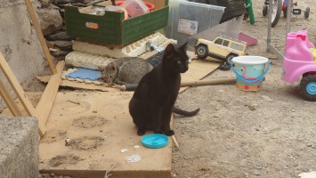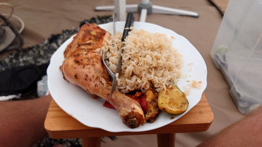 Gegen 18 Uhr verzieht sich die Sonne hinter den hoch aufragenden Felsen, von denen ich herunter gekommen bin. Schade, keine 🌈-Sonnenuntergänge mehr. Es wird schnell sehr kalt und ich muss einen kleinen Wärmepuster am Bett laufen lassen. Pünktlich um sieben Uhr kommt mein Essen. Hähnchenkeule. Lecker! Finden die Katzen auch. 15 Stück laufen hier herum, sagt Simone. Könnten auch mehr sein. Mein Zelt muss ich sofort zu machen, oder ich habe vierbeinige Tischgäste.