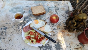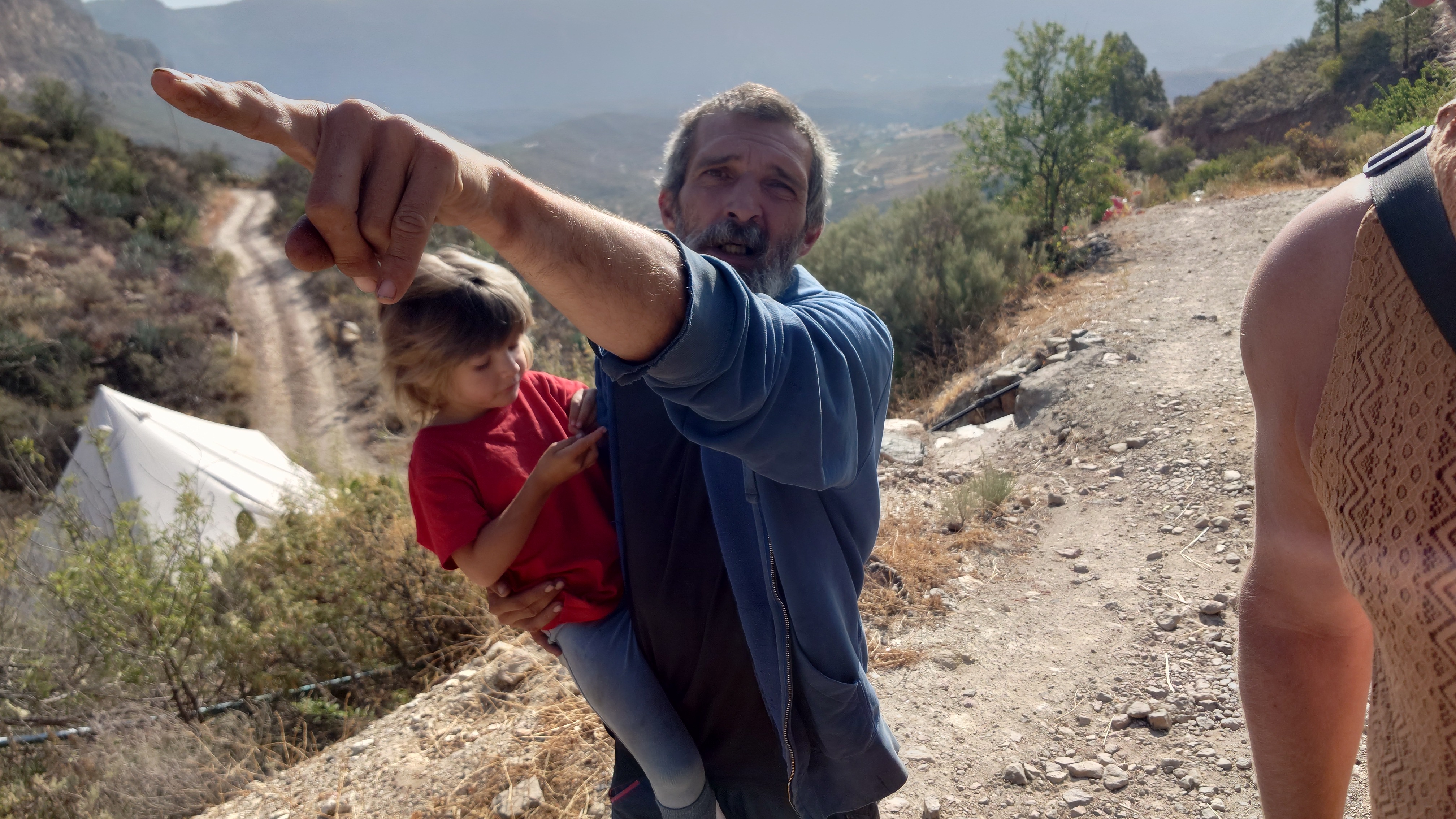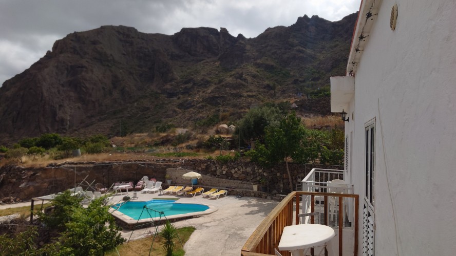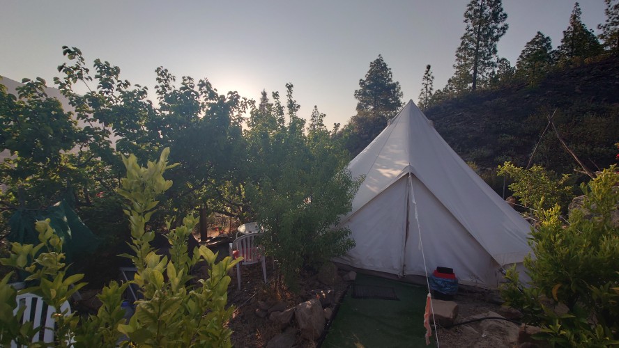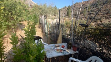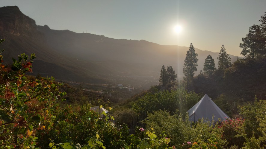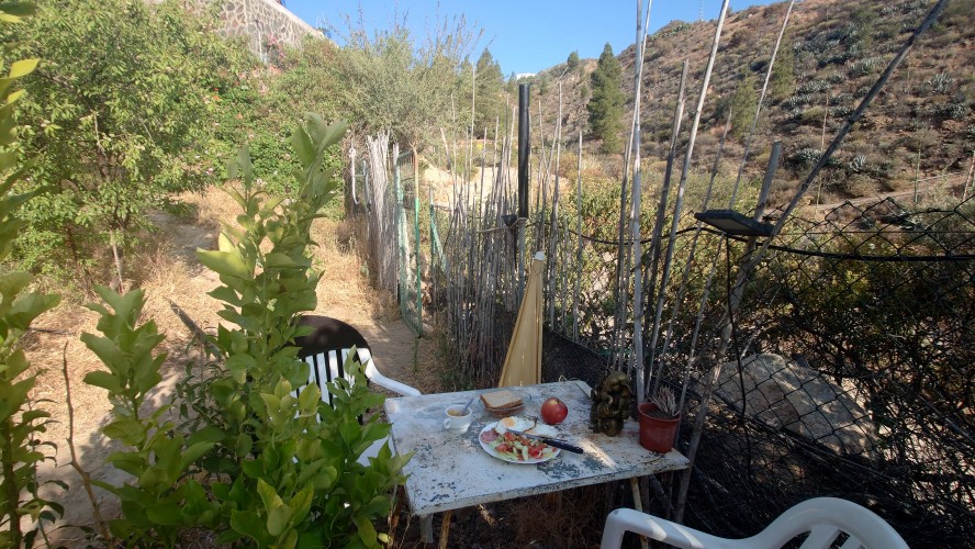 Gegen 9 Uhr bringt Patrice mir ein Frühstück und fünf Katzen, sowie ein Huhn als Gesellschaft ans Zelt. Es miaut und bockt unter meinen Beinen herum, während ich Ei, Wurst und selbstgemachte Aprikosenmarmelade an einem kleinen, verrosteten Campingtisch vor dem Zelt verdrücke und die Sonne langsam von den hohen Berghängen ins Tal strahlt. Hilft nix, ich muss los. Und so lustig das auch das ganze Improtheater hier ist, mehr als eine Nacht möchte ich das nicht. Es ist halt eine mit Fundsachen aller Art zurecht gebastelte Einnahmequelle, wenn das Fuß fassen hier nicht so recht klappt als Aussteiger, stelle ich mir vor. Solange die Kleine noch klein ist, mag das ja auch gehen, aber spätestens ab dem Schulalter fehlt doch gänzlich die Bodenhaftung, wenn man so zwischen den Welten heranwächst. Wie Emilio auf La Palma hat es aber einen Vorteil: sie wächst spielerisch mit vier Sprachen gleichzeitig auf. Ob Emilio wohl auch noch auf La Palma aufwächst, frage ich mich, während ich meine Sachen zusammen packe. Er wäre jetzt 13 Jahre alt.