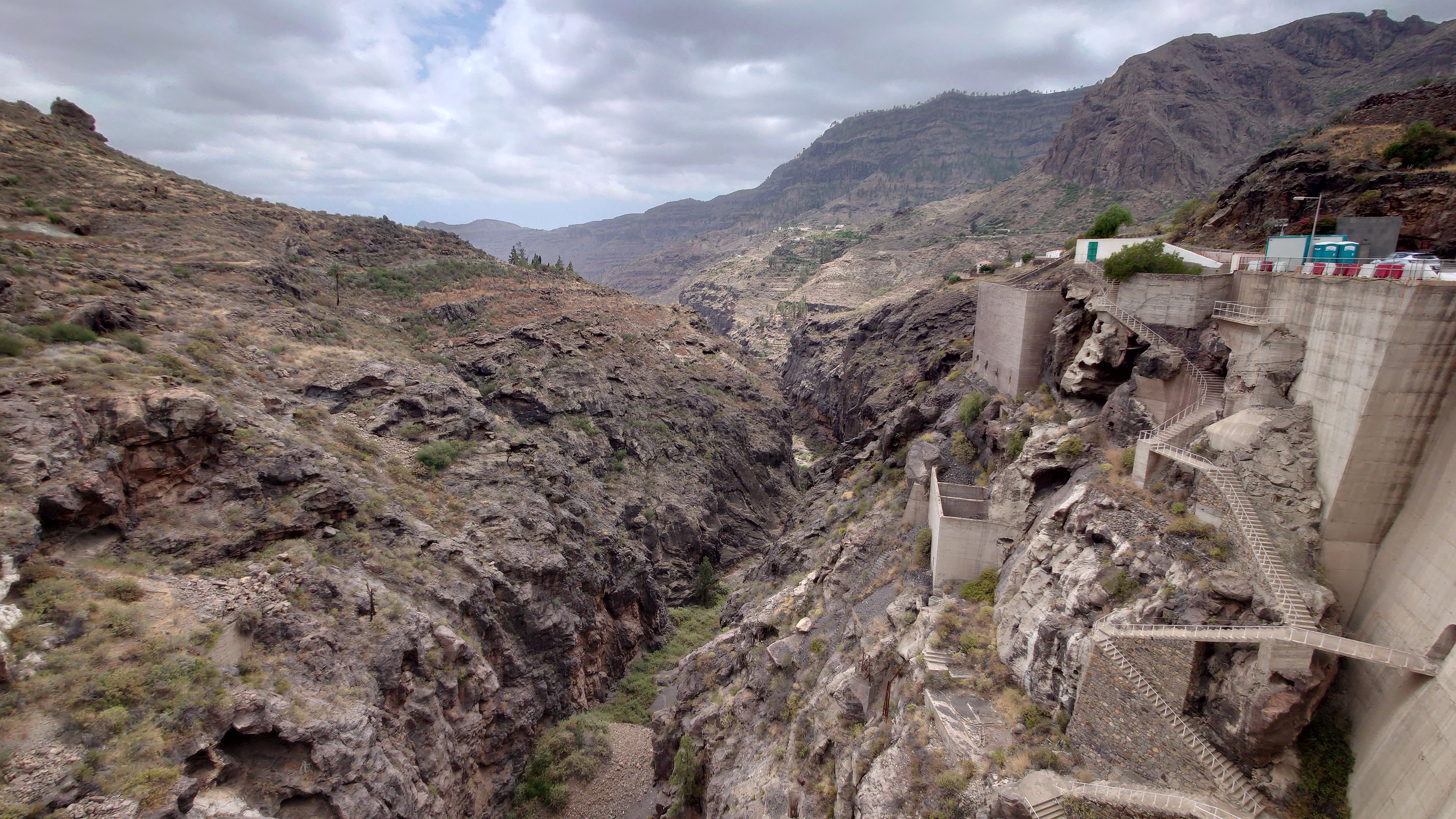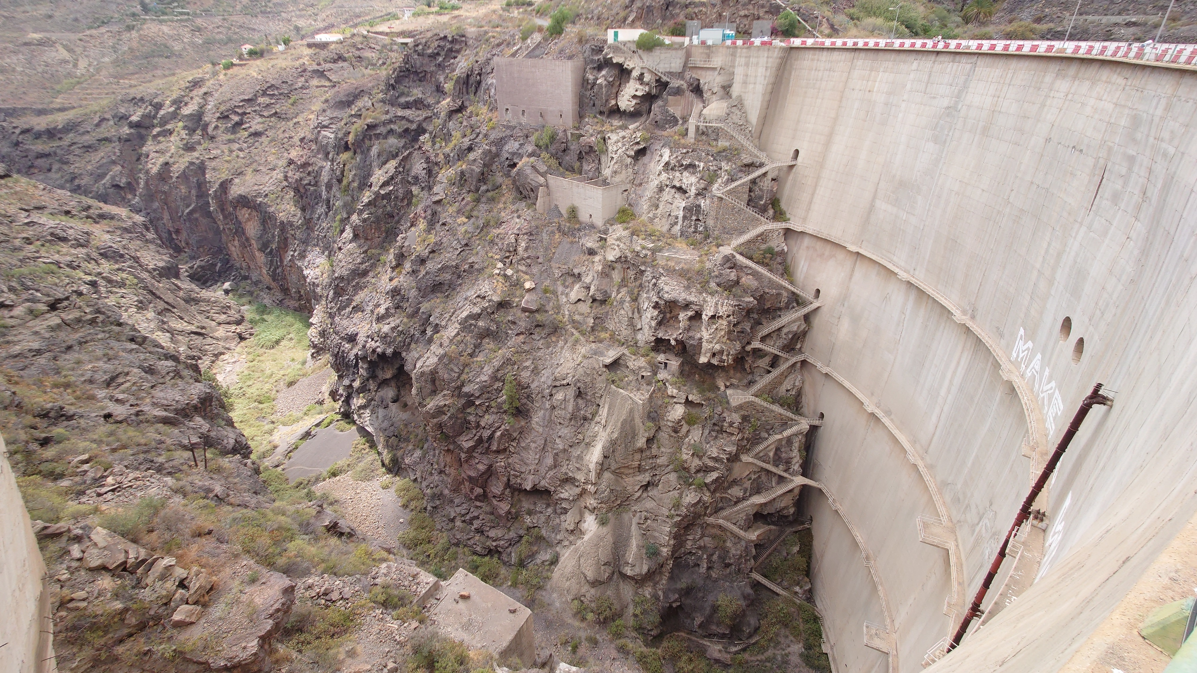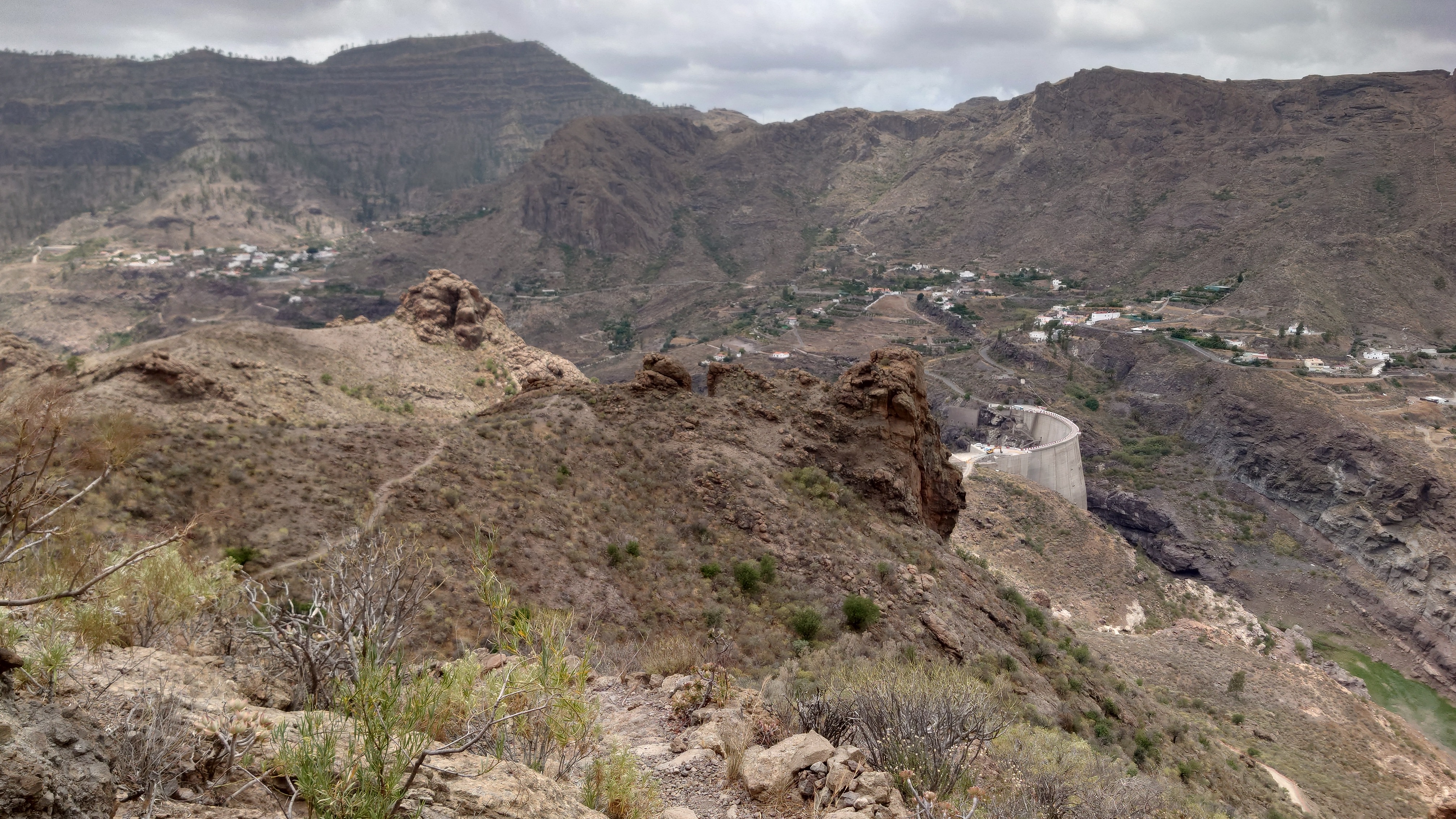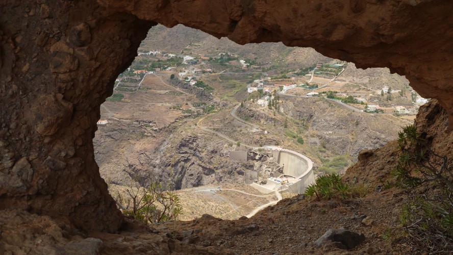 So komme ich schnell voran. Mein Zieloort Soria liegt unterhalb einer weiteren Klippenstufe, die mich mit einem Schlag 200 Meter hinab führt. So verschwinden auch die Kiefern und die Palmen und Kakteen halten wieder Einzug. Das winzige Soria kündigt sich durch ein gewaltiges Bauwerk an: ein Staudamm ragt vor mir und dem Ort 120 Meter aus einem Barranco hervor und bildet so die Eingangsbrücke in den Ort. Irgendwas wird hier gebaut. Ich bin irritiert über den Damm. Er staut kein Wasser und hat es wohl auch noch nie, sonst sähe man Spuren an den Felsen und es wüchsen keine Bäume im Becken. Das konvexe Ungetüm wirkt aber baufällig. Es muss schon lange hier stehen. Seit 1972, beschildert ein Denkmal. Ein gewaltiger See, den man hier zur Bewässerung angelegt hat. Und es ist der einzige. Gran Canaria hat viele davon und sie sind zumindest zur Zeit fast alle randvoll. Nur dieser steht irgendwie entfremdet in der Gegend und gibt eine Kulisse eines dystopischen Nach-dem-großen-Knall-Szenario... ein Überbleibsel einer ausgestorbenen Gesellschaft. Wir werden ganz schön viel hinterlassen, wenn unser Zeitalter nicht mehr ist.