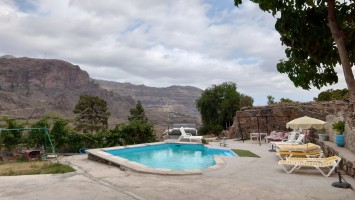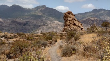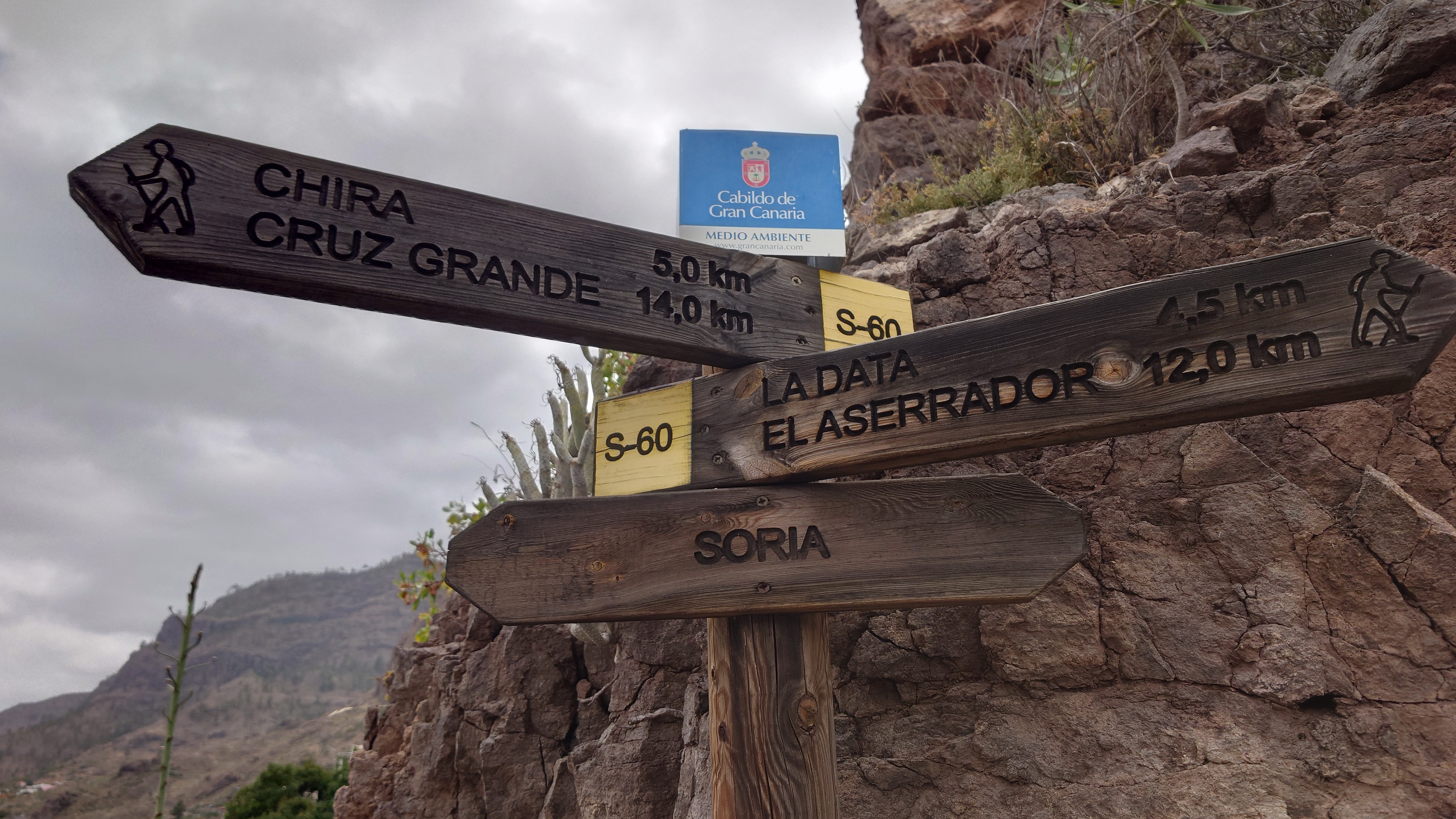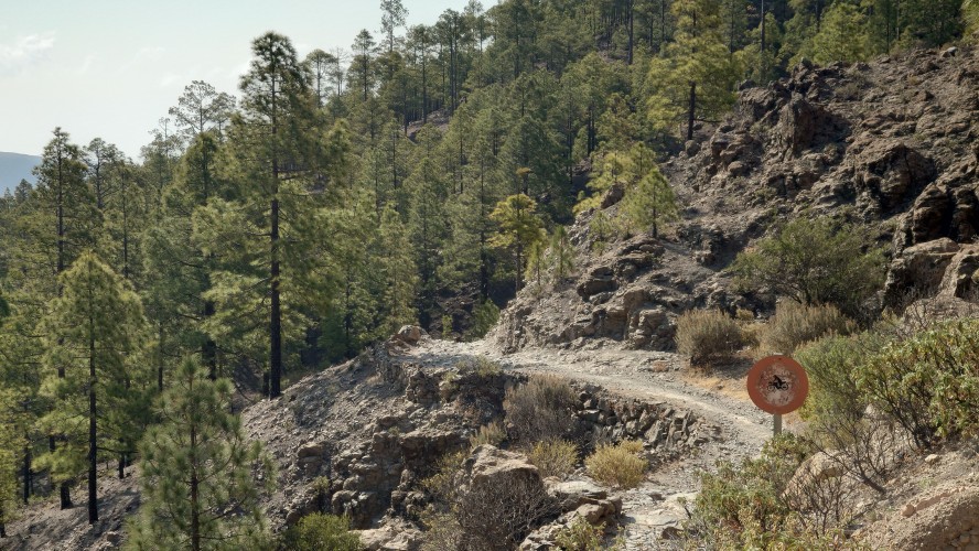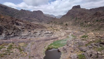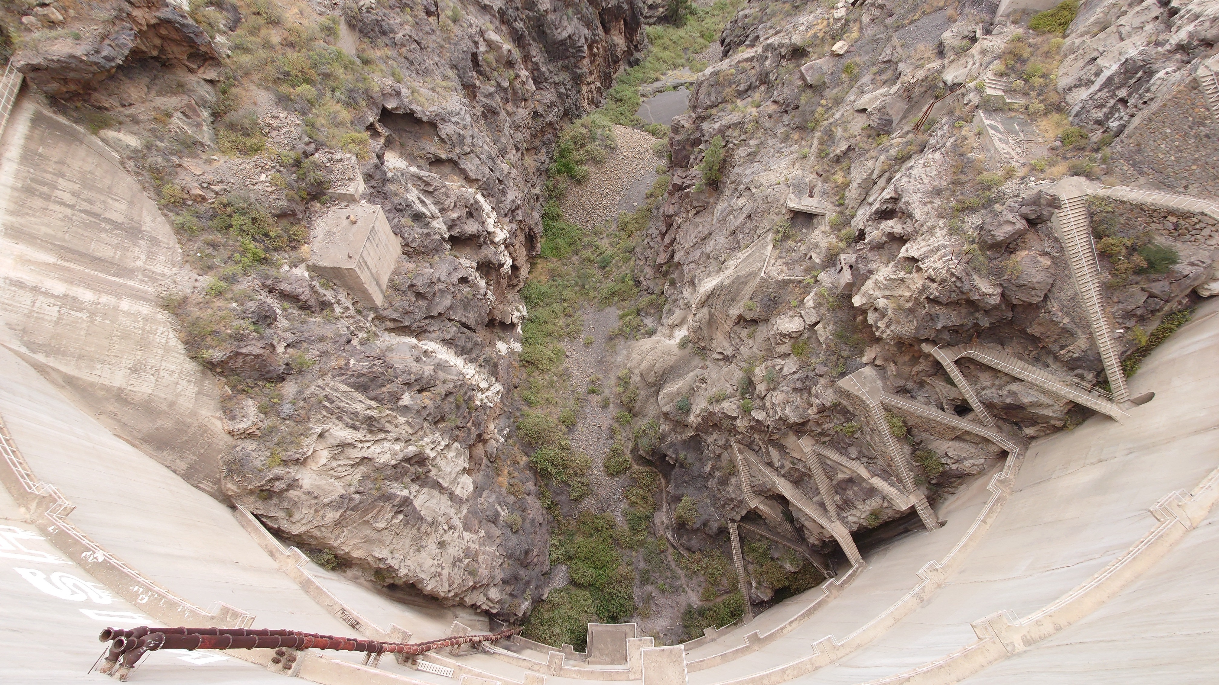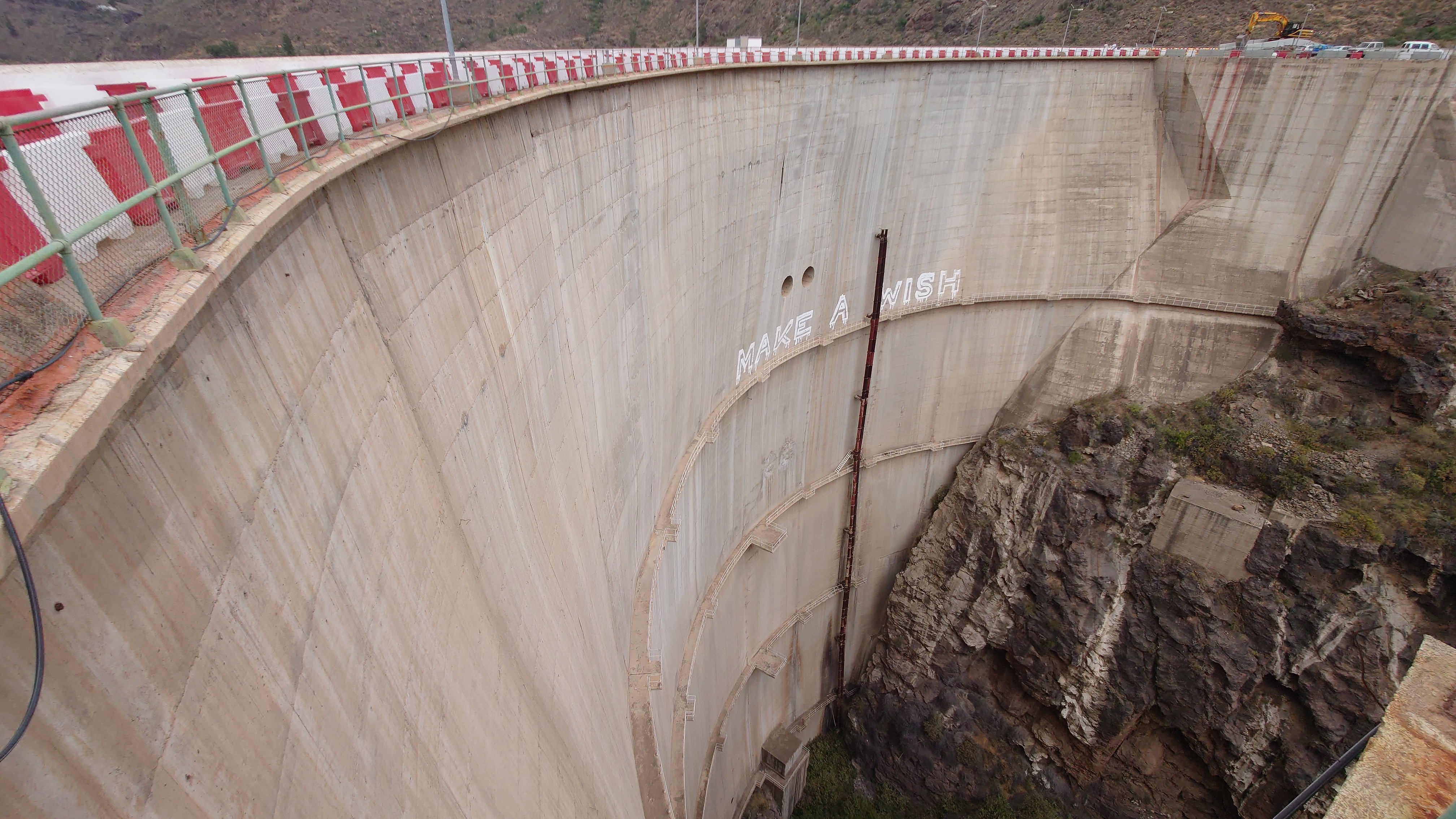 So komme ich schnell voran. Mein Zieloort Soria liegt unterhalb einer weiteren Klippenstufe, die mich mit einem Schlag 200 Meter hinab führt. So verschwinden auch die Kiefern und die Palmen und Kakteen halten wieder Einzug. Das winzige Soria kündigt sich durch ein gewaltiges Bauwerk an: ein Staudamm ragt vor mir und dem Ort 120 Meter aus einem Barranco hervor und bildet so die Eingangsbrücke in den Ort. Irgendwas wird hier gebaut. Ich bin irritiert über den Damm. Er staut kein Wasser und hat es wohl auch noch nie, sonst sähe man Spuren an den Felsen und es wüchsen keine Bäume im Becken. Das konvexe Ungetüm wirkt aber baufällig. Es muss schon lange hier stehen. Seit 1972, beschildert ein Denkmal. Ein gewaltiger See, den man hier zur Bewässerung angelegt hat. Und es ist der einzige. Gran Canaria hat viele davon und sie sind zumindest zur Zeit fast alle randvoll. Nur dieser steht irgendwie entfremdet in der Gegend und gibt eine Kulisse eines dystopischen Nach-dem-großen-Knall-Szenario... ein Überbleibsel einer ausgestorbenen Gesellschaft. Wir werden ganz schön viel hinterlassen, wenn unser Zeitalter nicht mehr ist.