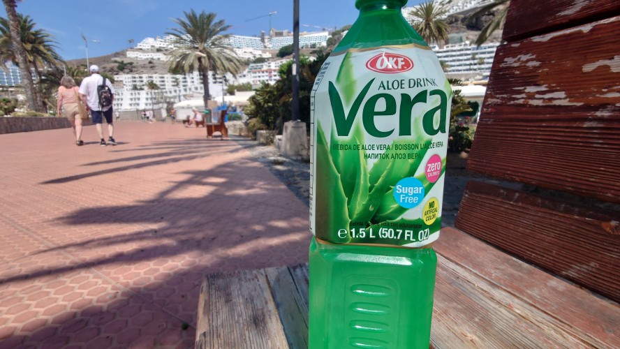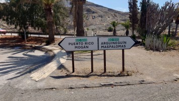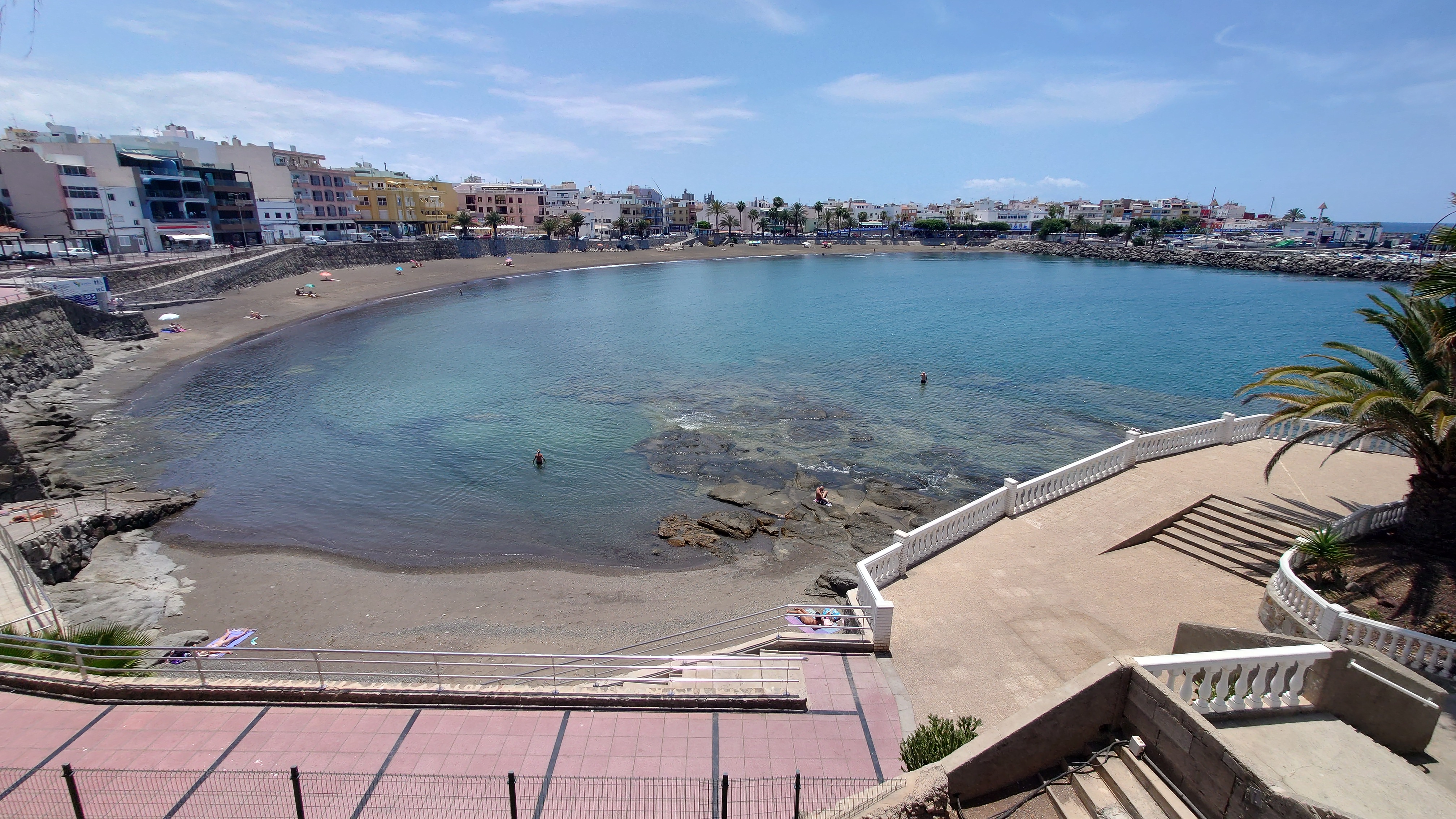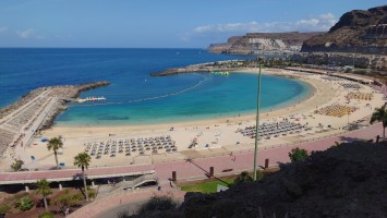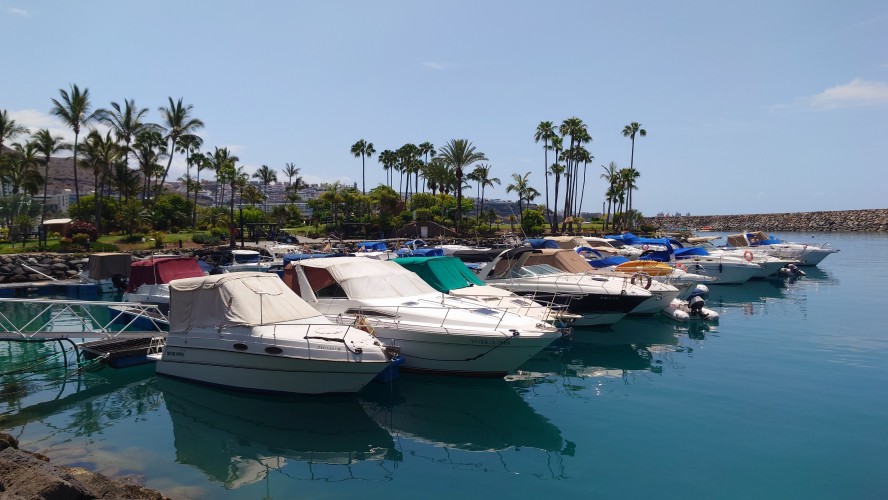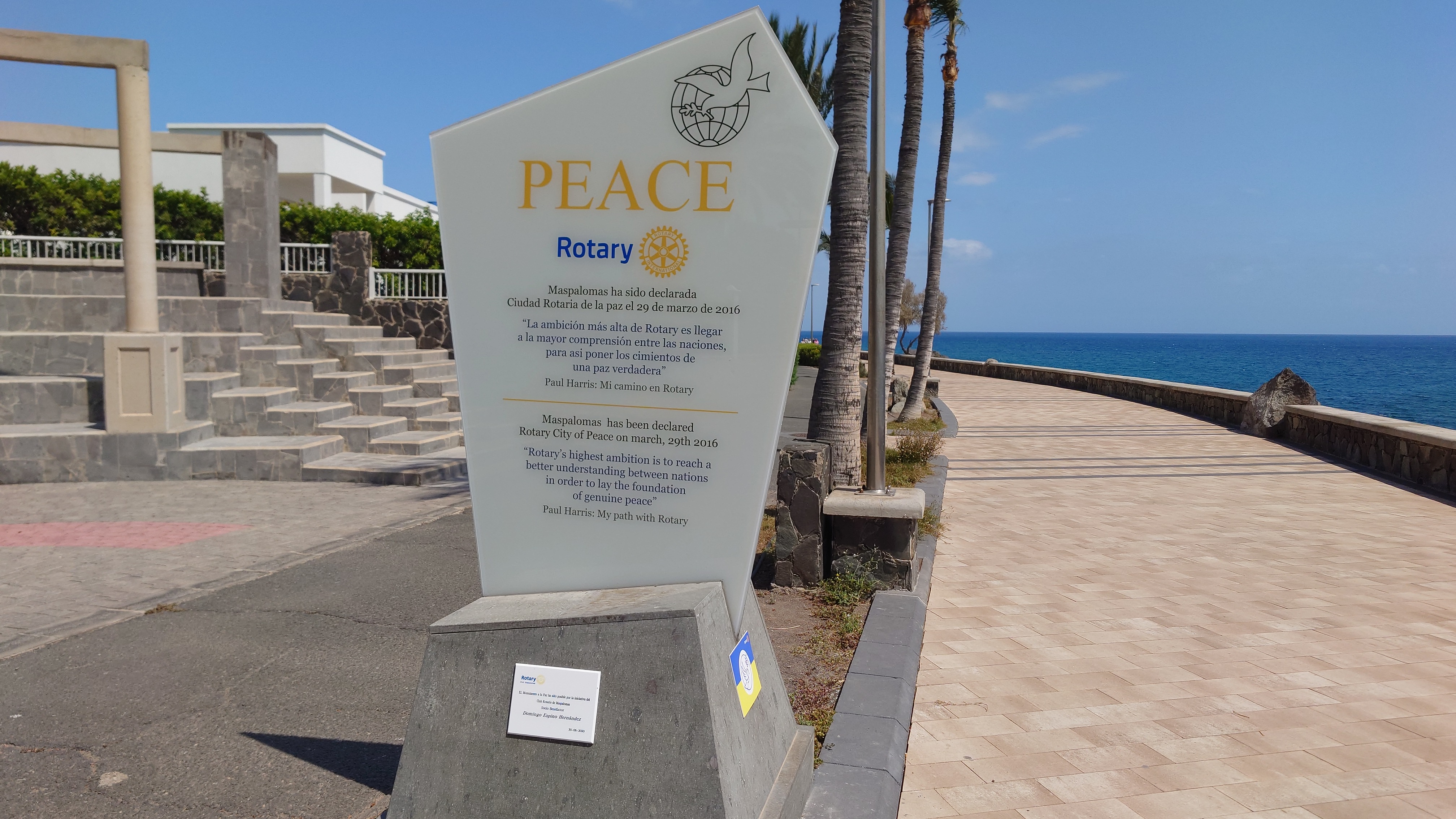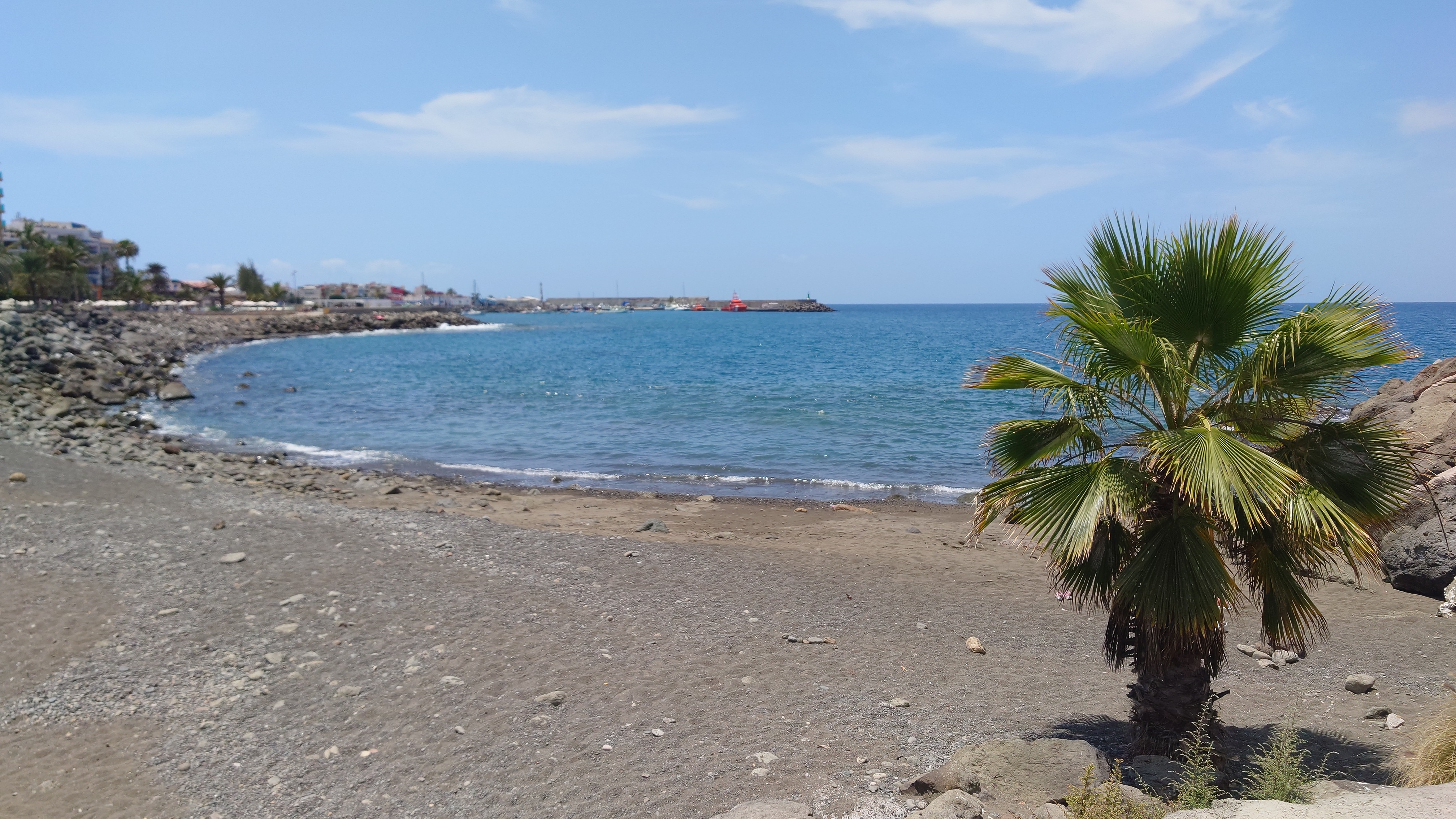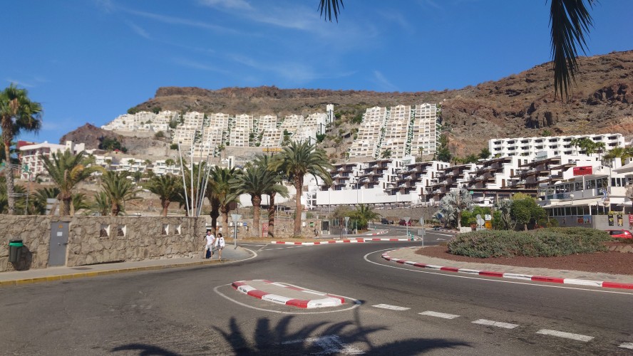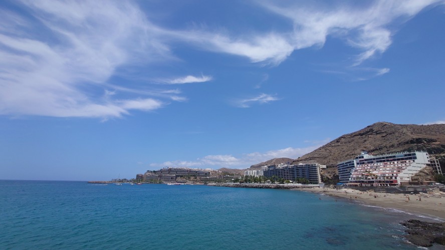 Dann beginnt die Promenade von Meloneras. Eine Art doppelte Kirchturmspitze taucht auf. Hier unten ist tatsächlich ein Ort mit Kirche? Je näher ich herankomme, desto mehr entpuppt sich die Kirche sowie auch die authentischen Bauten ringsum als Fake bzw. als Themenpark eines Luxusresorts. Überhaupt ist der Küstenteil das Gegenteil des Billig-Massentourismus davor. Das hier ist Edel-Massentourismus. Die Gebäude sind allenfalls noch dreistöckig und ergeben ein dezent aufeinander abgestimmtes Bild, mitsamt der Geschäfte und der Promenade. Hier fließt Geld. Auch der Rotary-Club fühlte sich bewogen ein kleines Denkmal aufzustellen und den zugehörigen Ort Maspalomas als Stadt des Friedens auszuweisen. Ja, wo Geld ist, ist wohl auch Frieden. Ich finde eine kleine Bucht, die nicht an einen Hotelstrand angeschlossen ist und somit auch keine Lautsprecher und Küstenwache hat. Hier liegt auch keiner. Aber die Einheimischen gehen hier ins Wasser. Und ich auch. Endlich Atlantik. Aber ich muss noch 7 Kilometer weiter... also, das Soll ist erstmal erfüllt.