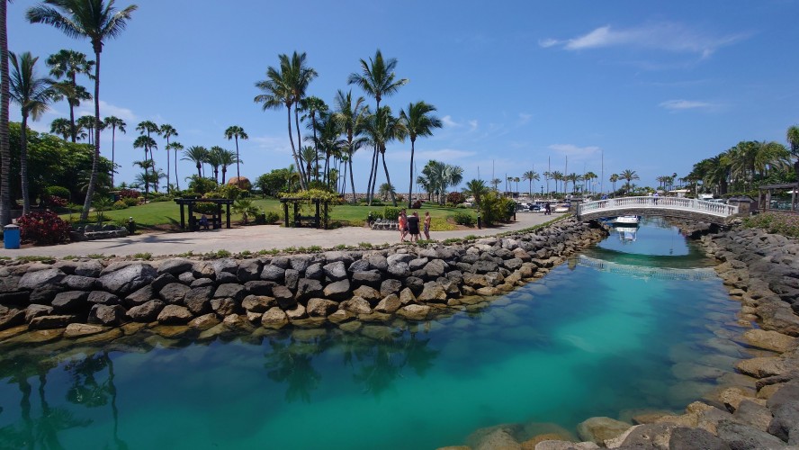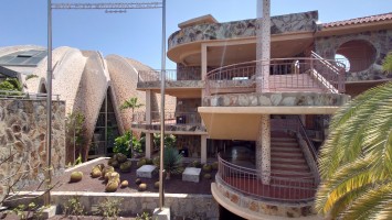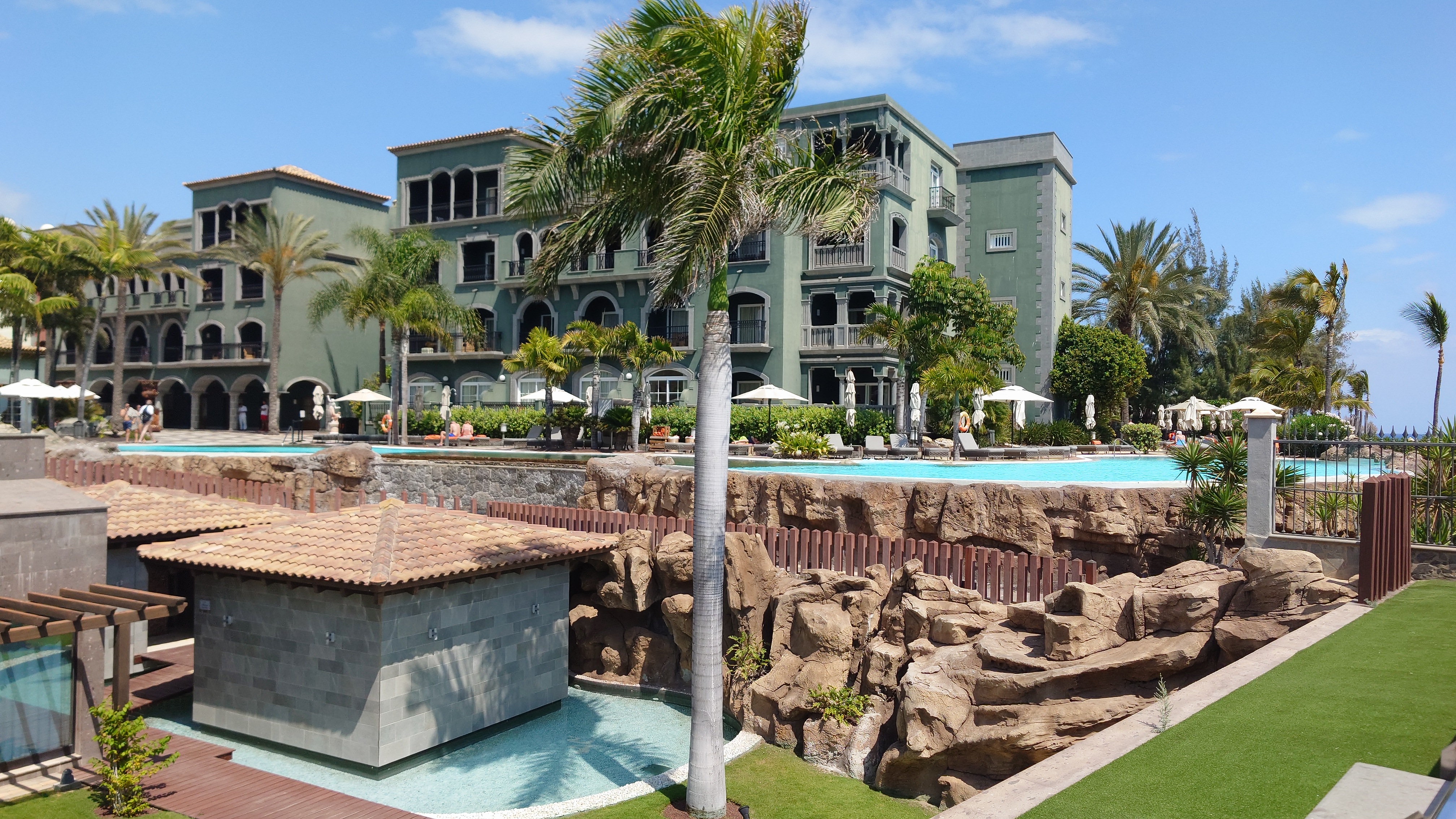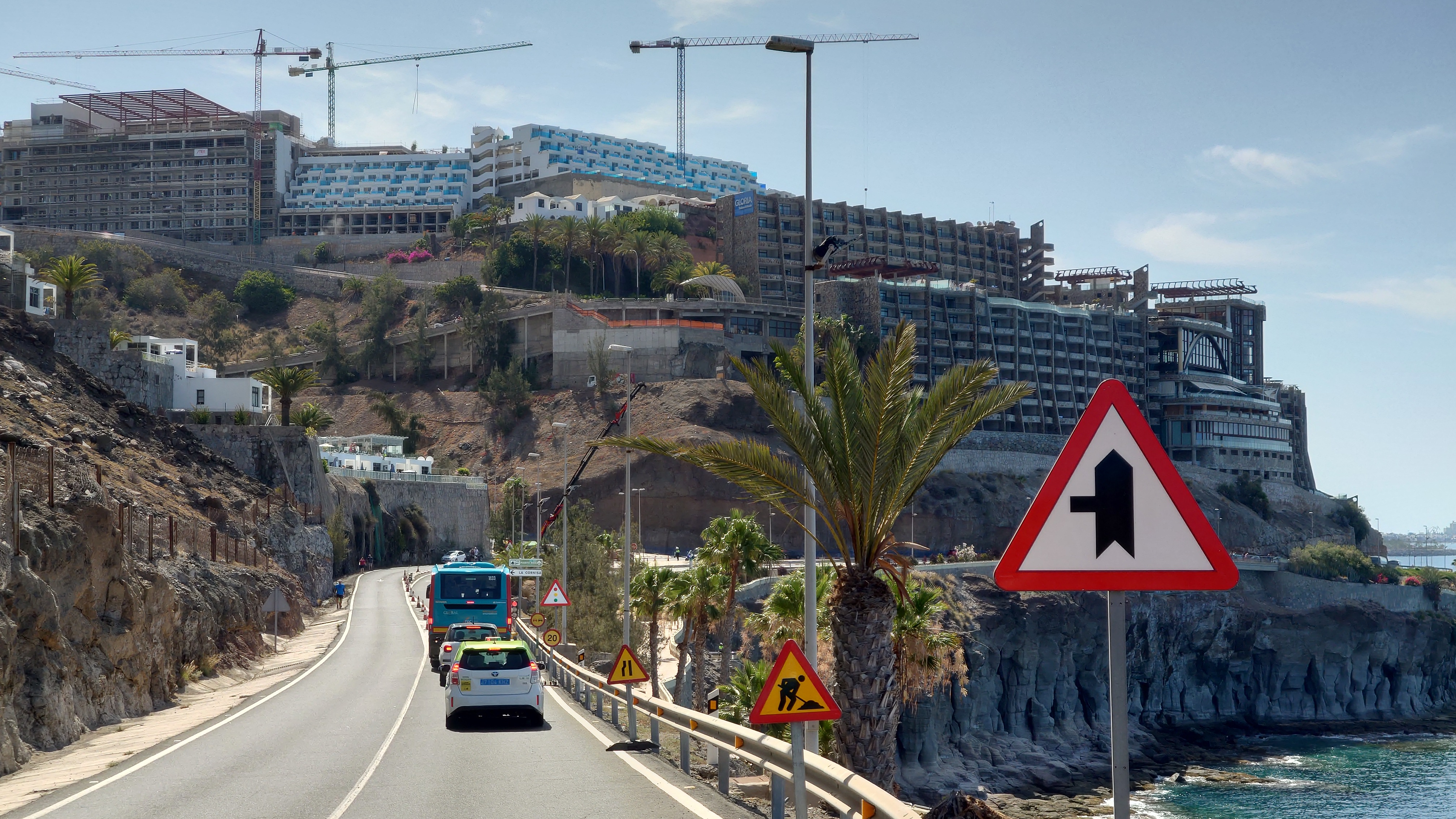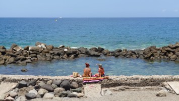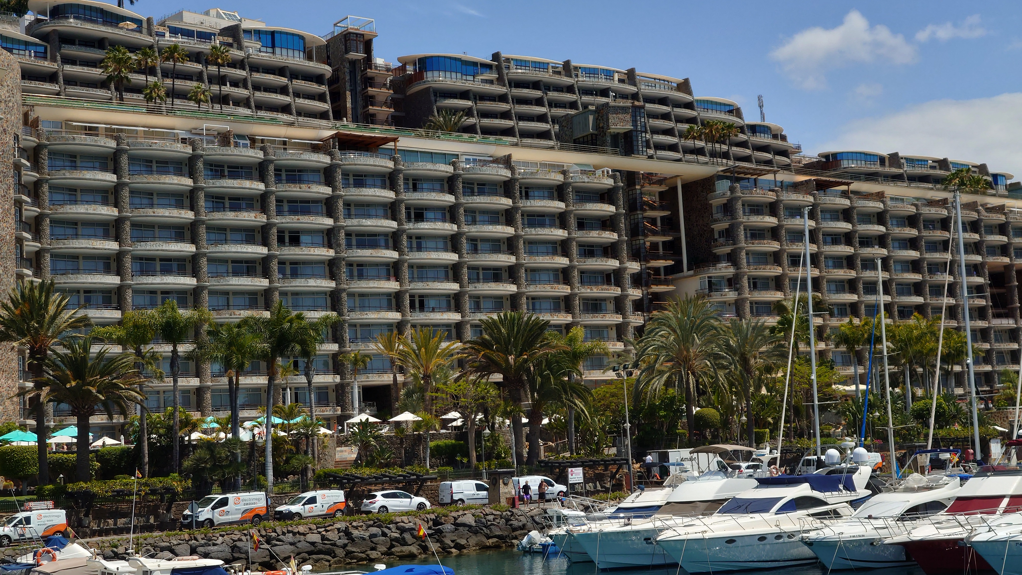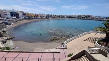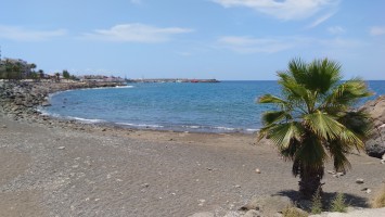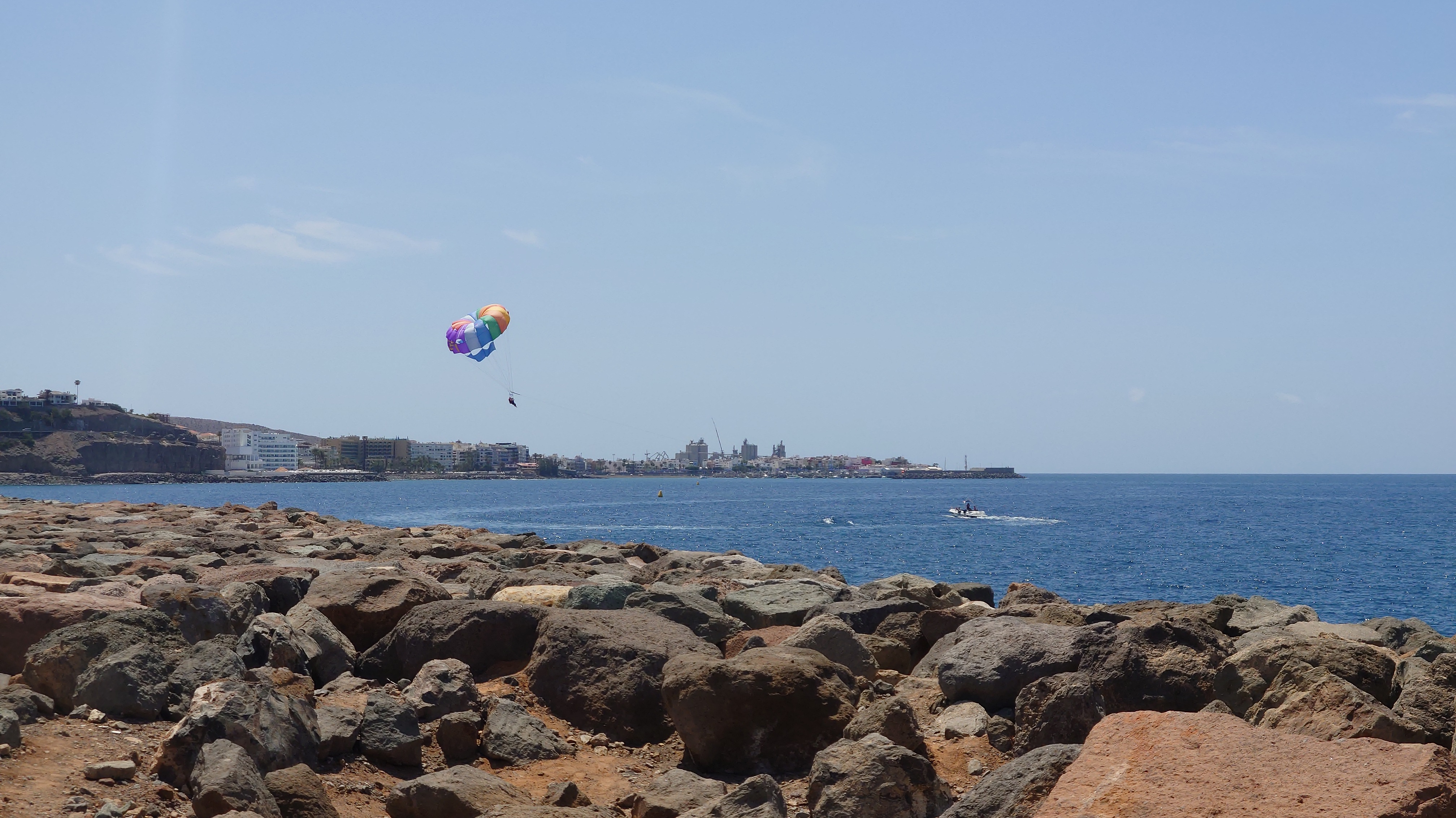 Dann beginnt die Promenade von Meloneras. Eine Art doppelte Kirchturmspitze taucht auf. Hier unten ist tatsächlich ein Ort mit Kirche? Je näher ich herankomme, desto mehr entpuppt sich die Kirche sowie auch die authentischen Bauten ringsum als Fake bzw. als Themenpark eines Luxusresorts. Überhaupt ist der Küstenteil das Gegenteil des Billig-Massentourismus davor. Das hier ist Edel-Massentourismus. Die Gebäude sind allenfalls noch dreistöckig und ergeben ein dezent aufeinander abgestimmtes Bild, mitsamt der Geschäfte und der Promenade. Hier fließt Geld. Auch der Rotary-Club fühlte sich bewogen ein kleines Denkmal aufzustellen und den zugehörigen Ort Maspalomas als Stadt des Friedens auszuweisen. Ja, wo Geld ist, ist wohl auch Frieden. Ich finde eine kleine Bucht, die nicht an einen Hotelstrand angeschlossen ist und somit auch keine Lautsprecher und Küstenwache hat. Hier liegt auch keiner. Aber die Einheimischen gehen hier ins Wasser. Und ich auch. Endlich Atlantik. Aber ich muss noch 7 Kilometer weiter... also, das Soll ist erstmal erfüllt.