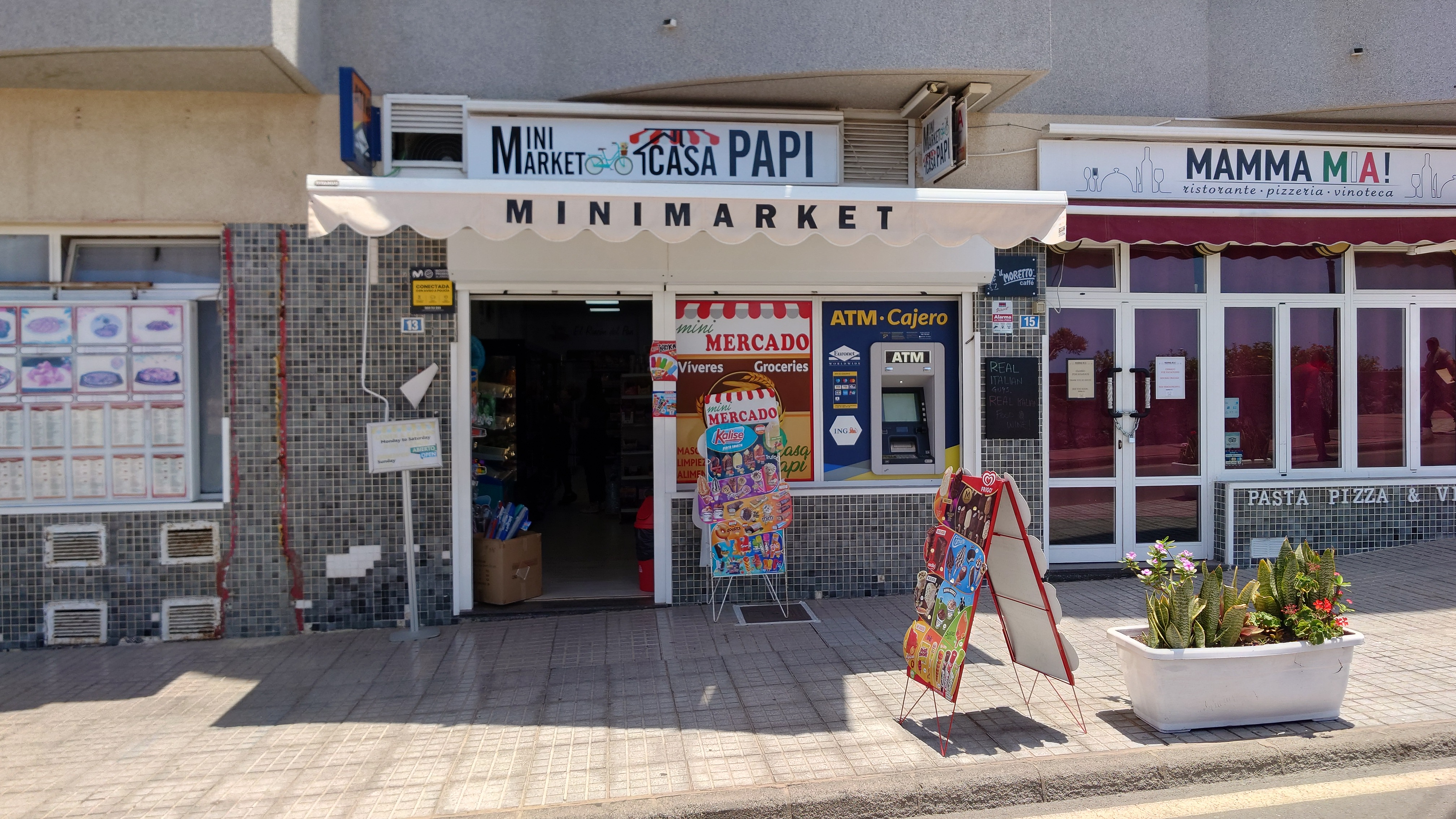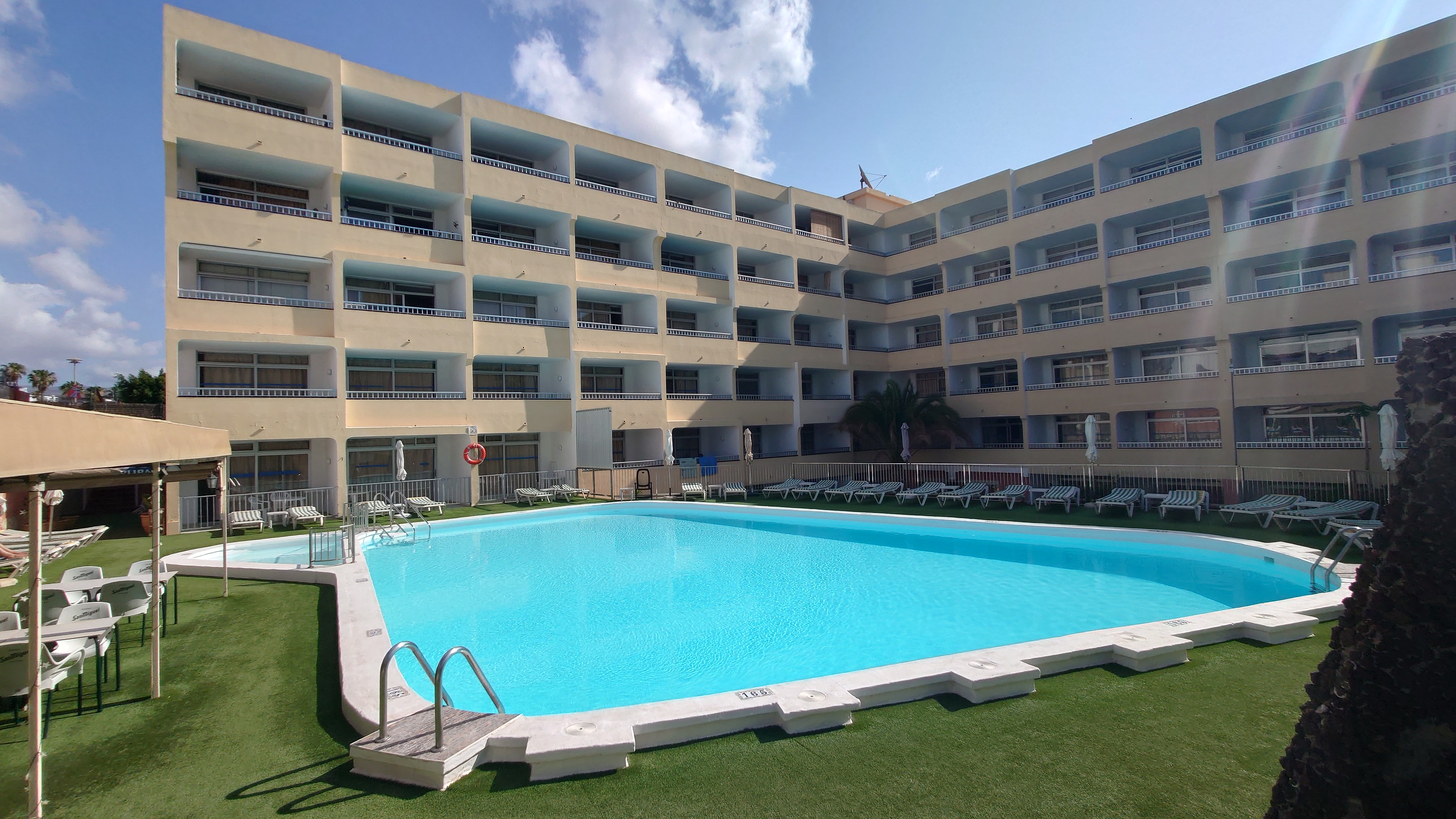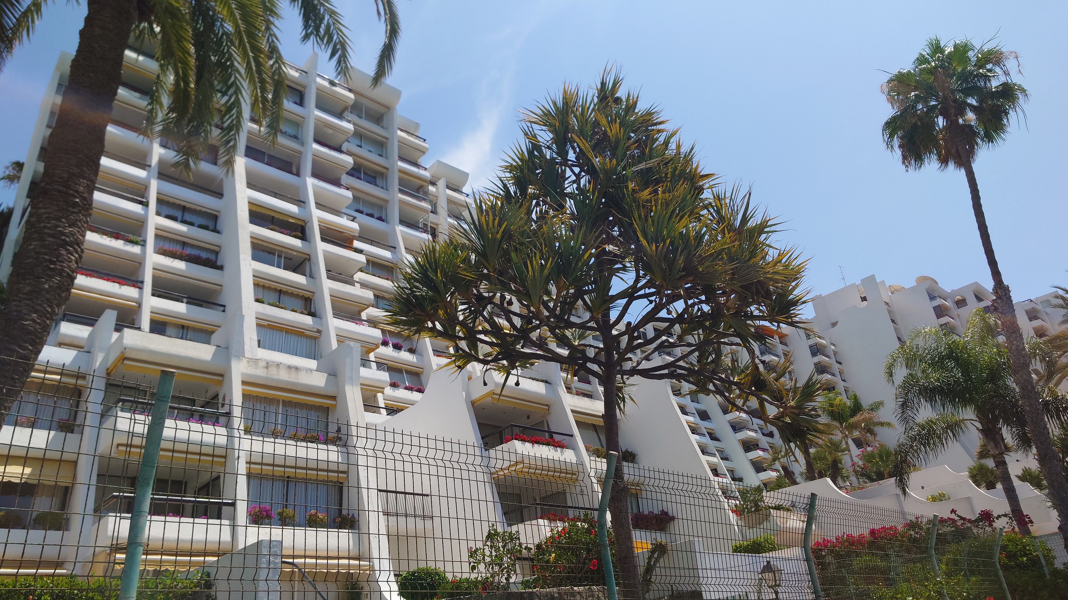 Ich will hier schnell durch. Der Sand ist enorm heiß und meine Fußsohlen brüllen nach nunmehr 25 Kilometern. Allem Anschein nach ist das hier the place to be in Sachen Strand. Ich kenne jetzt etwa 3/4 der Küste Gran Canarias und niegends sonst ist noch so ein Strand. Ich verstehe, warum Fuerteventura seinen Reiz hat. Aufgrund der Nähe zum Festland landet dort der Hauptanteil des Saharasandes. Die anderen Inseln bekommen davon nur Bruchteile ab. Schöne Motive ergeben die Dünen. So schön, dass ich glatt meine Absteige für heute verpasse. Ich habe ein Appartement in einer Anlage aus dem letzten Jahrtausend gebucht. Sie liegt in einem augenscheinlich deutlich älteren Teil der touristischen Infrastruktur. Direkt dahinter baut sich ein Shopping Center auf, das gänzlich leer ist. Alte Schilder prangen an den Verkaufseinheiten, die Parfüm und vor allem Elektronik anpreisen. Ein Fotogeschäftbanner wirbt damit, seit 1976 am Ort zu sein. Alles Relikte aus den Goldgräberzeiten, bevor das Internet Einzug hielt und damit das Geschäftsmodell der billigen Elektronikwahre aus Marokko obsolet werden ließ. Einst hatte mein Apartmentblock sicherlich Meerblick. Jetzt schaut man auf die Rückseiten drei weiterer Hotelreihen davor. Aber es hat einen Pool und war günstig. Kurzzeitig hatte ich überlegt, eines dieser Fünf-Sterne-Anlagen zu testen. Aber was hätte ich davon. Ich sähe ein Schwimmbad, um das vorwiegend Rentner liegen und sich mit Bräunungsöl übergießen... und hätte auch nur einen Pool mit Chlorwasser. Alle Anlagen hier unten im Touri-Hotspot sehen im Prospekt erstrebenswerter aus, wenn der Kontrast aufs Doppelte überhöht und die Nachbarhotels ausgeblendet sowie das Strandleben eingeblendet werden. Das ist für alle gleich.