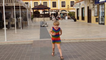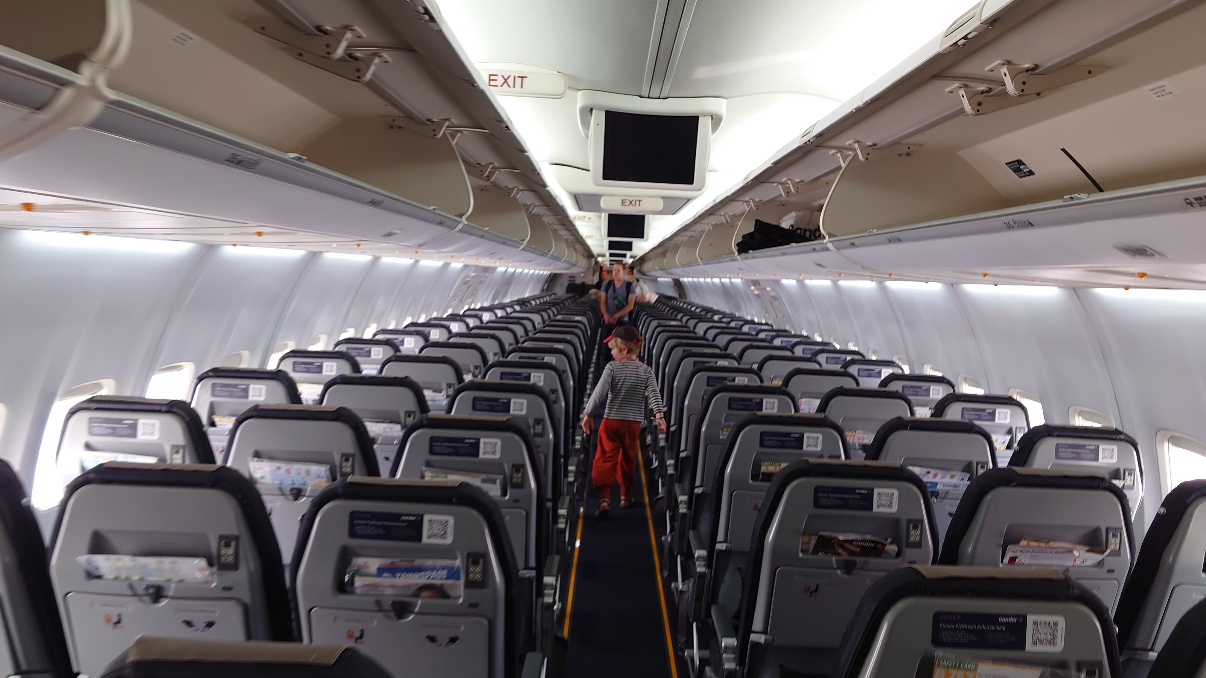 Wir fliegen Condor. Die Gesellschaft hat sich gedacht, dass es voll der Knaller wäre die gesamte Flotte in bunte Ringelpullis zu stecken. Und heute ist 2jähriges Bestehen dieses Rebrandings, heißt, wer mit Ringelpulli in passender Farbe erscheint, bekommt einen 10-Euro Gutschein. Vorsorglich haben wir zwei Ringelpullis eingesteckt. Und so fährt ein geringelter Leander mit seinen Eltern raus aufs Flugfeld mit dem Bus, um in eine Ringelmaschine einzusteigen. Und da ist dann auch das vermisste Staunen. Erst recht, als die Maschine abhebt und wir die Wolken unter uns lassen, die Alpen überfliegen und das Meer erreichen. Und das mit dem Pulli klappt. Leander bekommt Brezel aufs Haus... und die lieben Eltern auch.